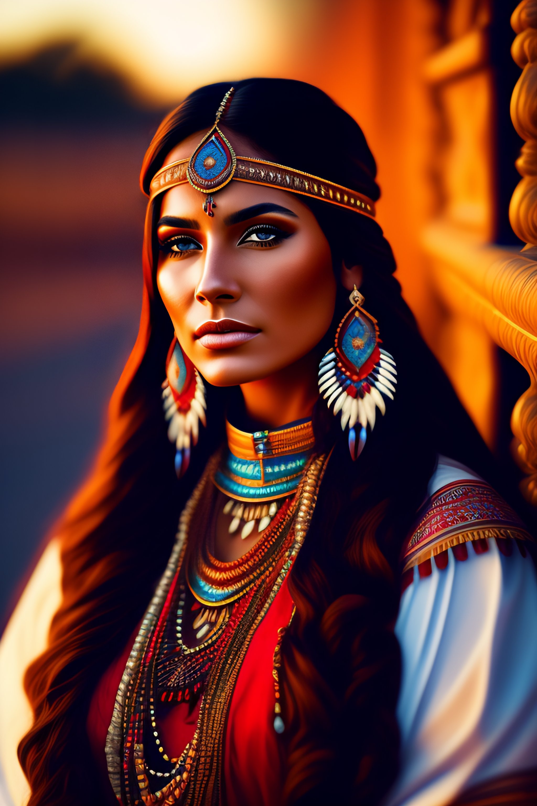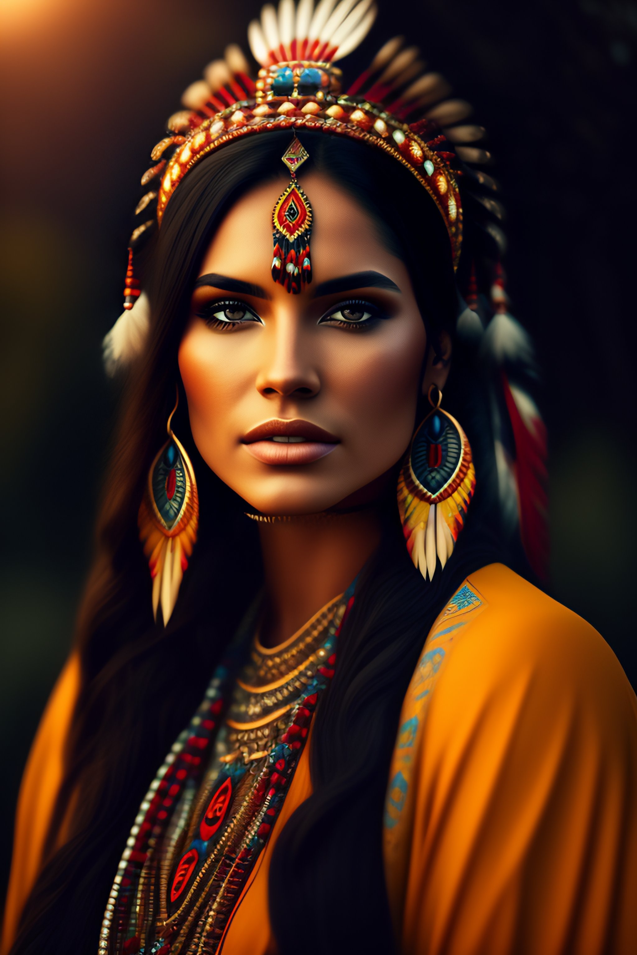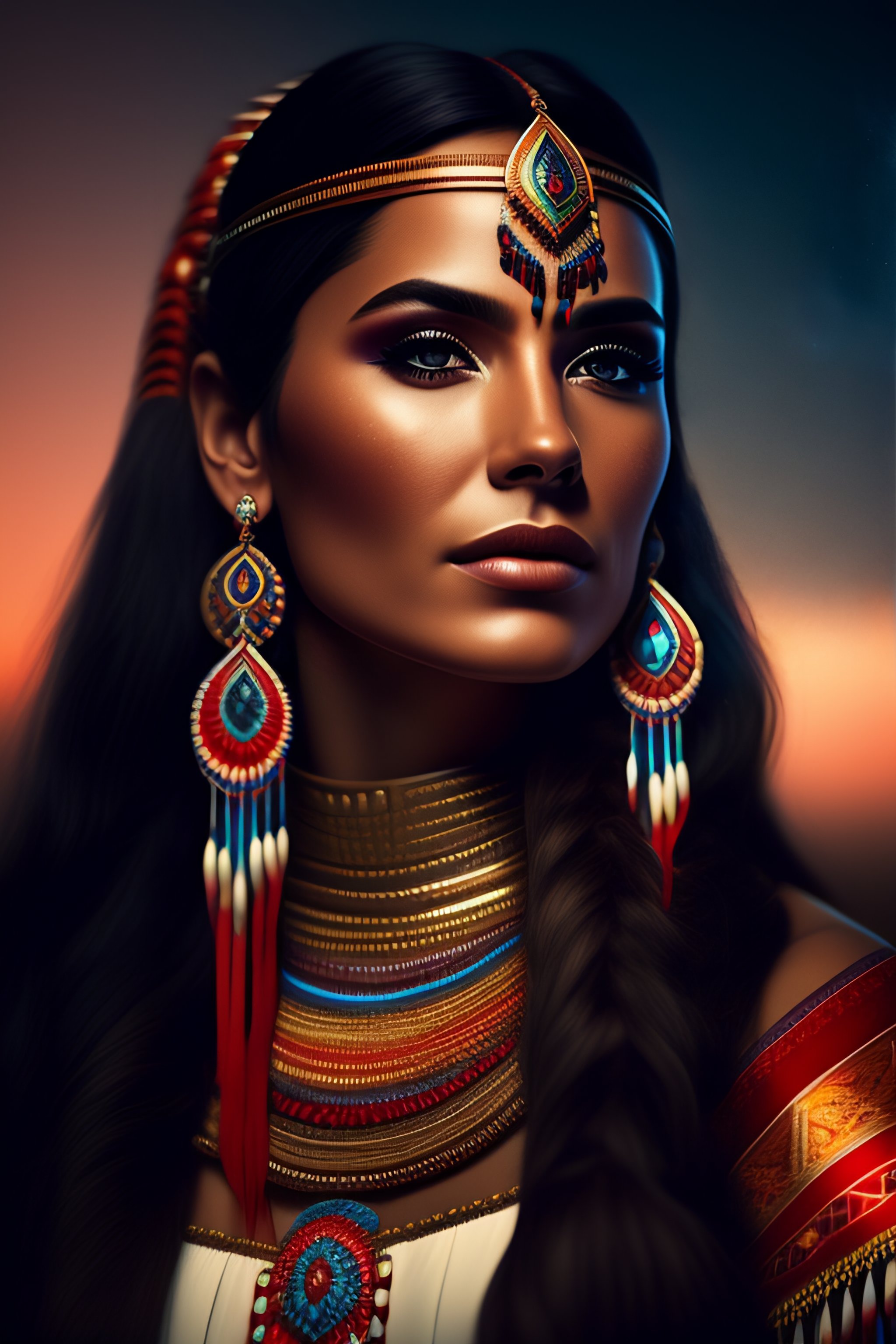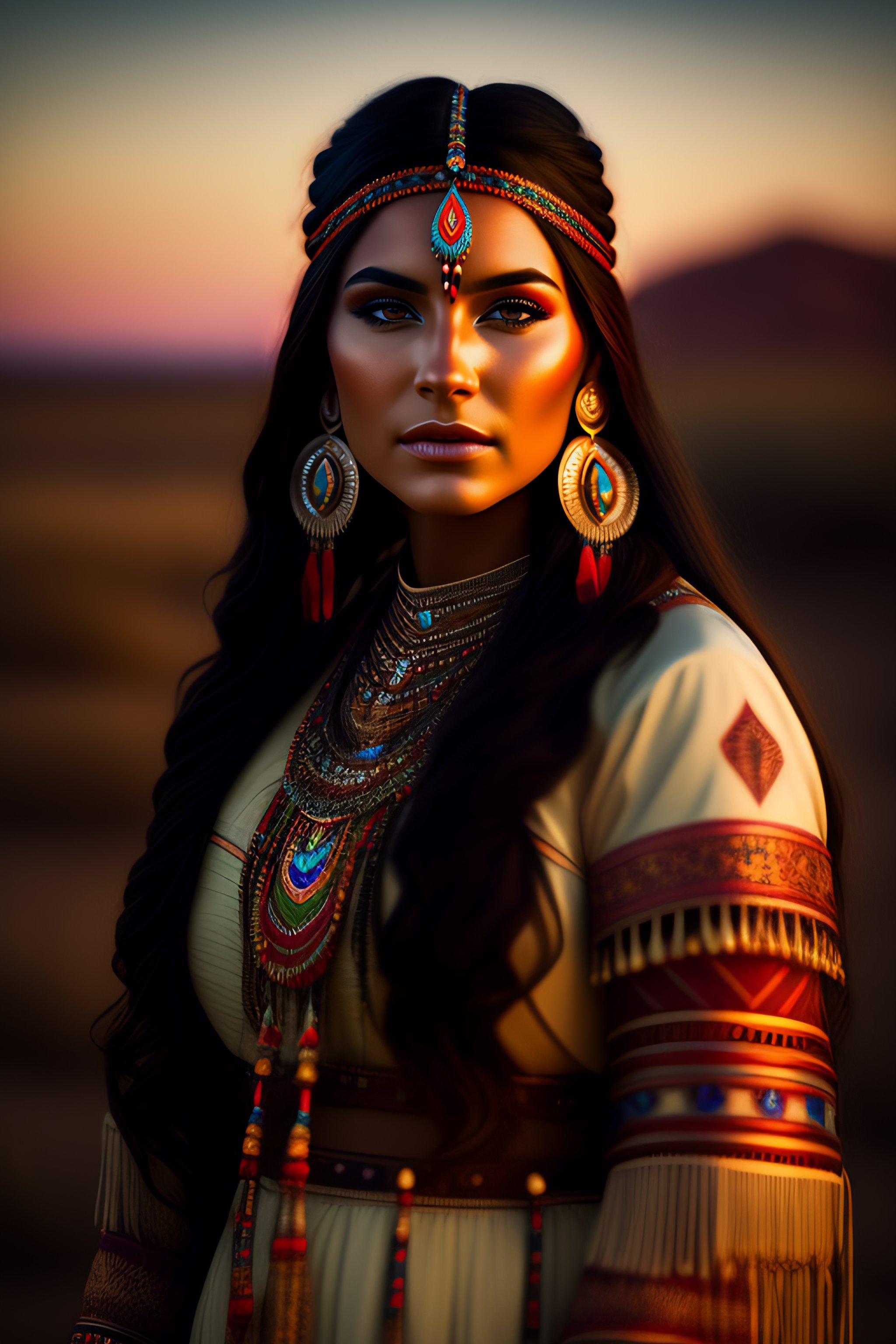 A beautiful portrait of a native american woman with ornate clothing and beautiful fully rendered pretty face, dusk, cinematic, high resolution
