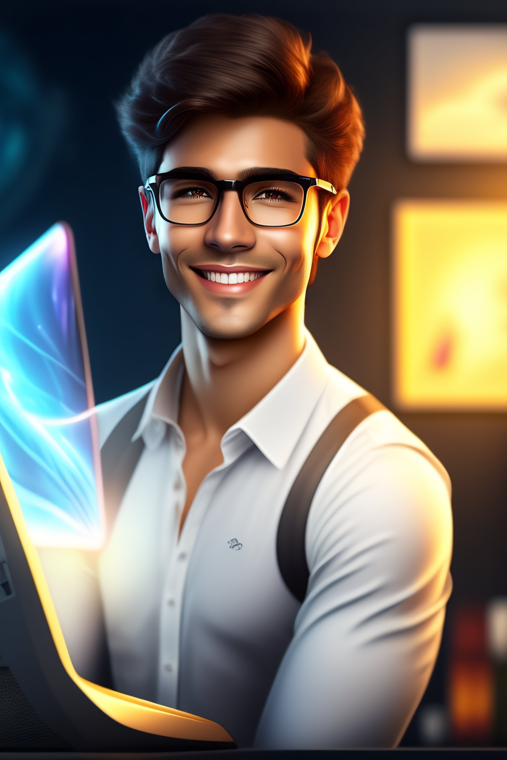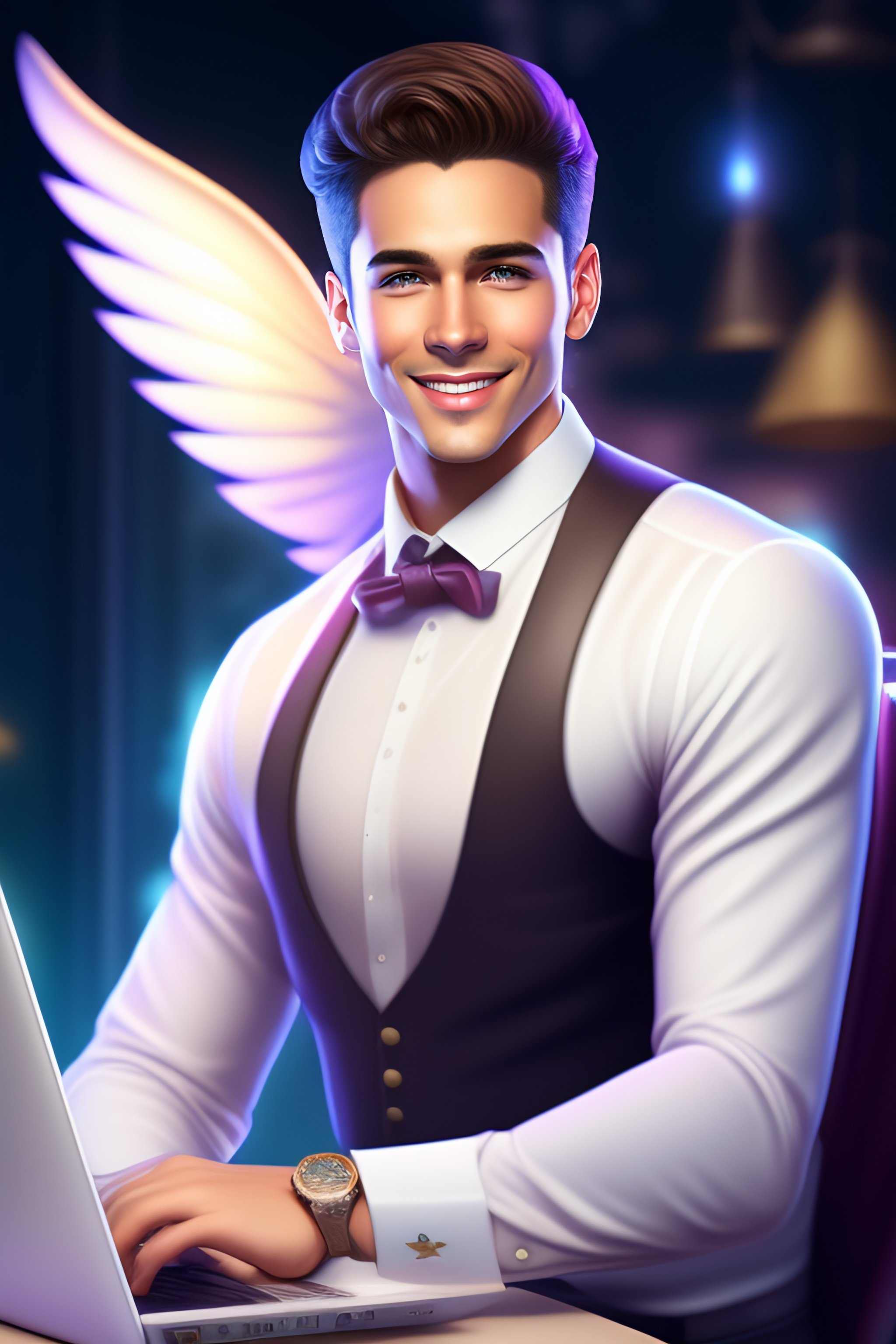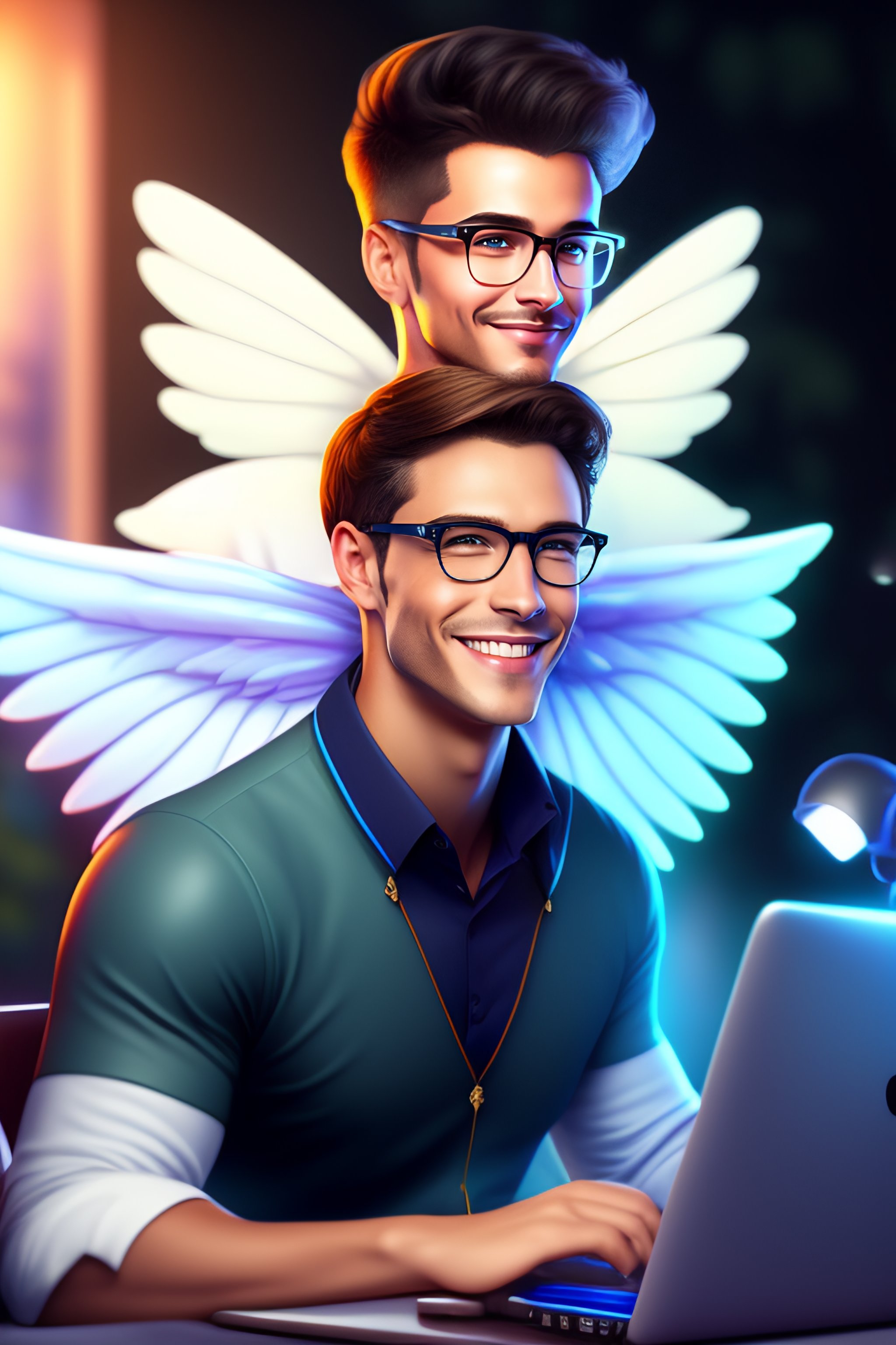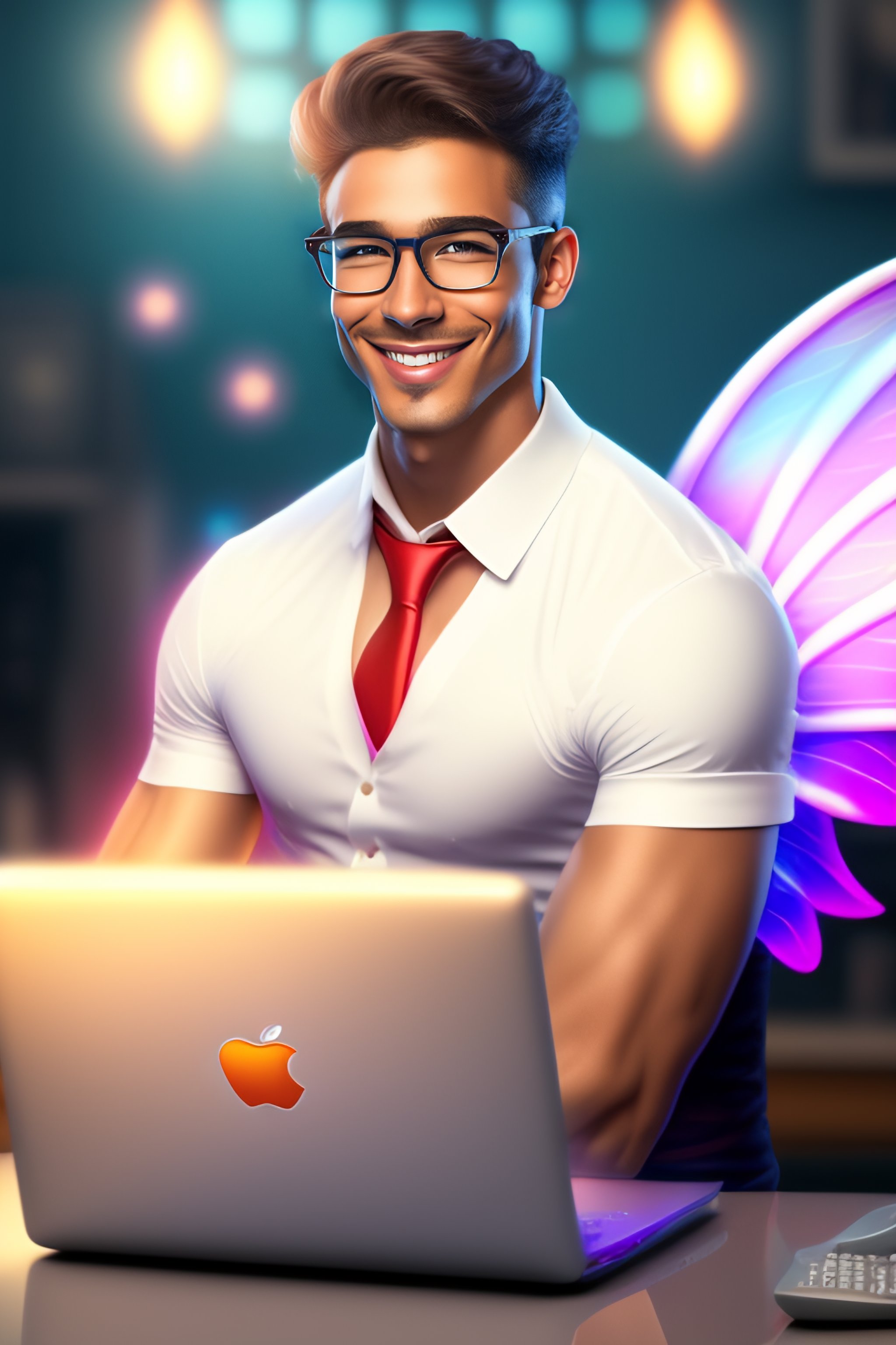 A white skin, smiling, epic professional digital art of a male nerd fairy with wings in a casual fit that looks a bit nerdy working on his computer, looks like a disney cartoon, best on art station.