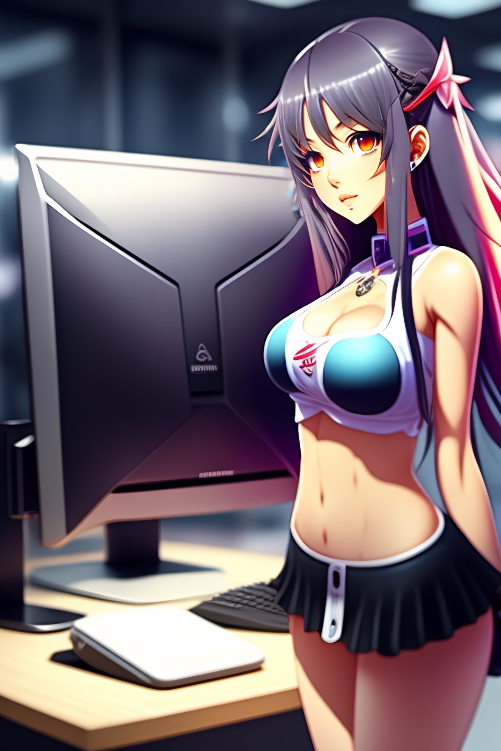 Sexy anime girl working in front of computer displays