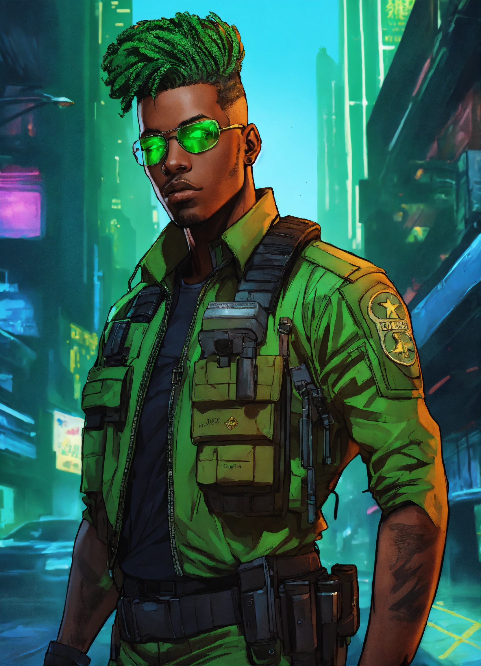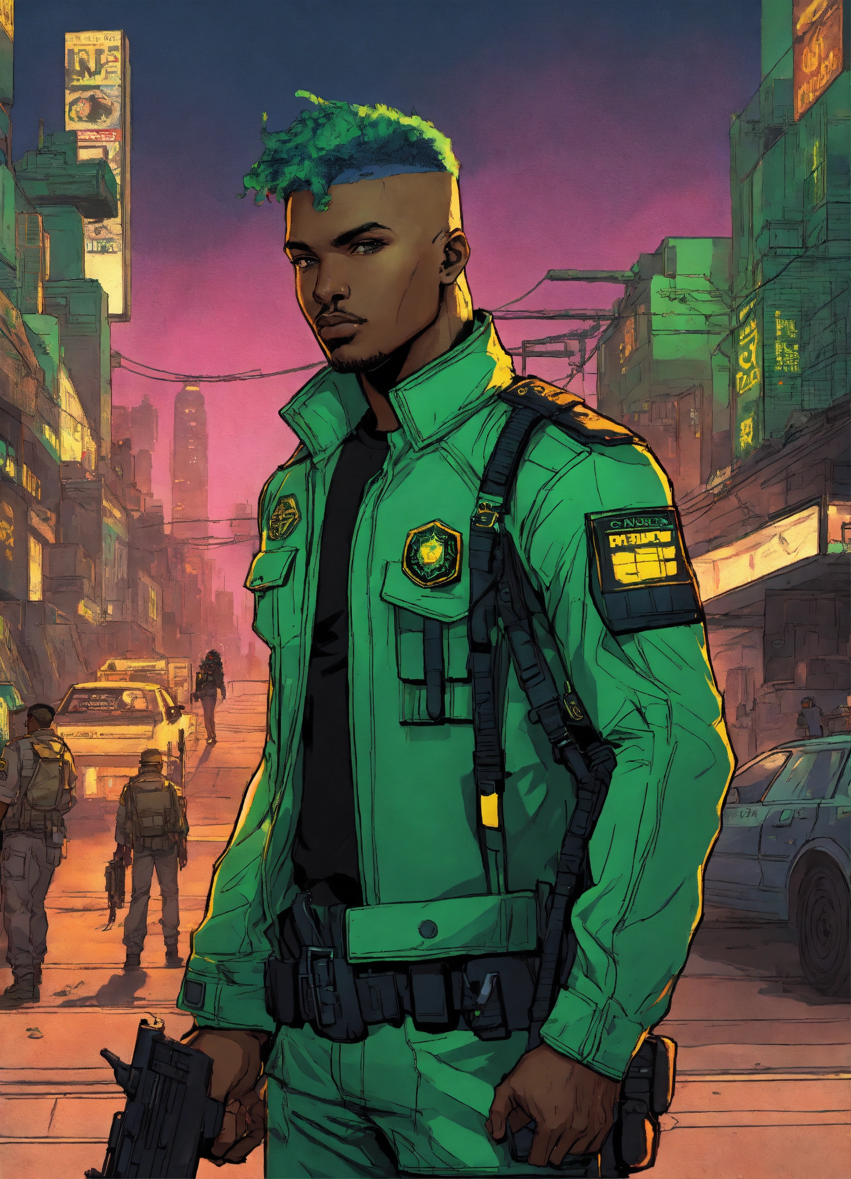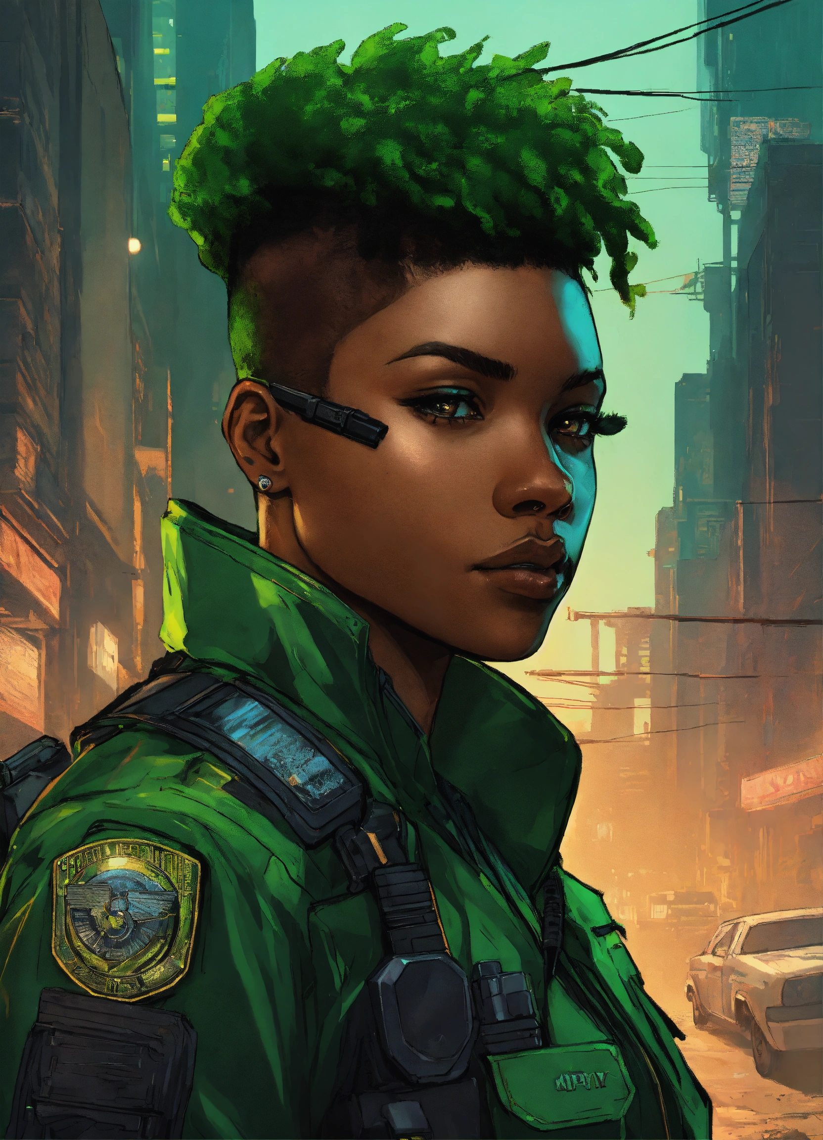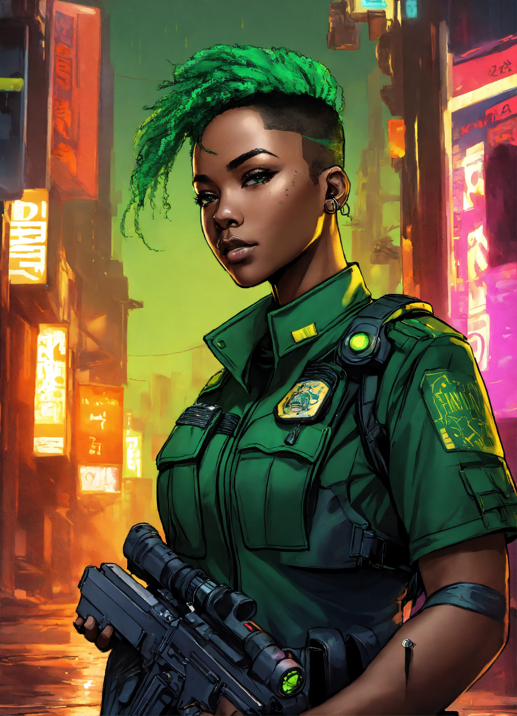 Cyberpunk african american cyberpunk cop in uniform with green hair in an ally gritty realistic comic book style