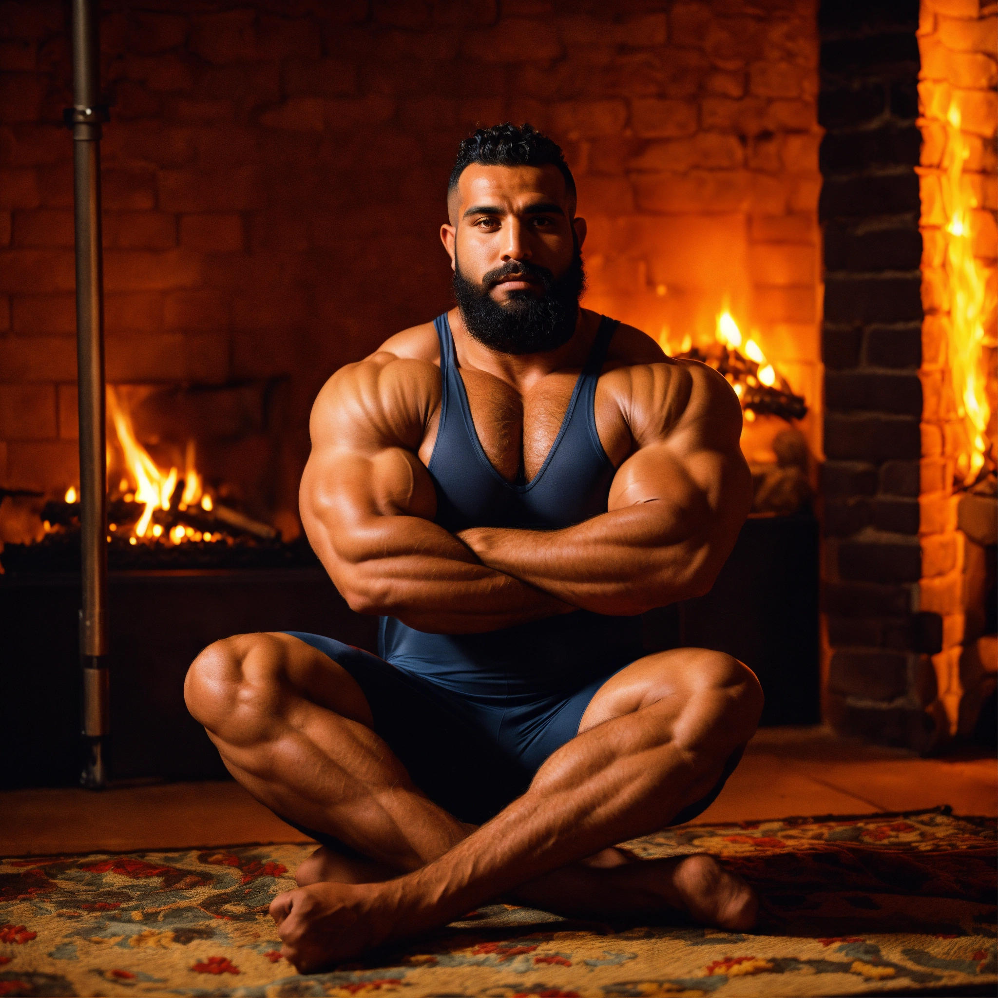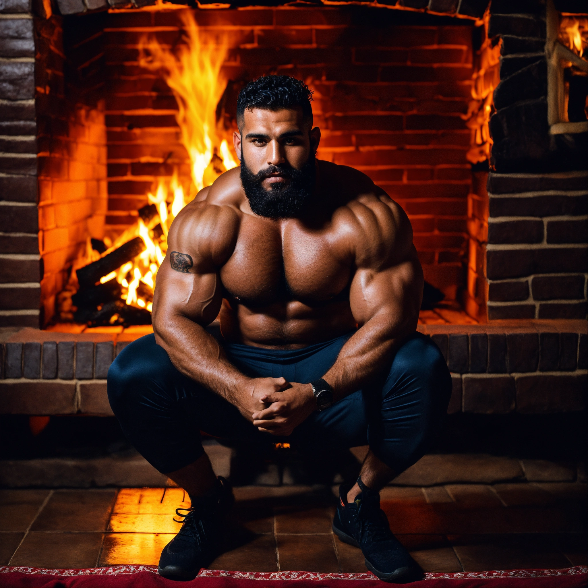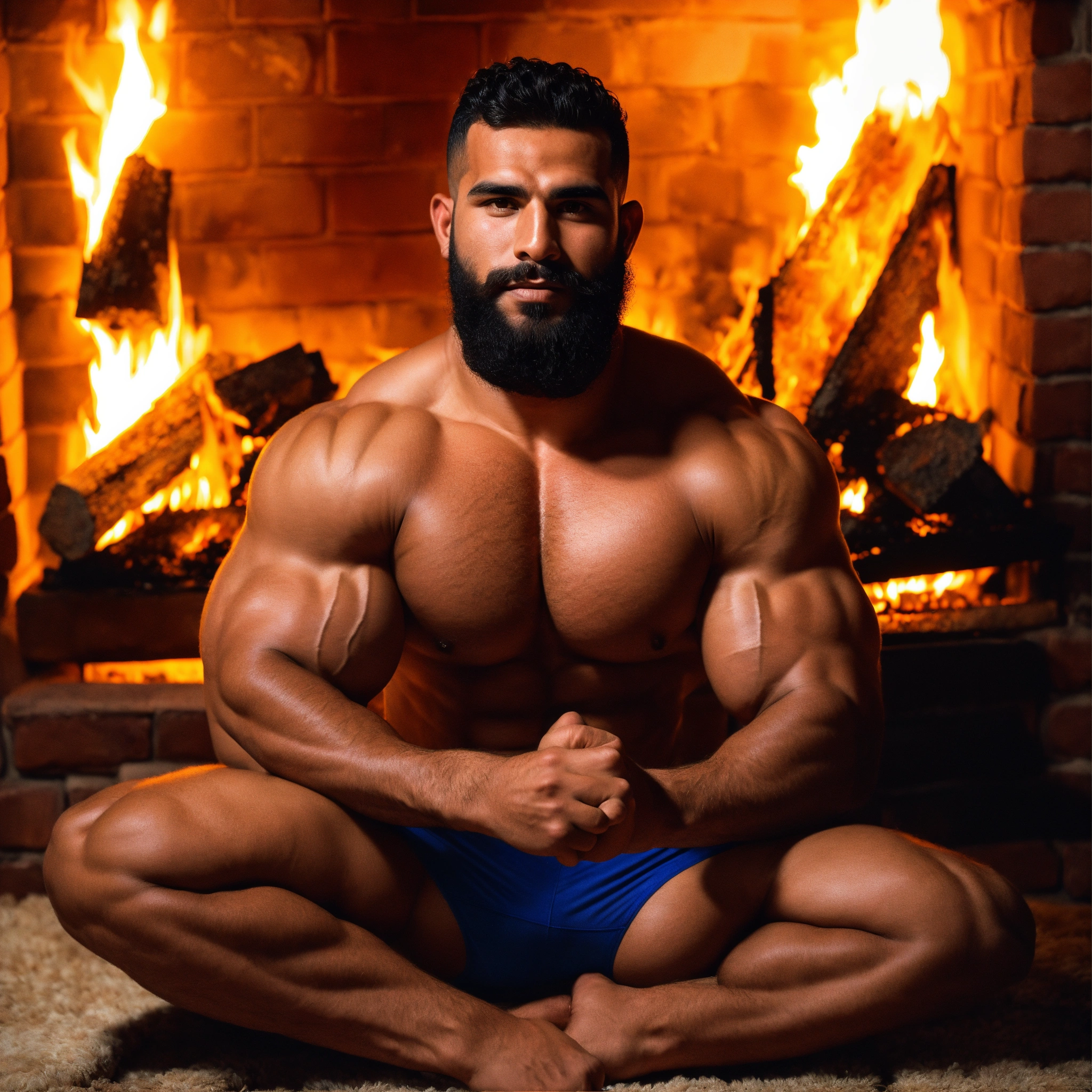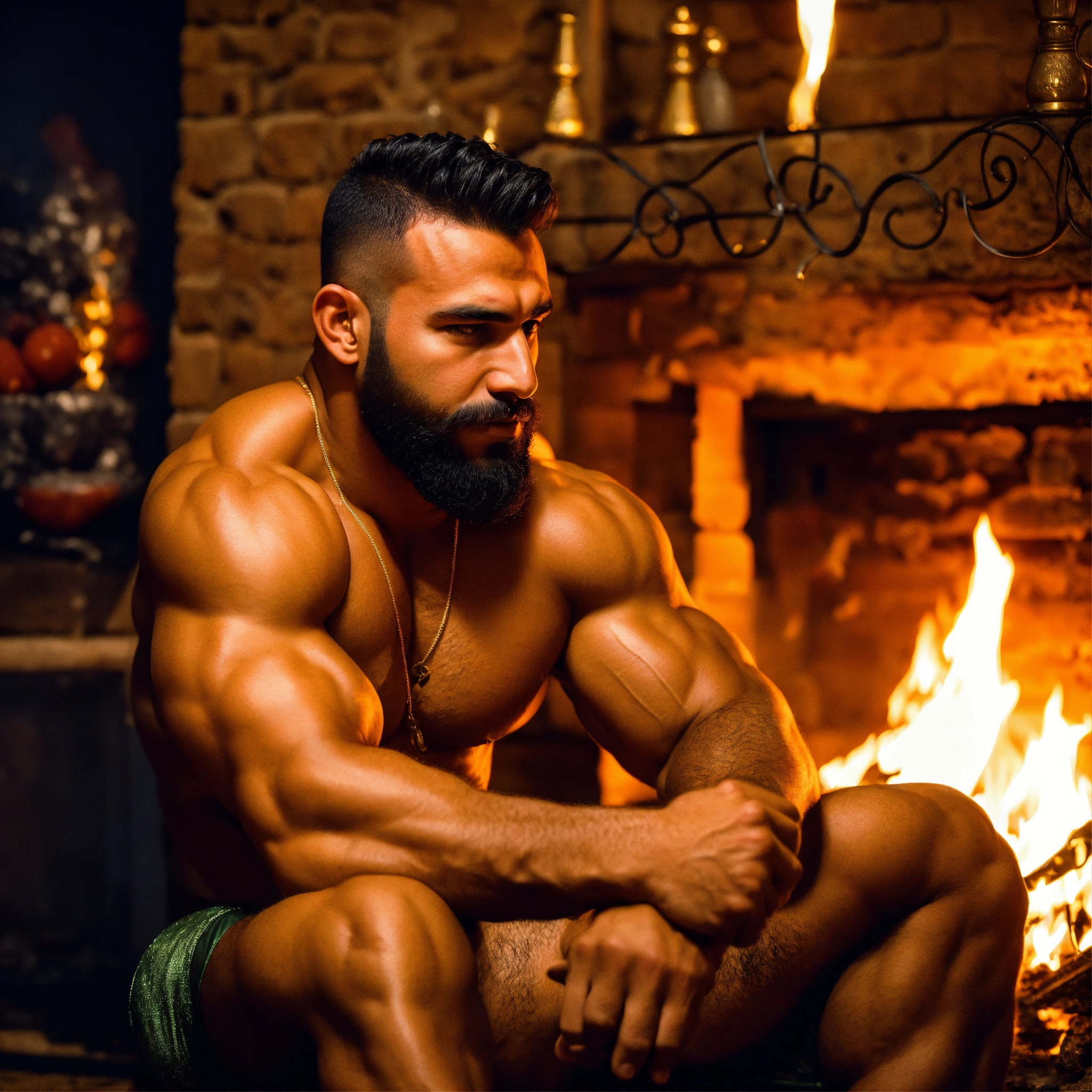 30-year-old hairy moroccan man with big muscles, big bodybuilder, body like a wrestler, sitting in front of a fireplace at midnight