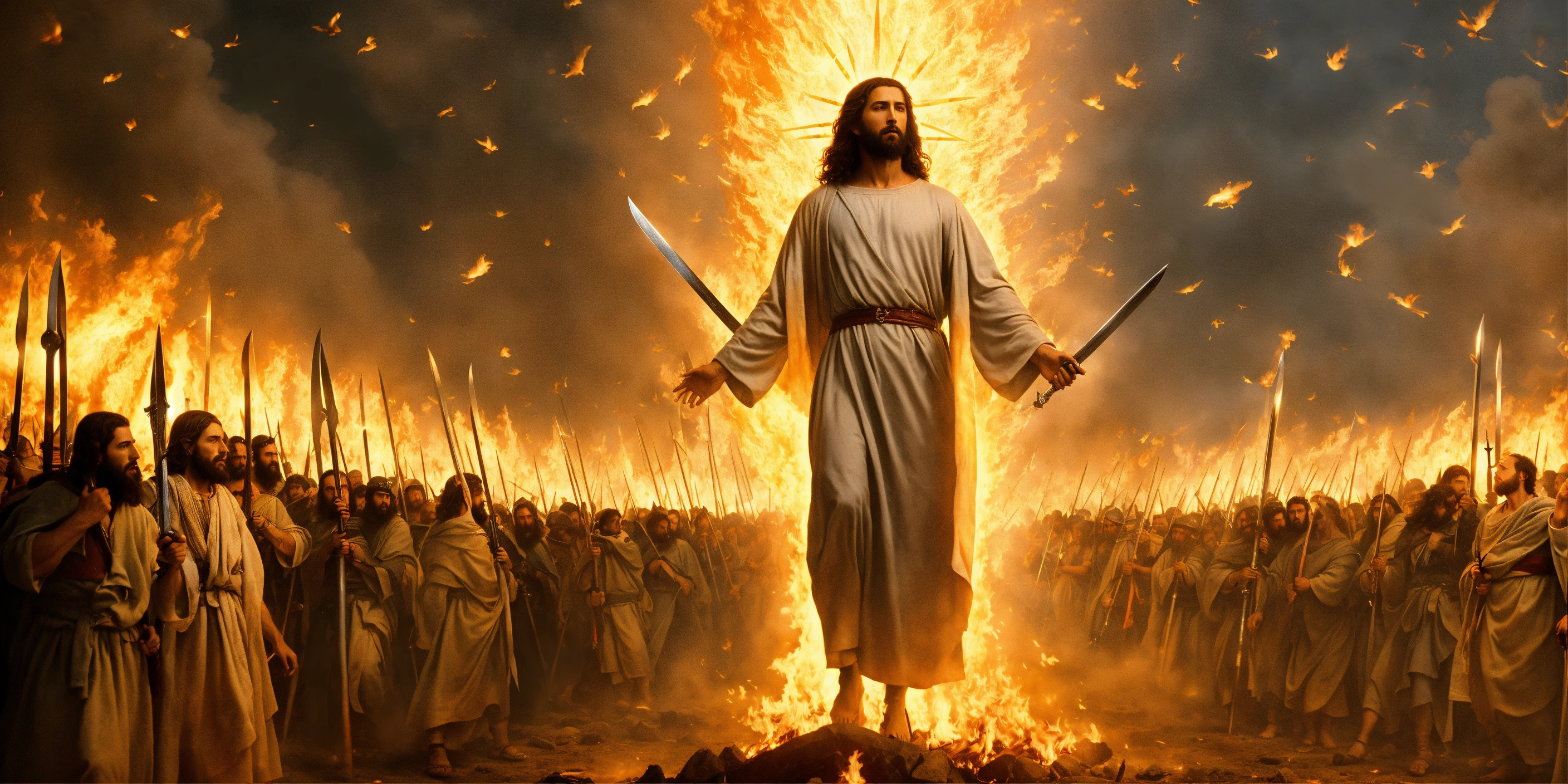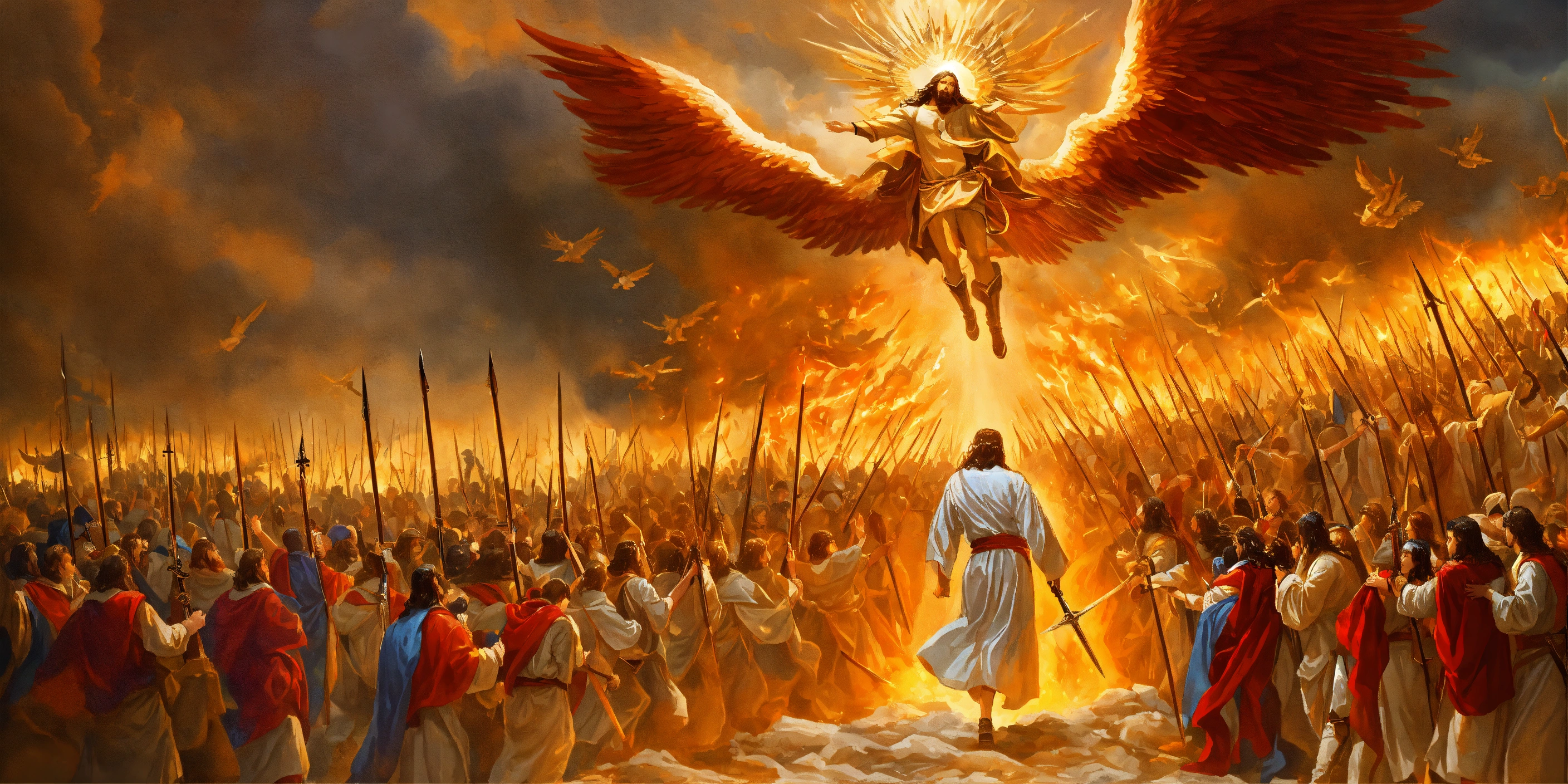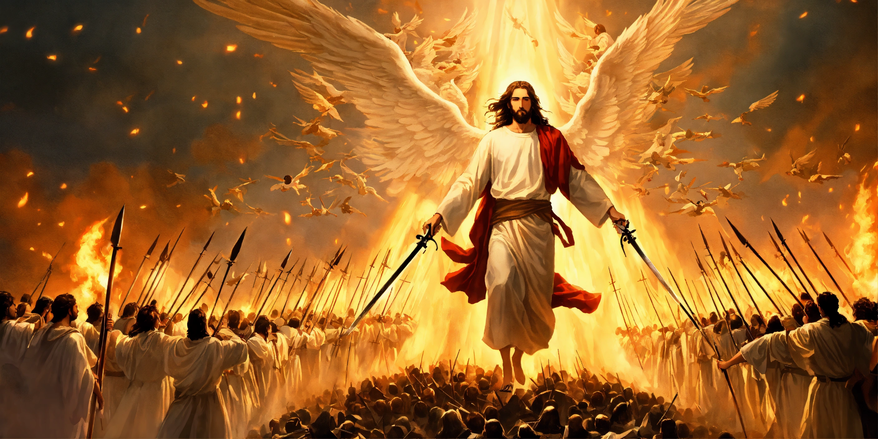 Jesus coming down from heaven into the battle of armageddon with thousands of angels with swords at his back fighting against evil men, fire, lighting, sharp