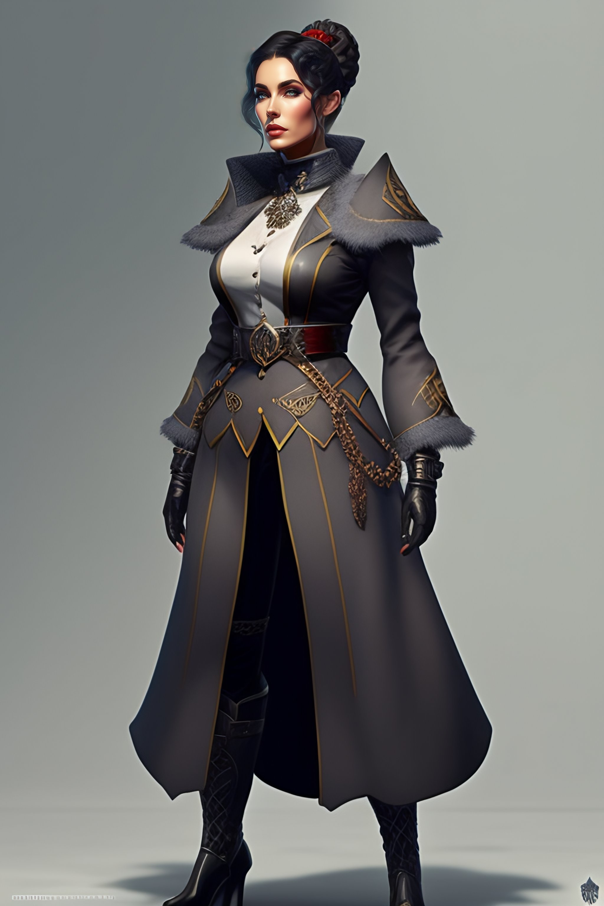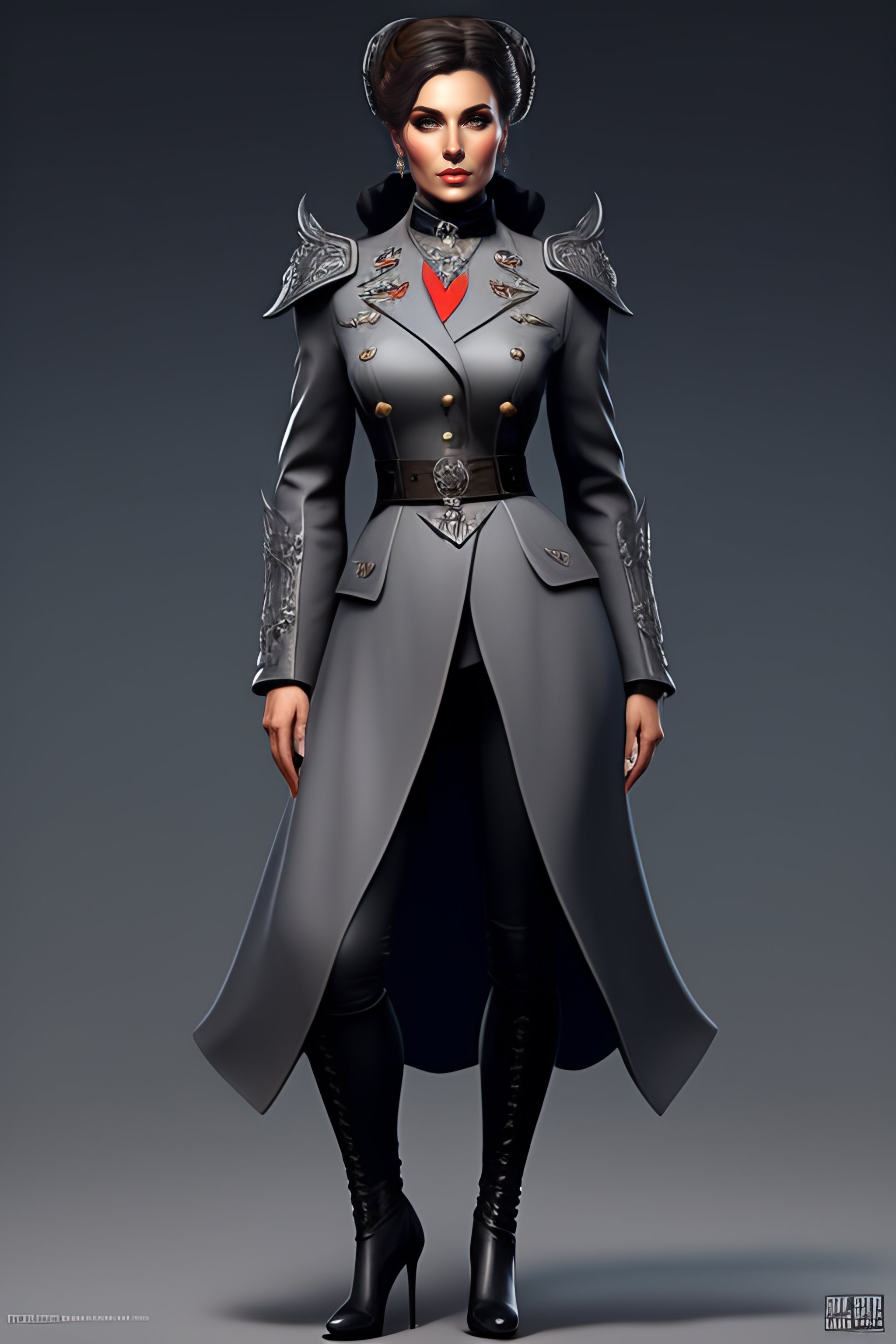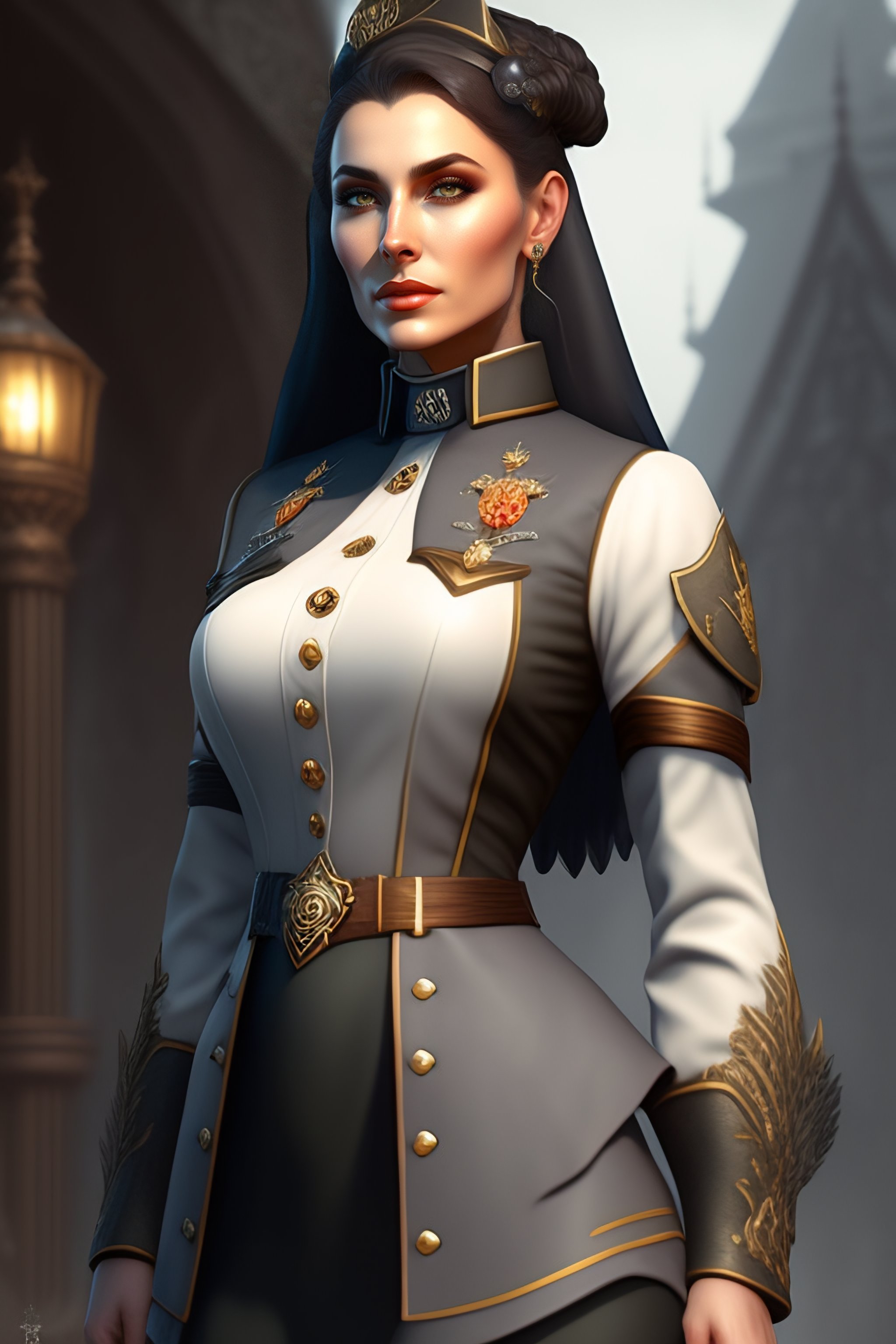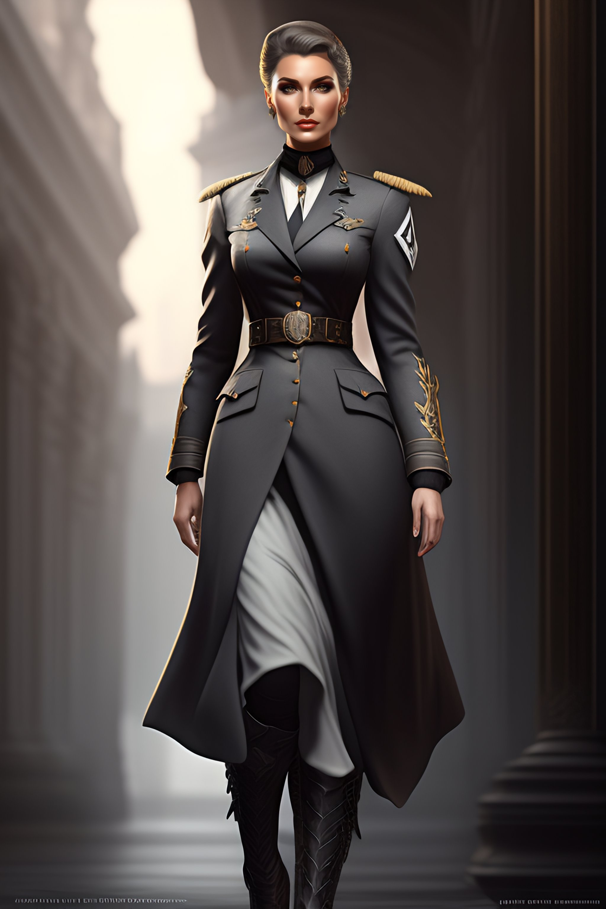 Woman gothic necromancer, wolfenstein military german wwii officer tight-fitting clothing, grey color, full body shot, d&d, fantasy, intricate, elegant, highly detailed, digital painting, artstation, concept art, matte, sharp focus, illustration, art by artgerm and greg rutkowski and alphonse mucha