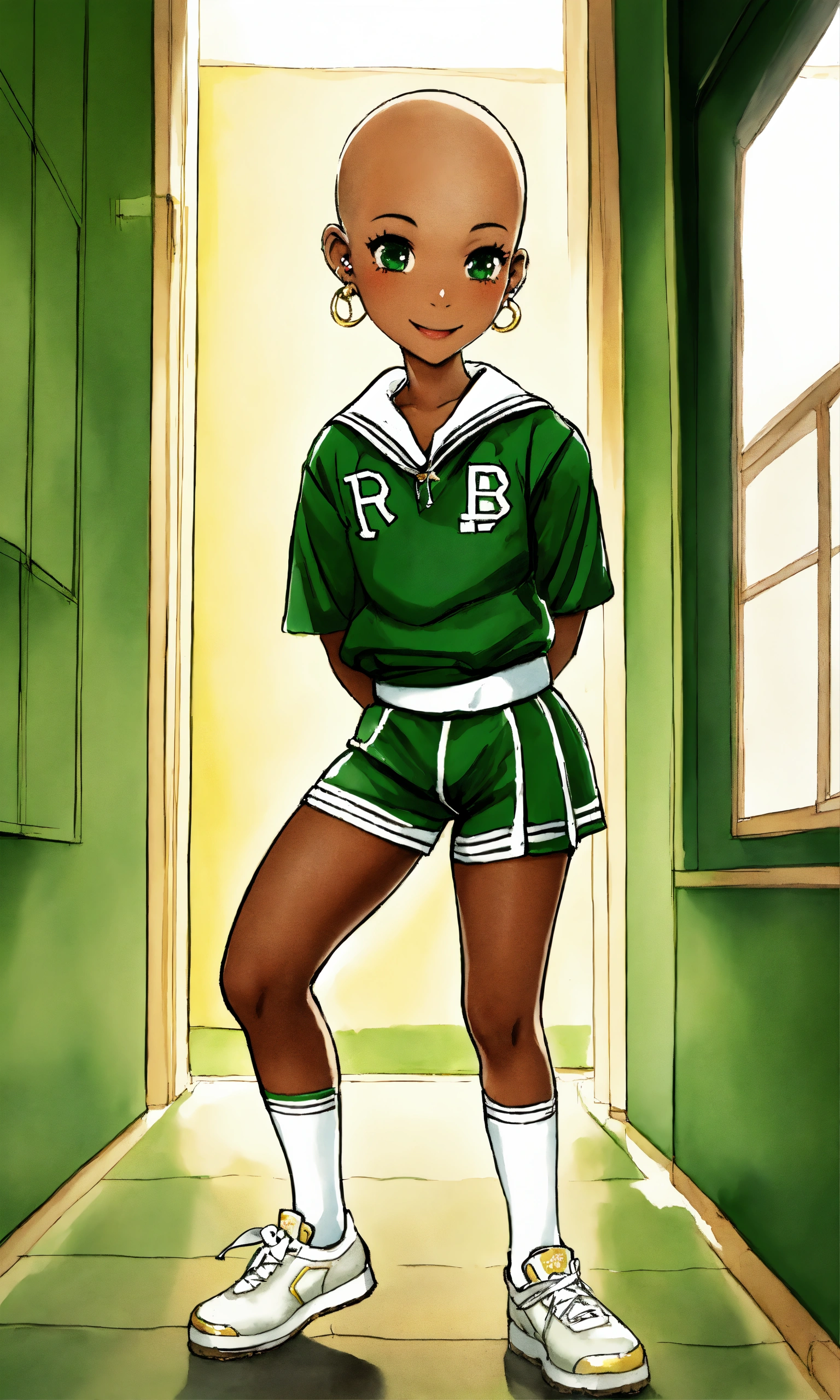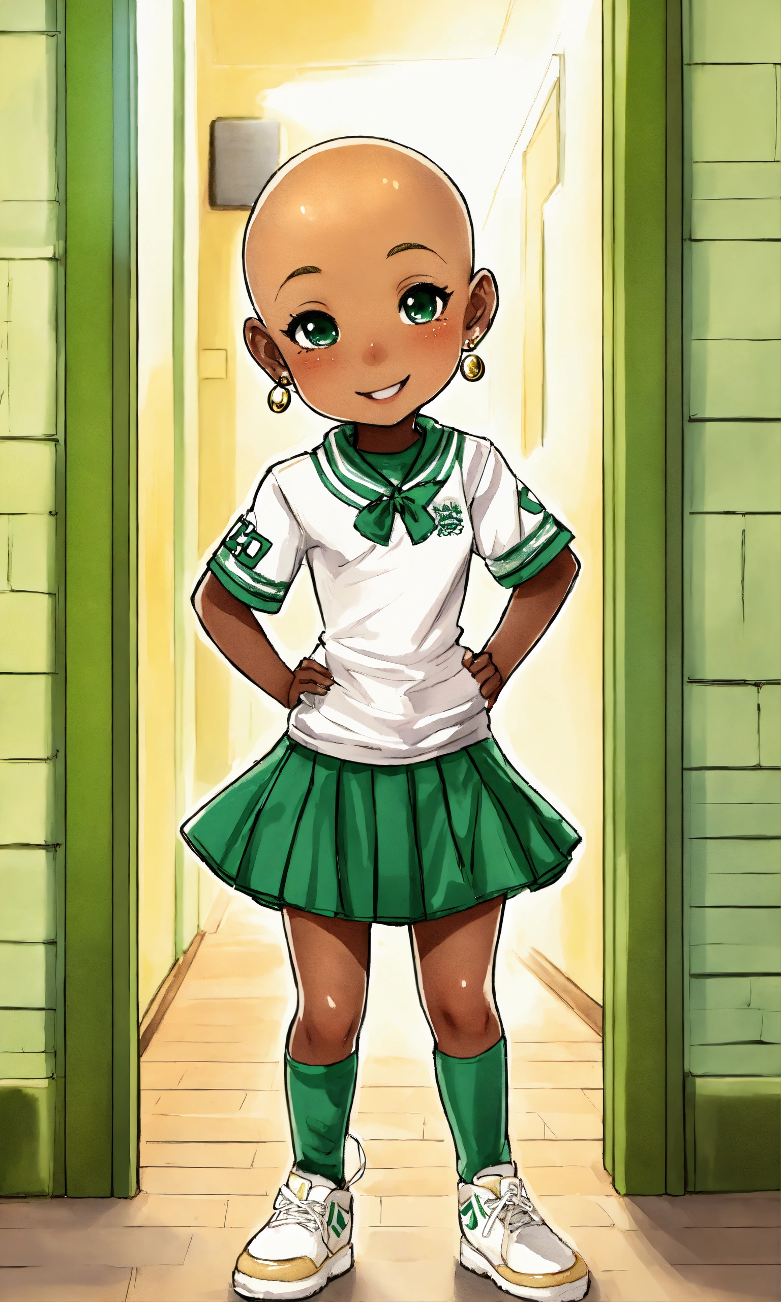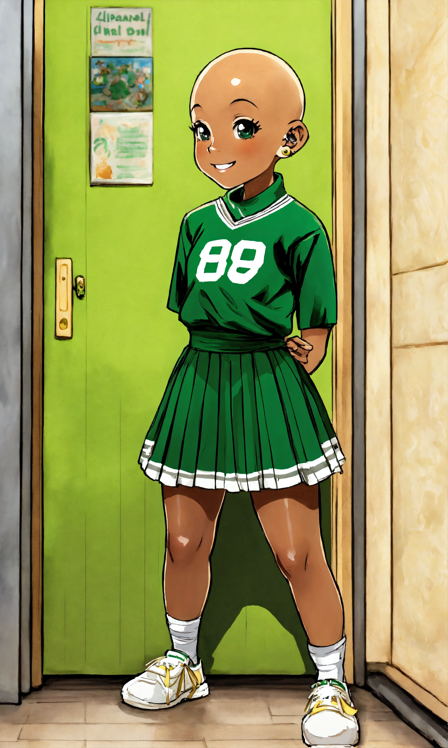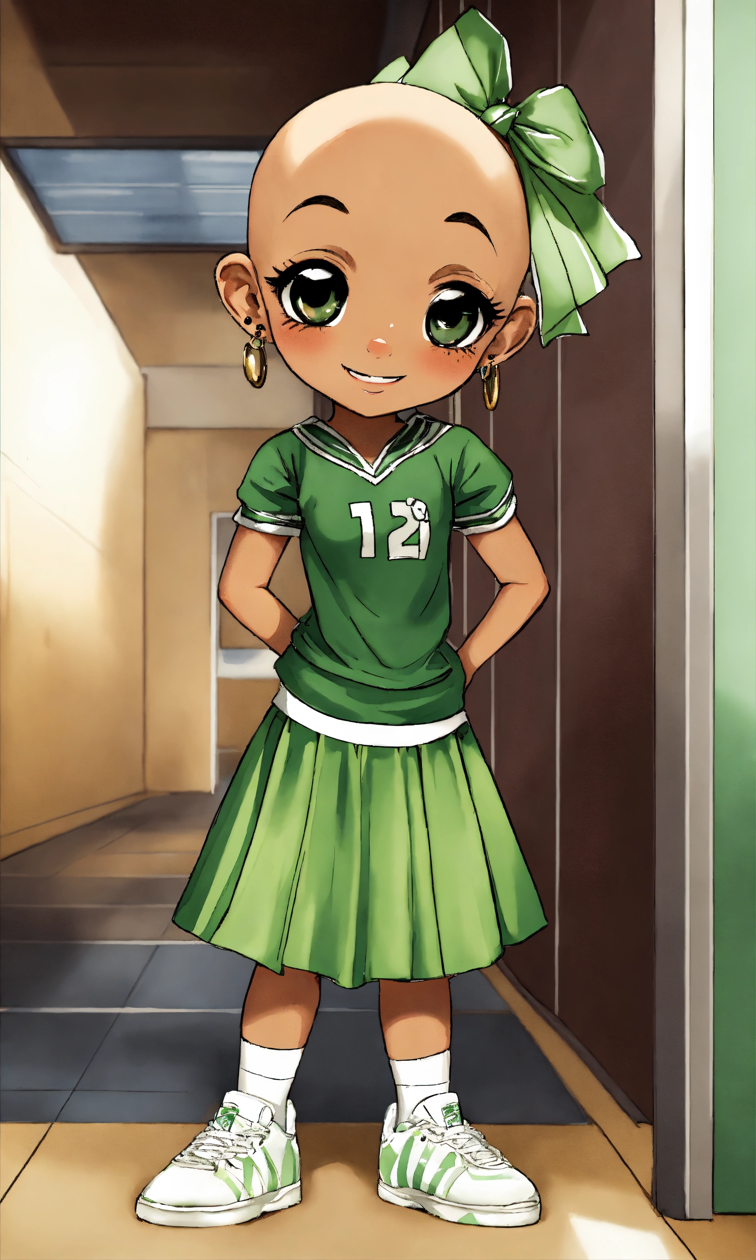 Hd manga kewpie anime dark complexion black 12 year old smiling bald girl with full alopecia, small gold stud earrings, wearing green and white cheerleading outfit standing and leaning her leg against a plaster wall in a school hallway, alopecia awareness, bald head and no eyebrows, airbrushed watercolor art style