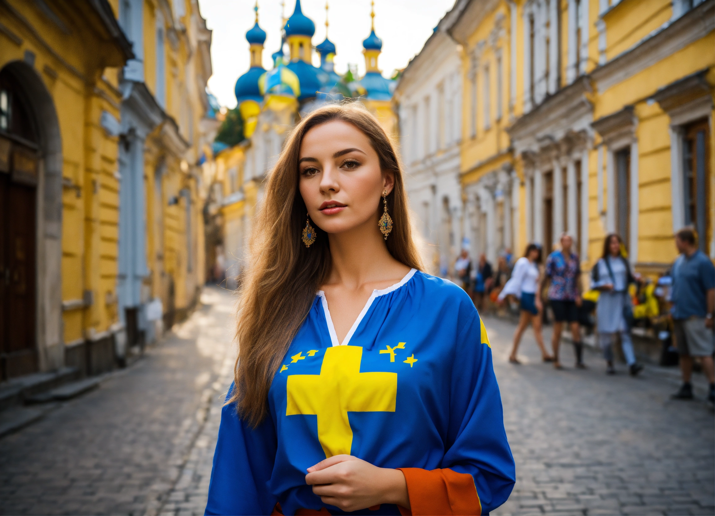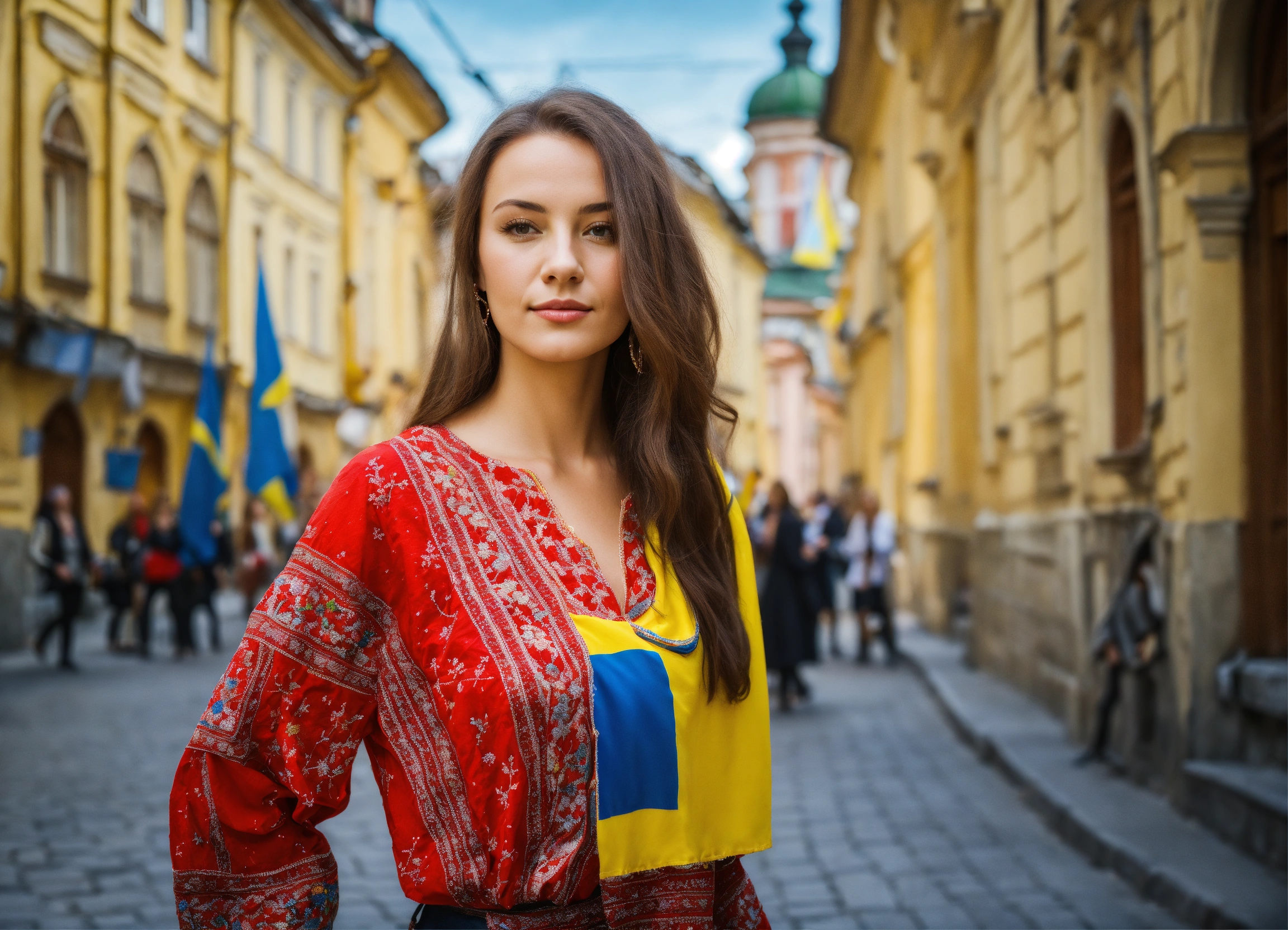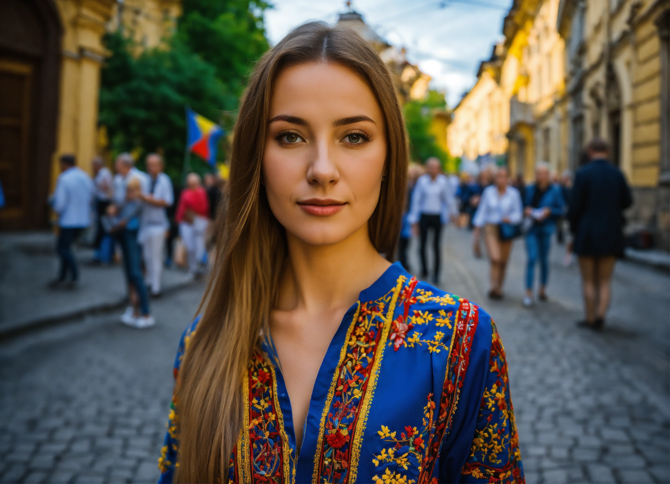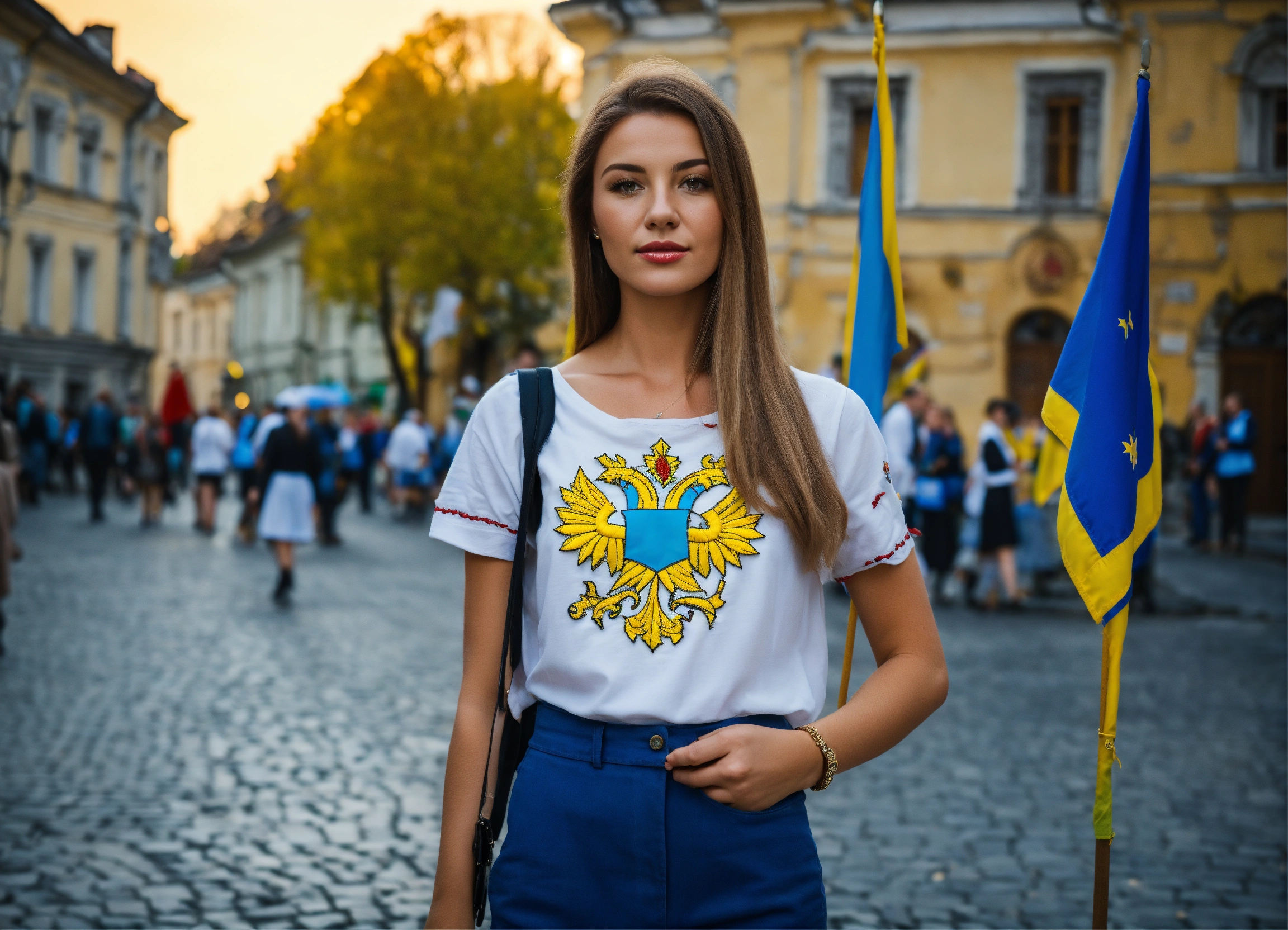 Beautiful woman with ukraine, on street lviv, without glasses, tourism, light hair, with ukraine flags, dressed in embroidered shirt