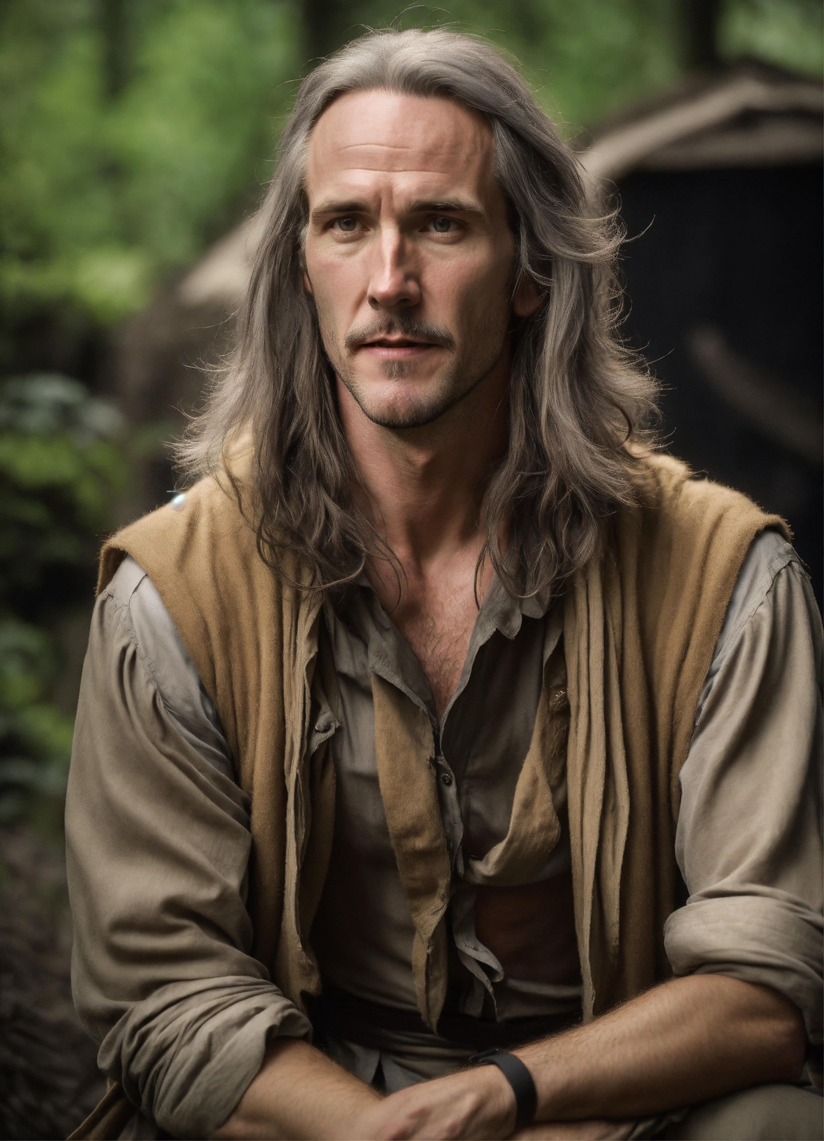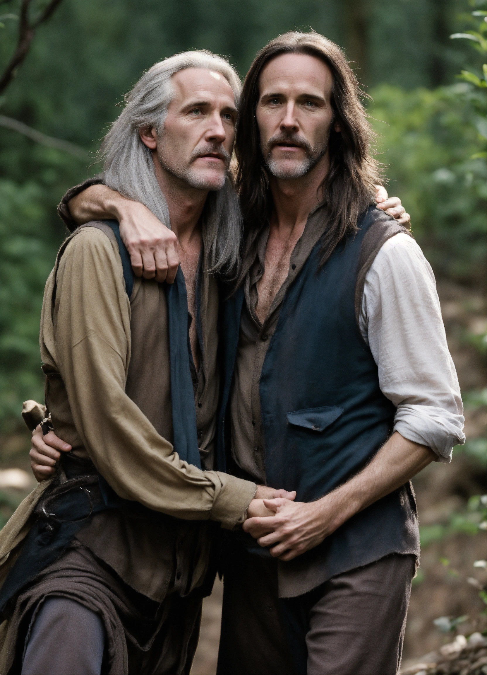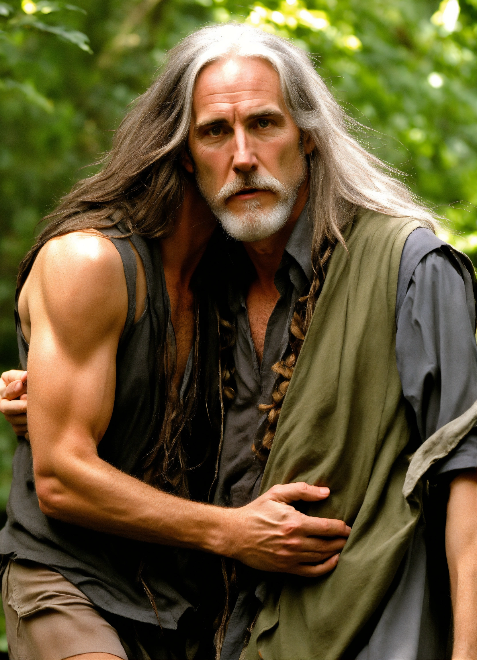 In photographic style matt mercer as a tall long distance runner with long straight gray hair as a hermit madman, matt mercer is older wrinkled now but still lithe elegant gaunt features, thin wiry arms, very hairy chest, long sleeveless vest, open shirt, with a silly look on his face as he hugs liam o'brien
