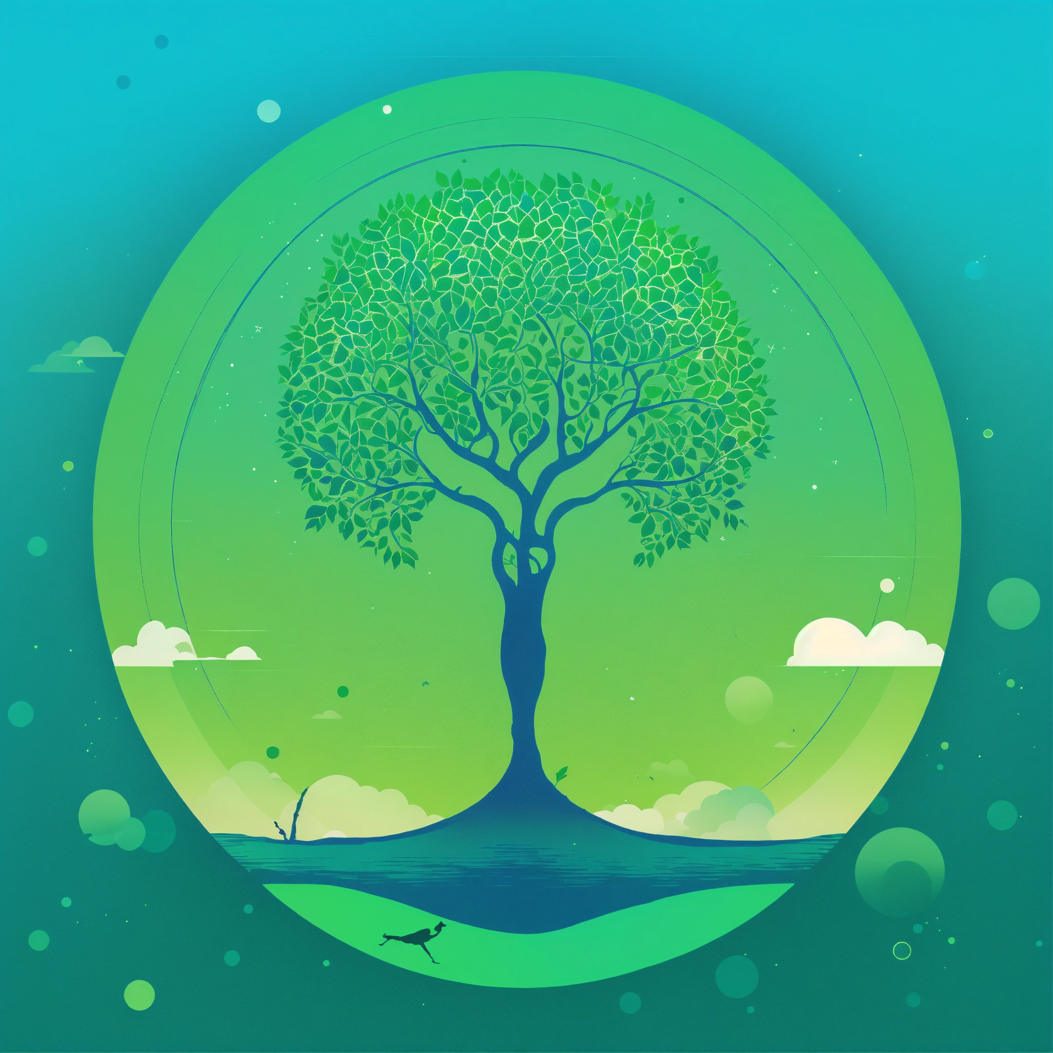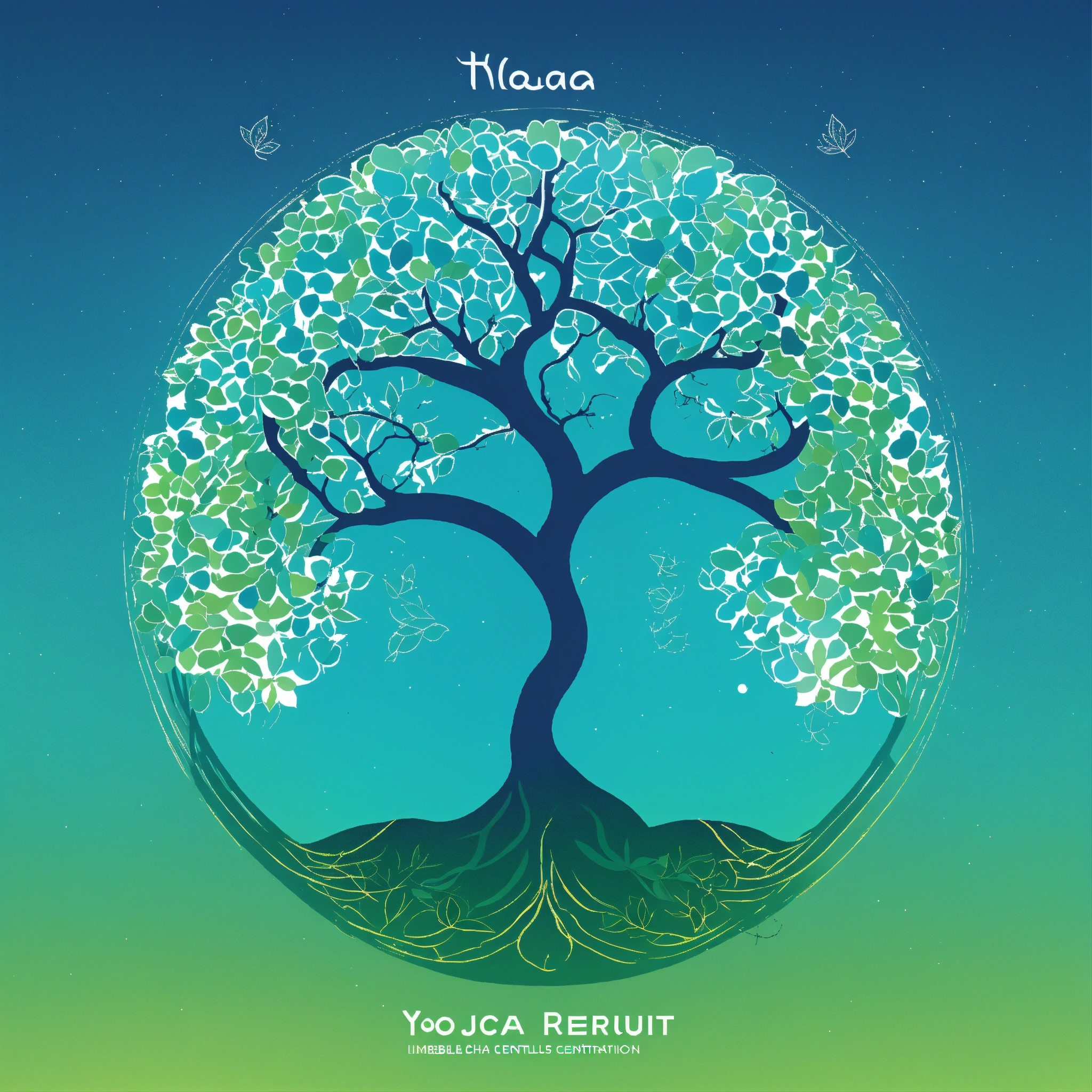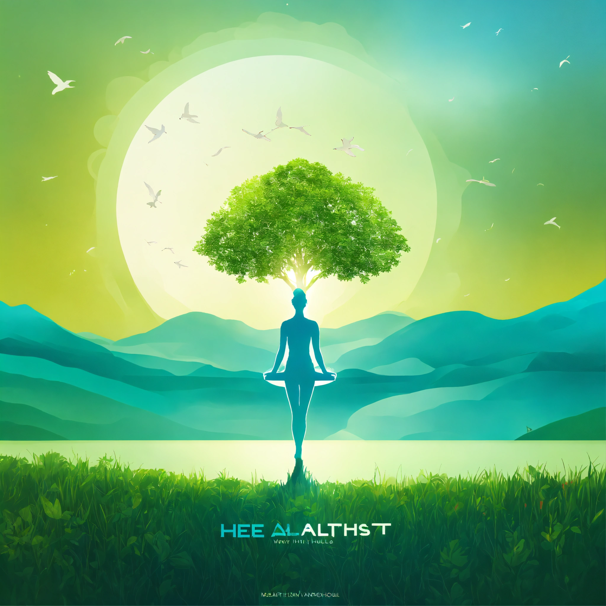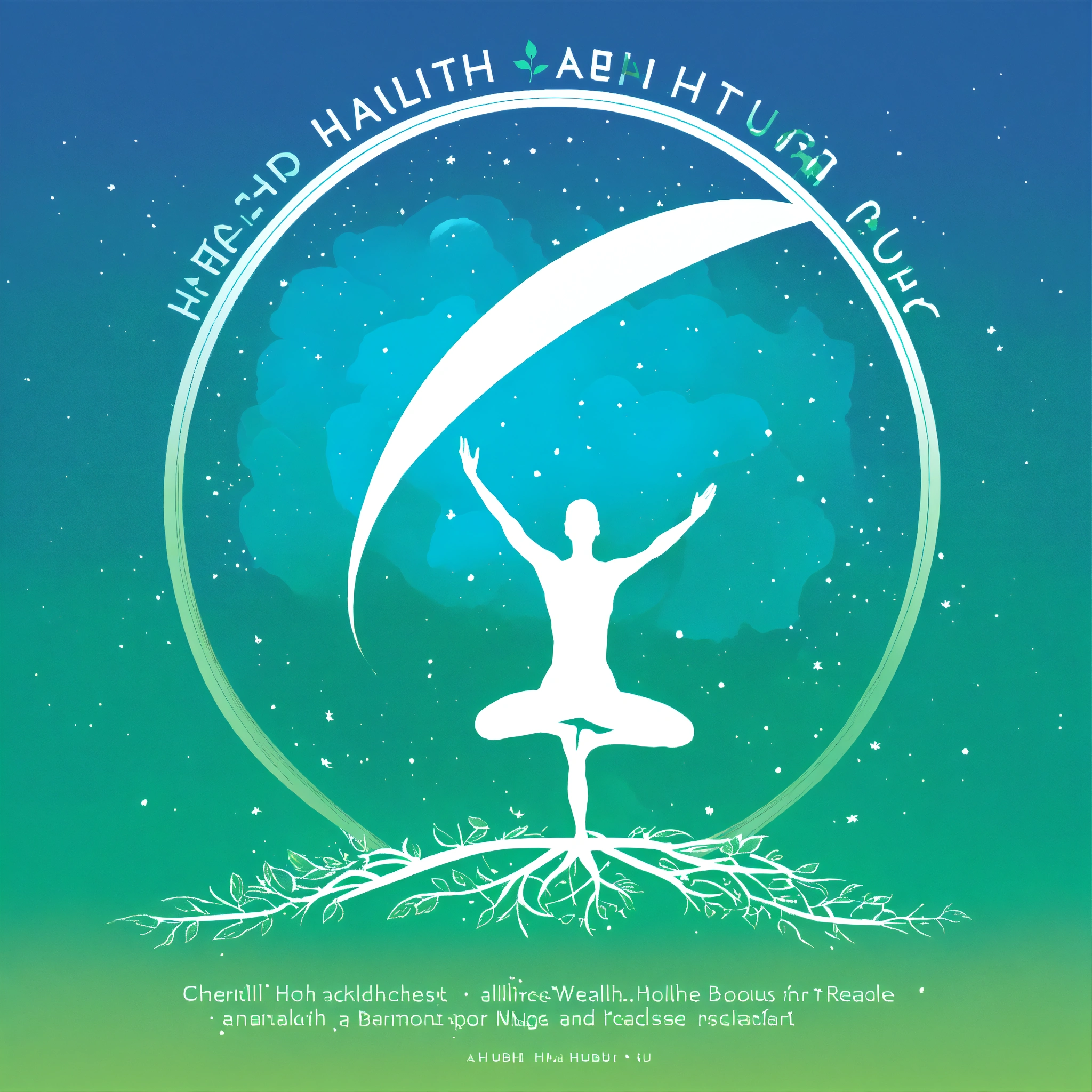 Background top half sky blue to represent the sky. bottom half vibrant green to represent the earth, creating a horizon effect. foreground left side a stylized tree with deep roots, symbolizing growth and grounding. right side a silhouette of a person in a yoga pose, representing wellness and balance. central element text the channel name "health horizon hub" in bold, white, modern typography, centrally placed to stand out against the gradient background. additional elements icon a small heartbeat or leaf icon in one corner to add a health touch. border a thin white circular border to give a finished look. style theme nature and wellness. colors sky blue, vibrant green, and white. typography modern and bold, ensuring readability even in smaller dimensions.
