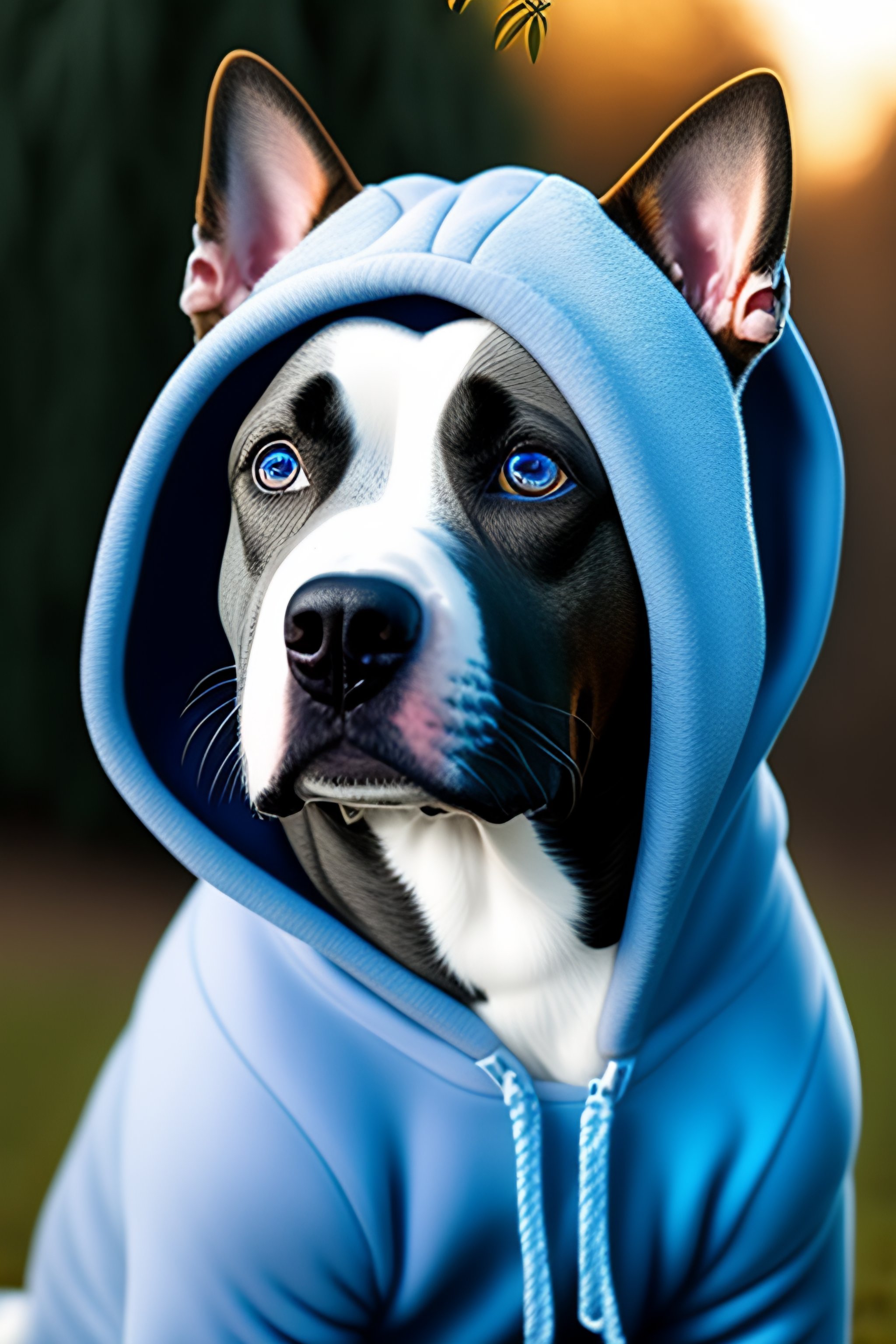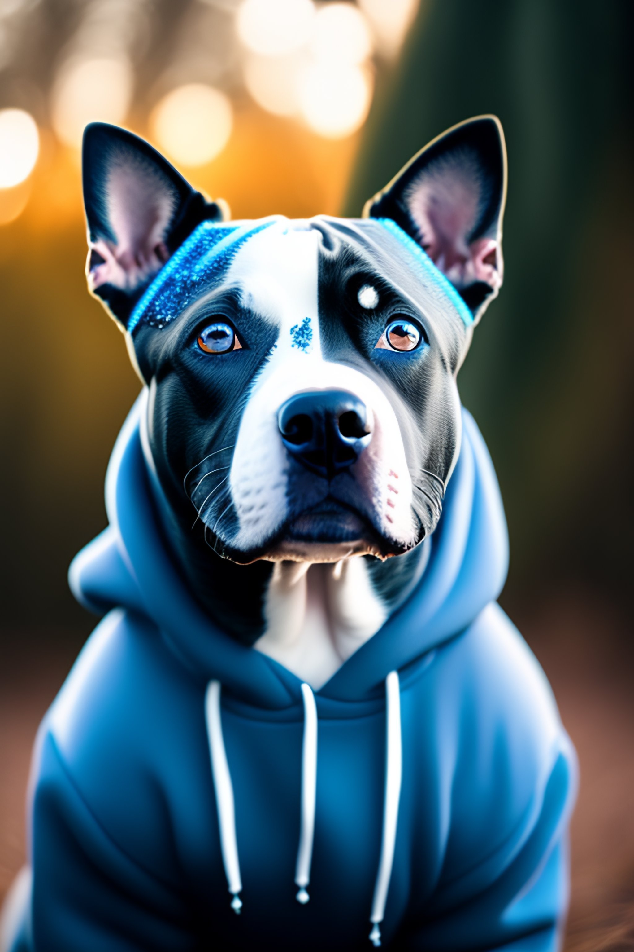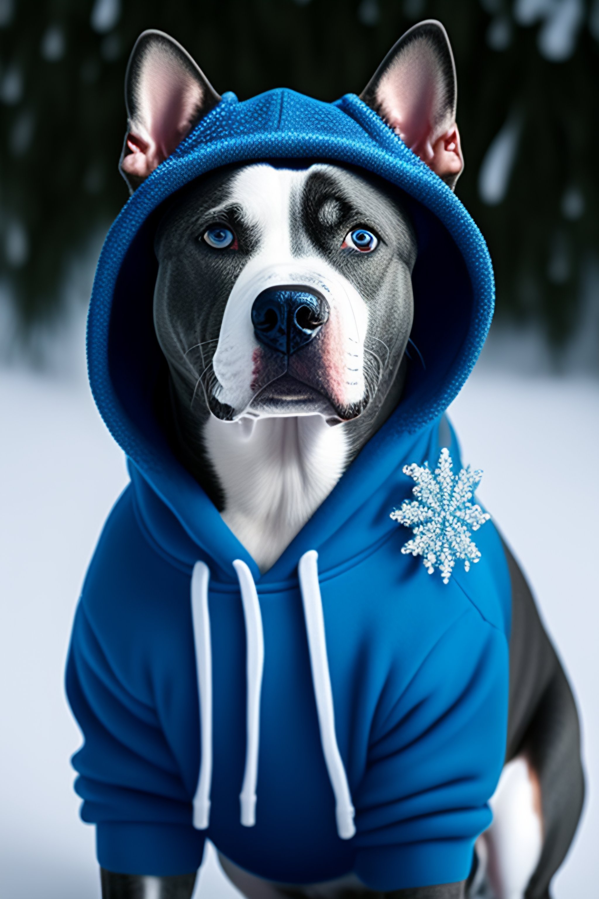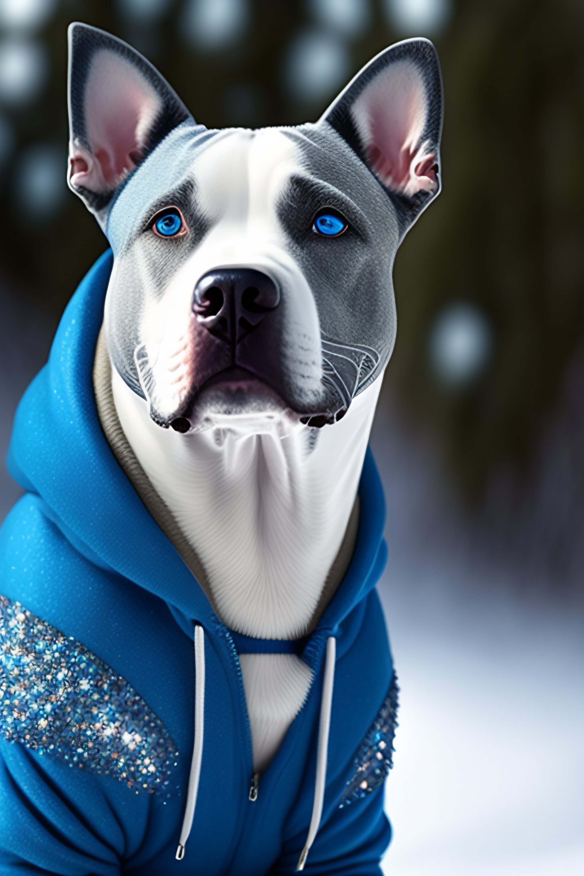 Gray staffy with blue eyes wearing blue sequin hoodie standing in front of a frozen bush