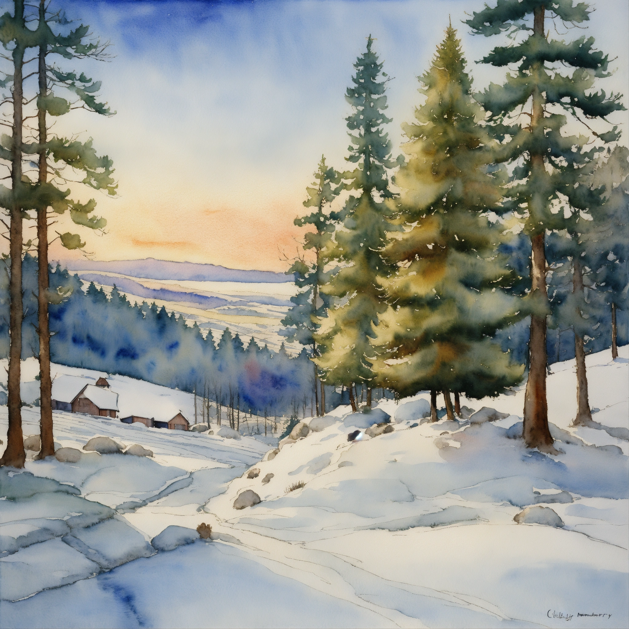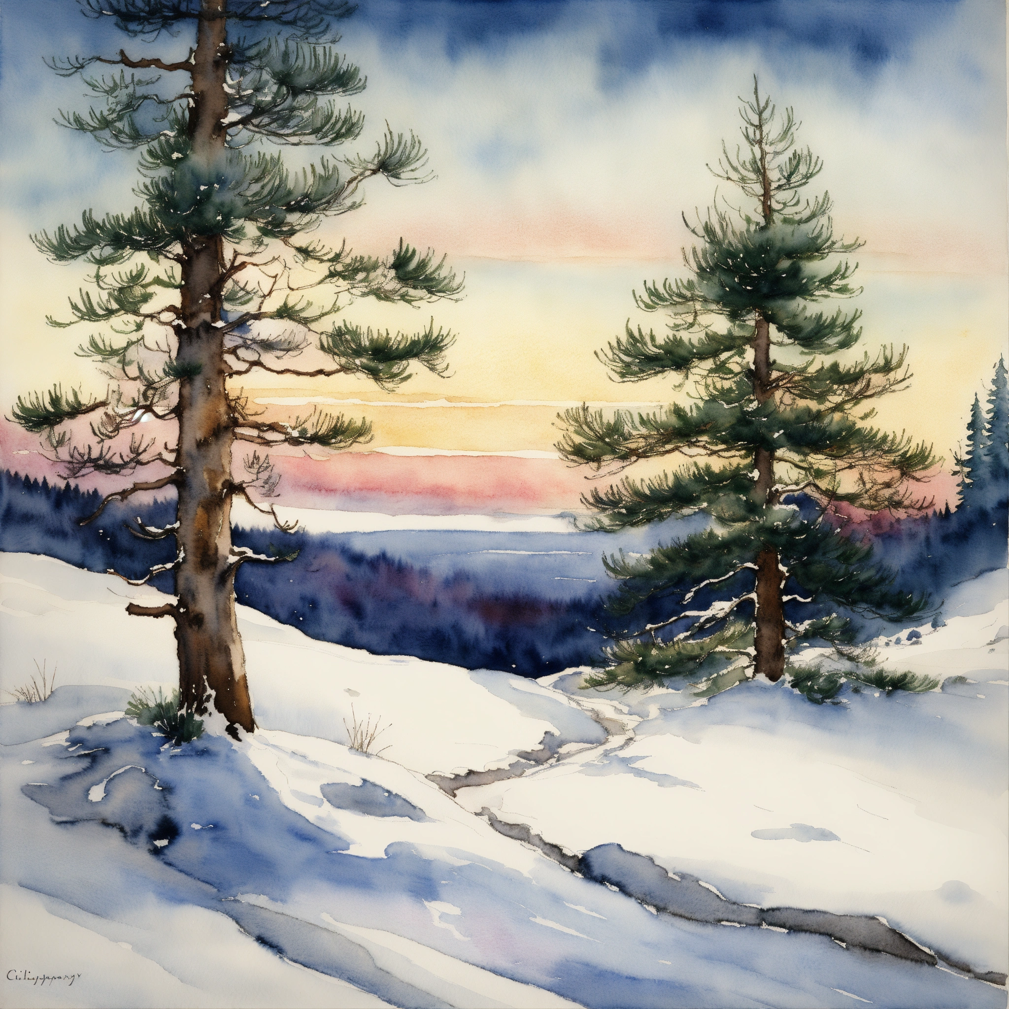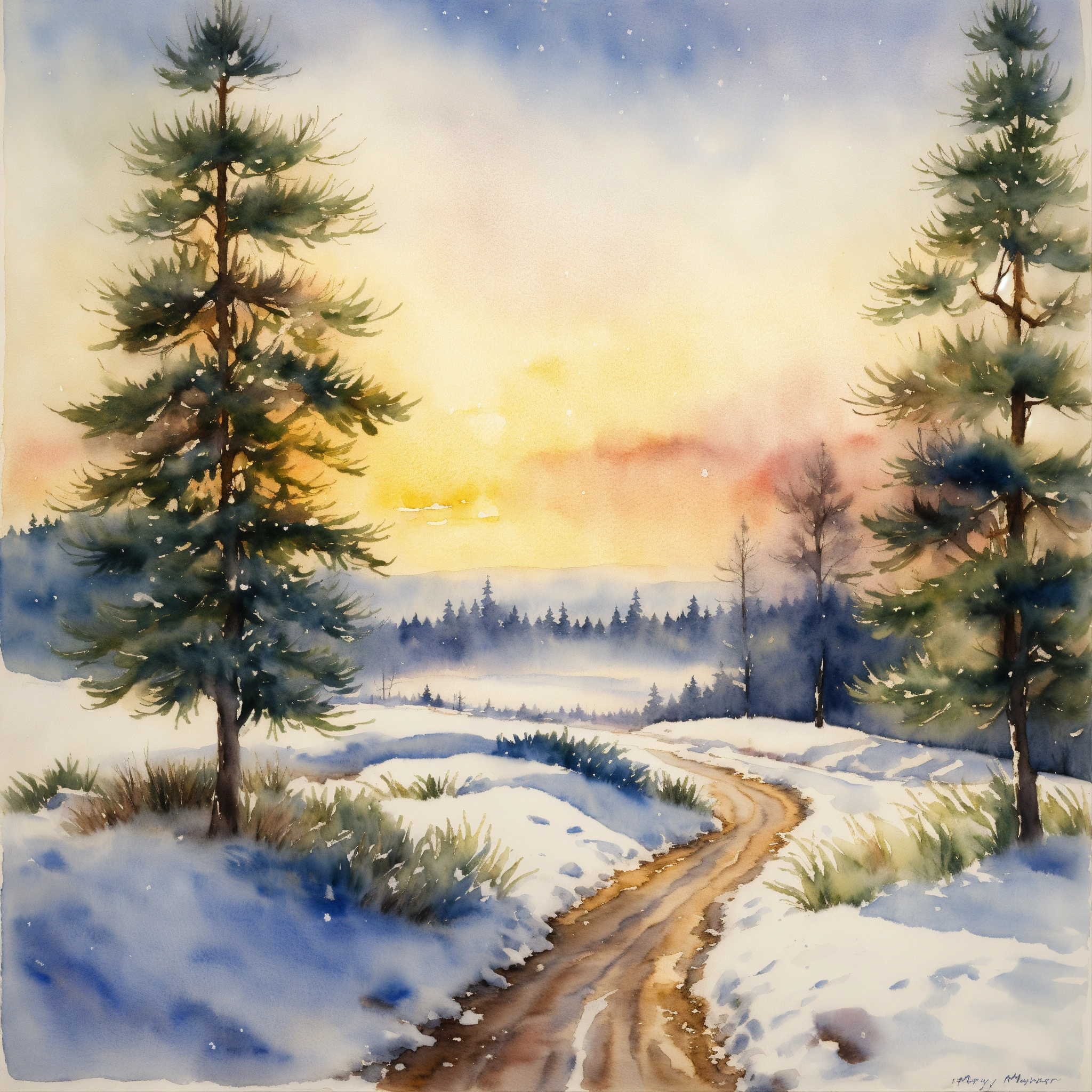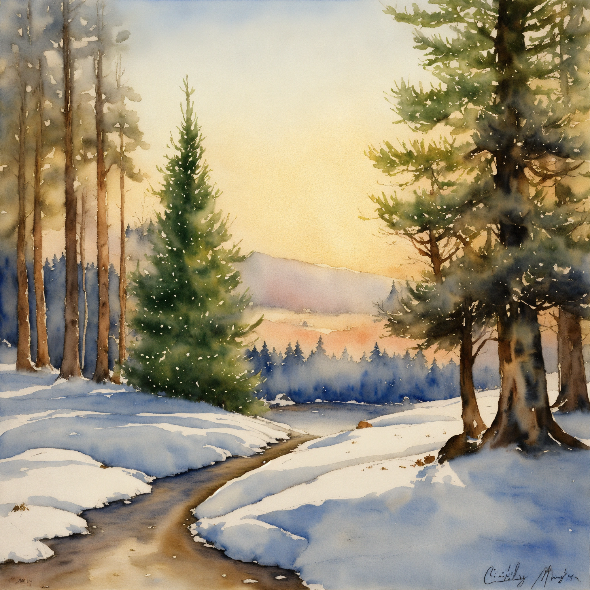 A single white christmas tree, winter landscape, morning, bright colors, pine trees, frozen ground, watercolour by cicely mary barker