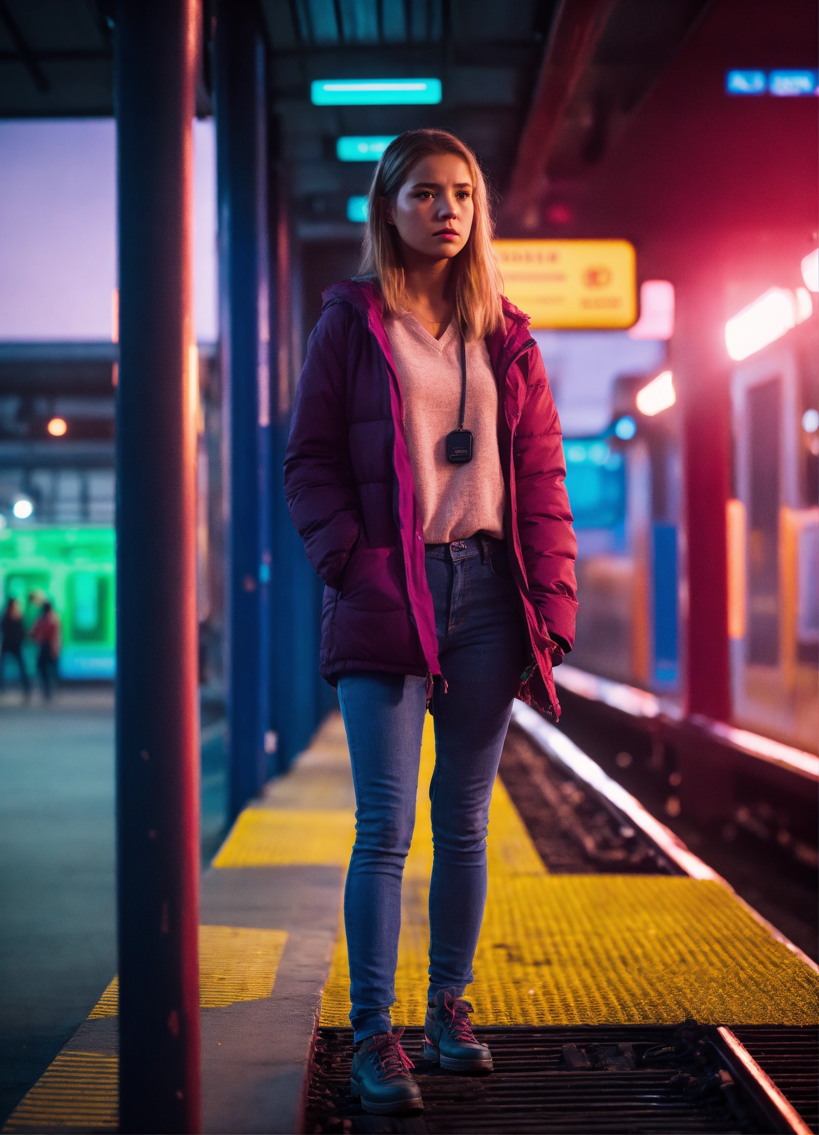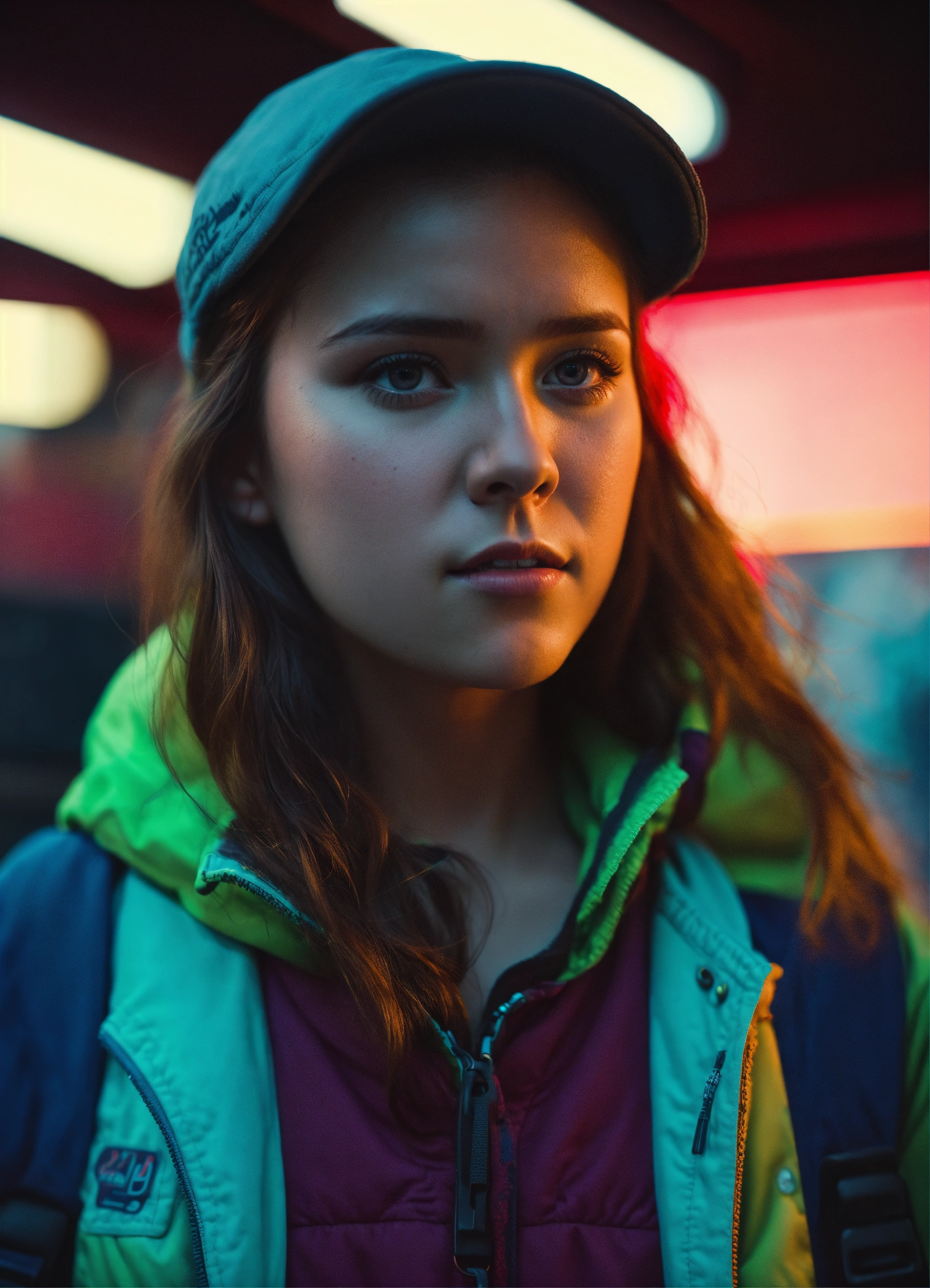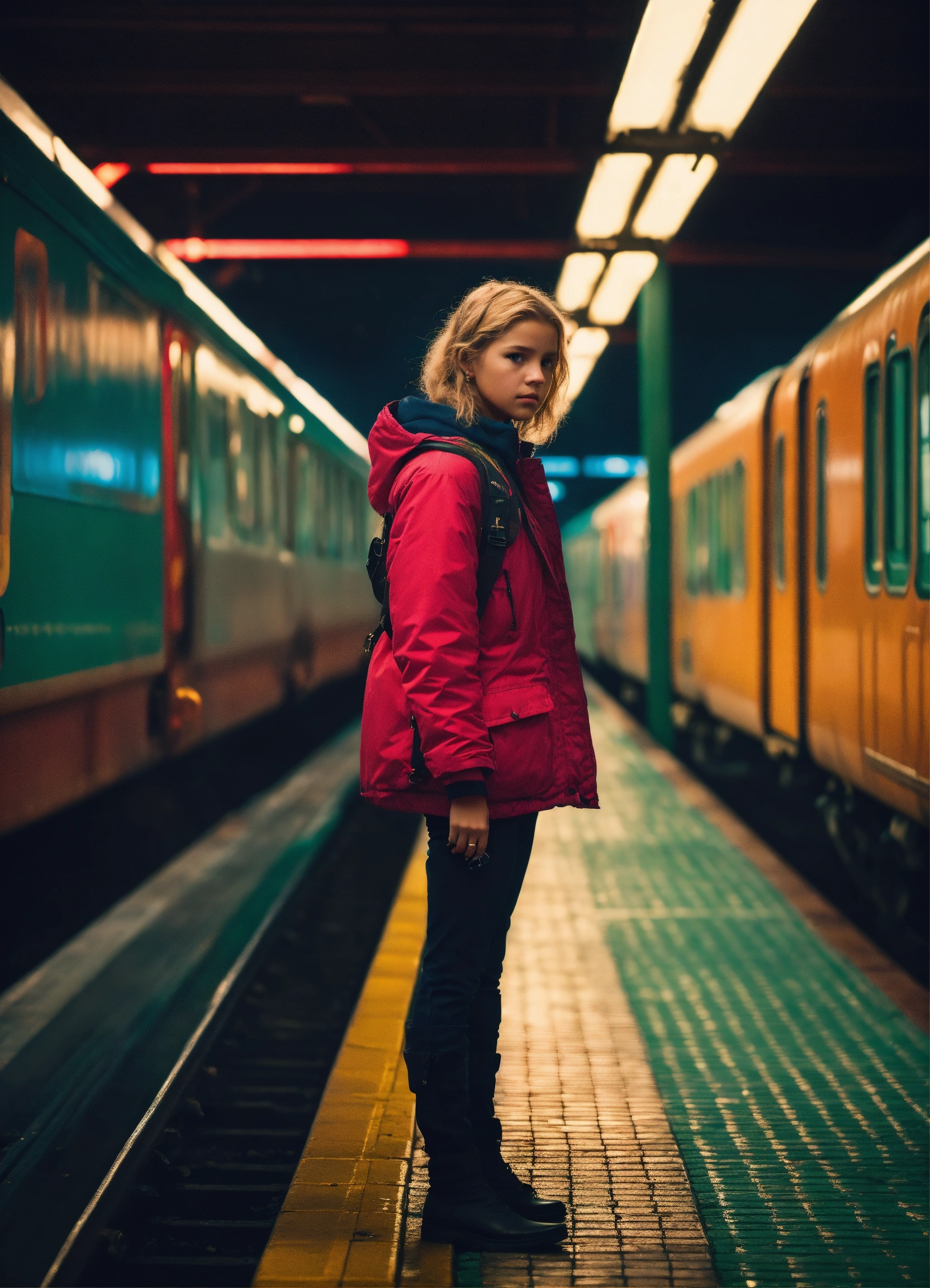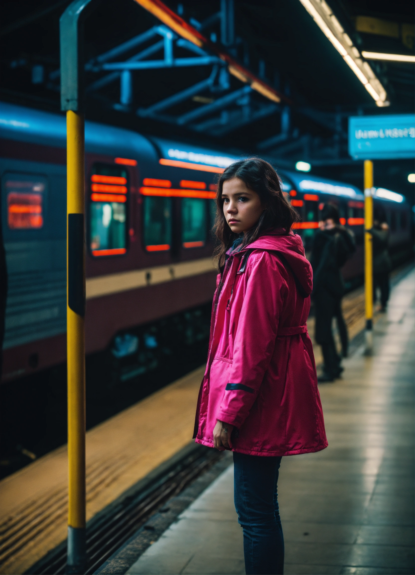 Cinematic photography, modern, female orphan at train station, proportionate, neon colors, realistic details, ultra 8k resolution