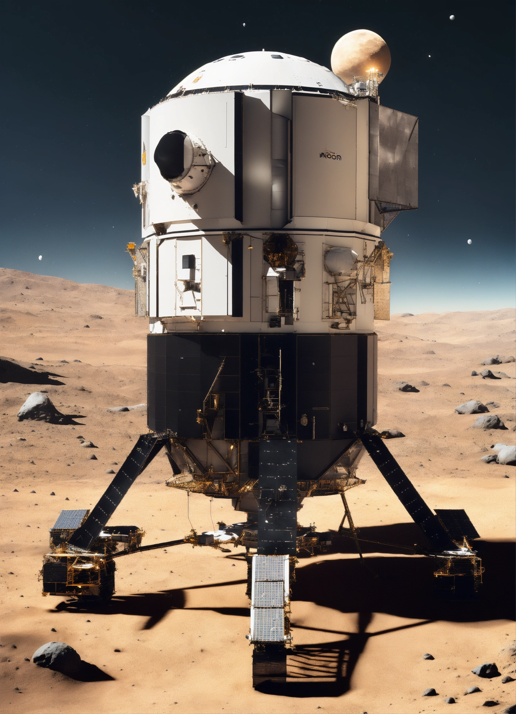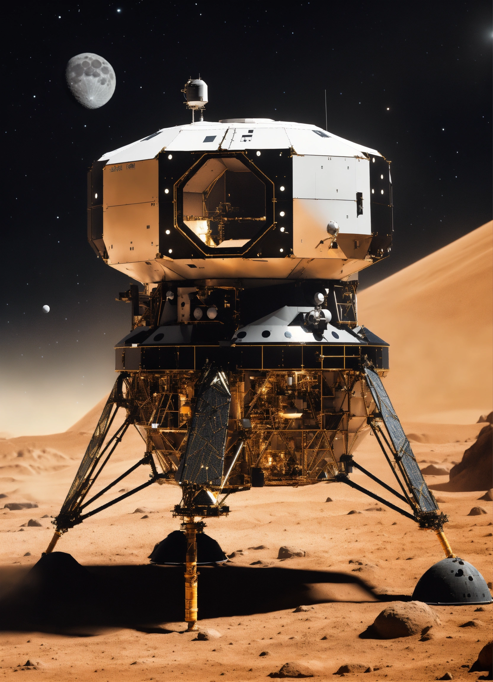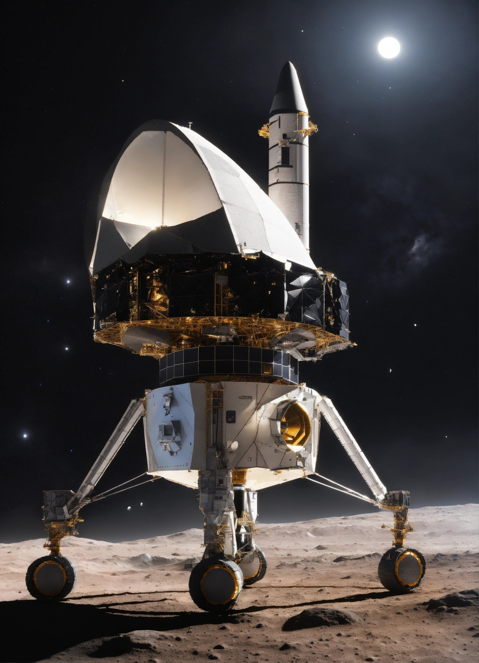 A small moon lander with similar aesthetics to the space shuttle, such as heat shielding and a black and white paint job