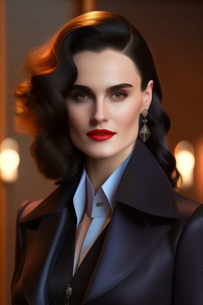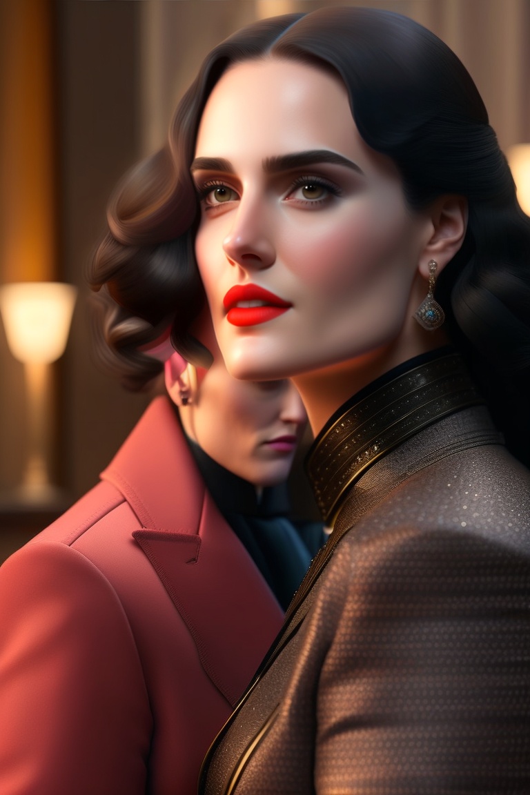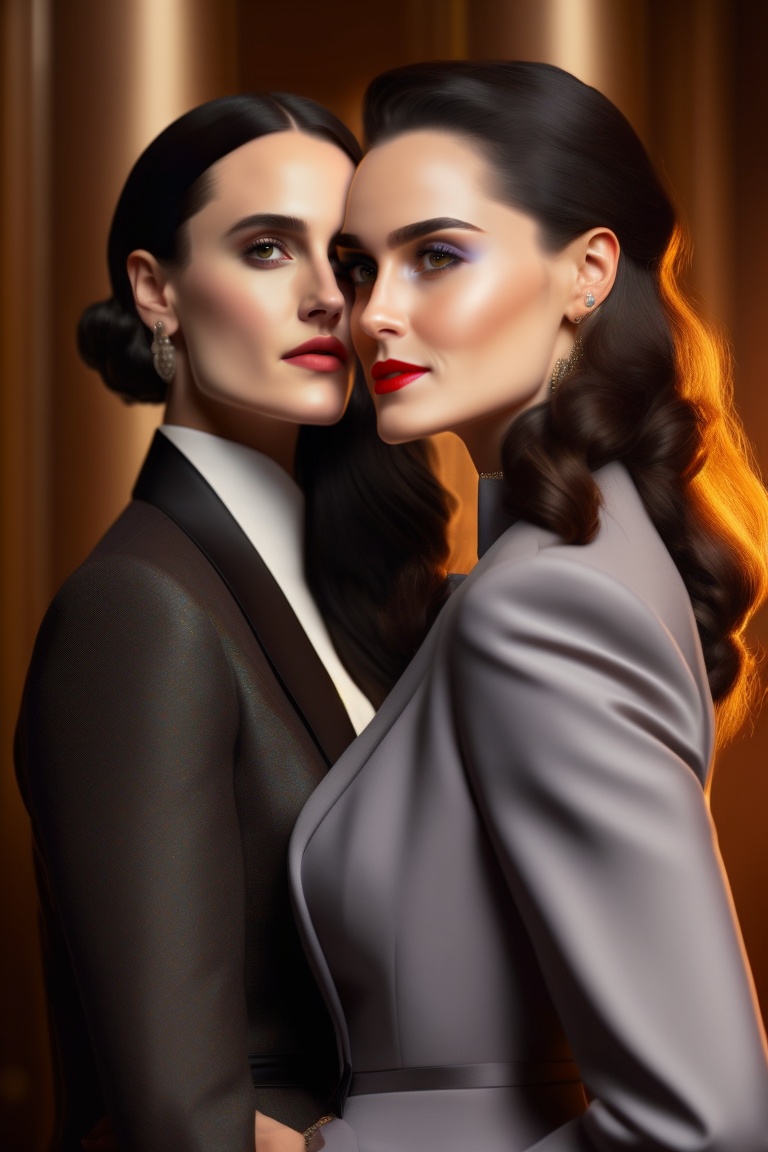 Lena luthor, katie mcgrath. katie is wearing a vest and suit, with long, straight, elegant black hair, fair skin, and a height of 1.70m. they share a romantic moment.
