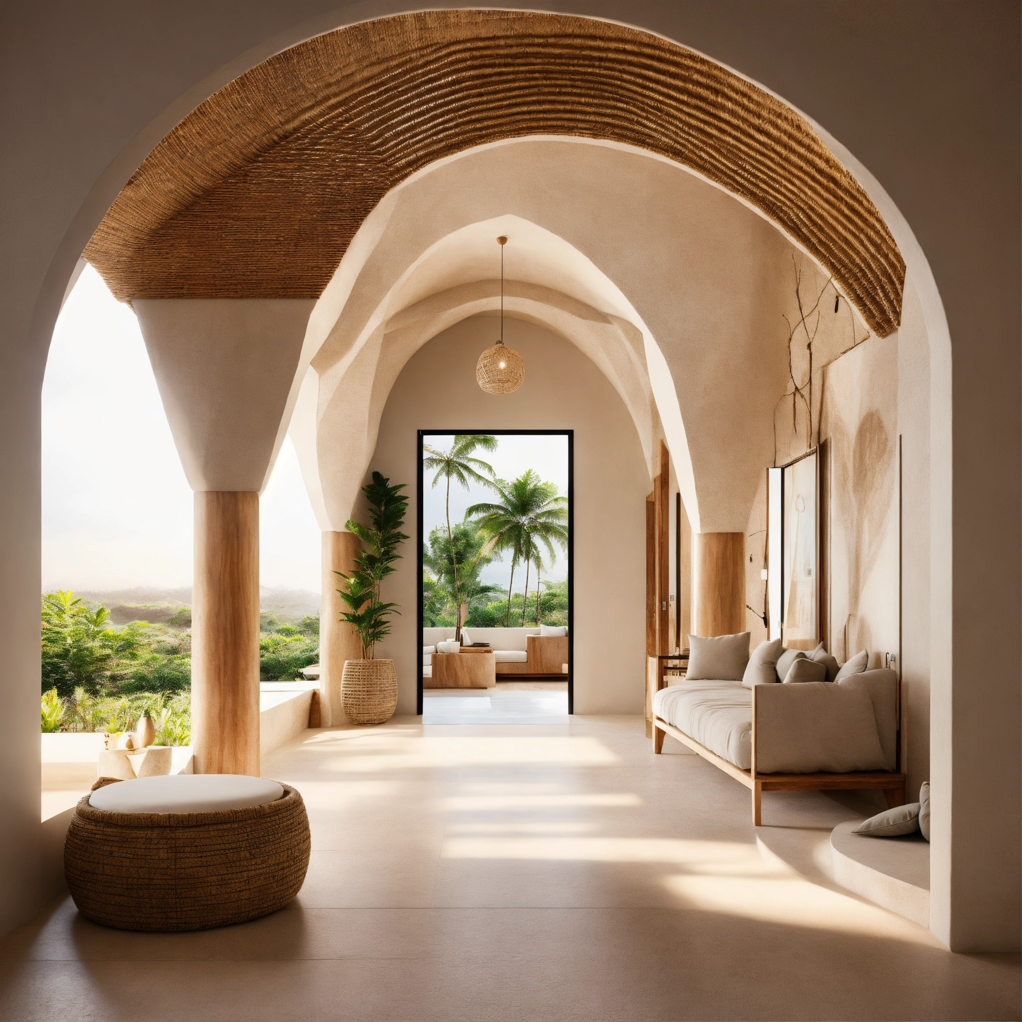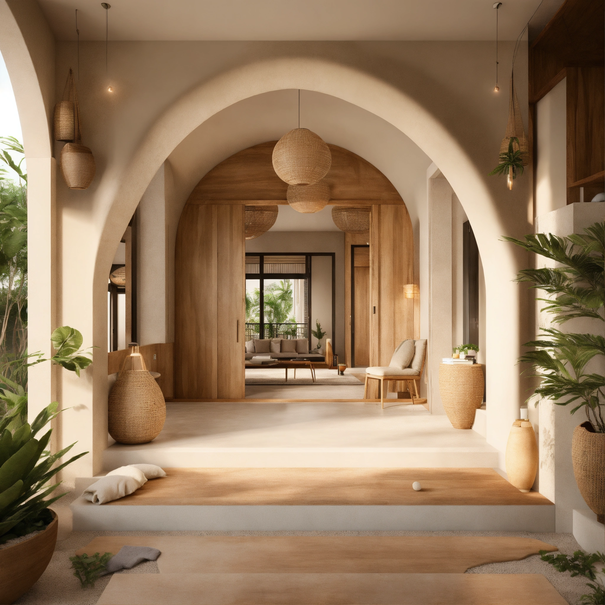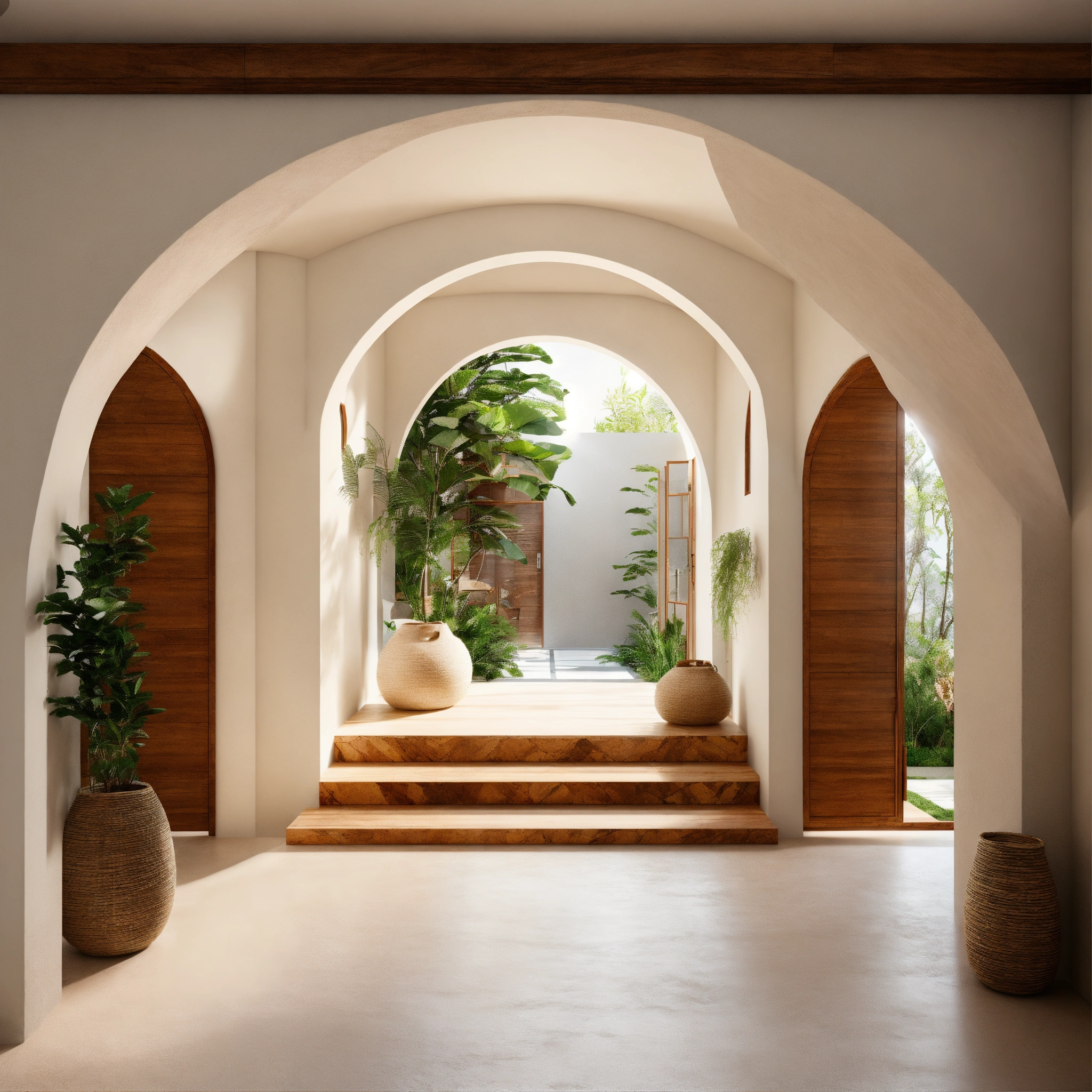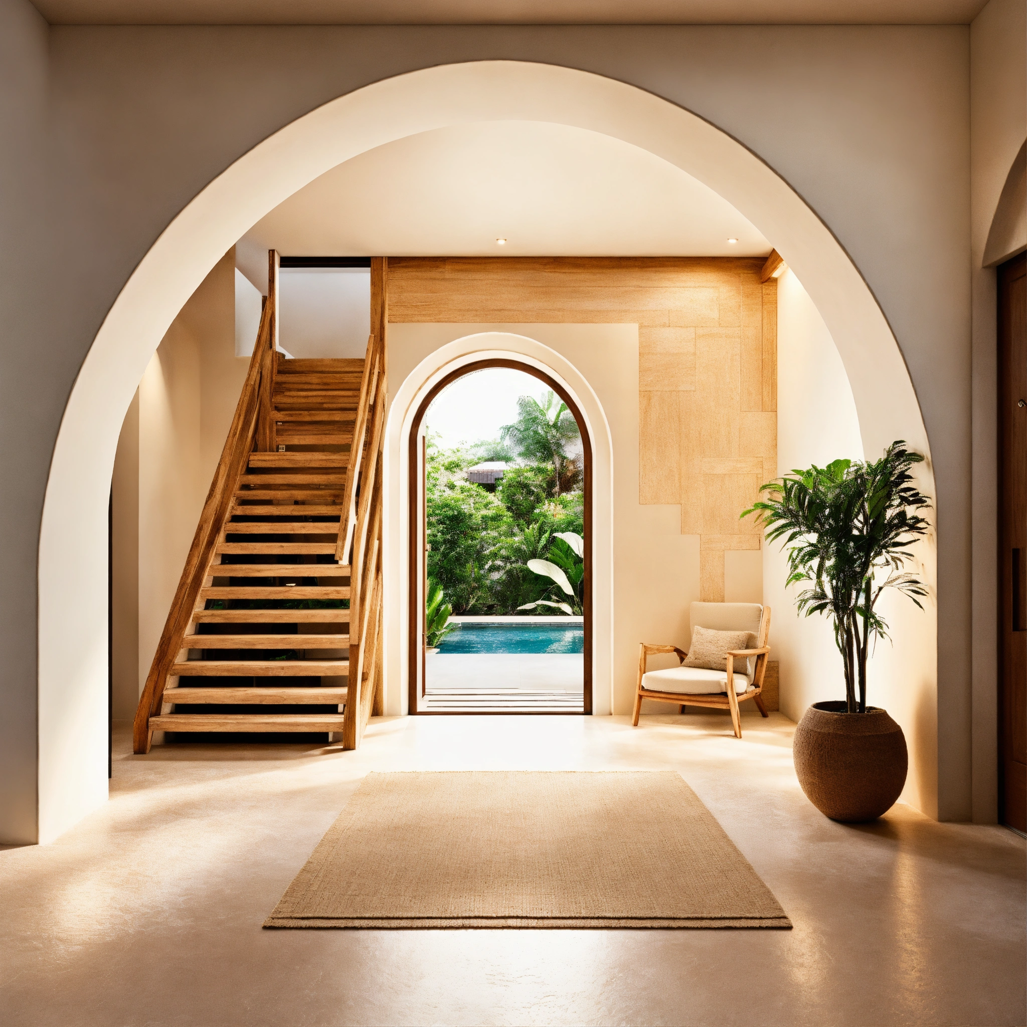 Ultra realistic photo of modern take on bali inspired low ceiling small apartment white cream stone, light wood round arches interor view of entry way