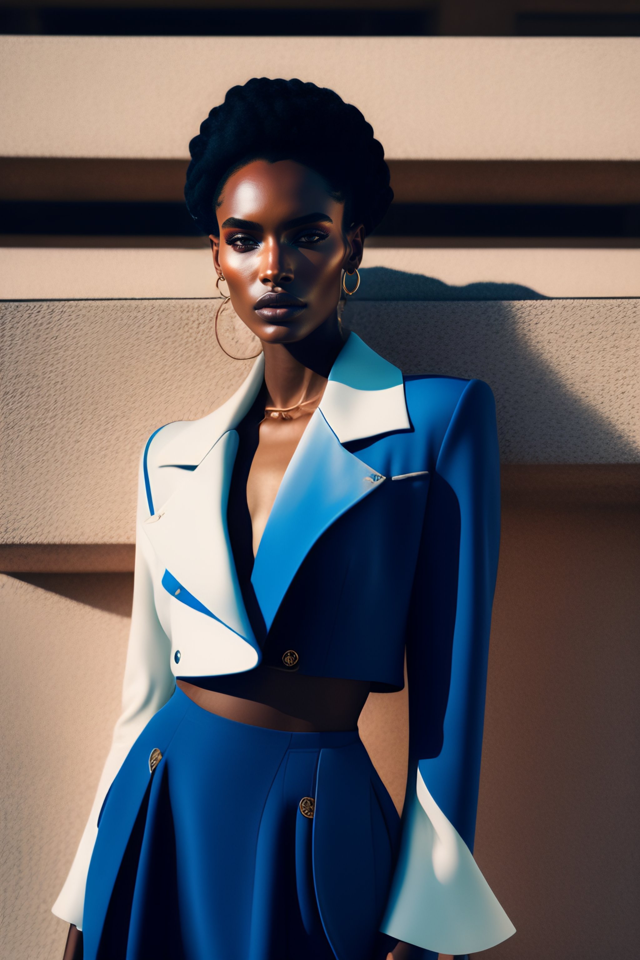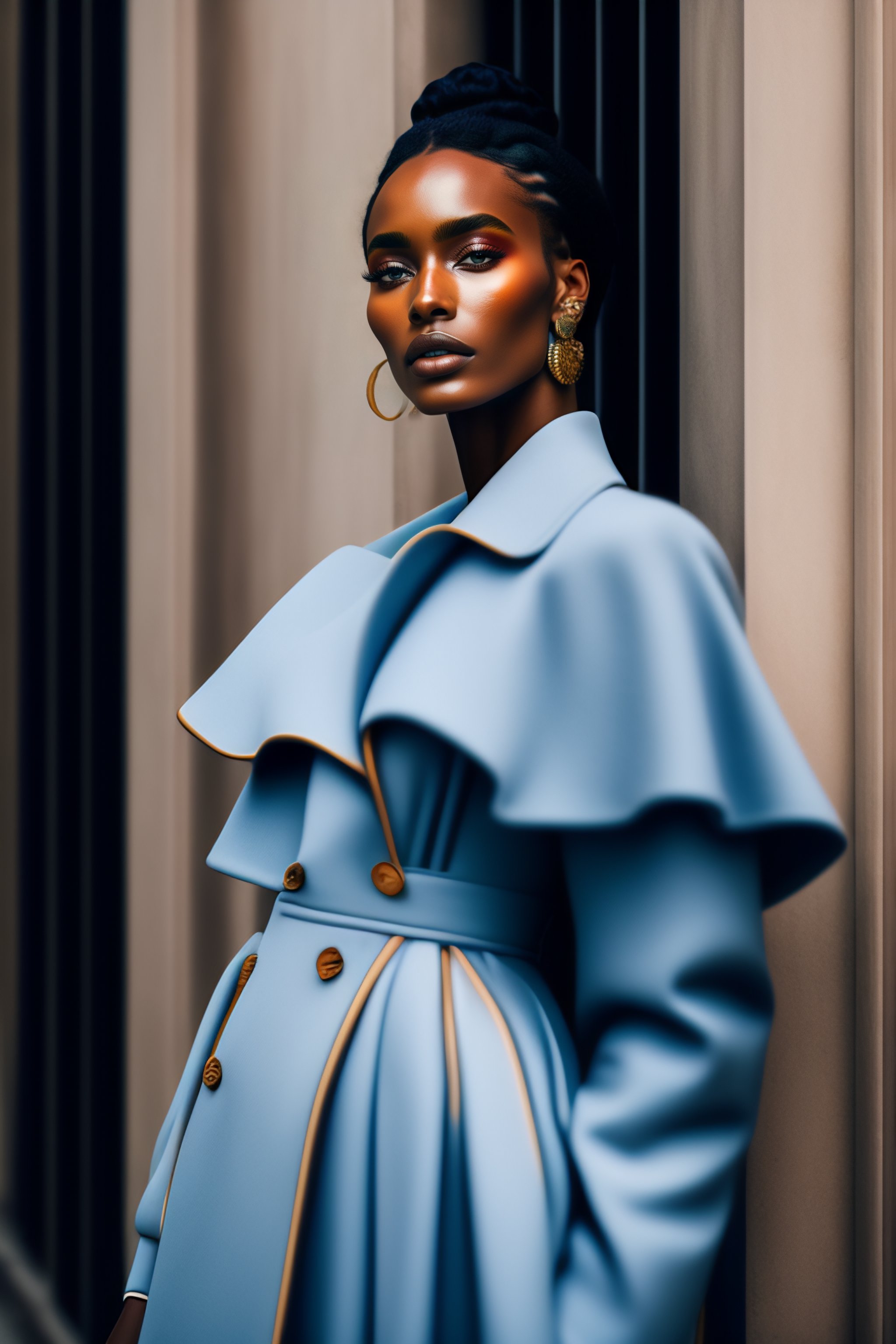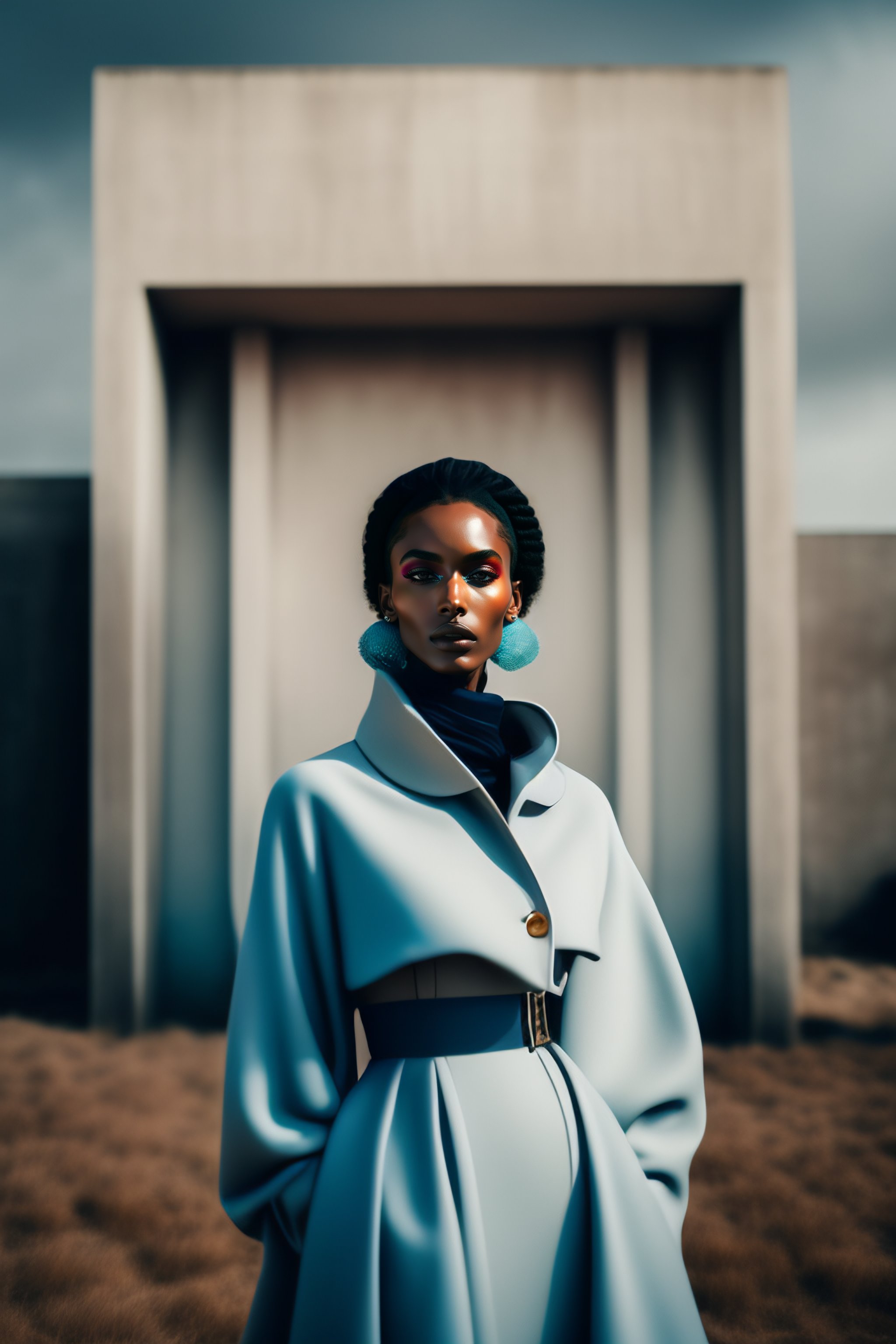 Portrait of haute couture beautiful ethiopian fashion model with blue eyes, ethereal dreamy foggy, photoshoot by alessio albi, editorial fashion magazine photoshoot, fashion poses, in front of brutalist building architecture. kinfolk magazine. film grain.