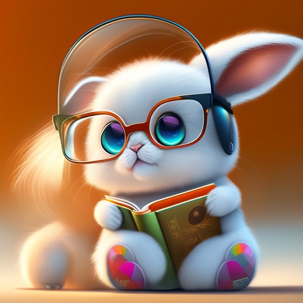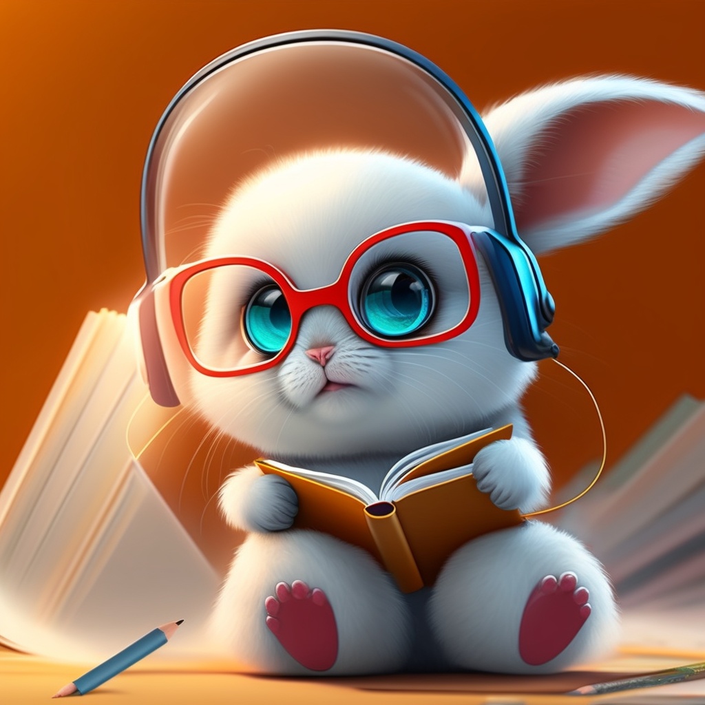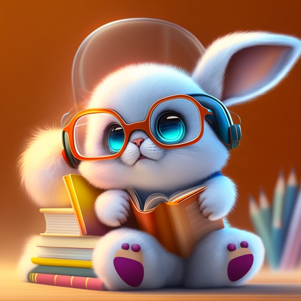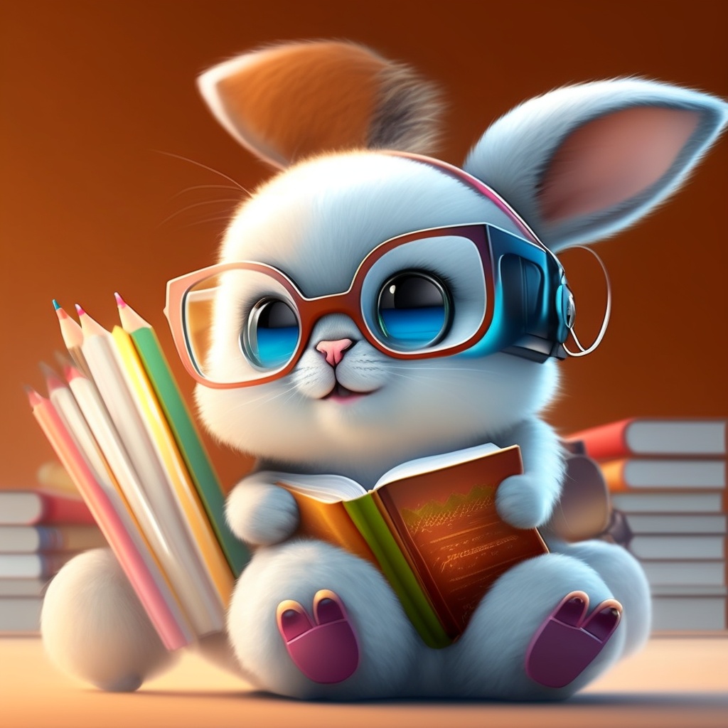 Cute bunny with big eyes and glasses, very happy, books around her and pencils. little hairy hands and feet