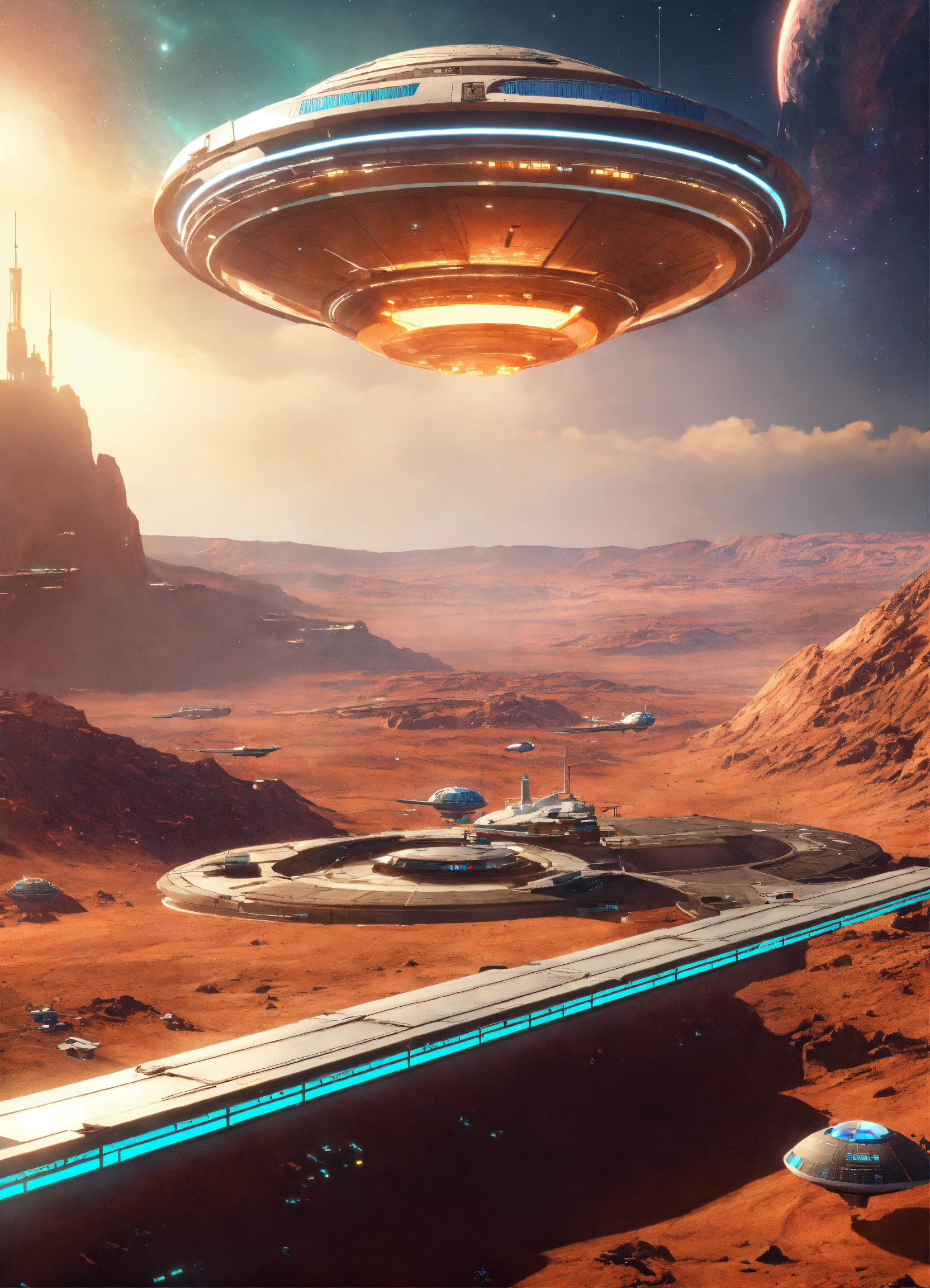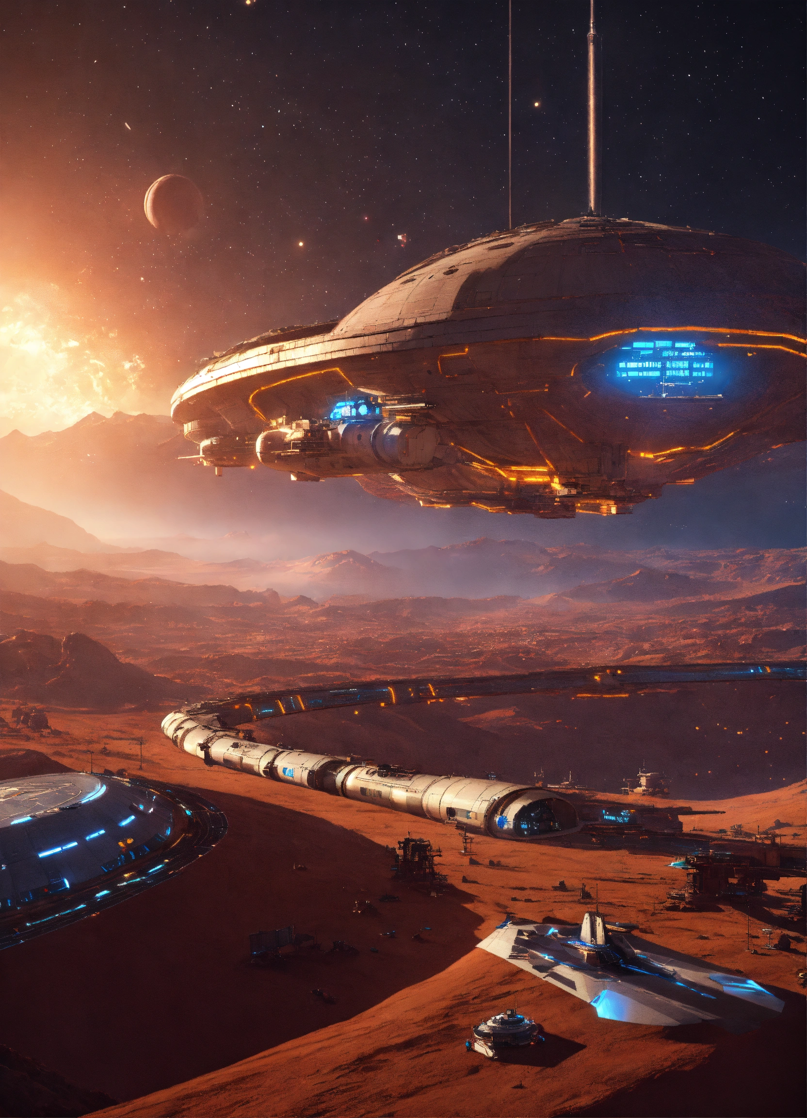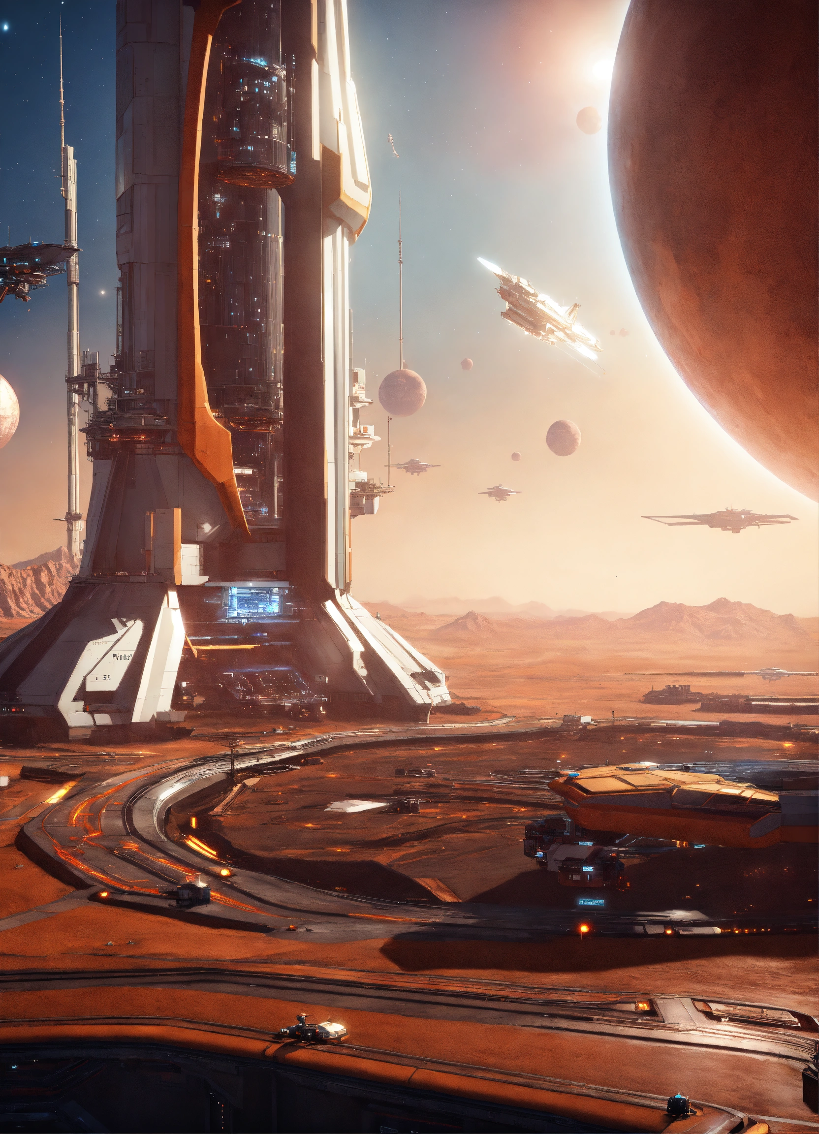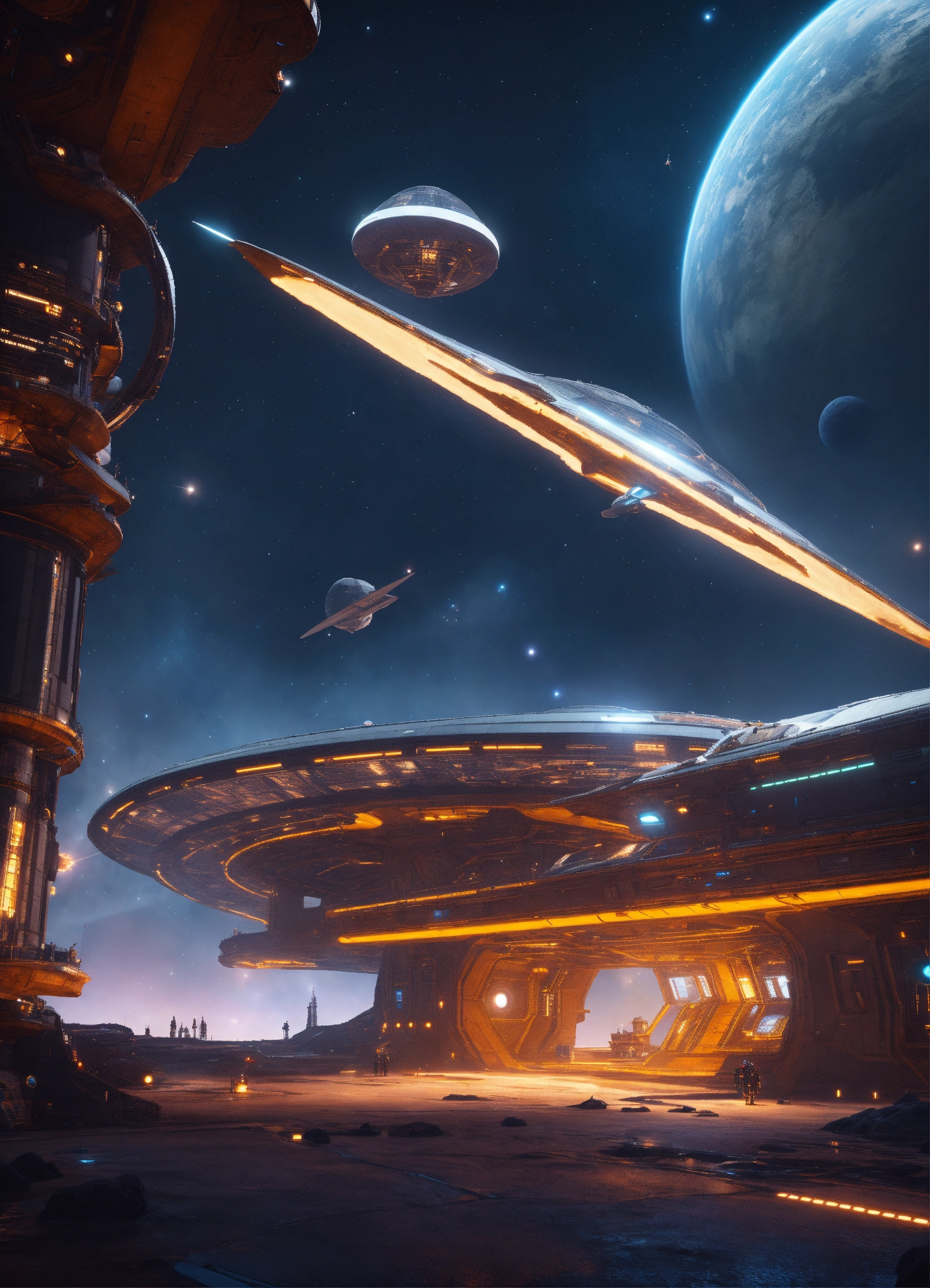 Beautiful spaceport flying in deep space, intergalactic pit stop, futuristic, sci-fi, 8k, unreal engine, pixar