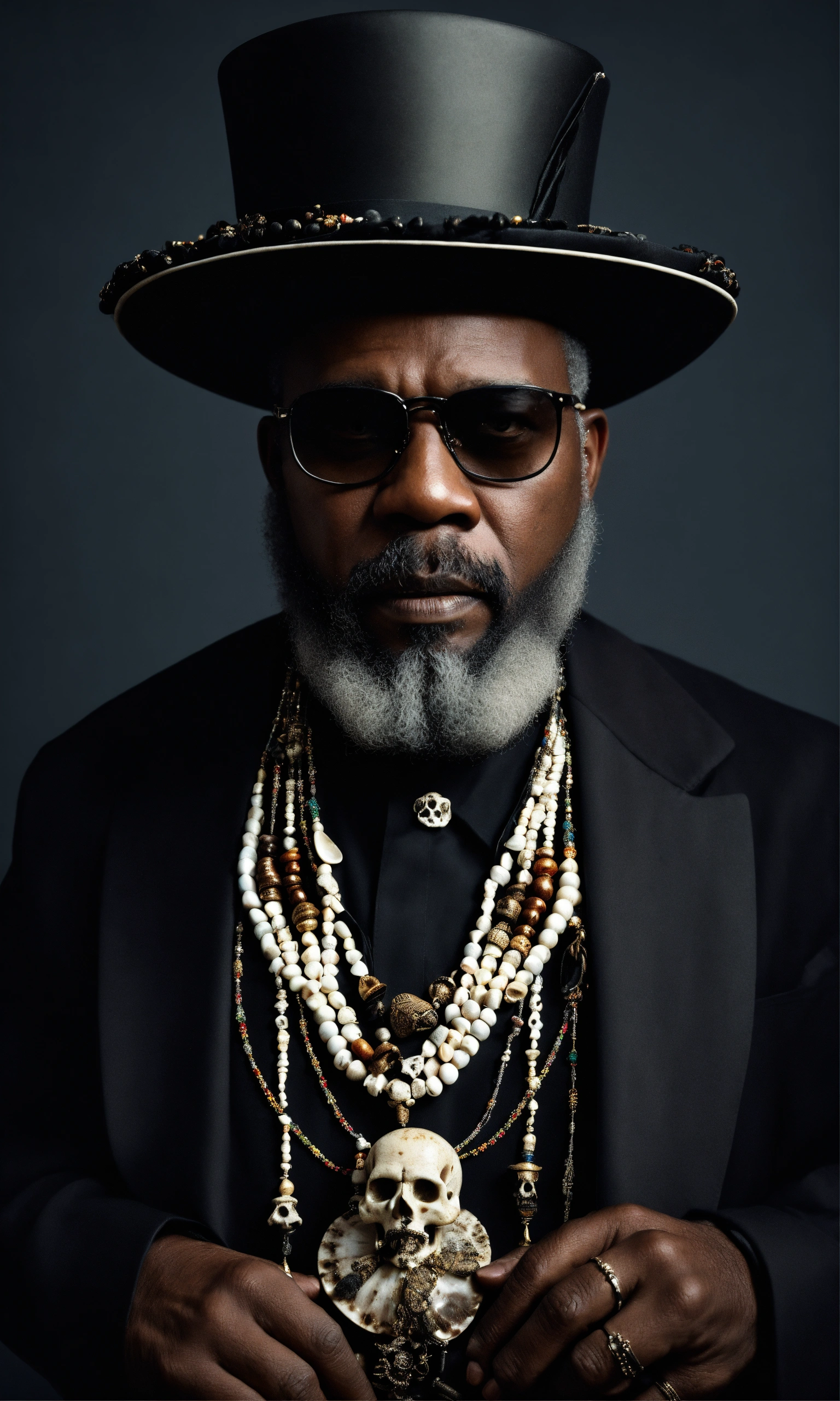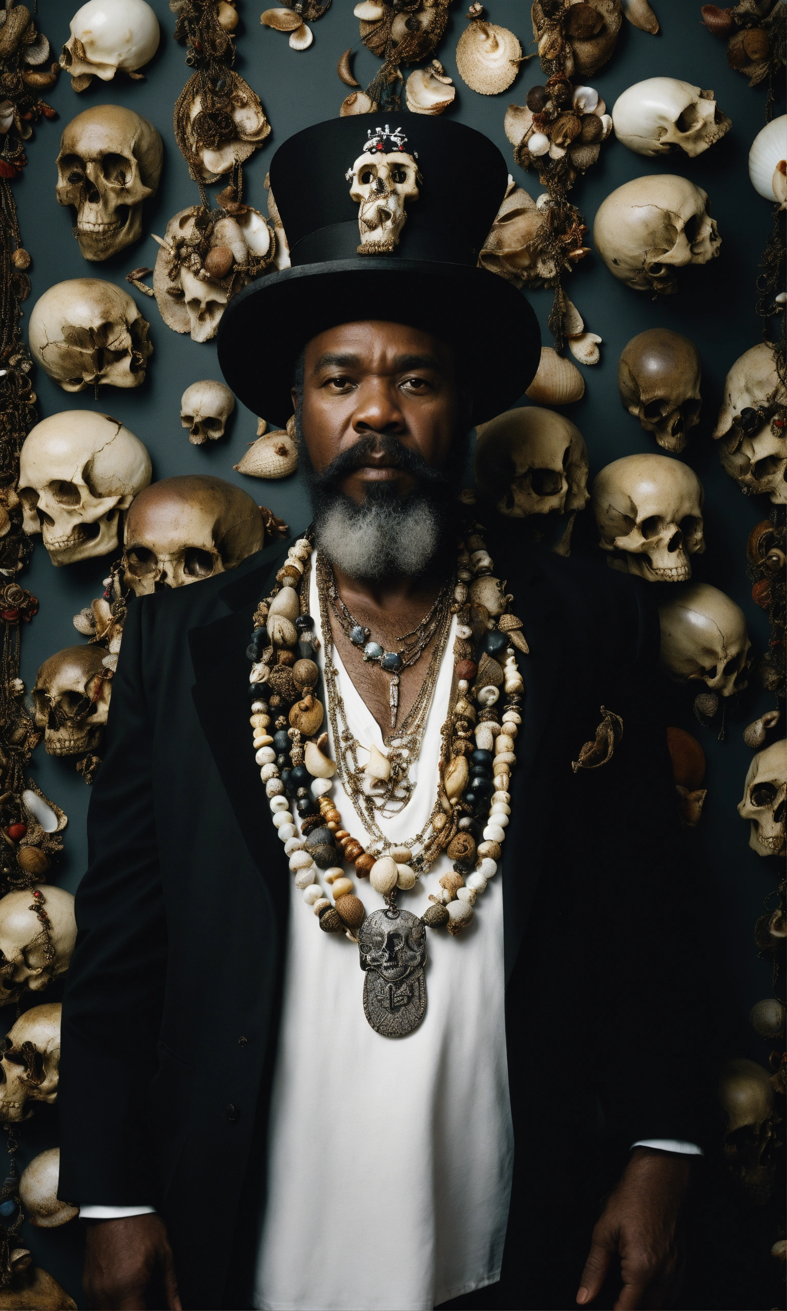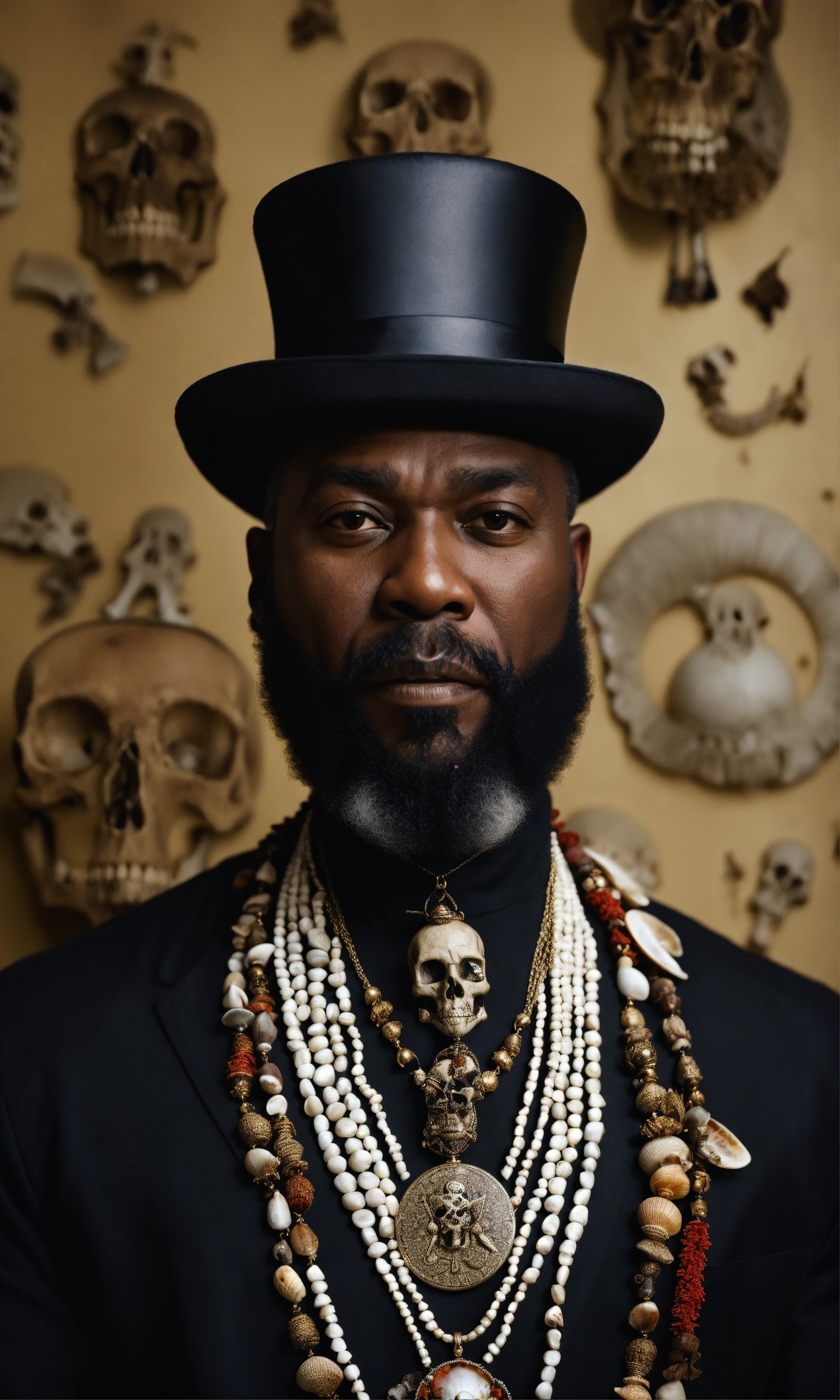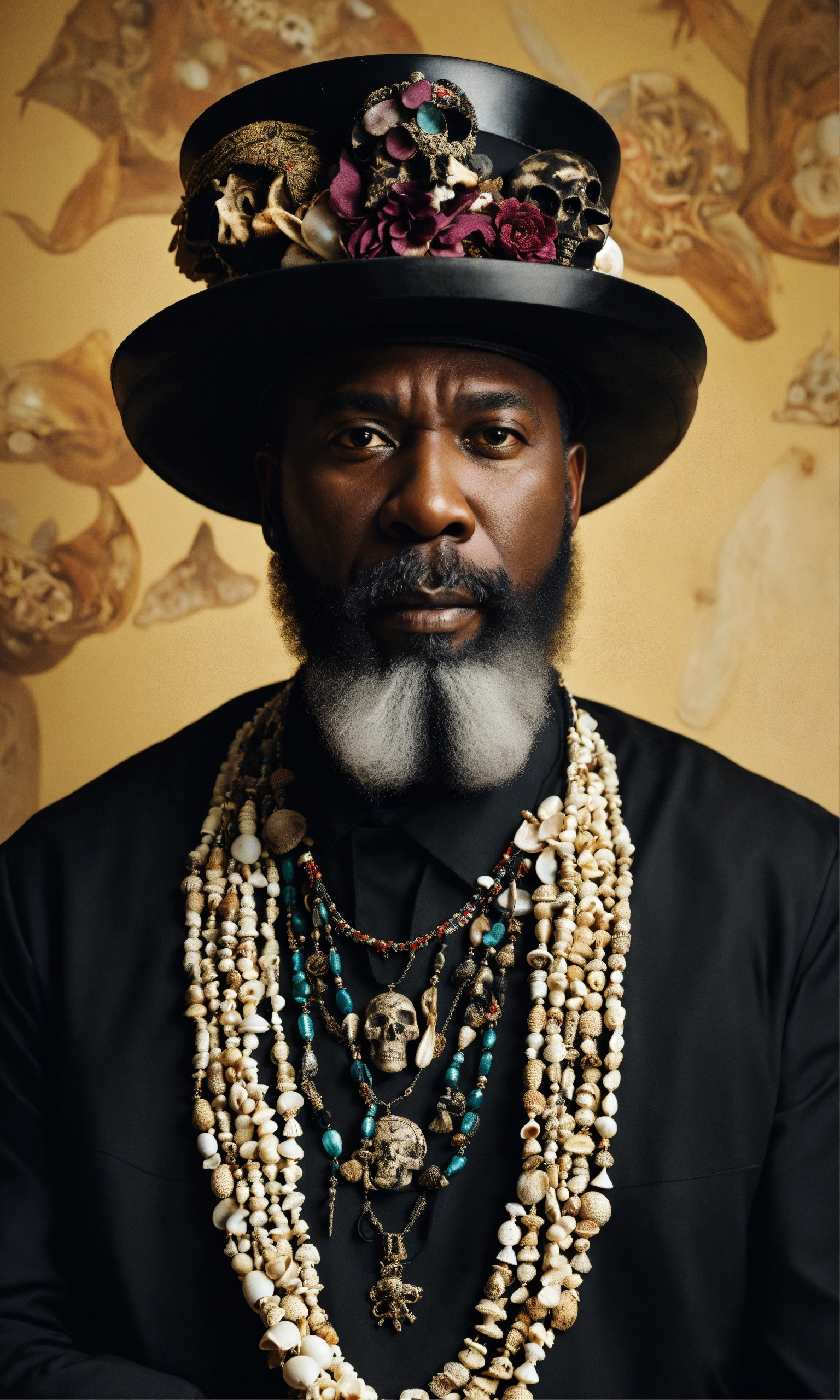 Portrait of middle-aged black man with a beard in full frame in white background. a voodoo priest, wearing a black top hat with decorative skulls on it, a necklace made of shells and bones around his neck, hyper-realistic, full frame. shot by annie leibowitz.