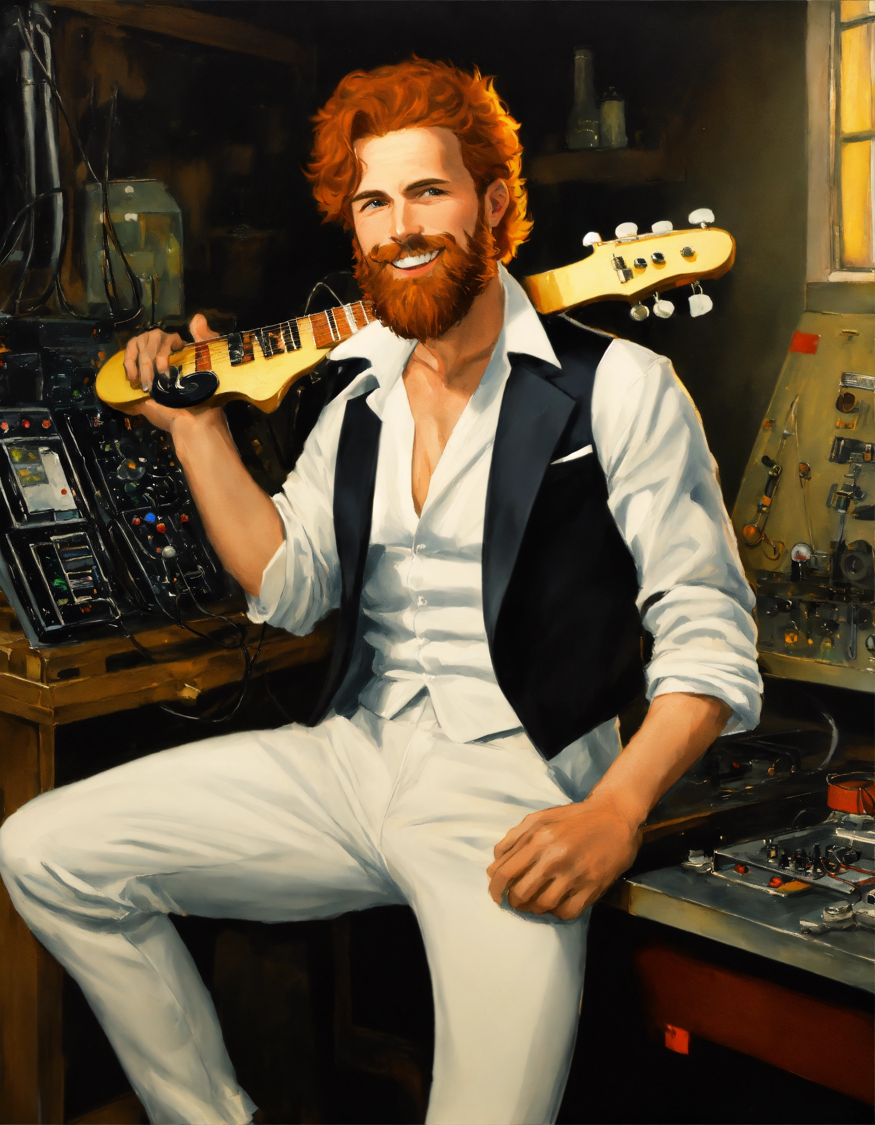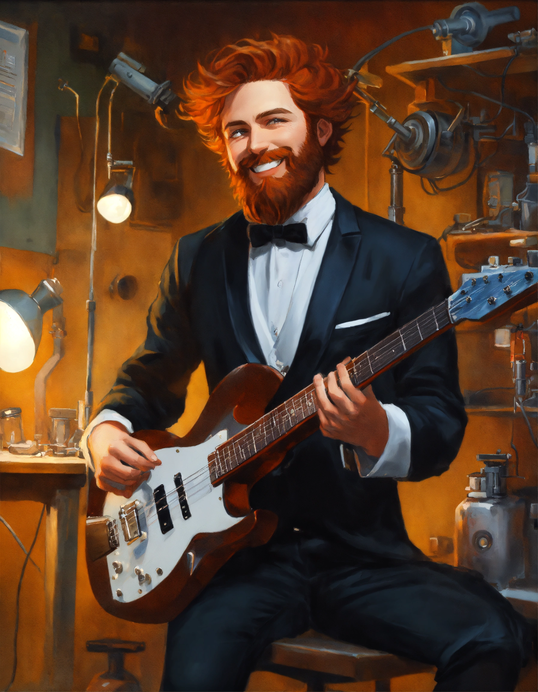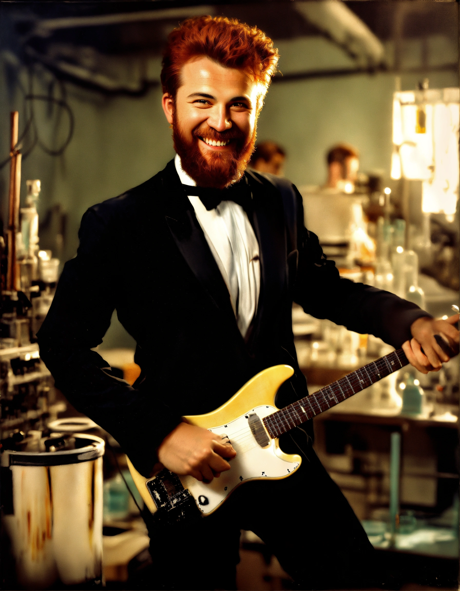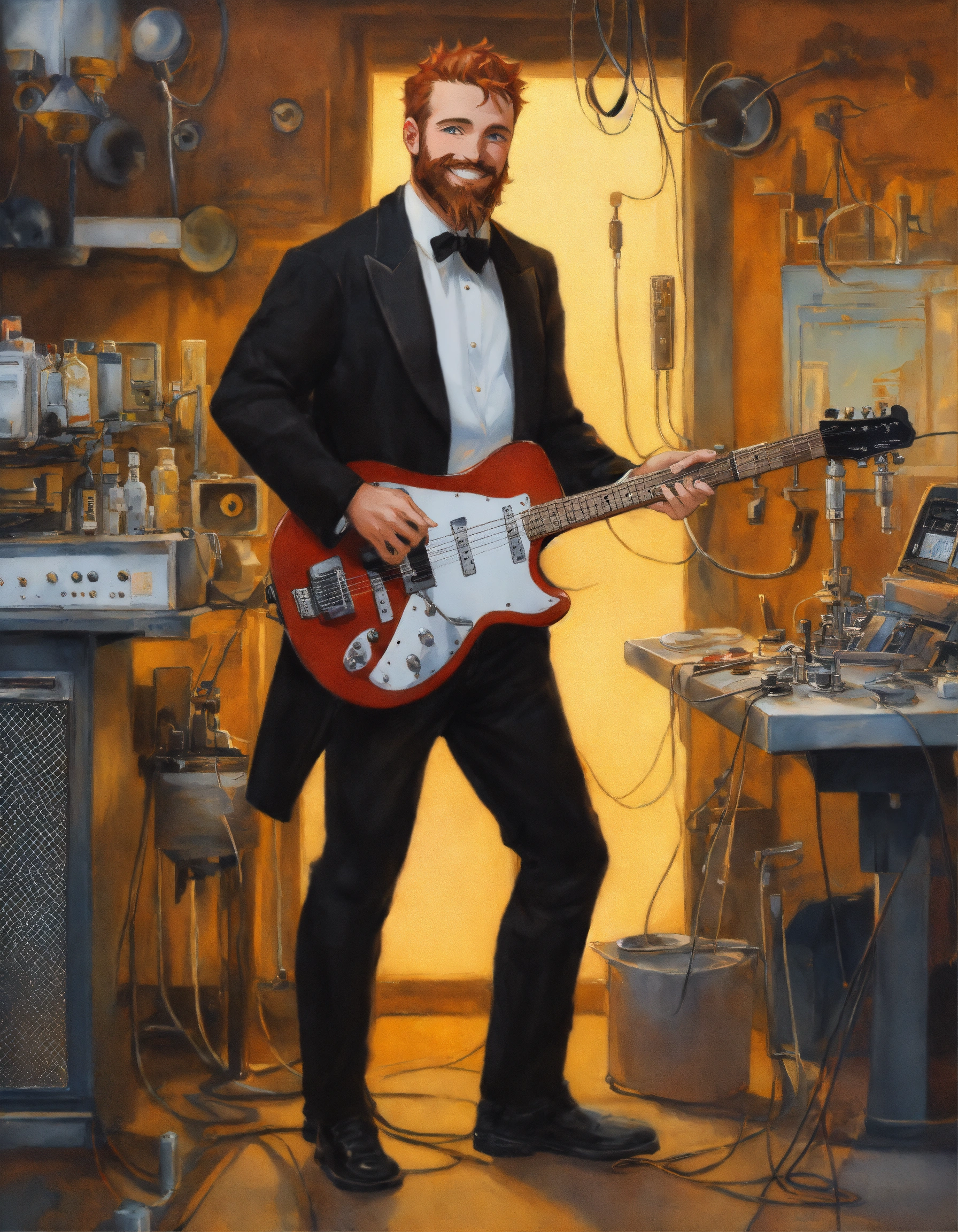 Caucasian mad scientist with gray high and tight short reddish hair and beard, smiling like crazy. he is wearing a ((black t-shirt featuring a little white tuxedo printed on front 3.0)). he is also wearing ((shorts)) denim pants. he is ((not)) wearing a tuxedo. he is holding an electric guitar, in an old laboratory with music equipment, oil painting