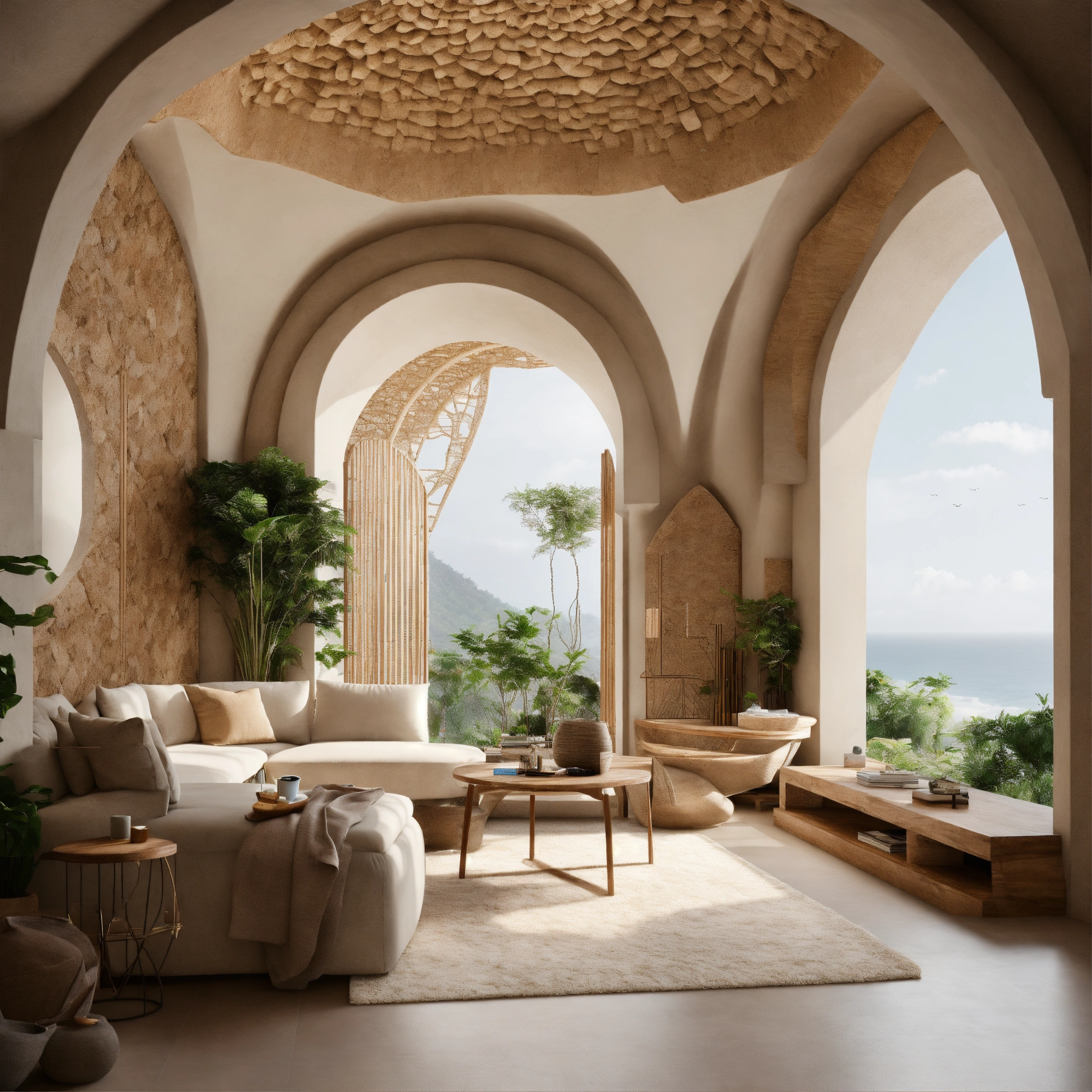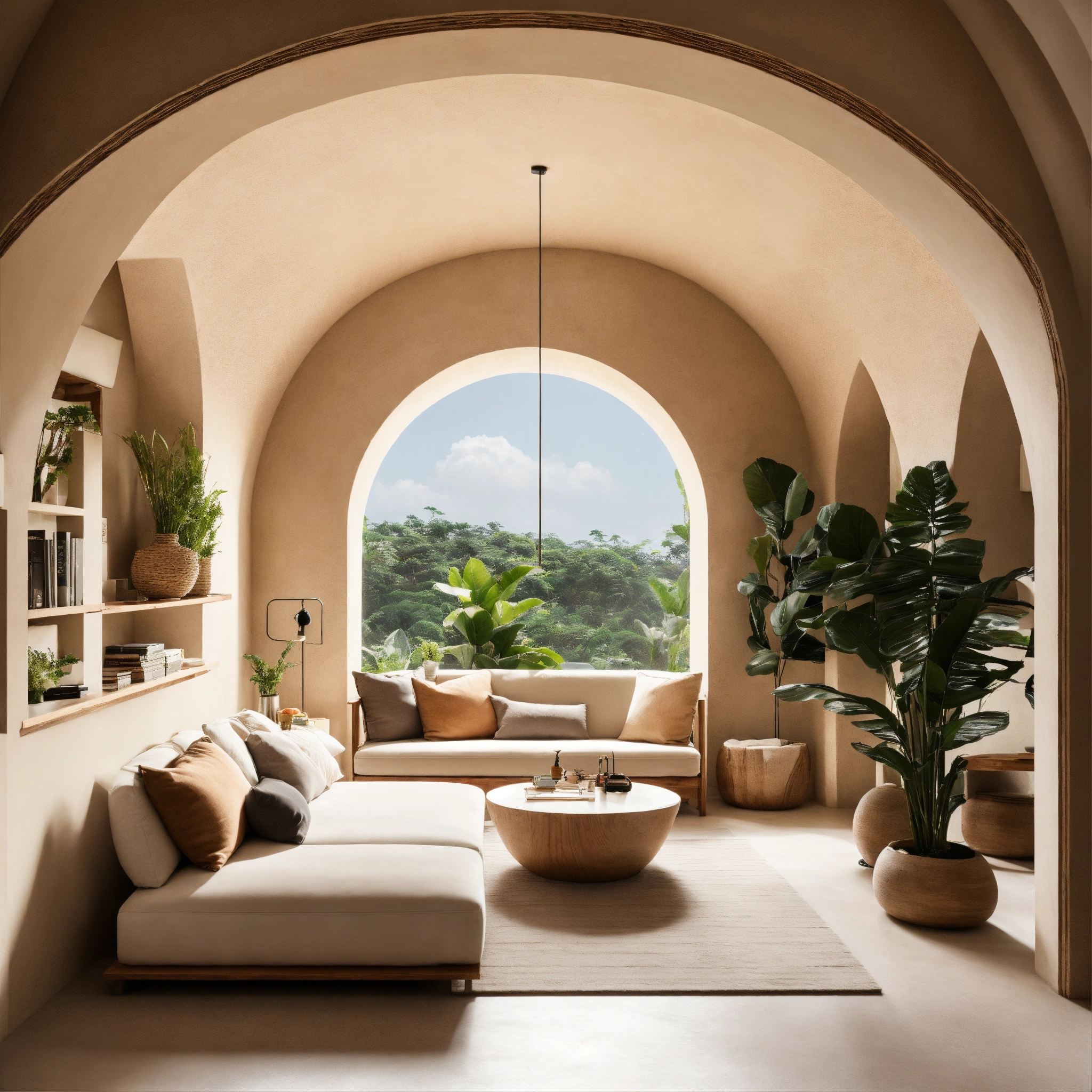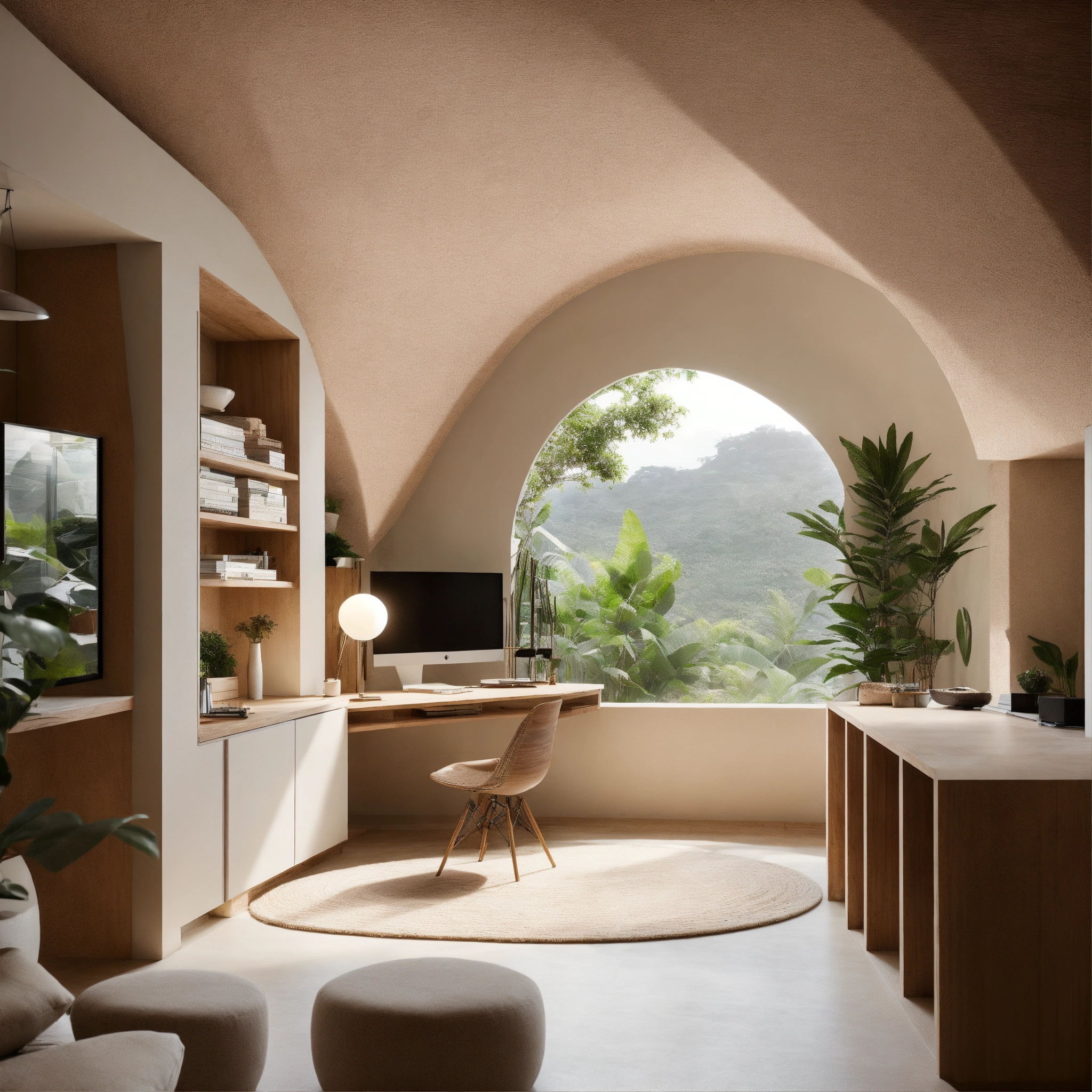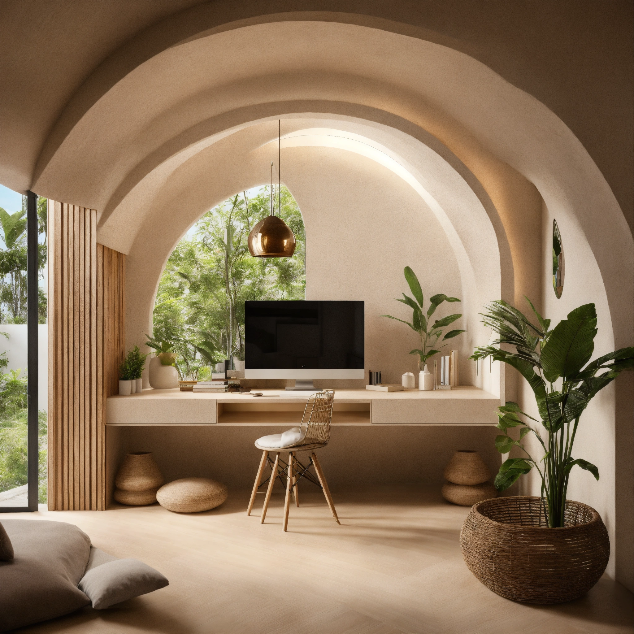 Ultra realistic photo of modern take on bali inspired low ceiling small apartment white cream stone, light wood round arches interor view of office.