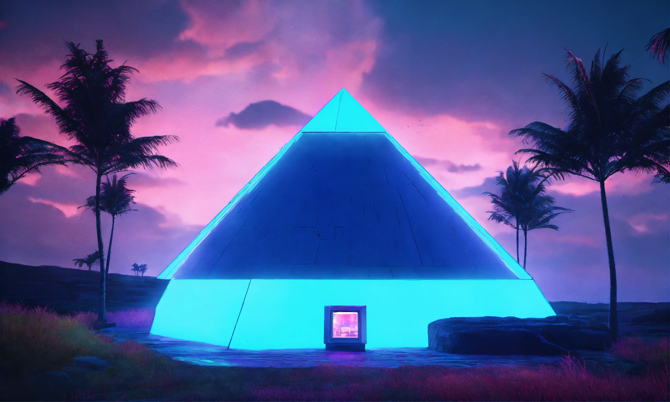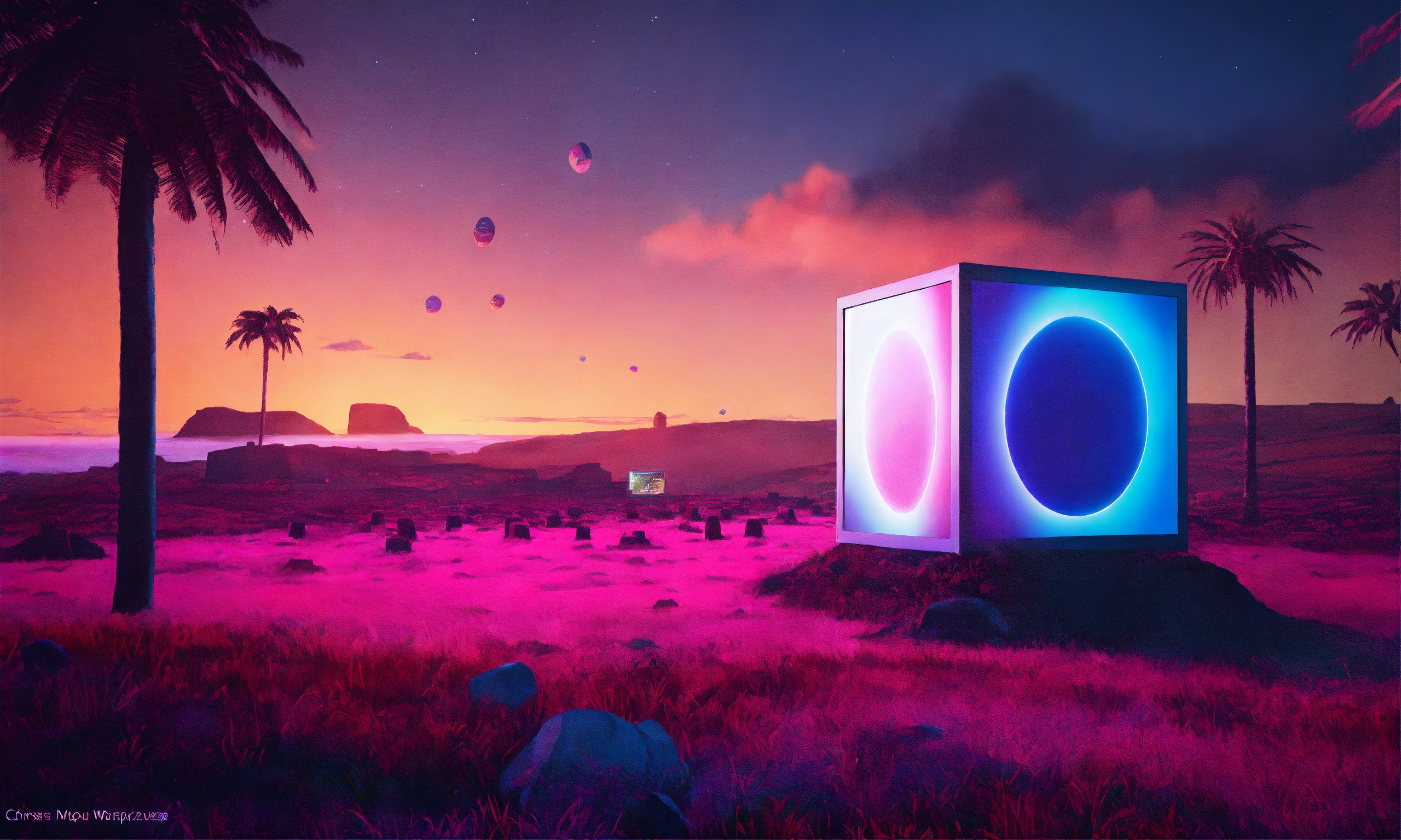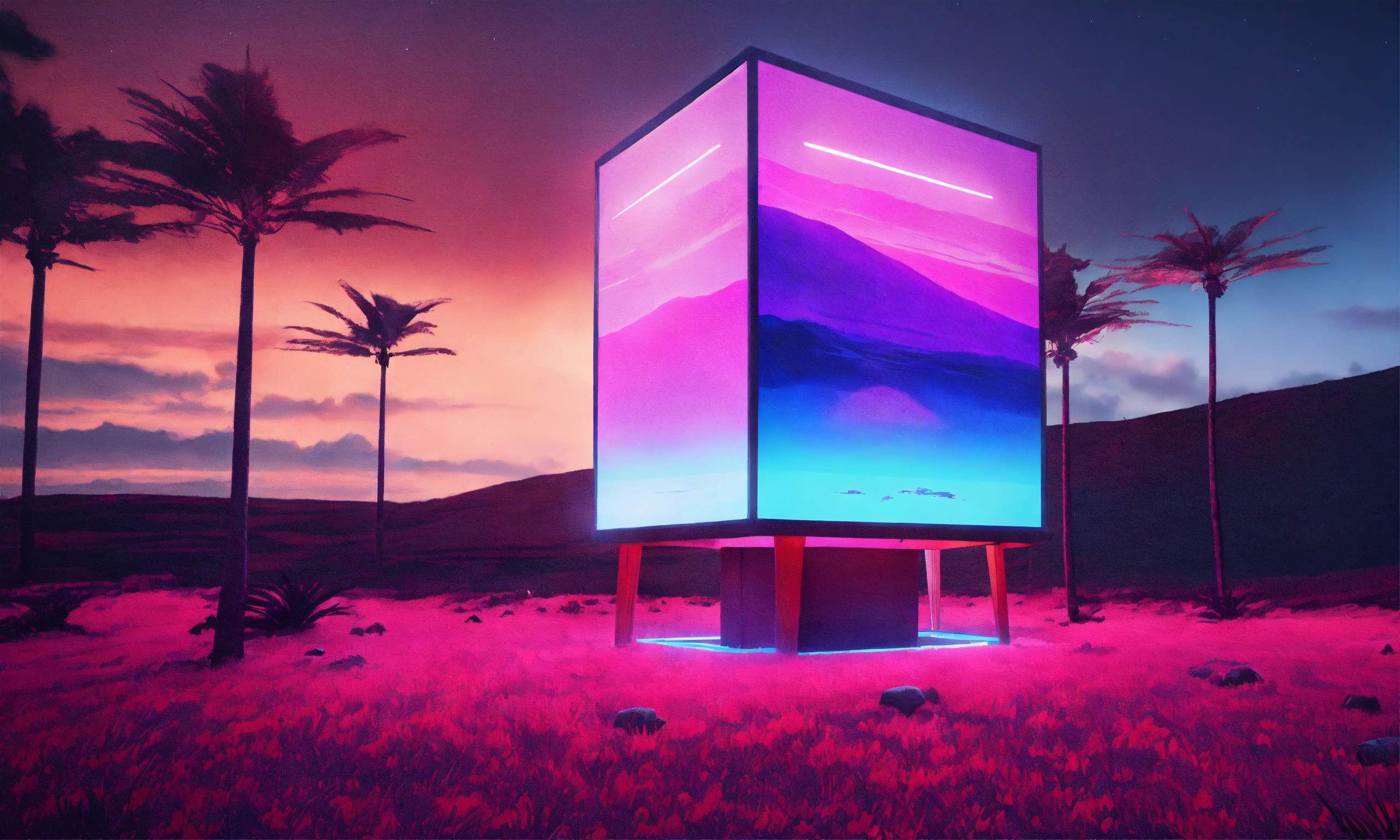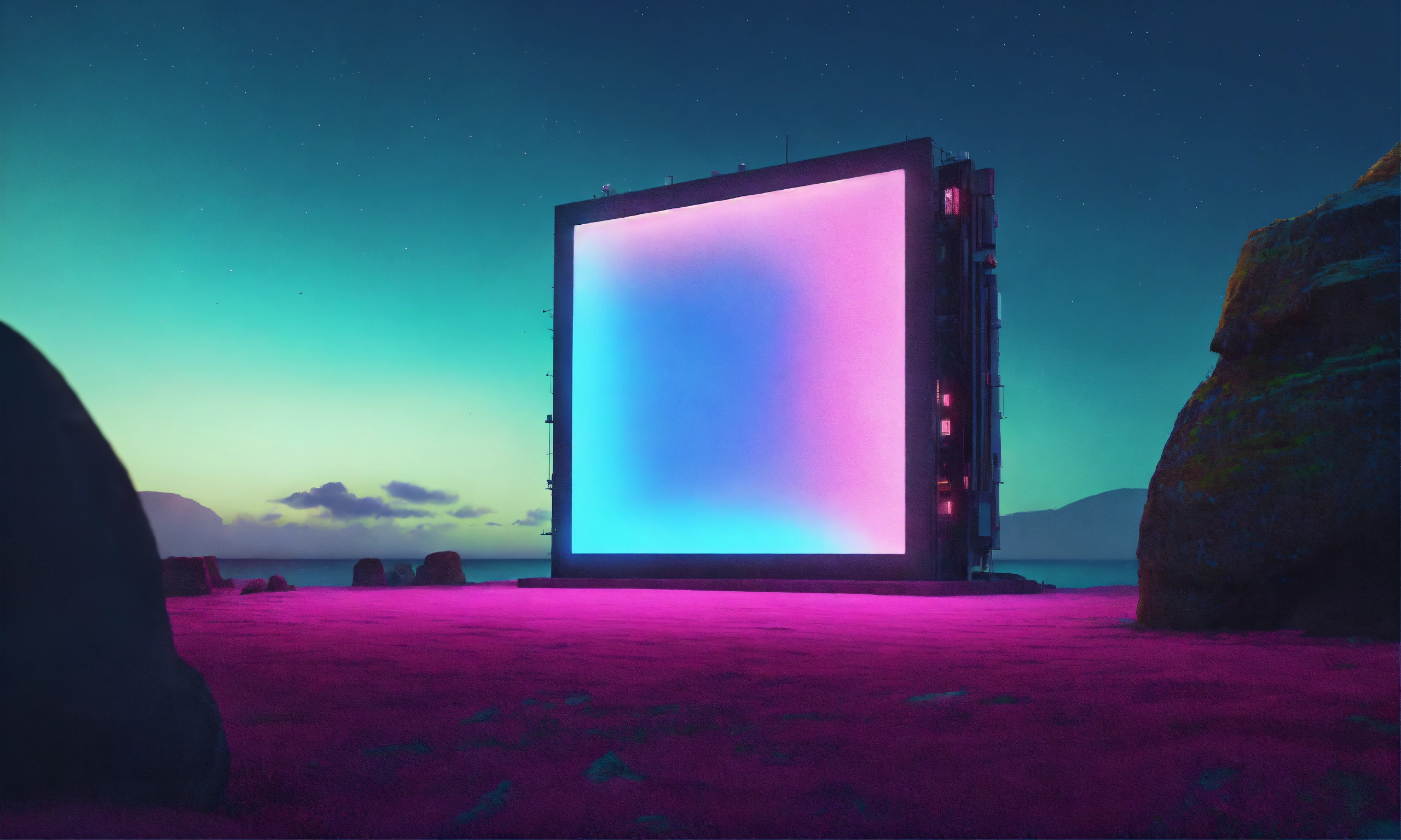 A beautiful, sharp focus, massive square electric advertising board. in the middle of easter island. it is night time and dark. wide angle. vaporwave ombre rendering. by chris moore. beeple colors. ambient occlusion. lower resolution background. digital painting.