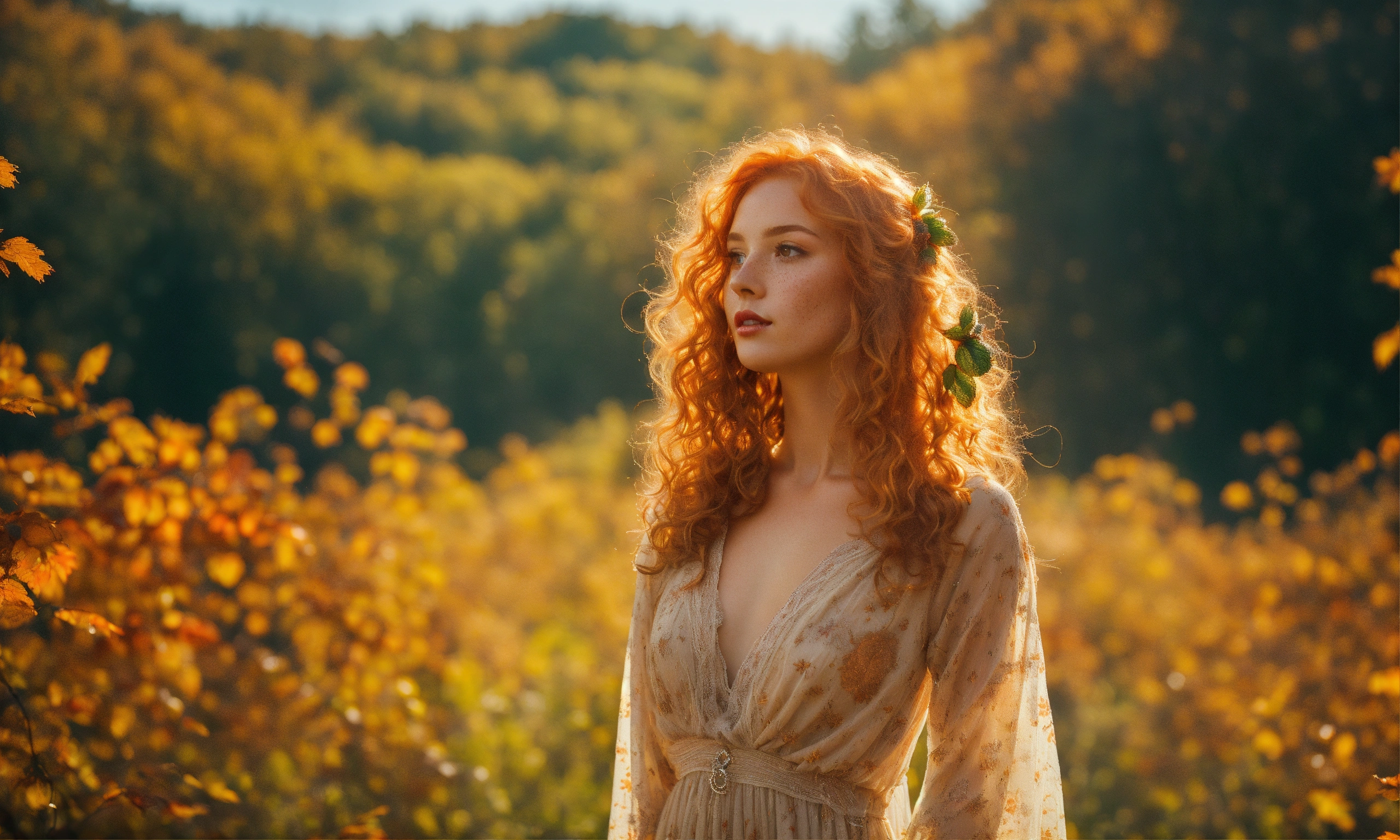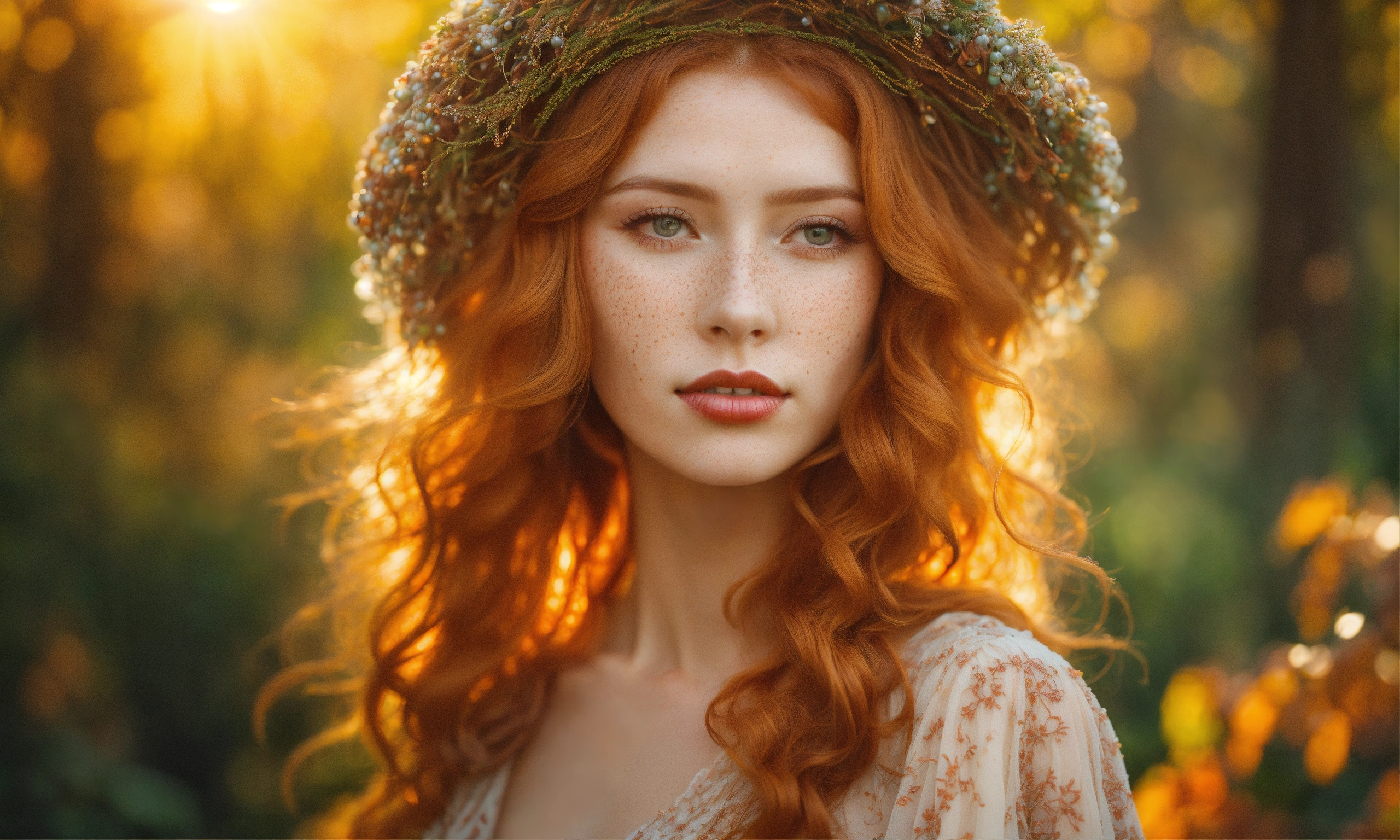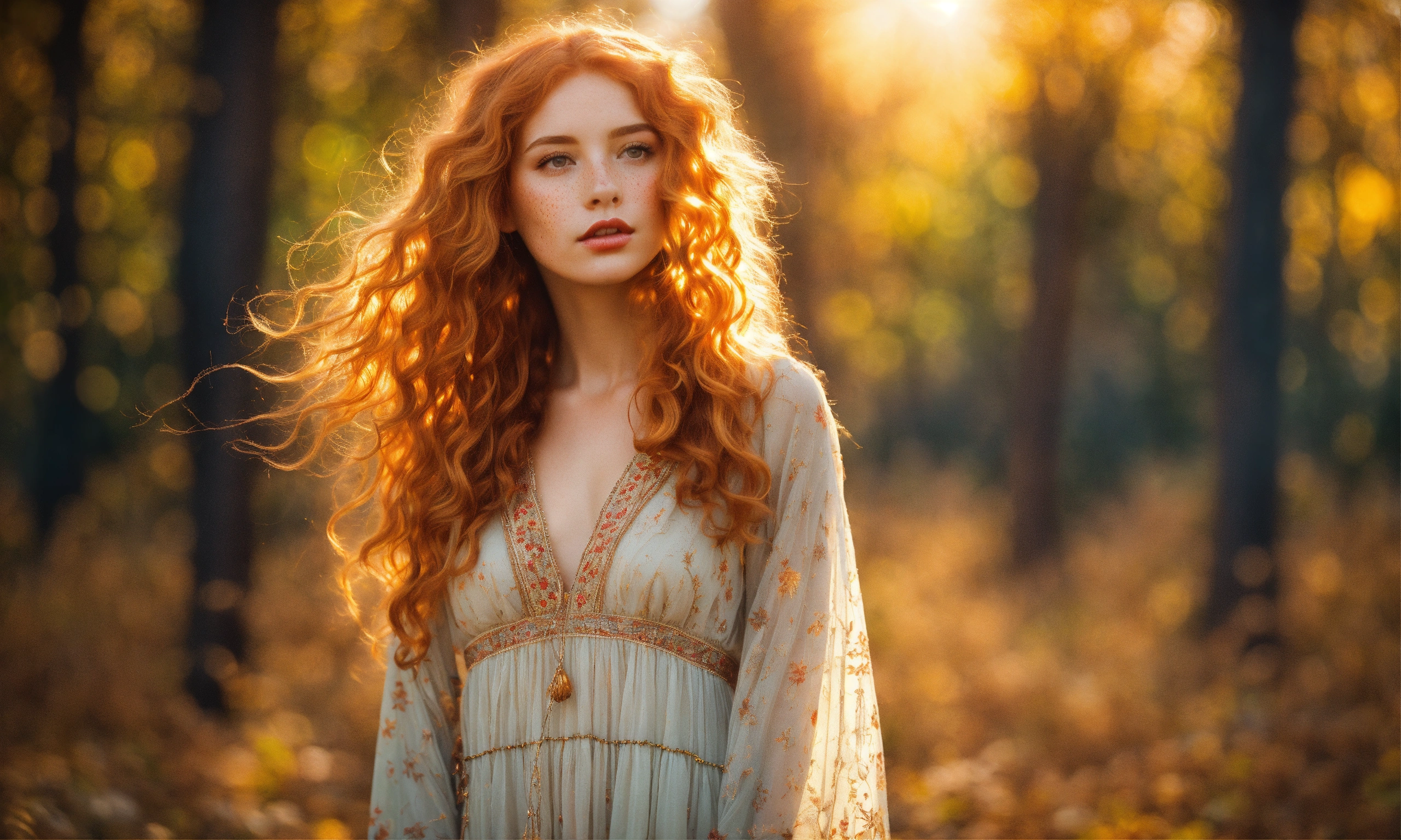 Bright, strawberry blonde-haired, with freckles. 30 year old 38 inch bustline, full luscious lips wearing amber strands and beads the sun, the autumn forest, fantastic beauty. curls. wearing a boho summer dress ultra-detailed dreamlike, photography 8k resolution image, translucent and ethereal.