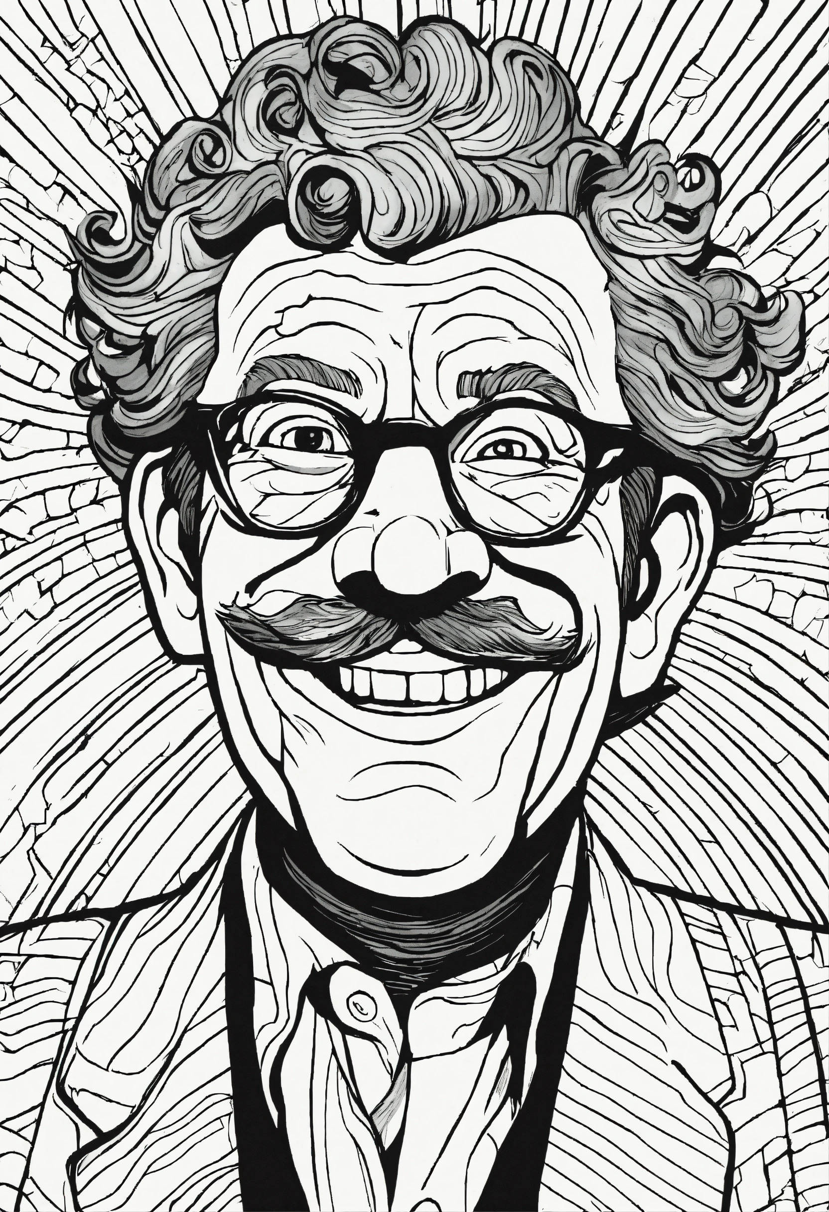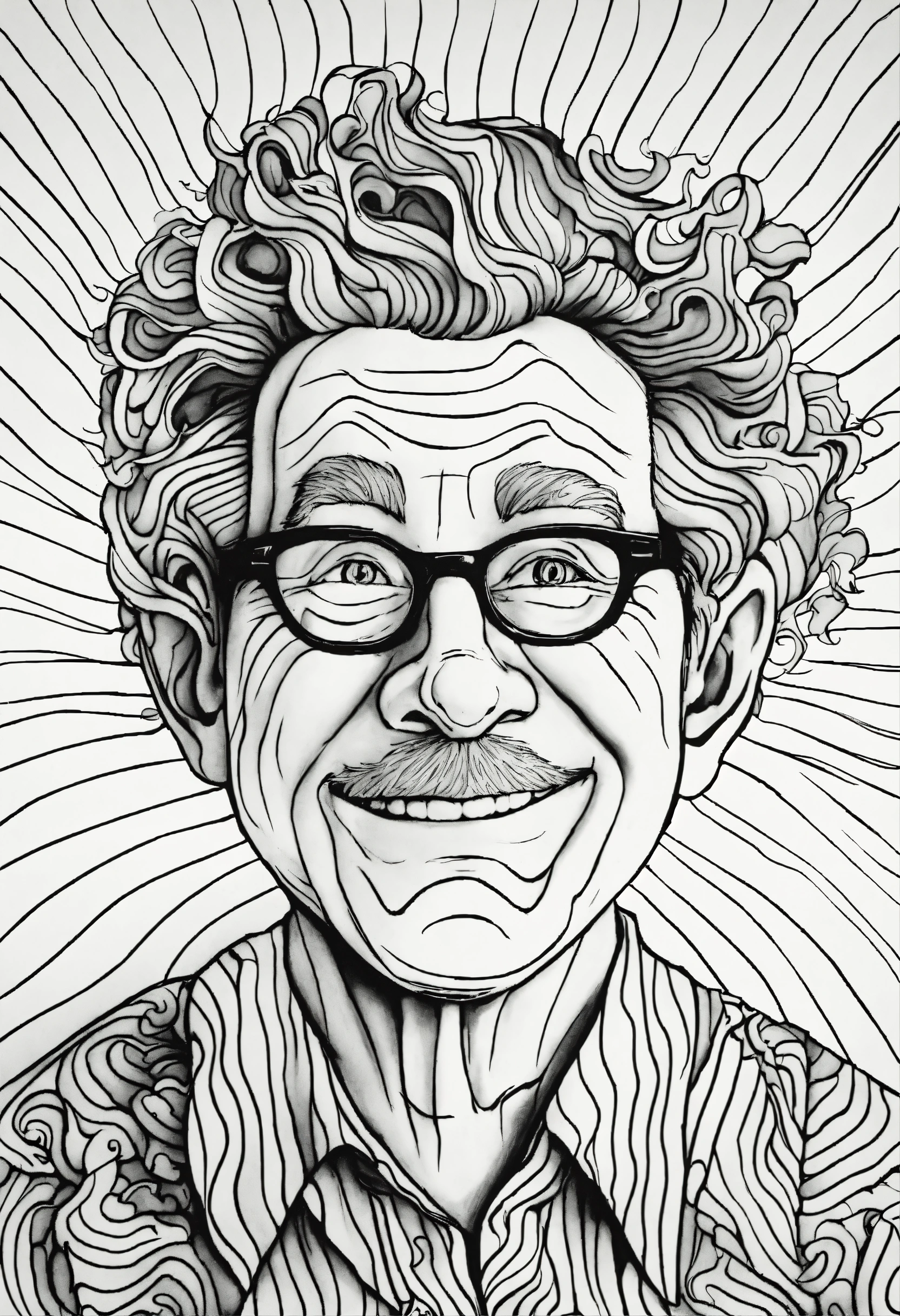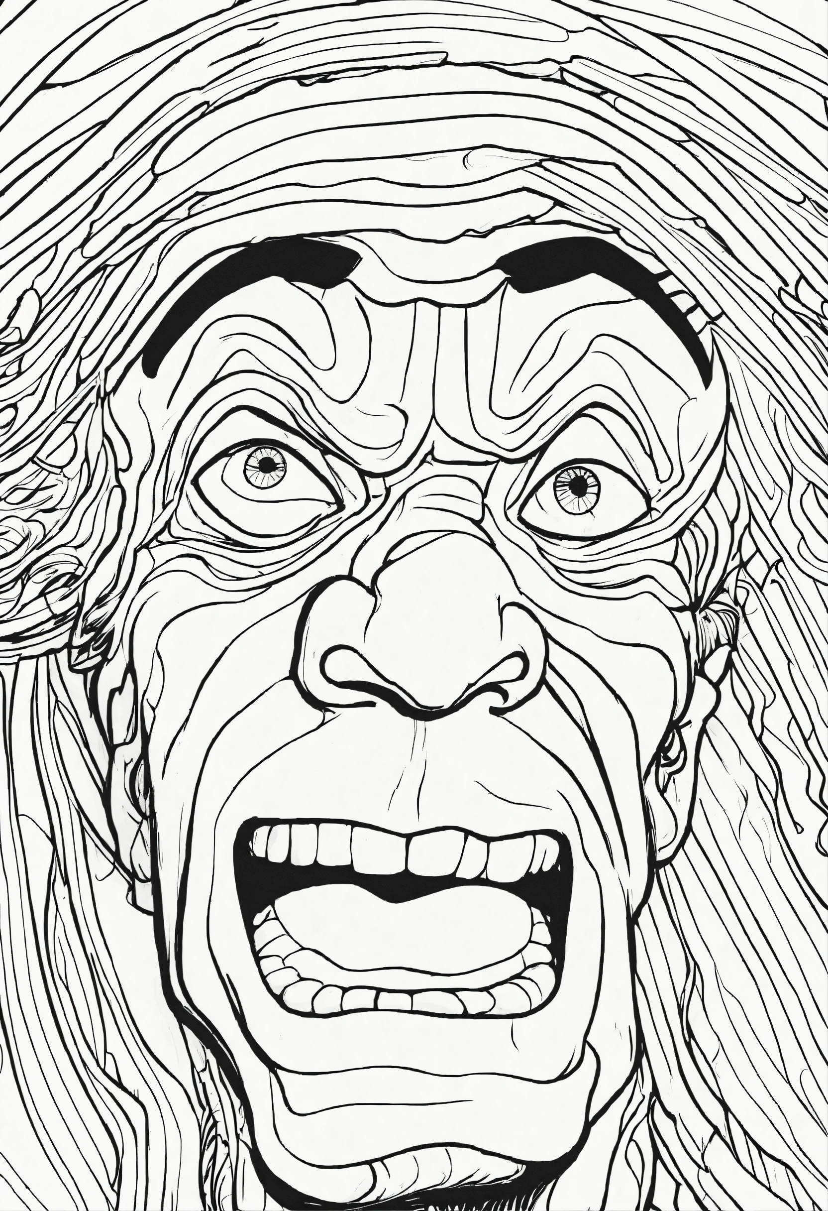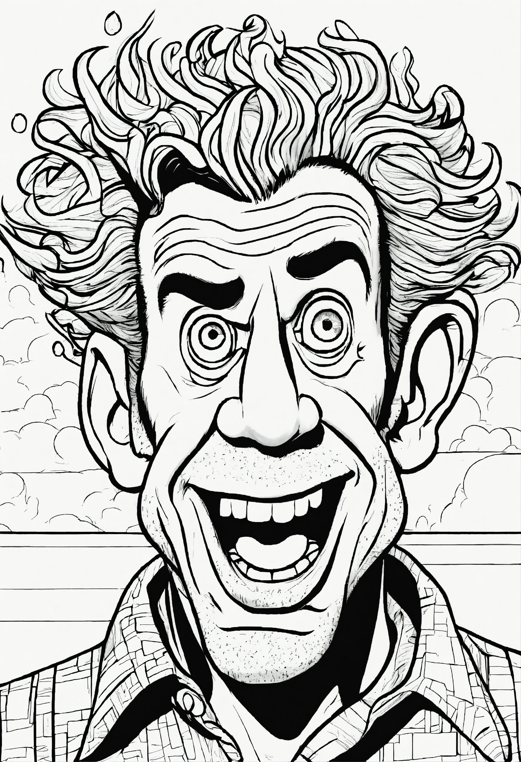 Coloring page for adults, wavy lines, mad magazine character idiot face, black and white, cartoon, white background
