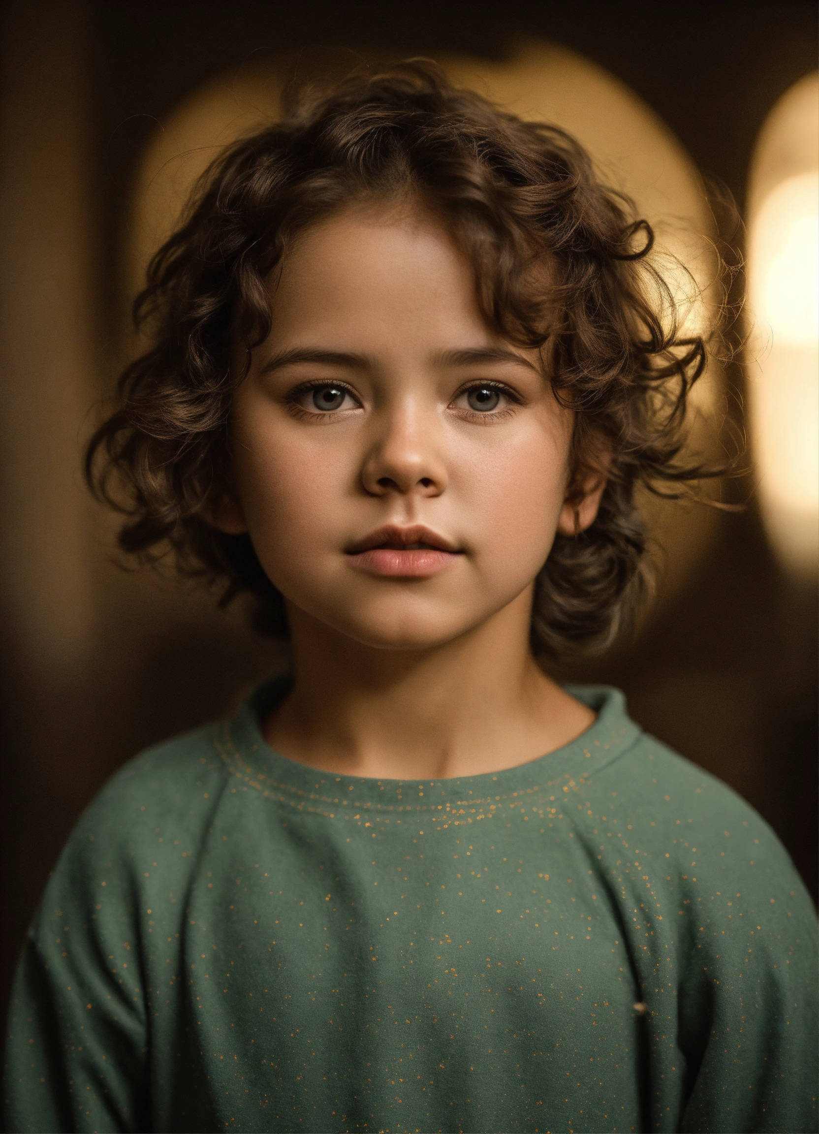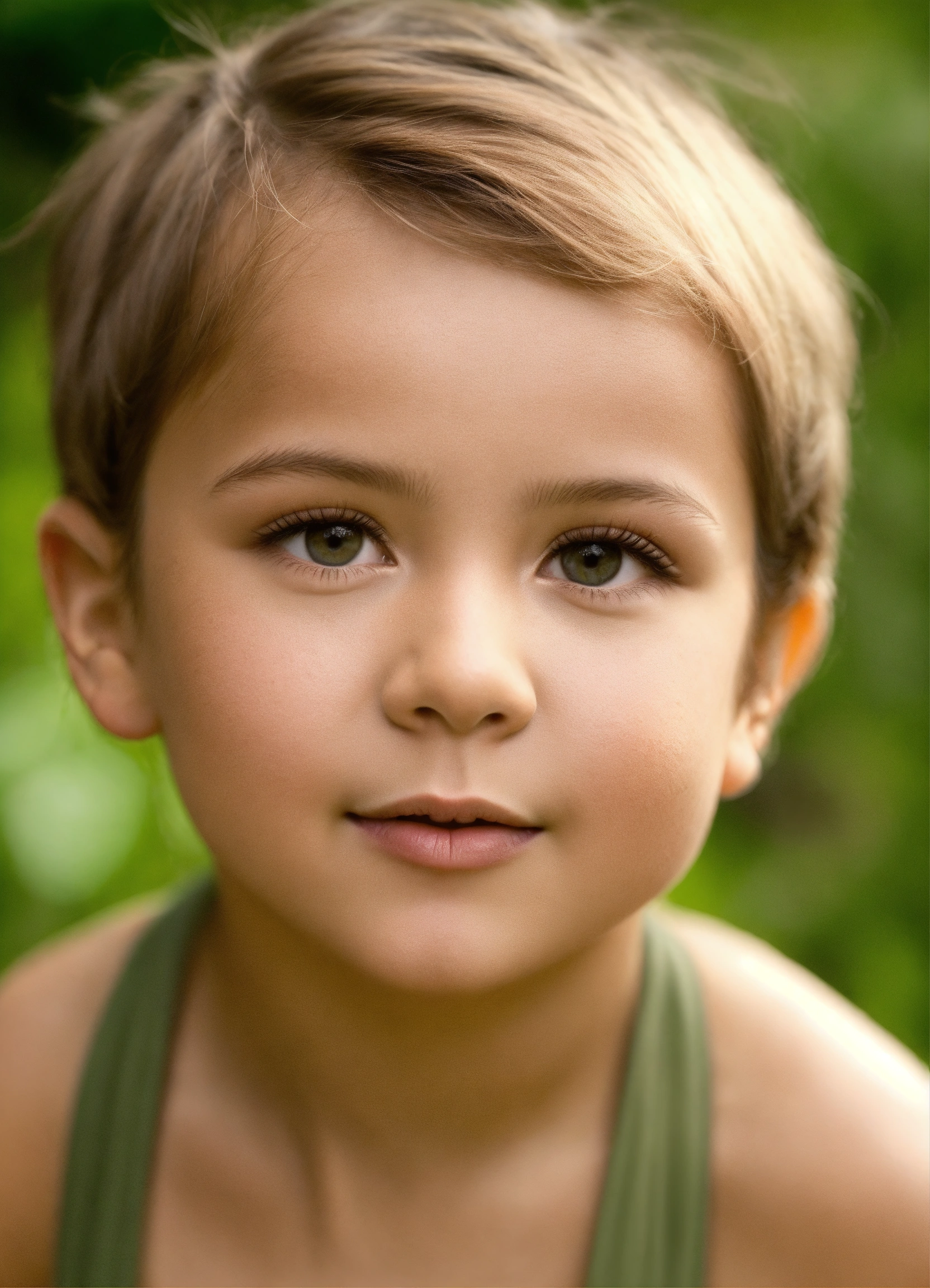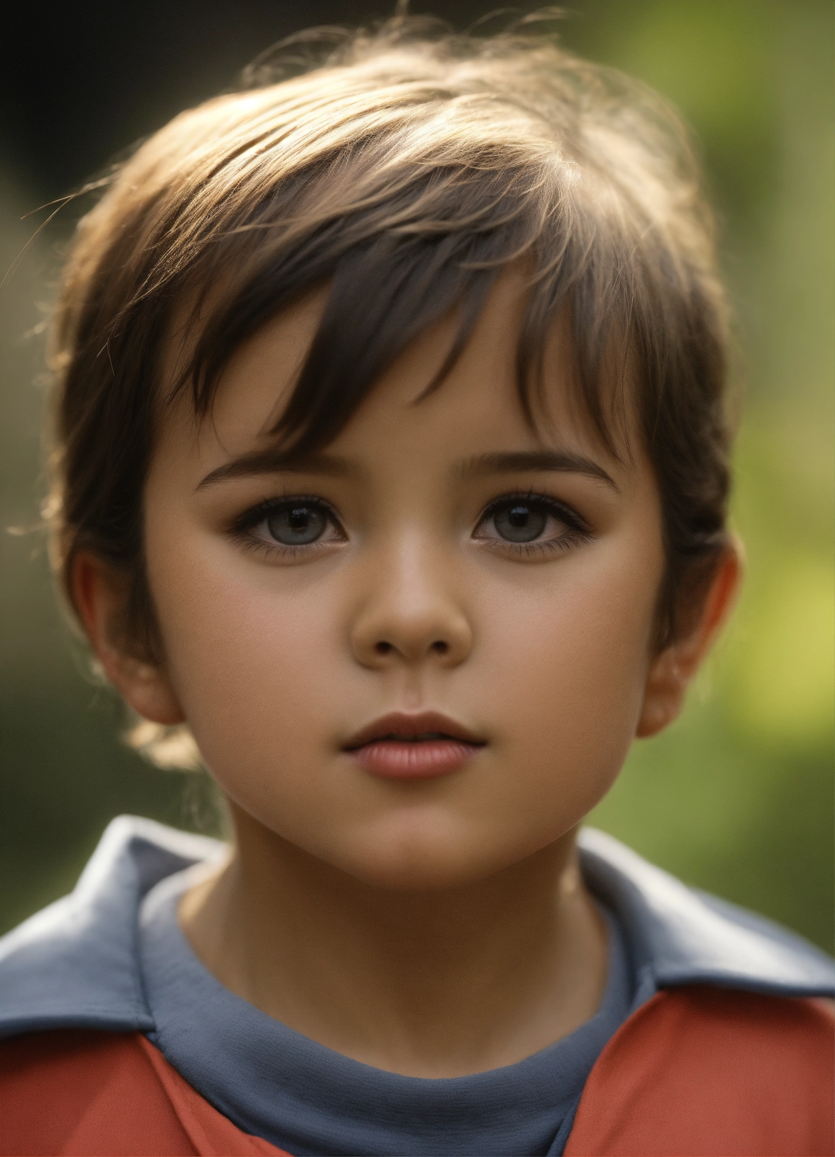 Genera una imagen de un niño con una expresión facial neutral y boca cerrada. la persona debe estar parada recta, mirando a la cámara y su cuerpo superior completo debe ser visible. la cabeza de la persona debe ser relativamente pequeña dentro de la imagen. la iluminación debe ser uniforme y equilibrada, sin sombras fuertes o áreas sobreexpuestas. el fondo debe ser discreto y simple, sin objetos que obstruyan la cara o el cuerpo de la persona. por favor, asegúrate de que la imagen sea de alta resolución y calidad.