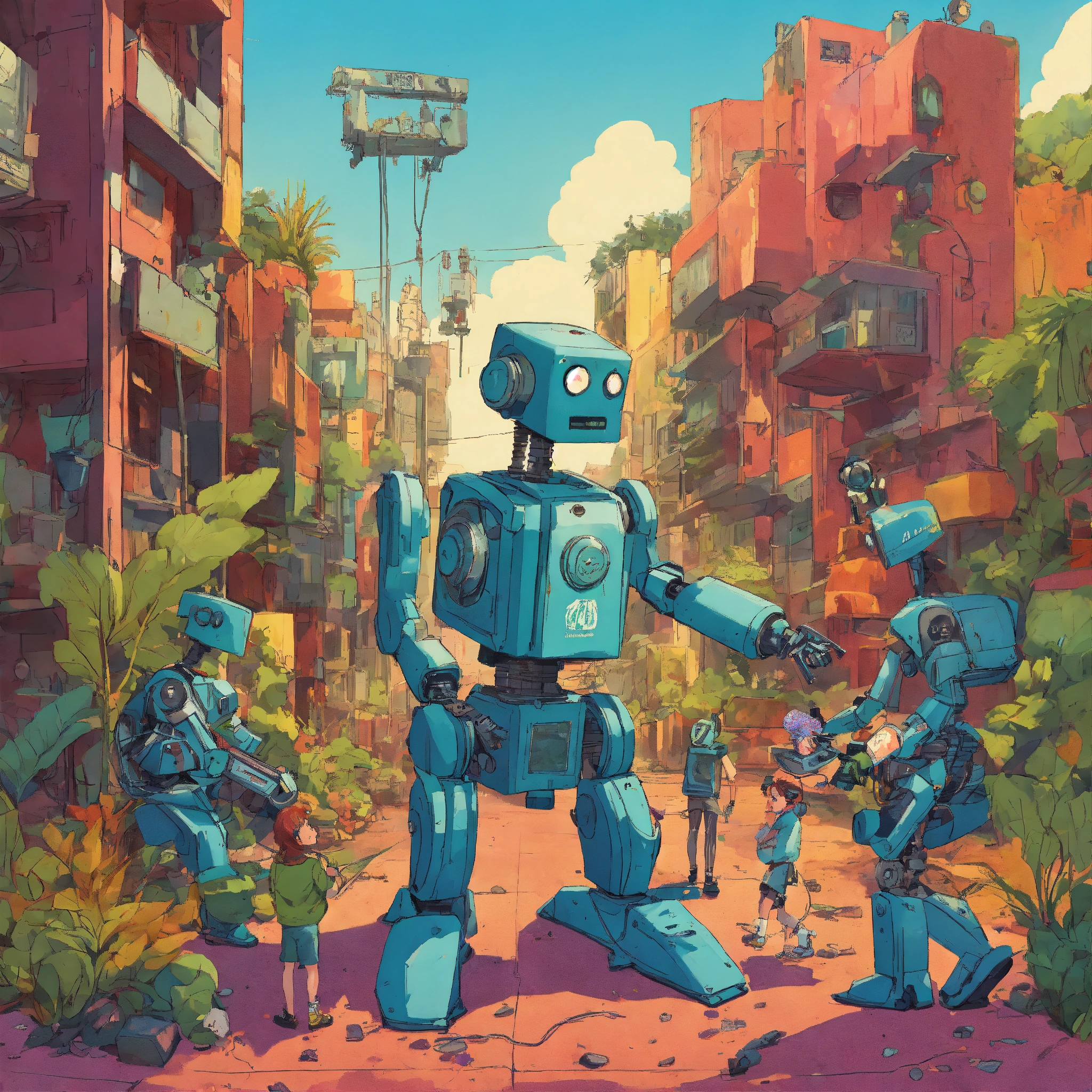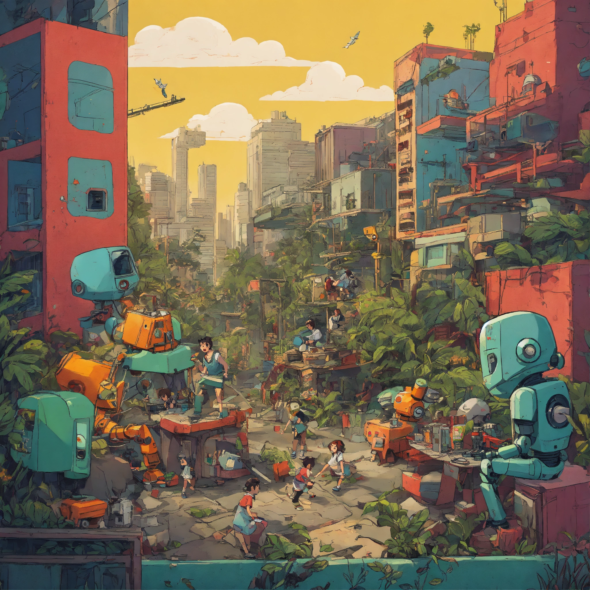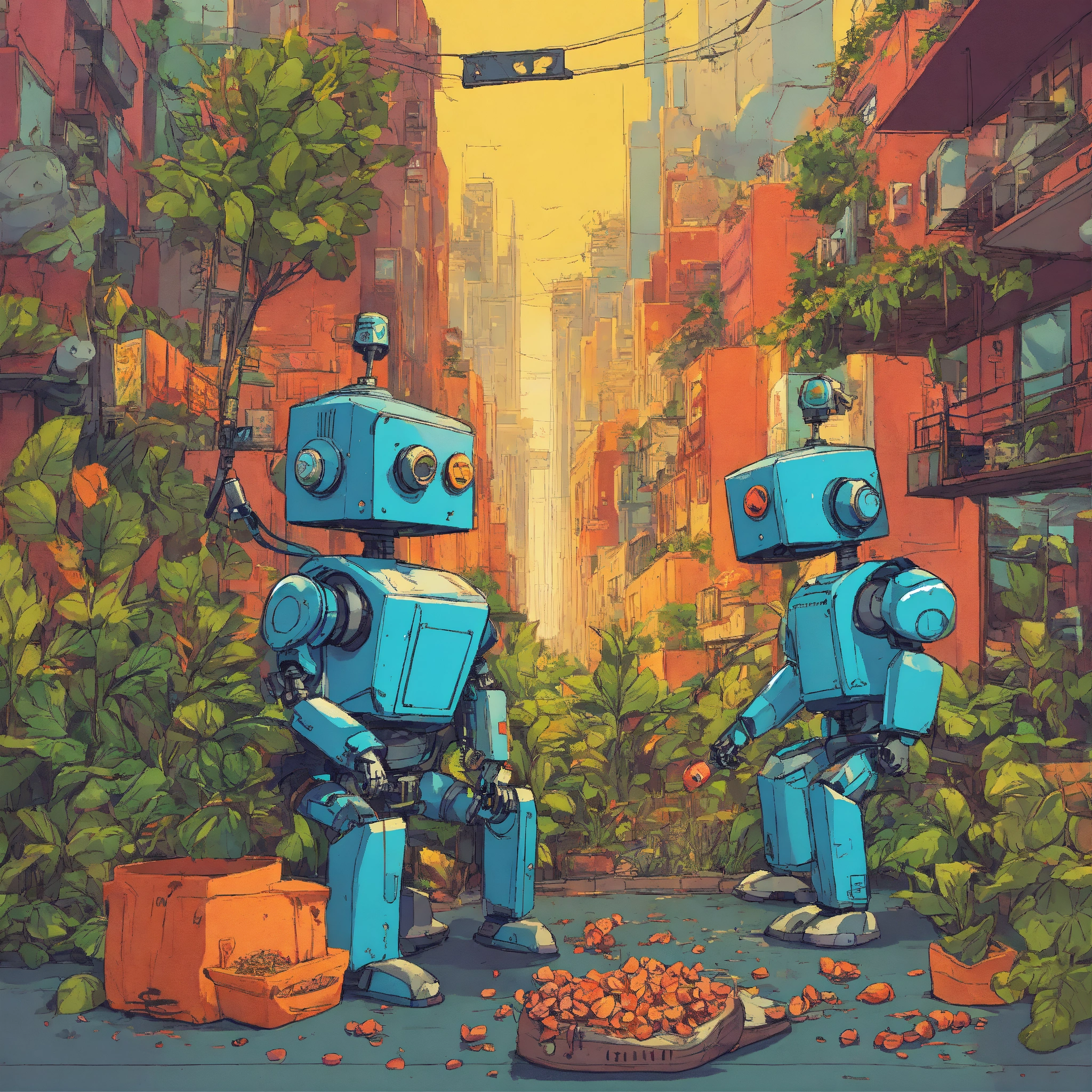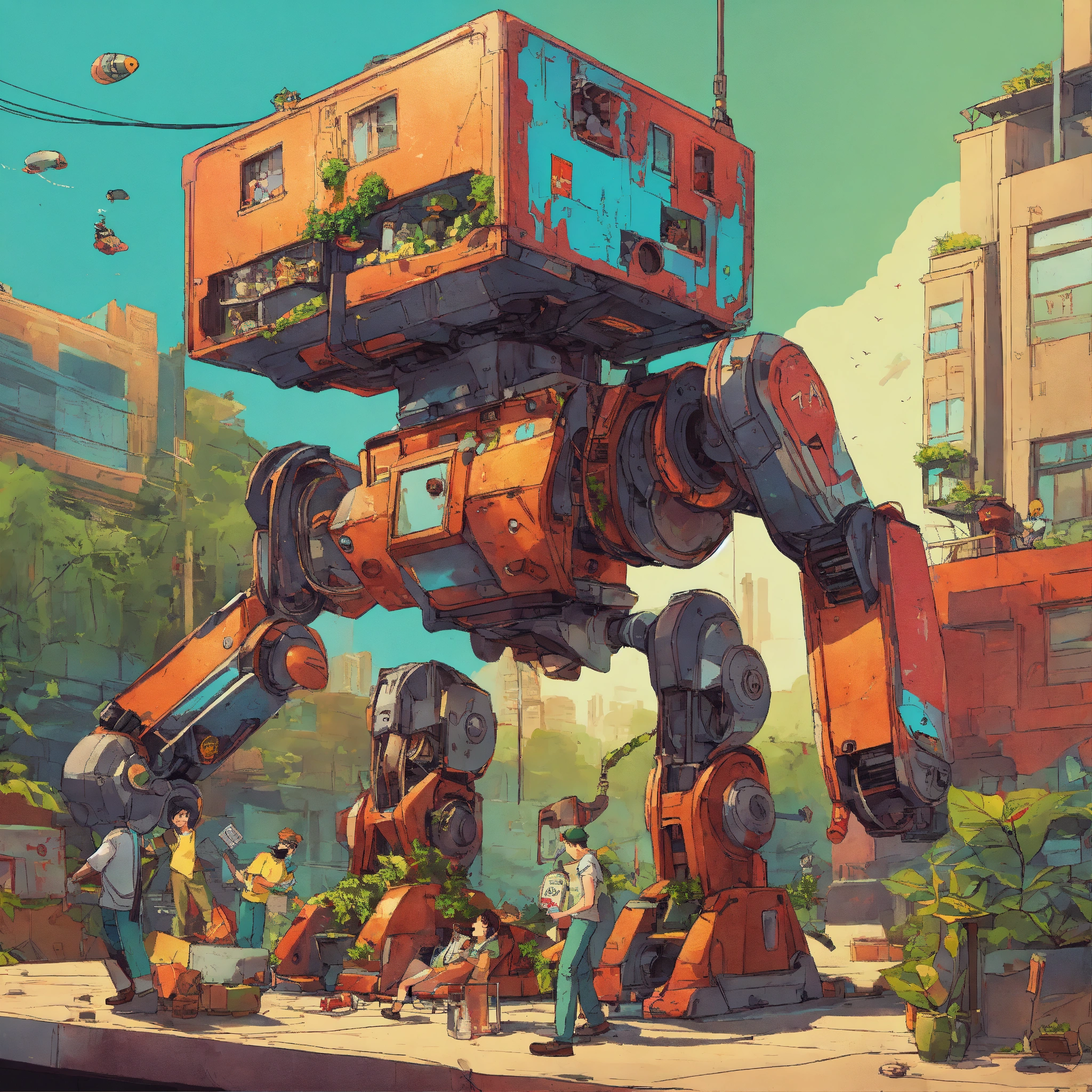 Illustrate a playful, cartoon-style poster with deformed humans munching on metal robot pieces in a vibrant, reclaimed urban jungle