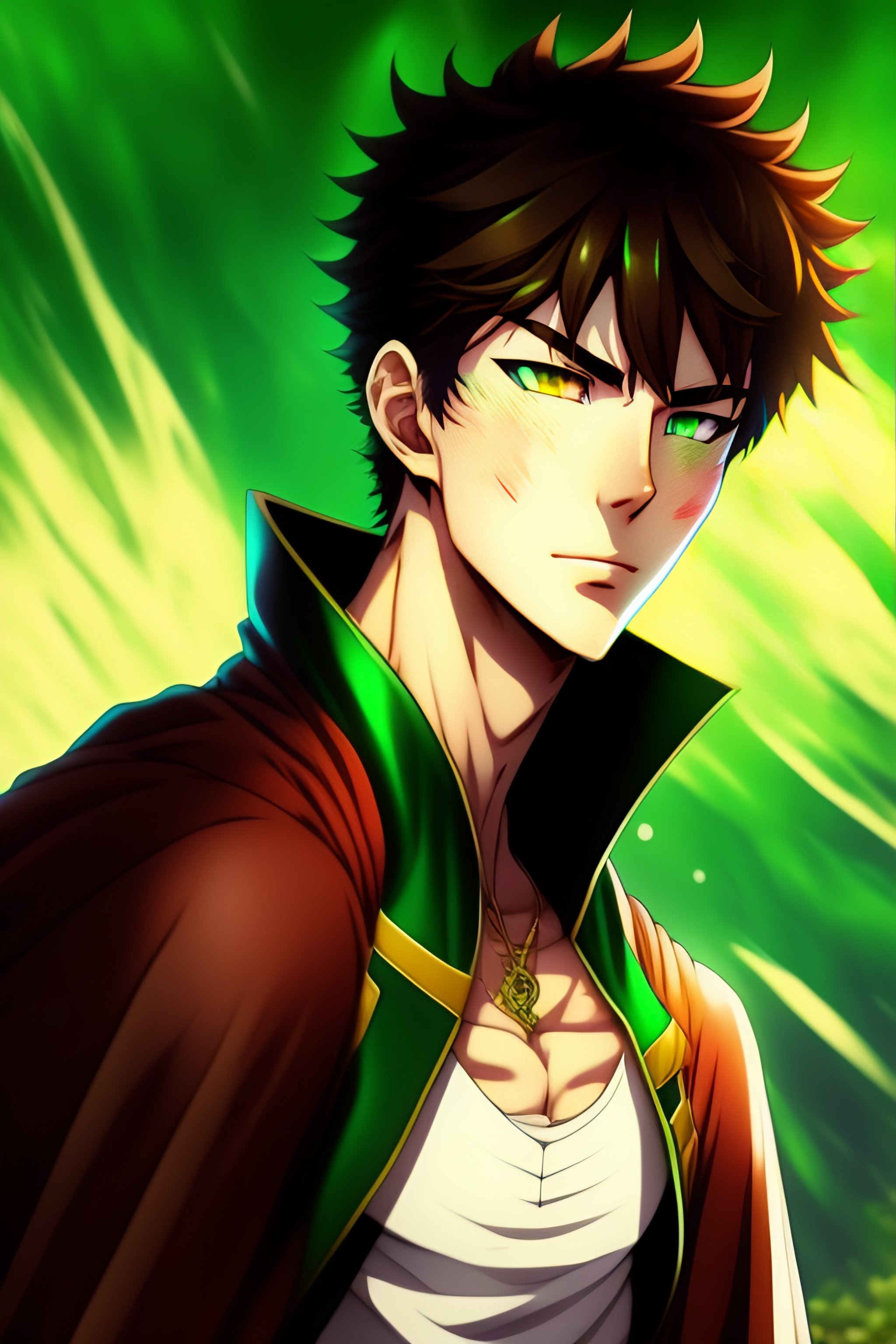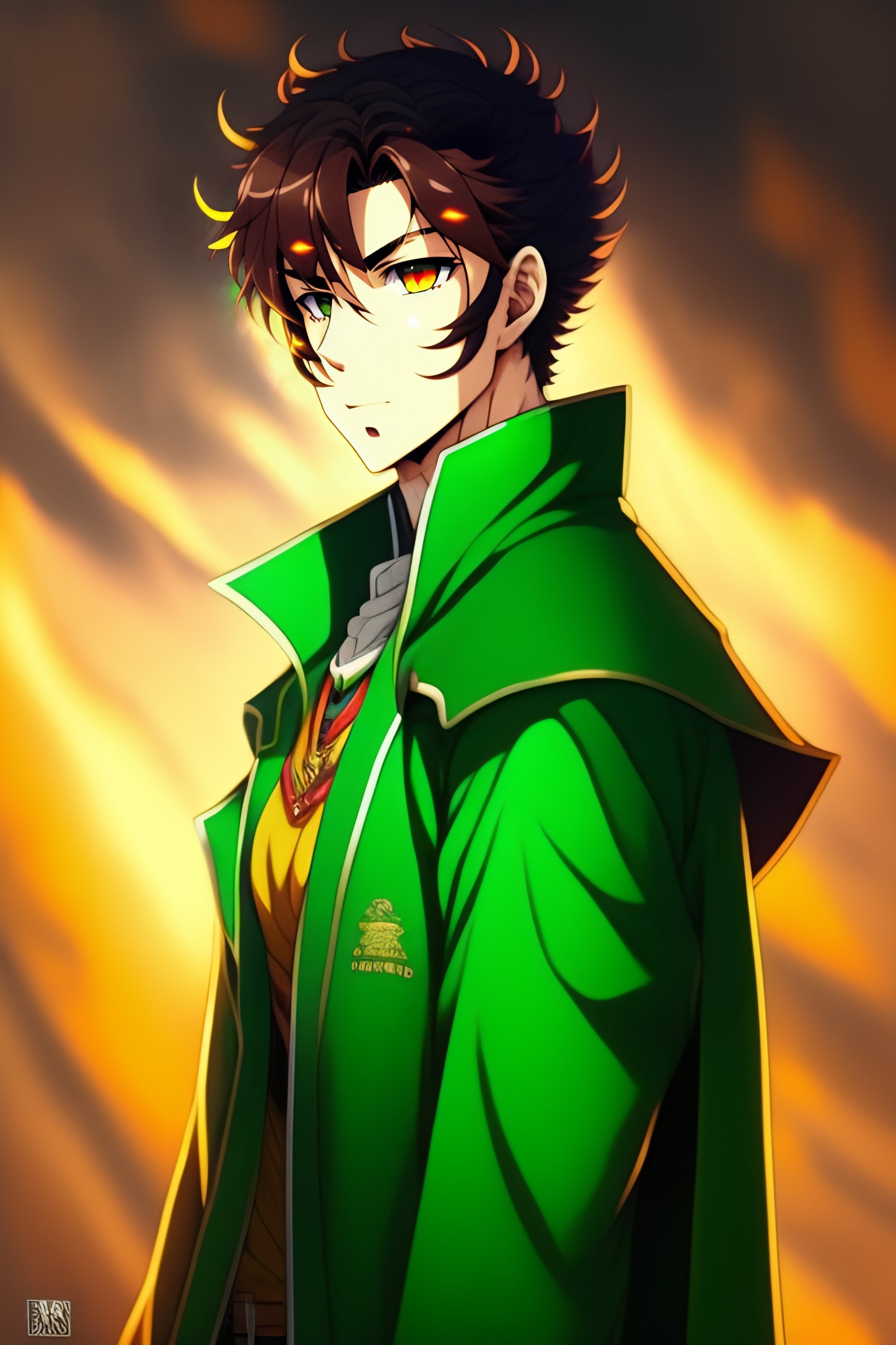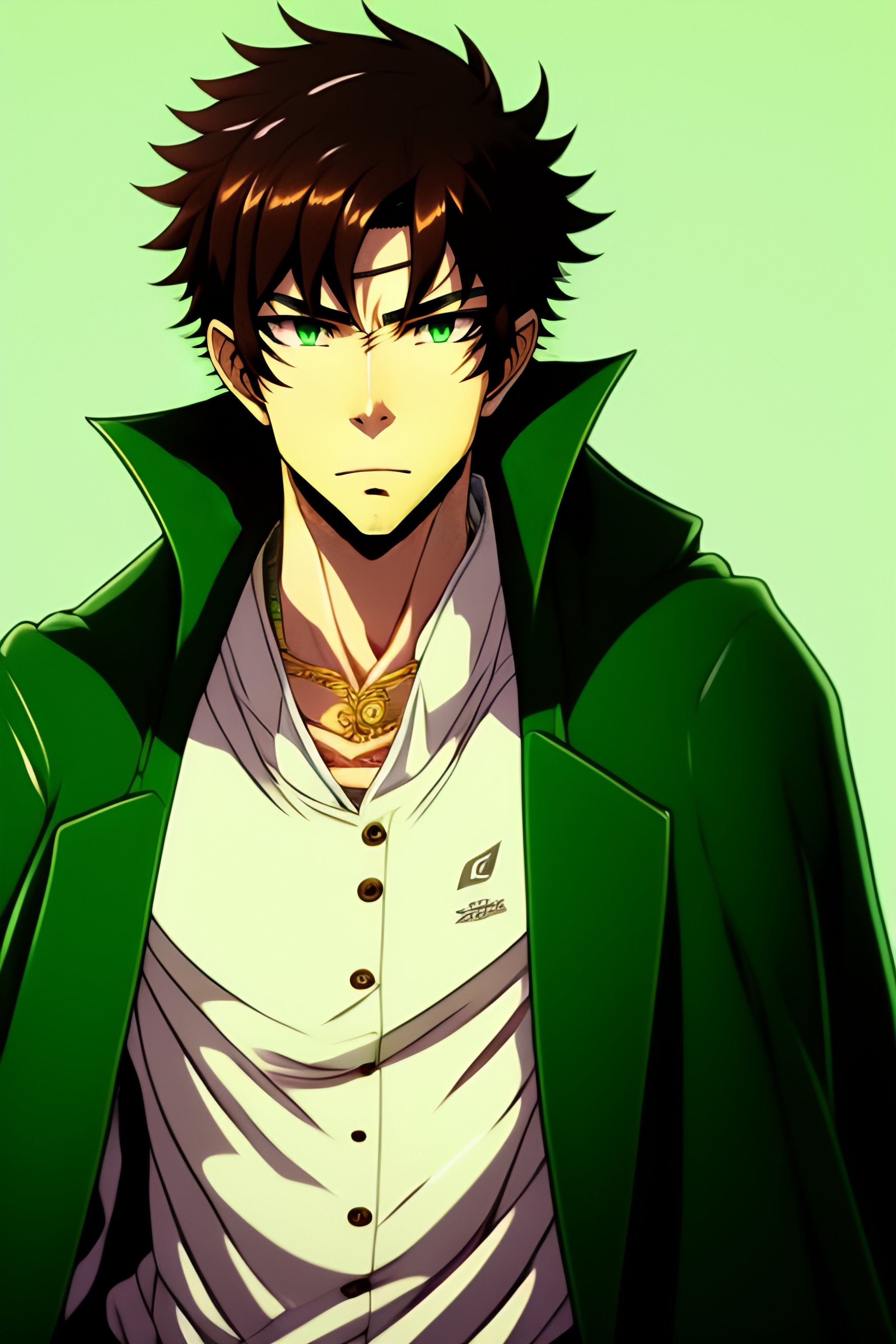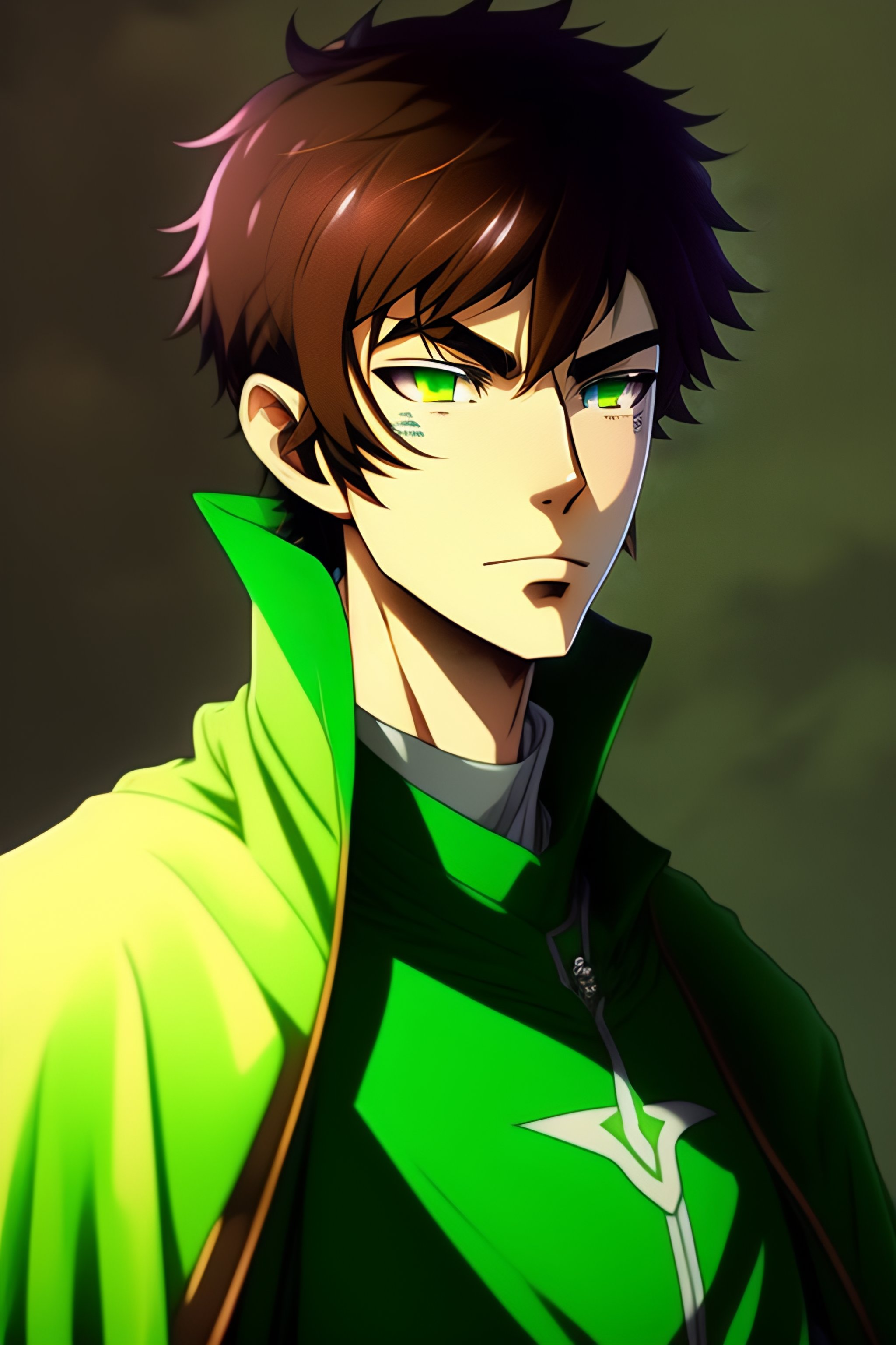 Anime guy, 19 years old, wearing a green colored t-shirt, brown hair, green eyes, light green eyes, green colored eyes, funny guy, anime style, cool, wearing a green jacket as a cape, masterpiece art, wearing cape