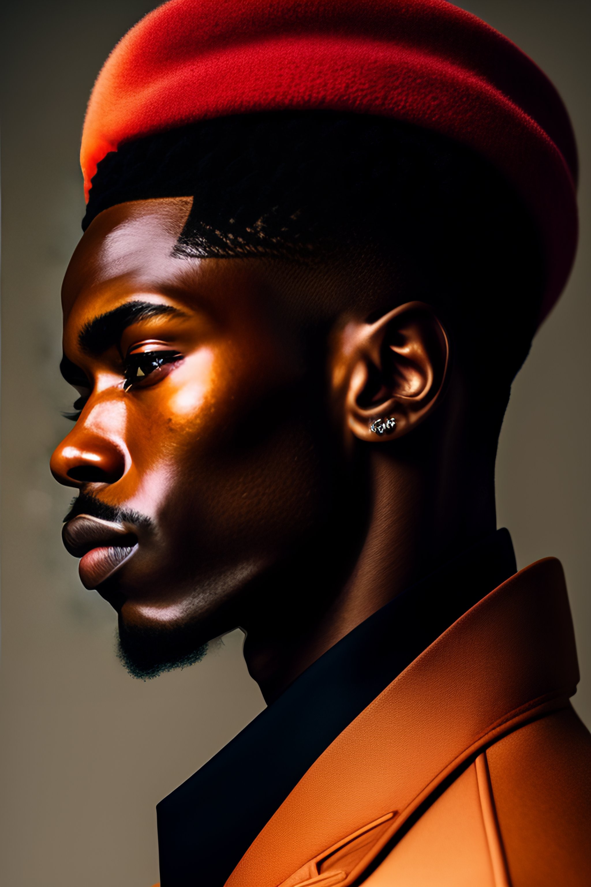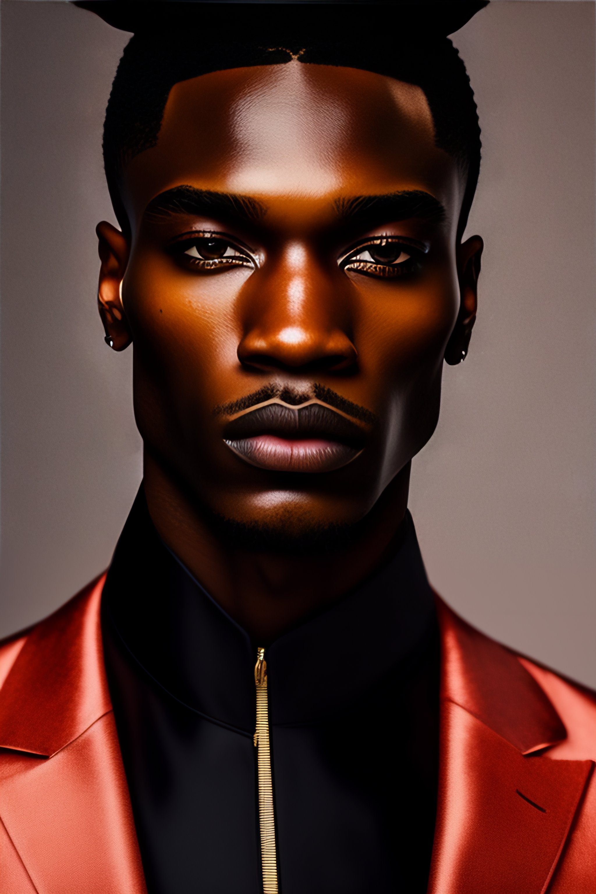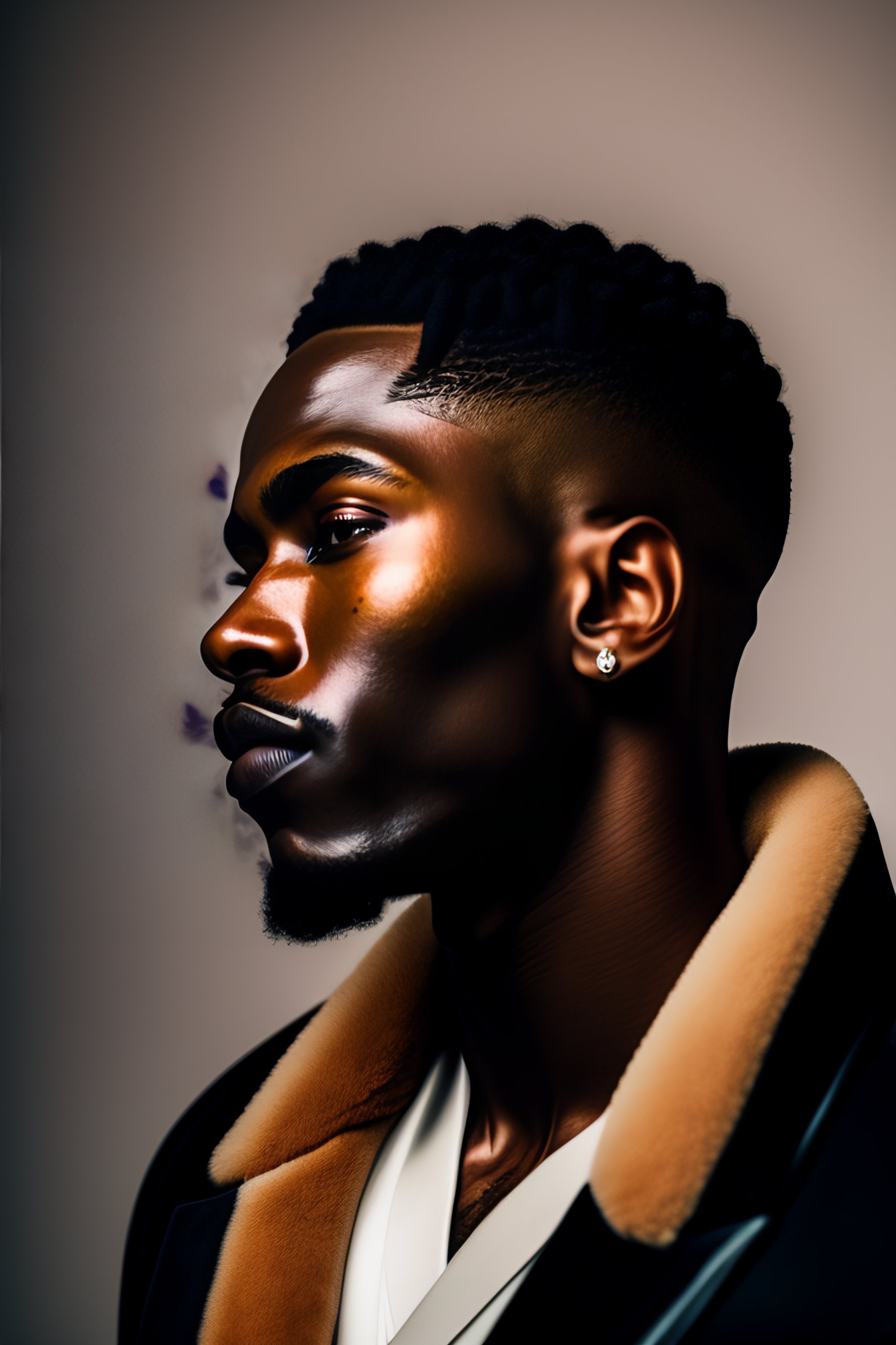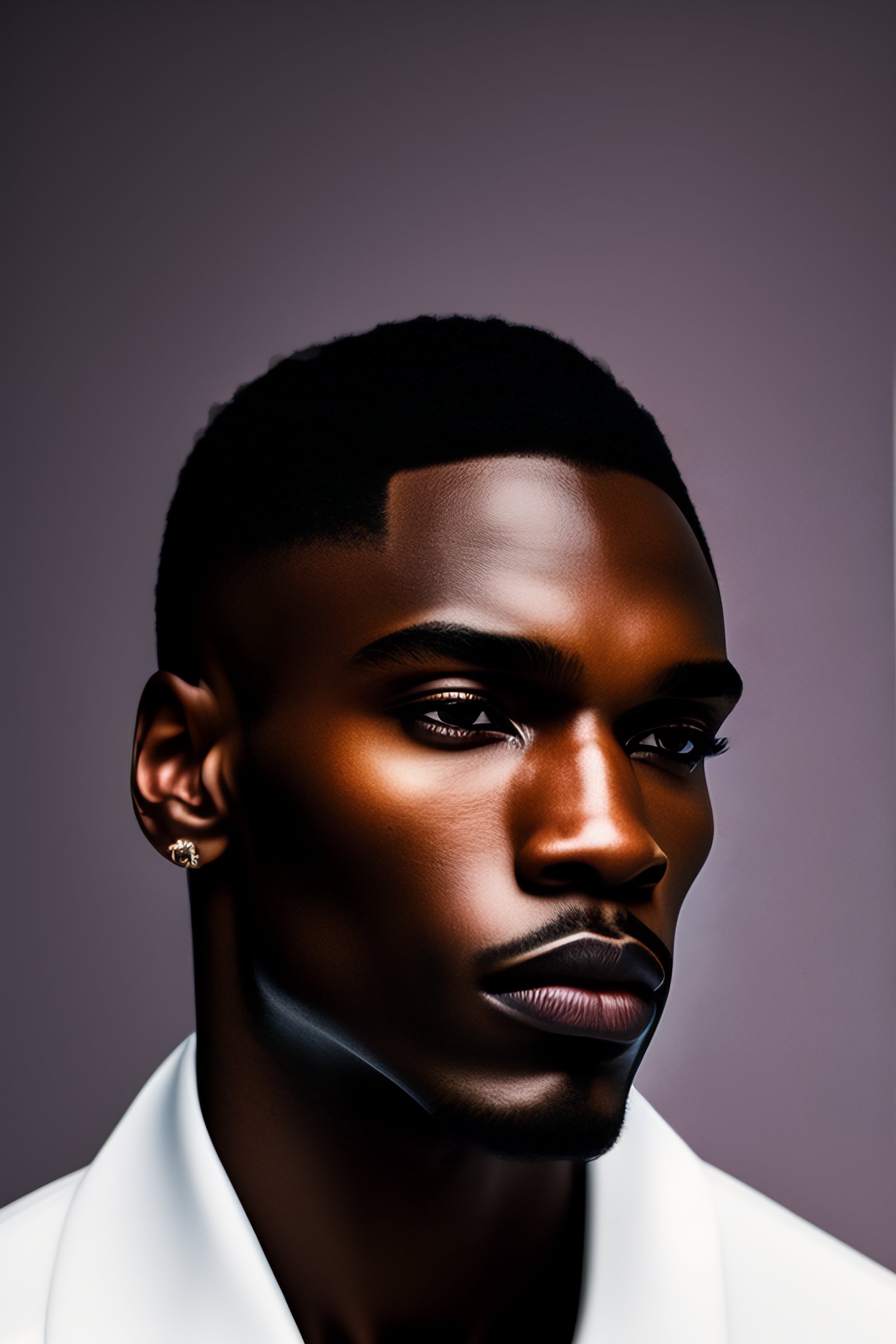 A photo close-up of a beautiful black man, fashion editorial, studio photography, magazine photography, pointed nose, blurry background