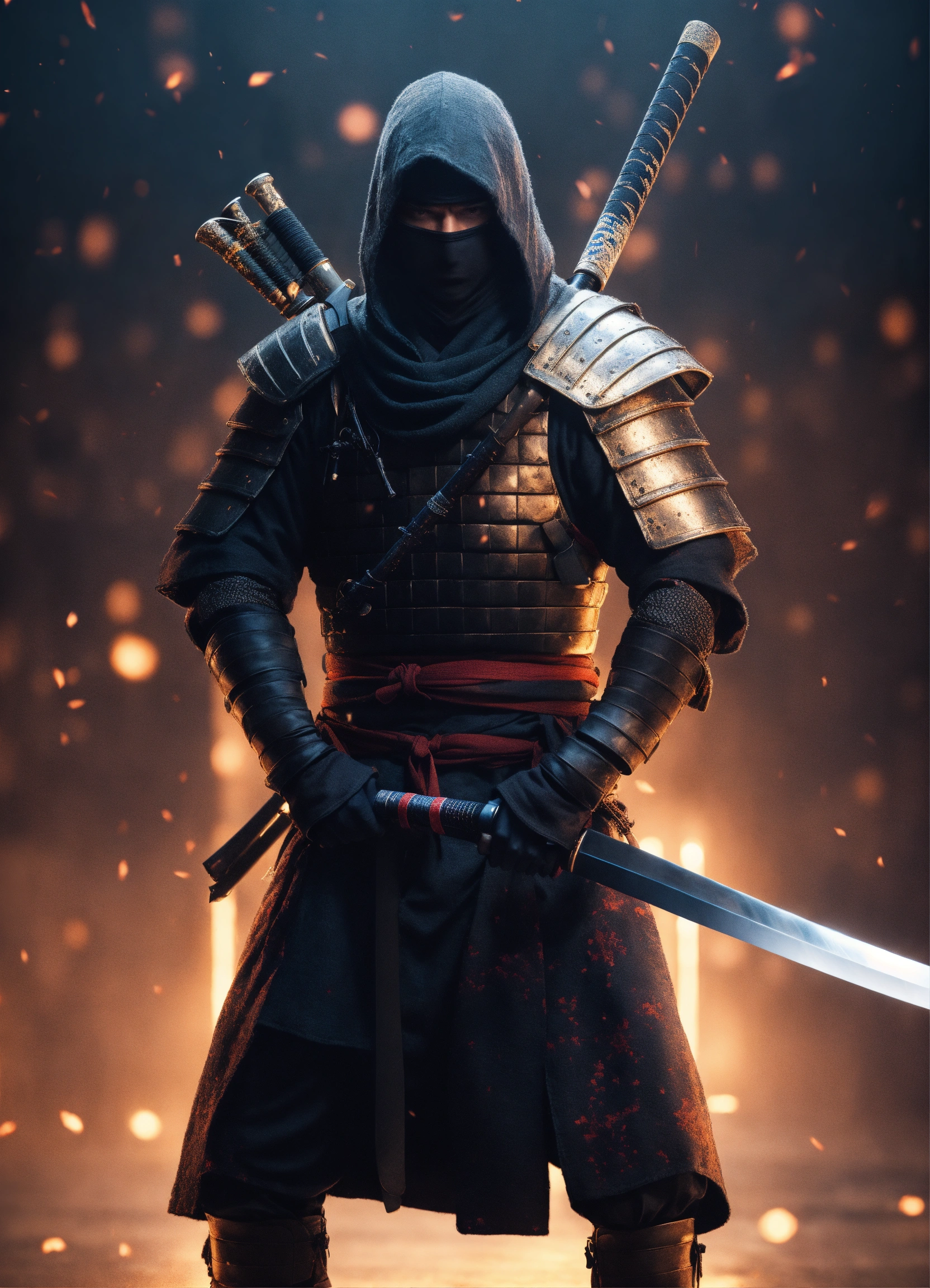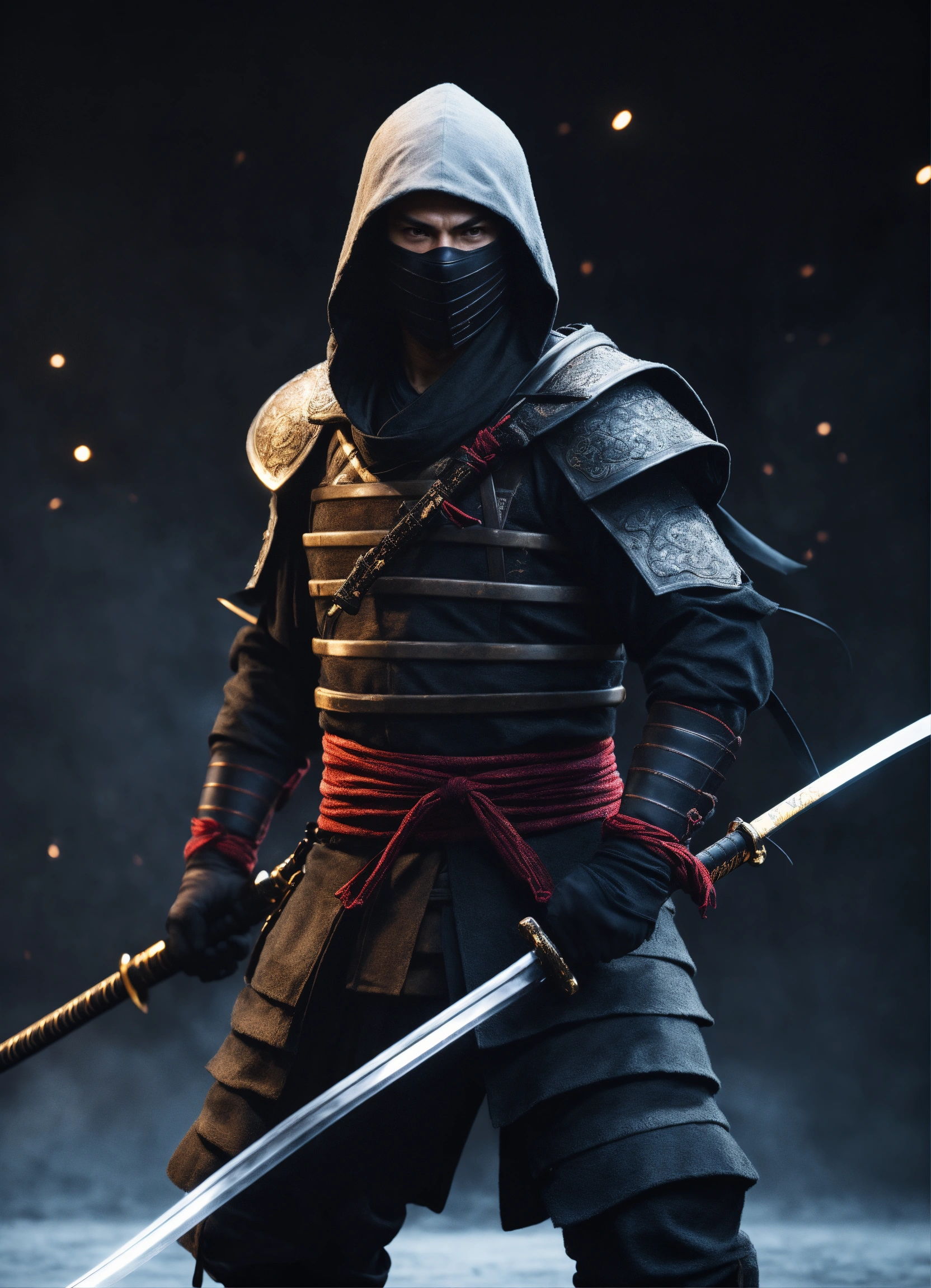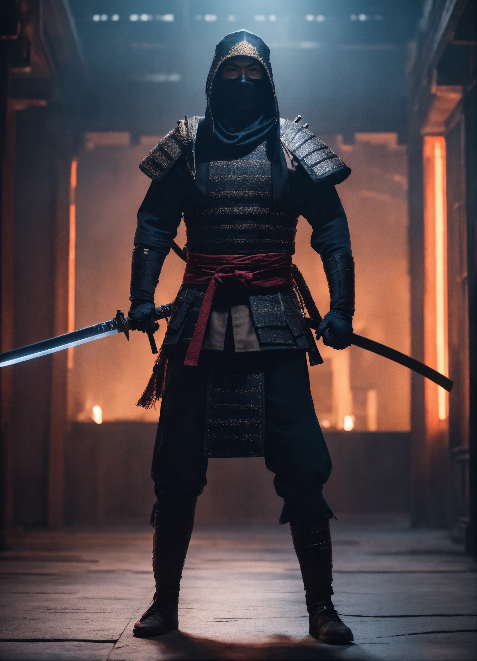 A realistic full body portrait of a male medival ninja, katana, neutral background, moody, photorealistic, cinematic scene, super detailed, hyper realistic, bright lights, 8 k