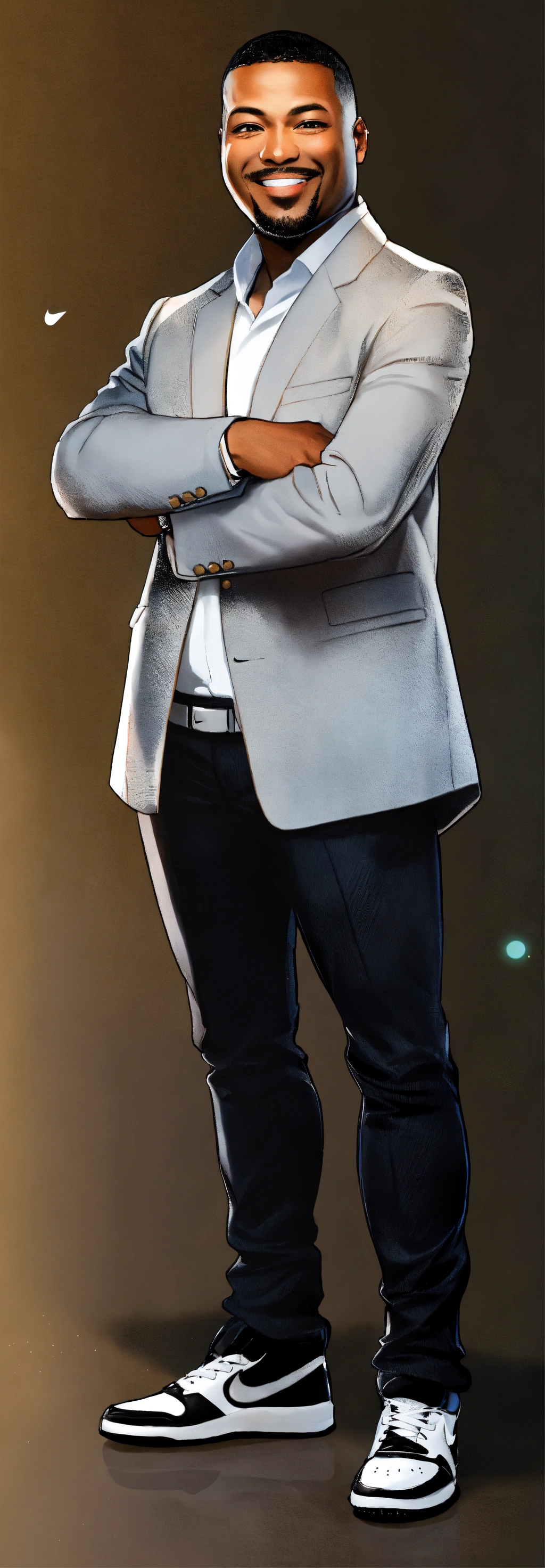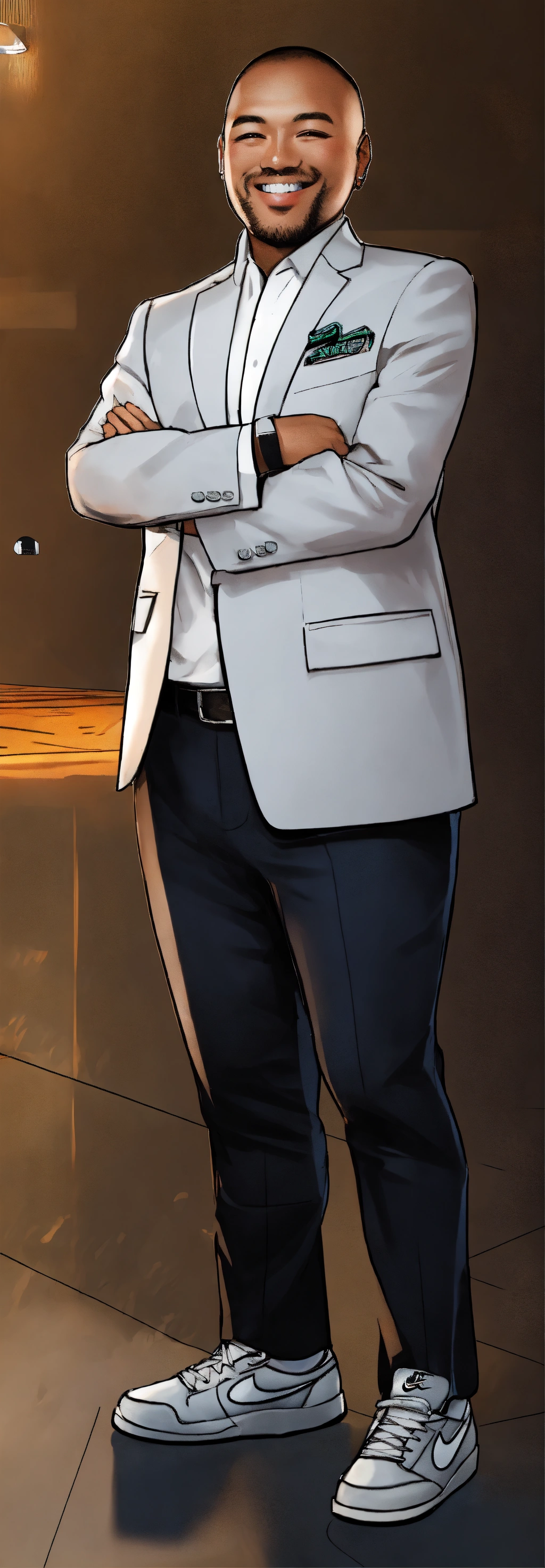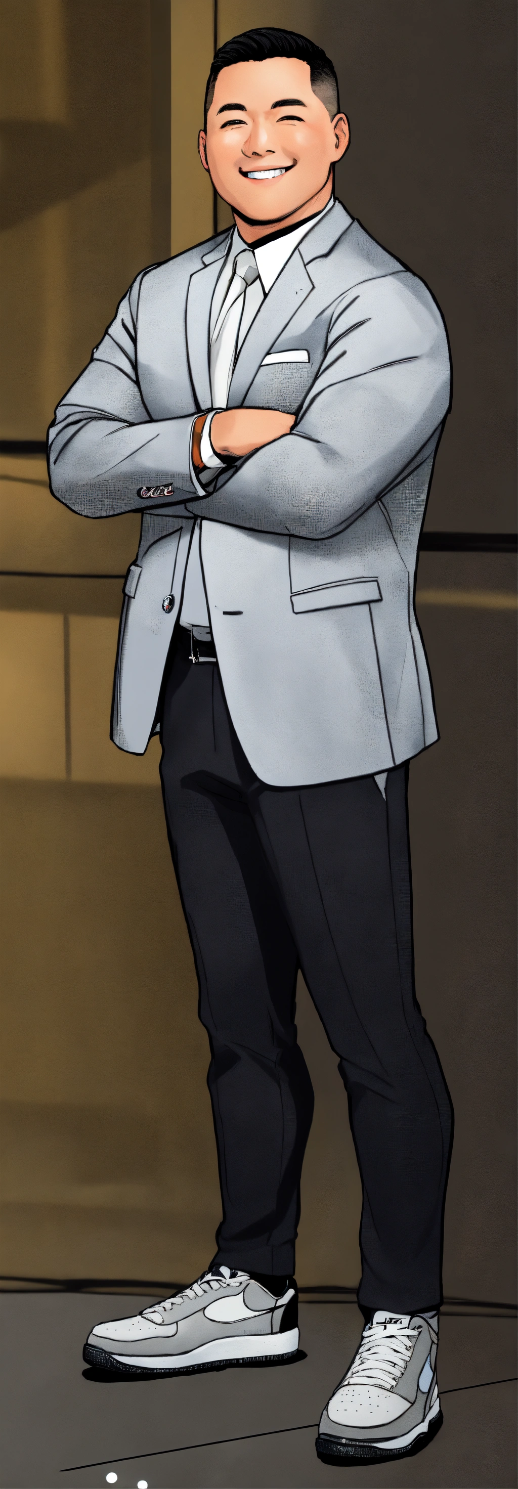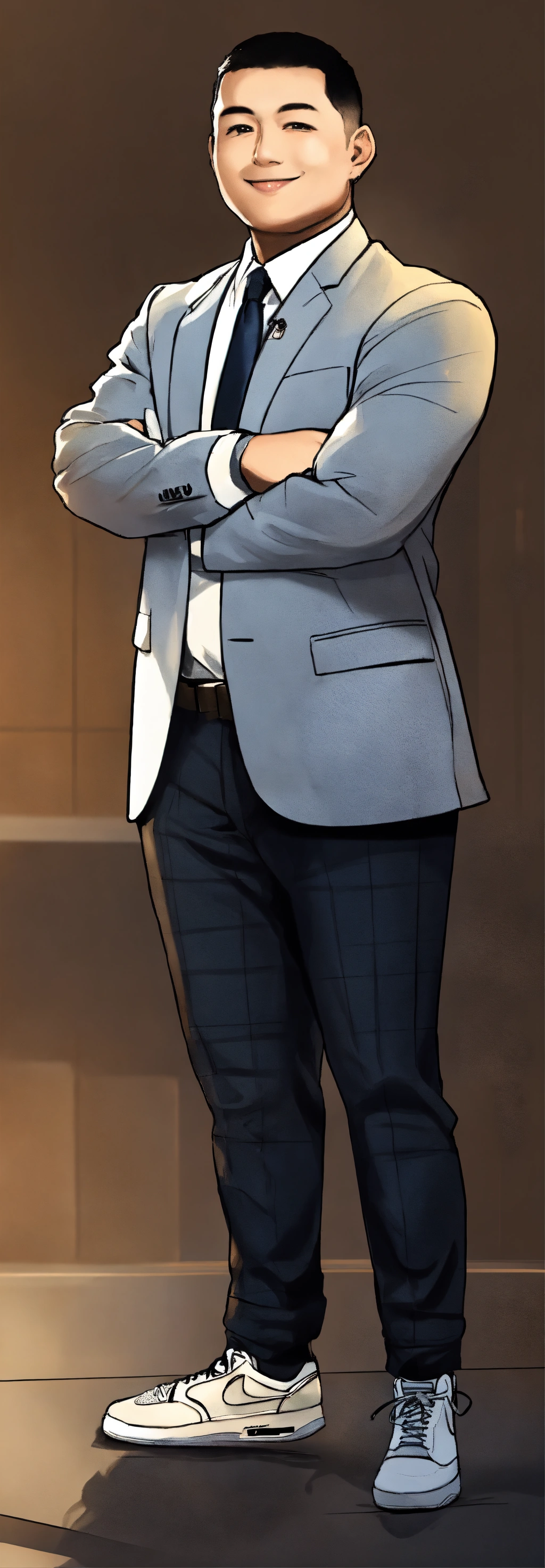 A white round face, executive businessman ceo smiling, black short hair, wearing nike air jordan black white on chibi manga style