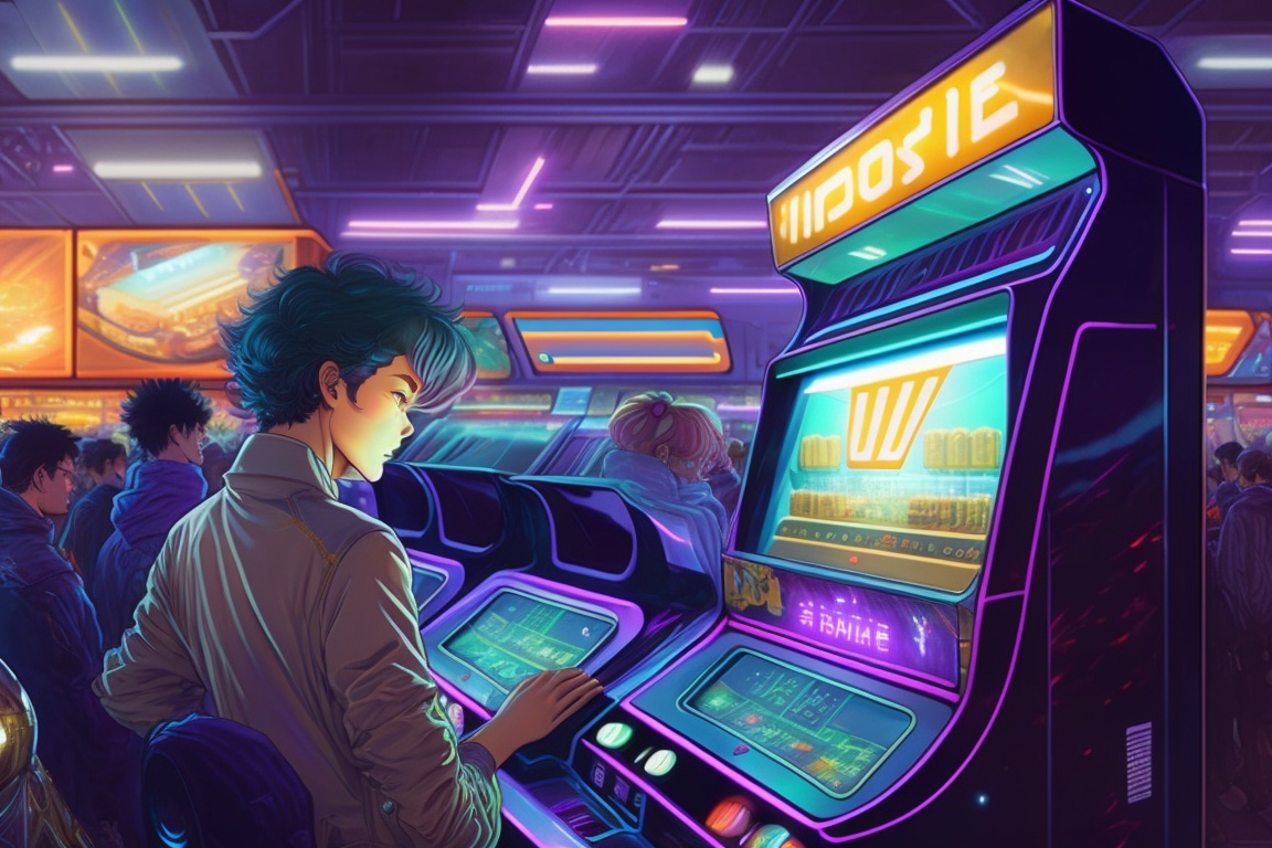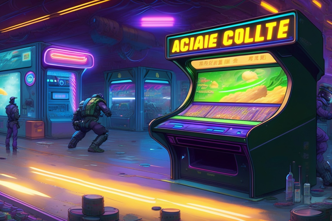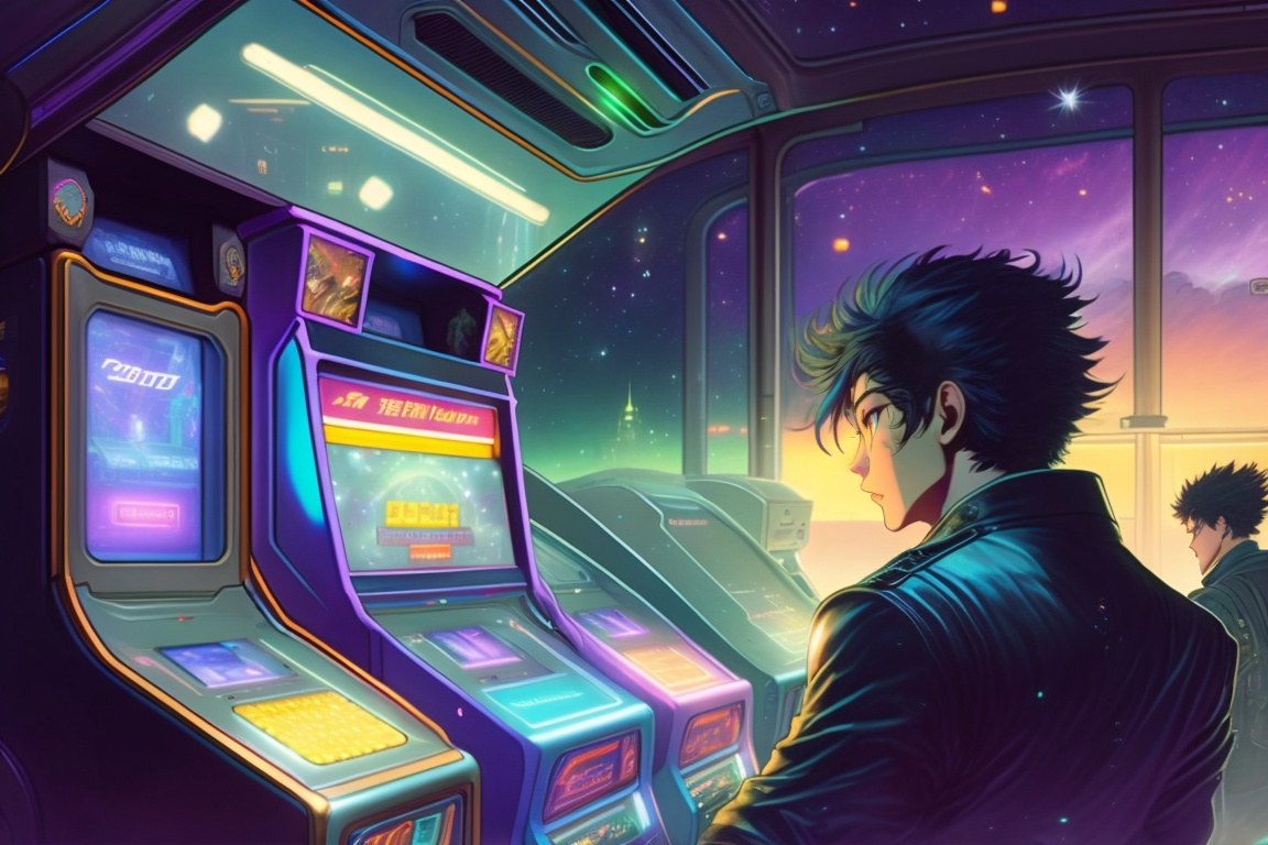 1990s anime style ambient wide shot of a chaotic arcade at night; master chief playing an arcade game; by hajime sorayama, greg tocchini, virgil finlay, science fiction. line art. ambient arcade art.