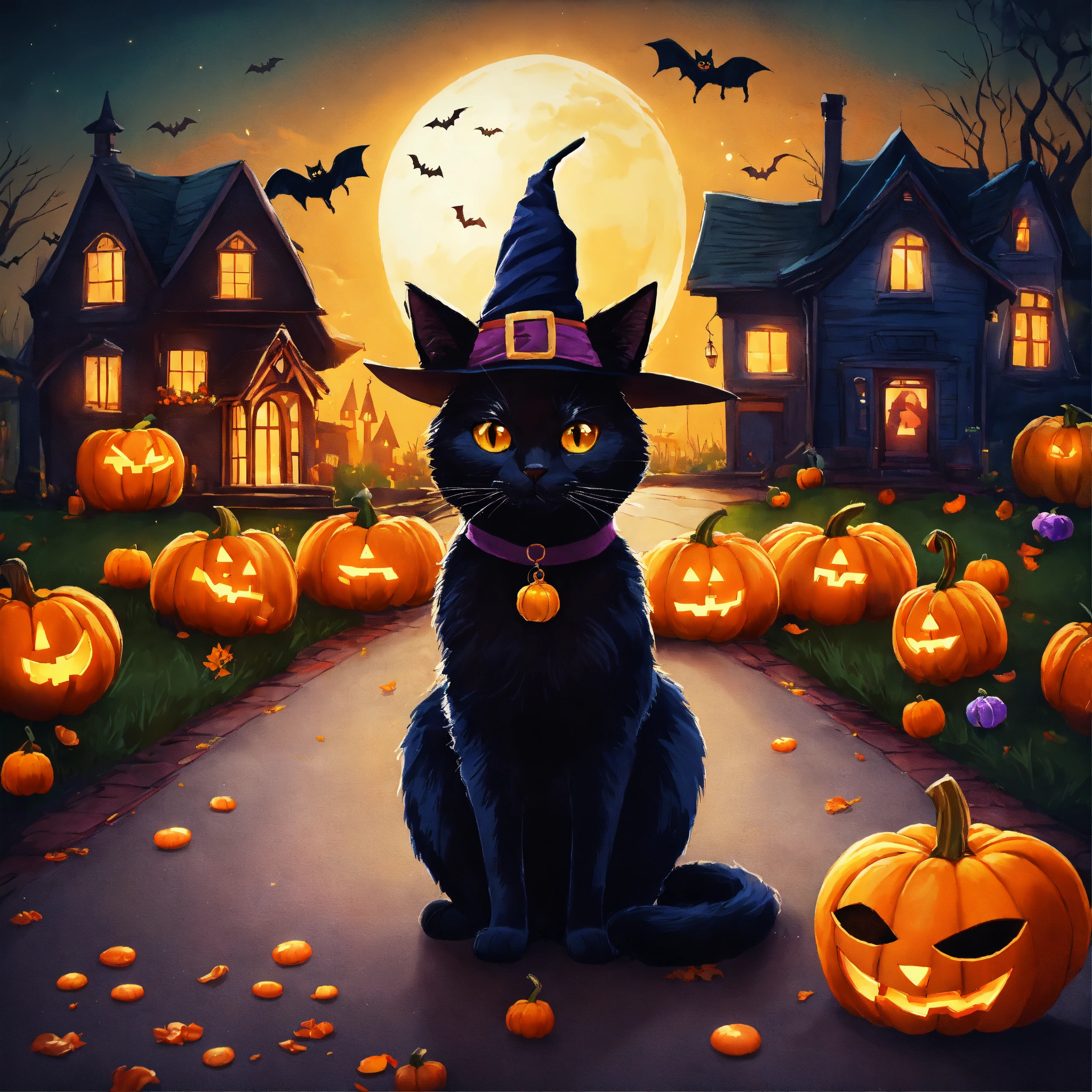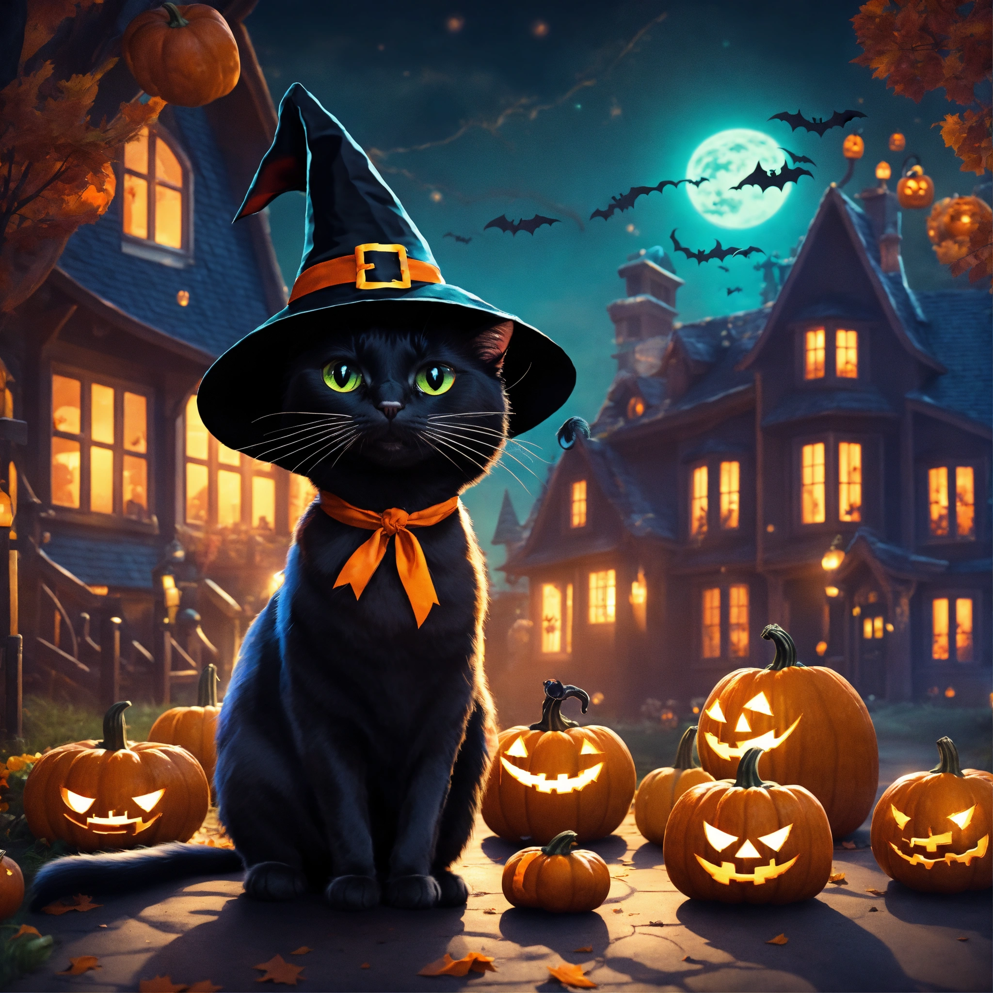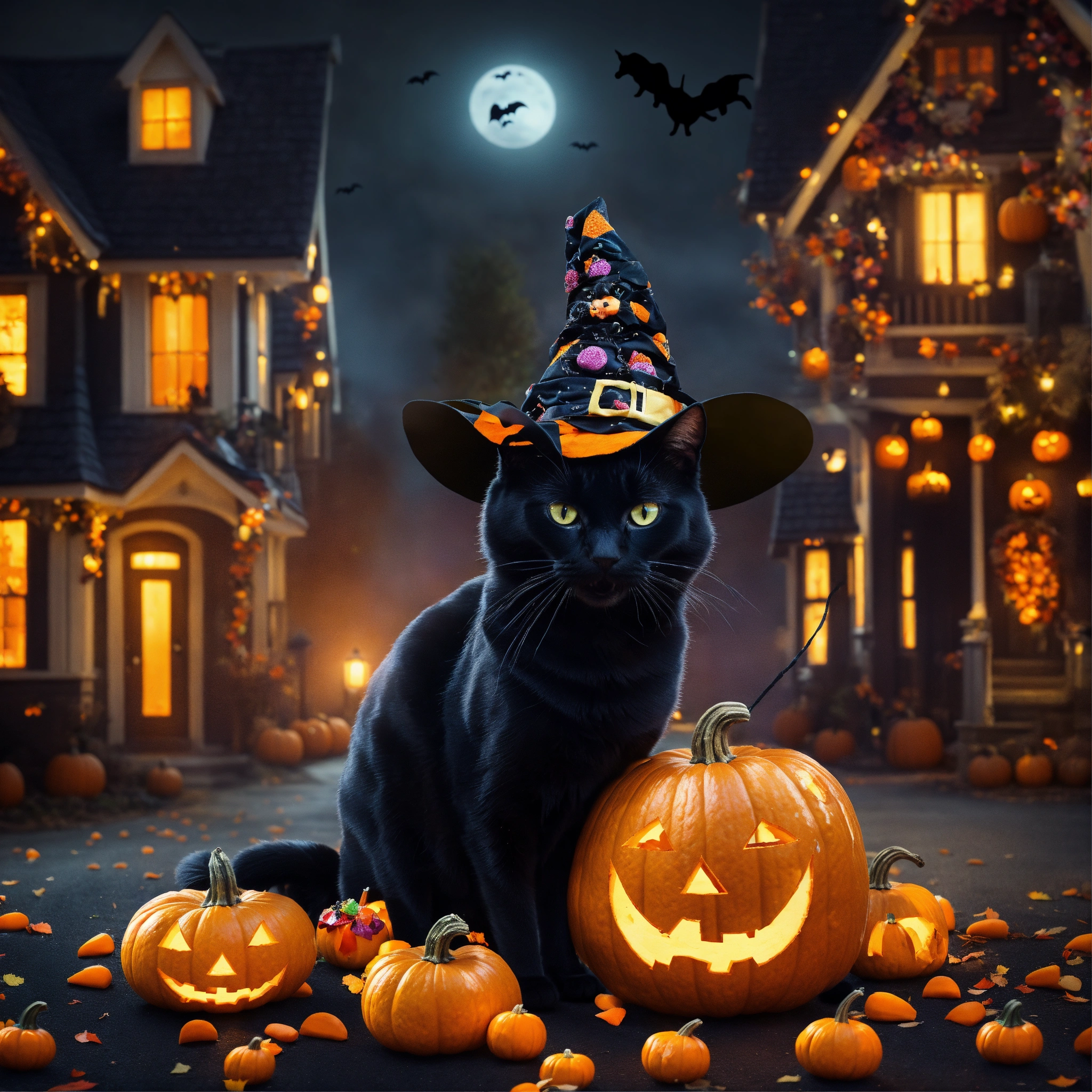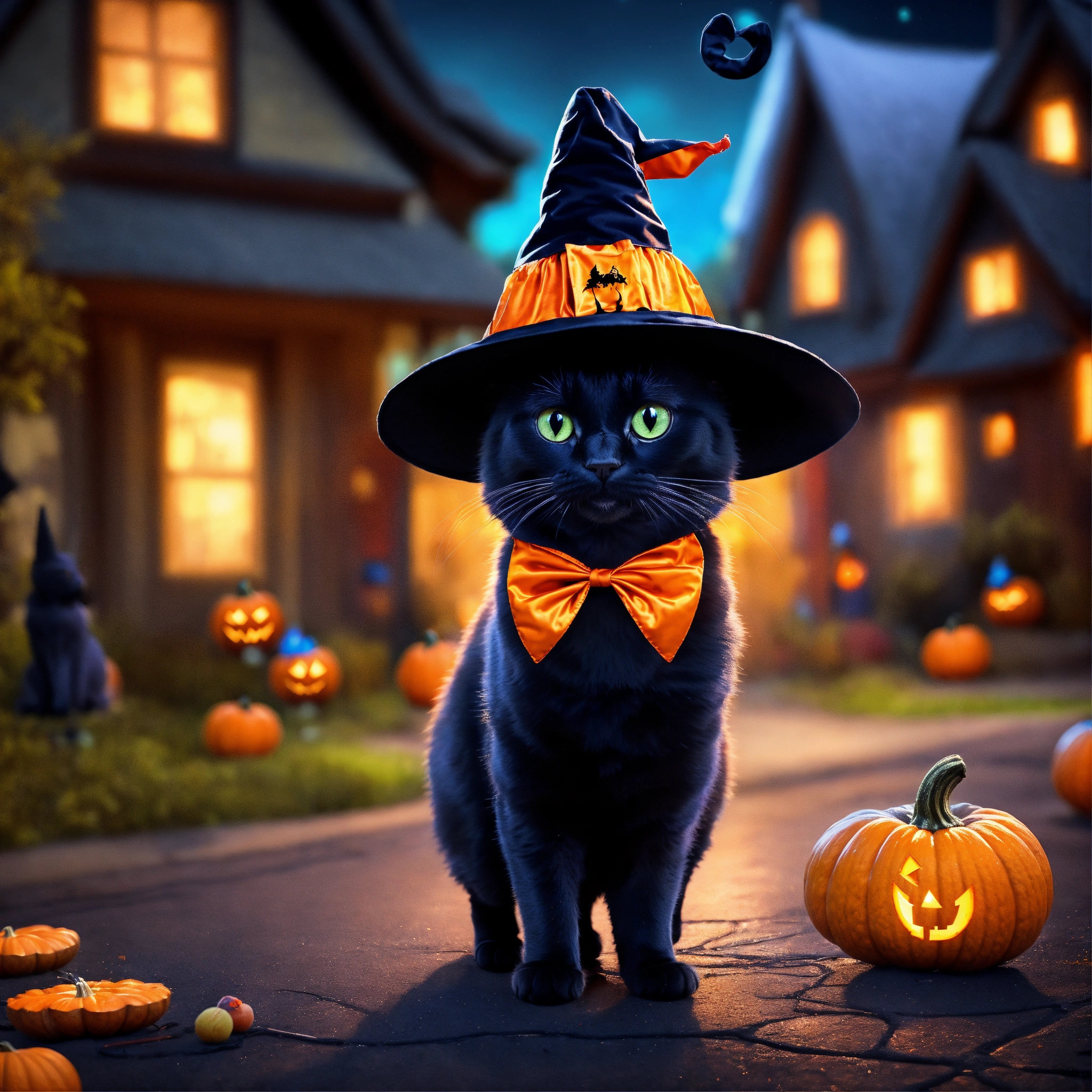 Adorable black cat with a pillowcase full of candy in its mouth, wearing a witch hat, standing out in the middle of a dark road, sorrounded by pumpkins, houses, and halloween decorations, 4k
