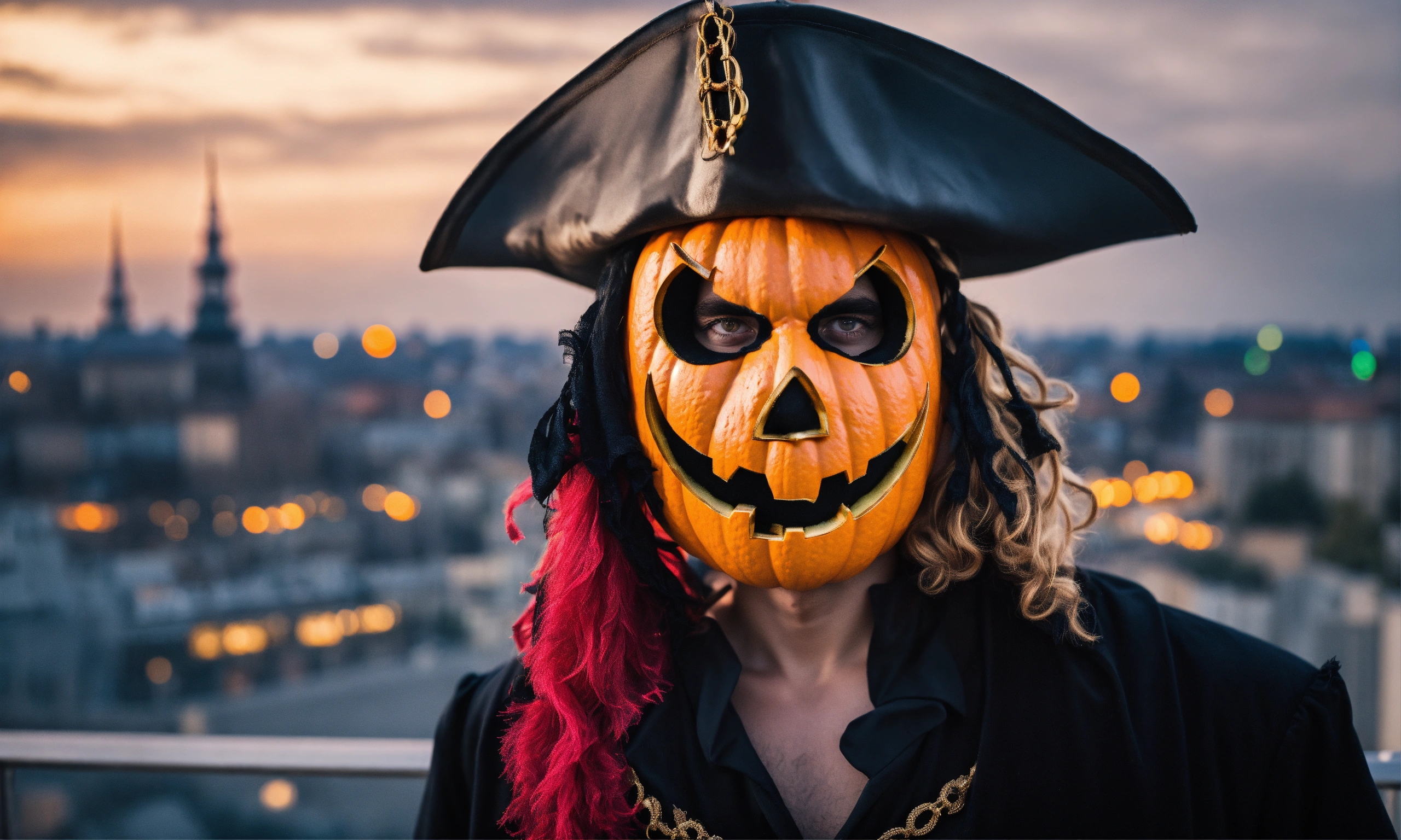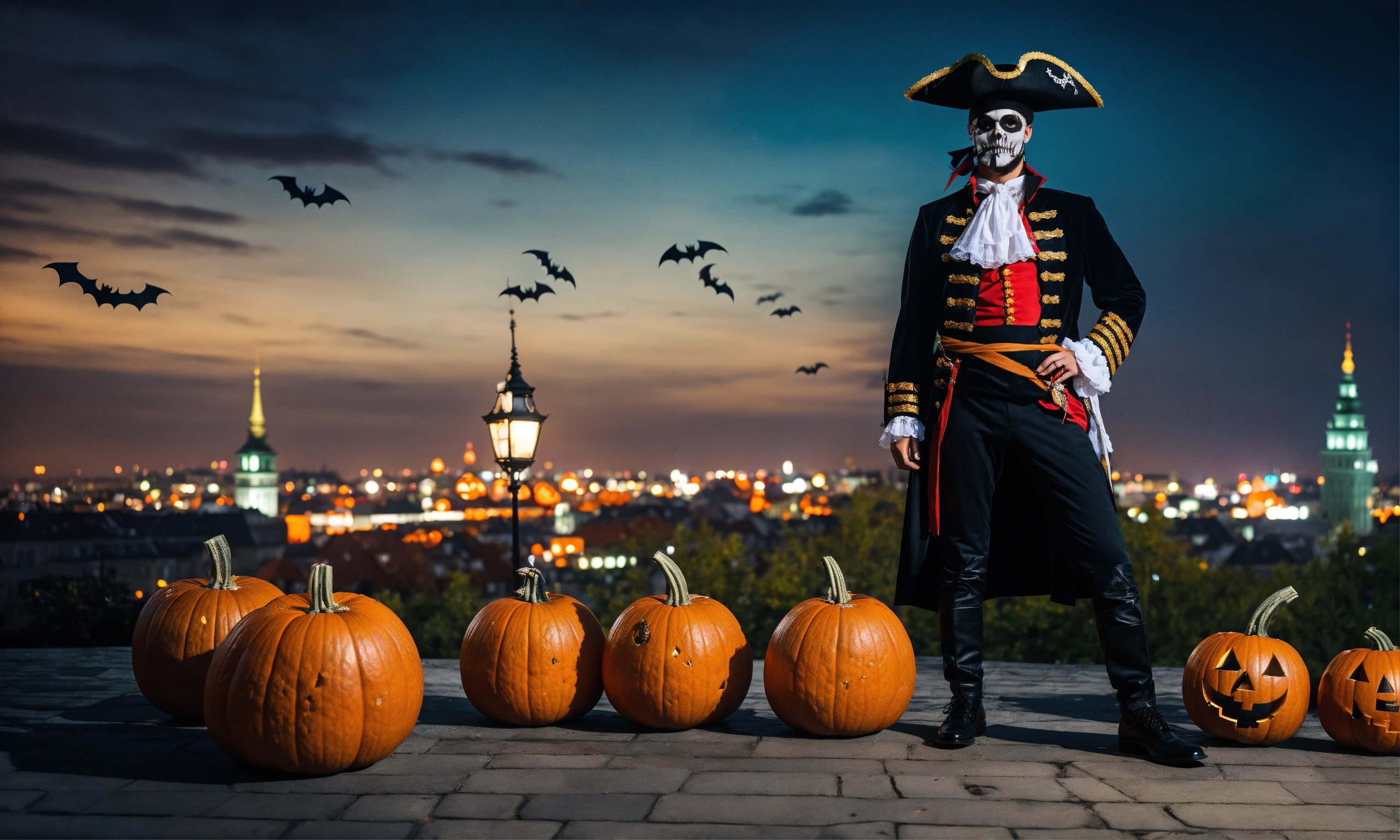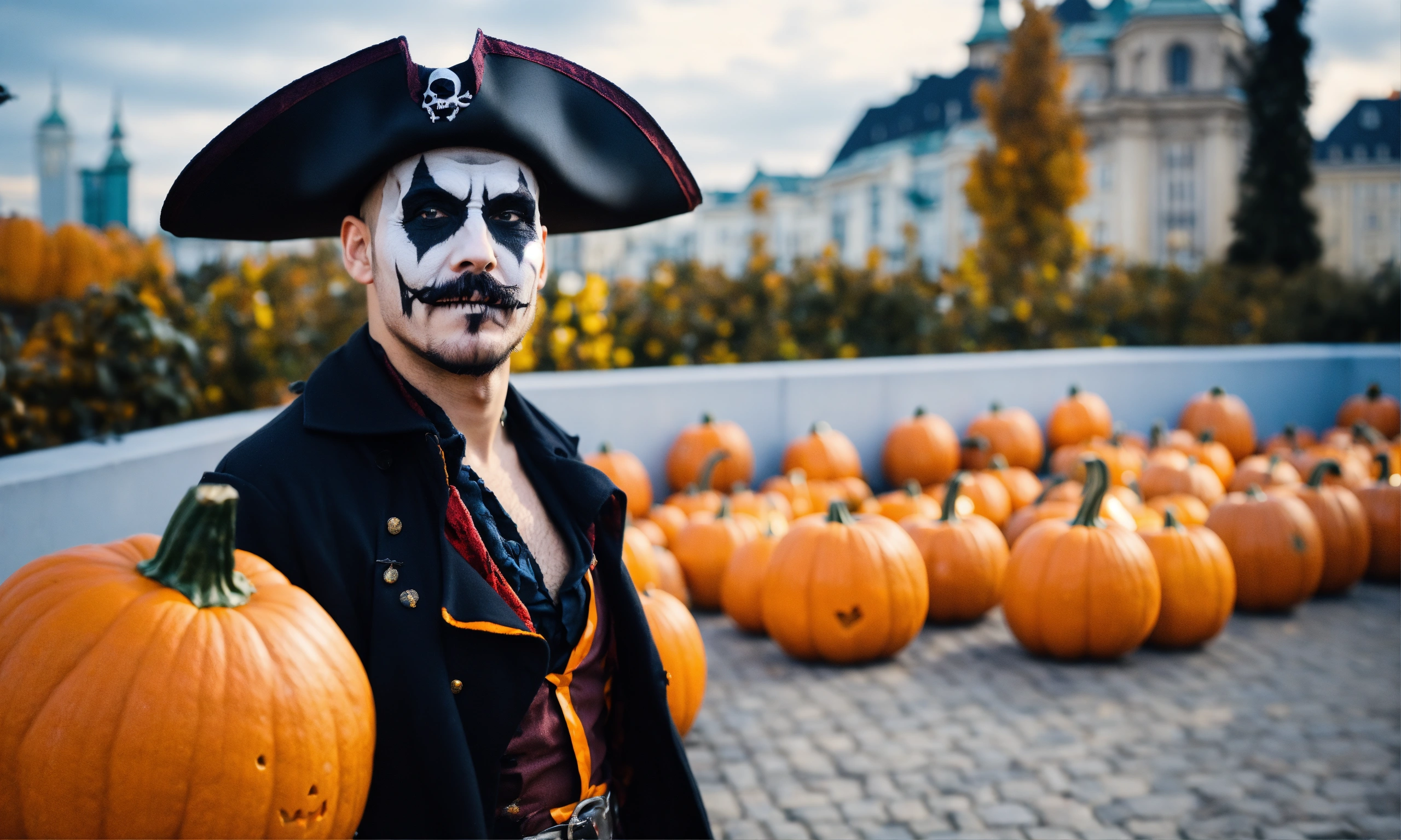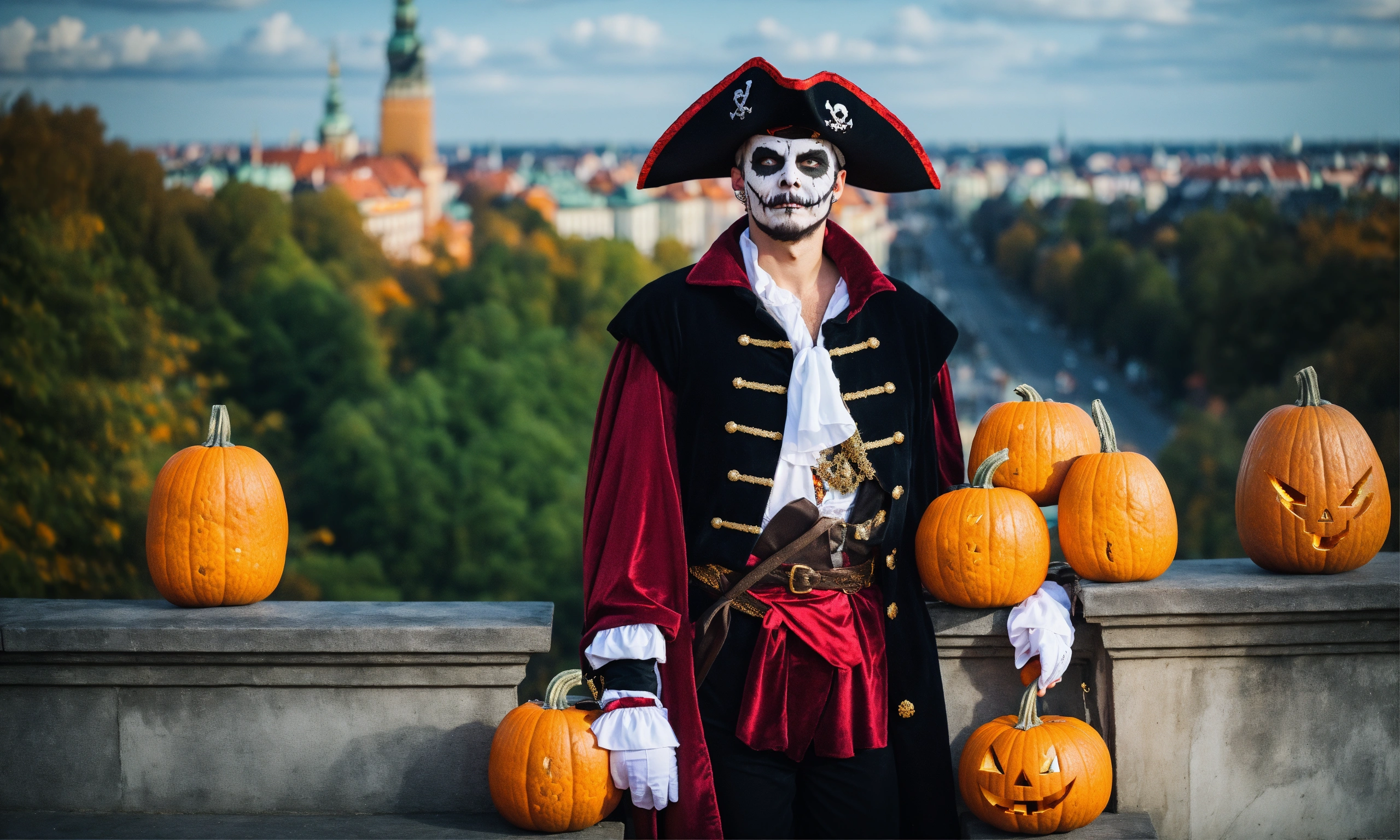 Halloween style, warsaw, poland. cute man dressed in halloween costume at the top of the riviera looking at the camera at half height, focus on the face, halloween style, pumpkins, evil pirate costume
