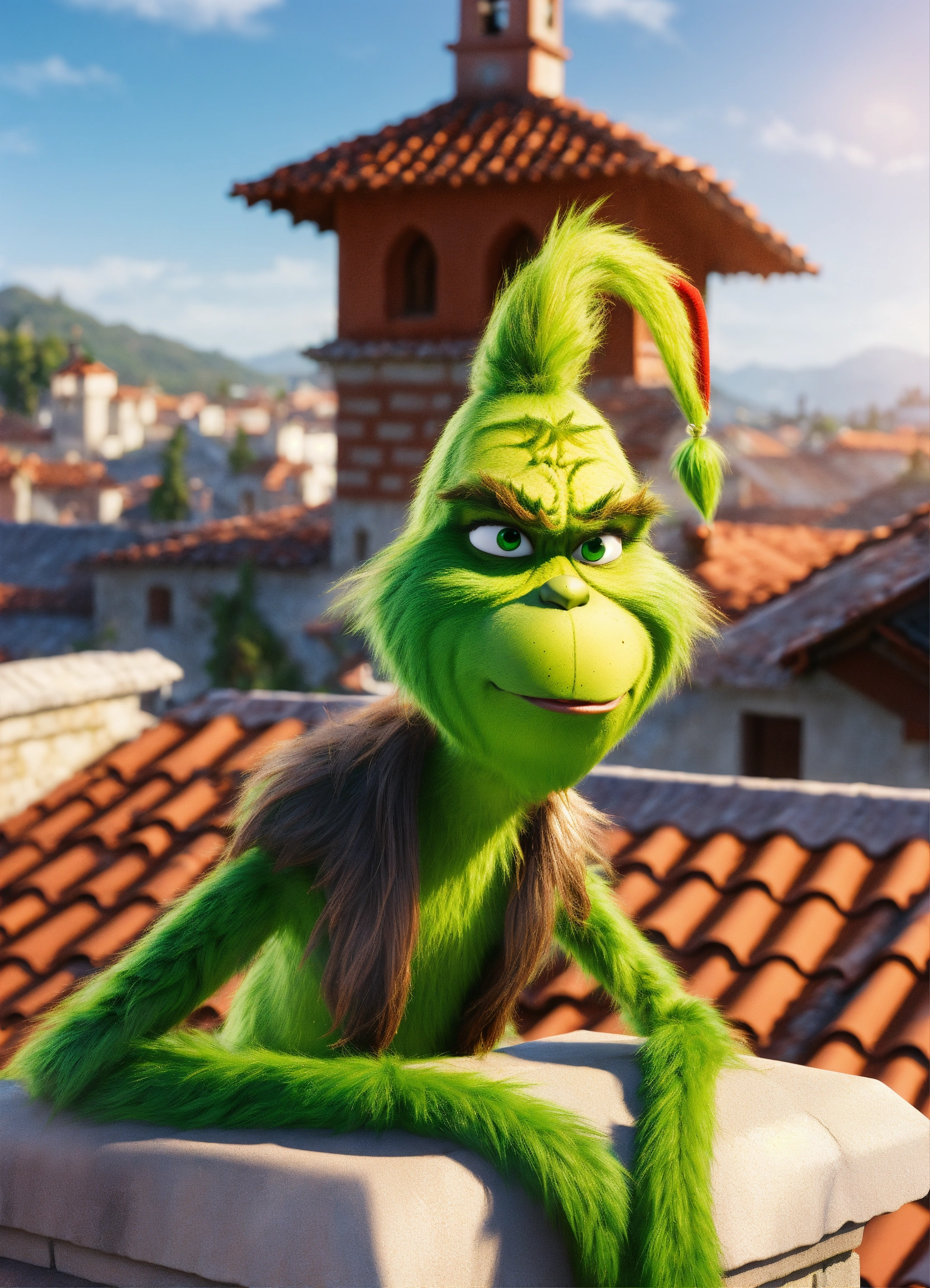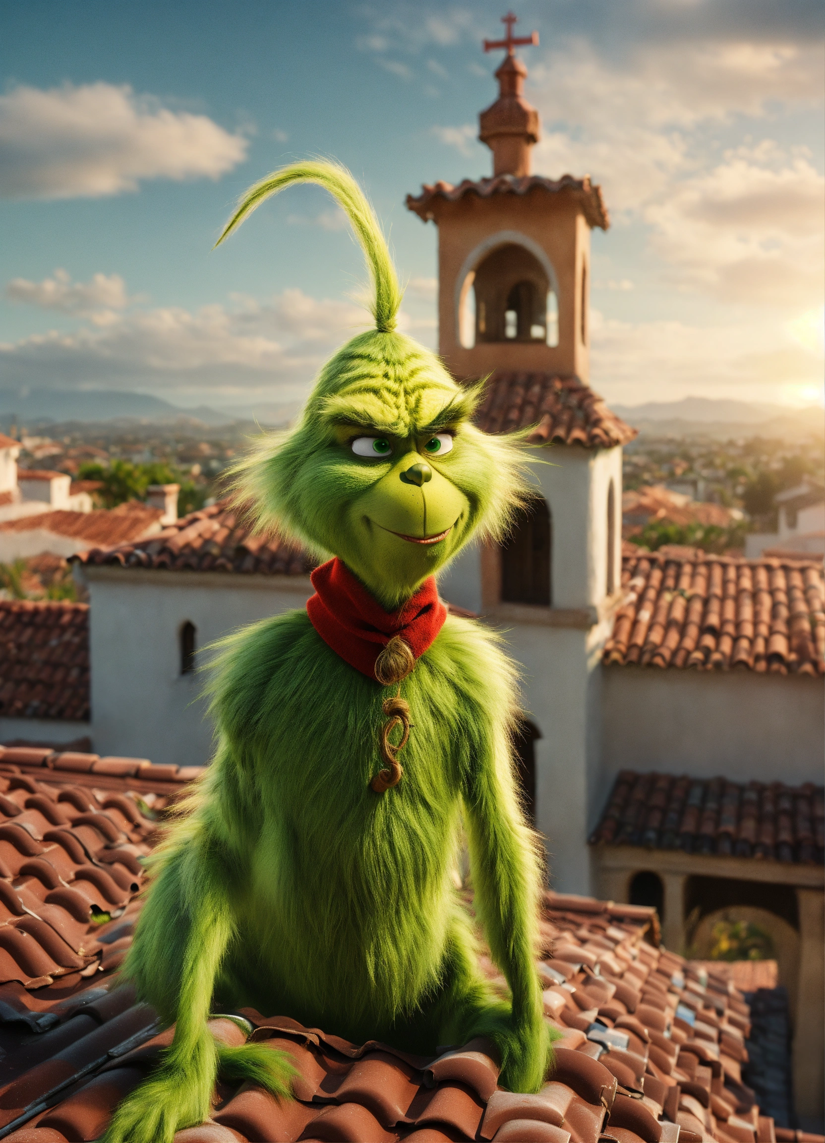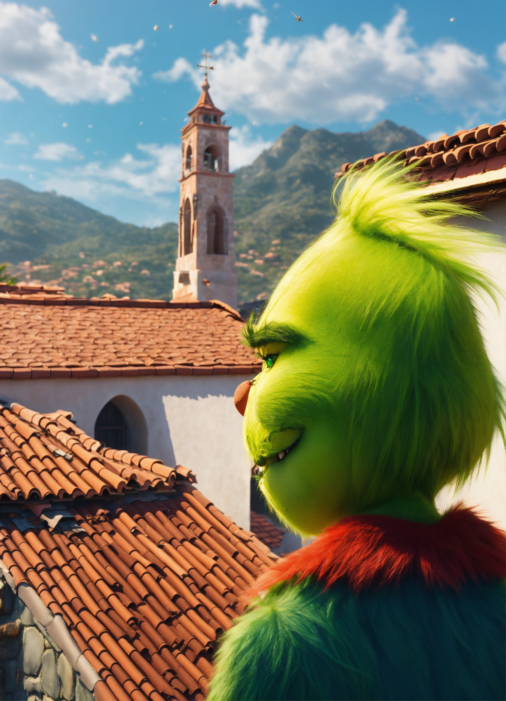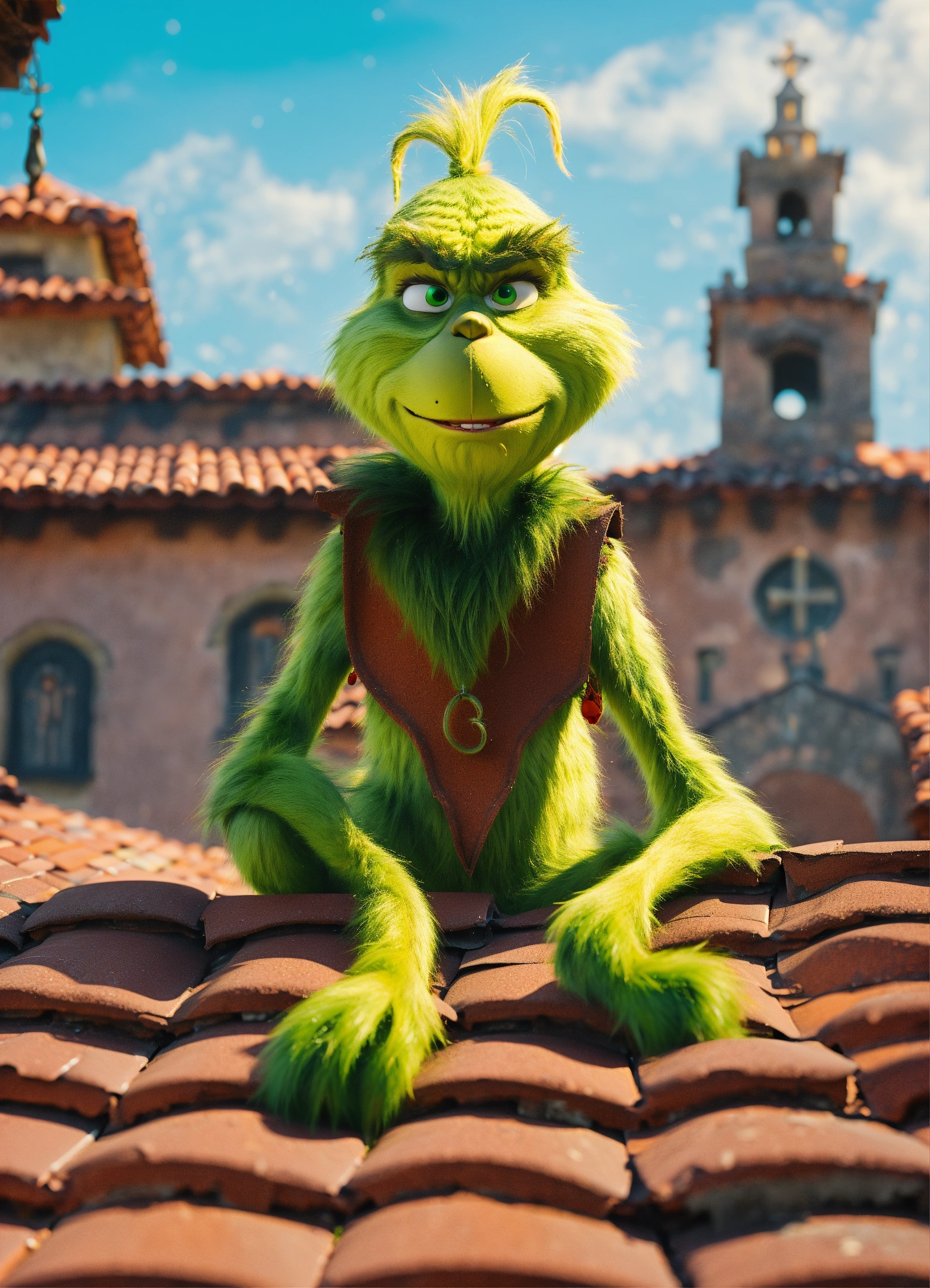 The grinch standing on roof tiles of a spanish mission, closeup of face, belltower in the background, detailed scene, stunning details, anime, detailed environment, ray tracing, 8k