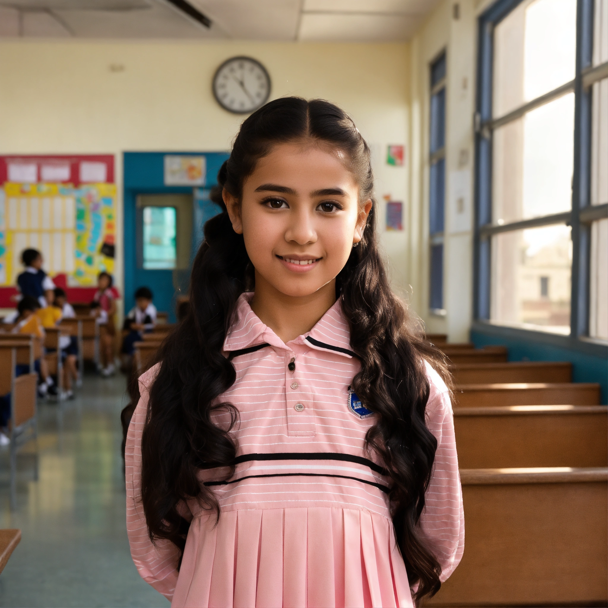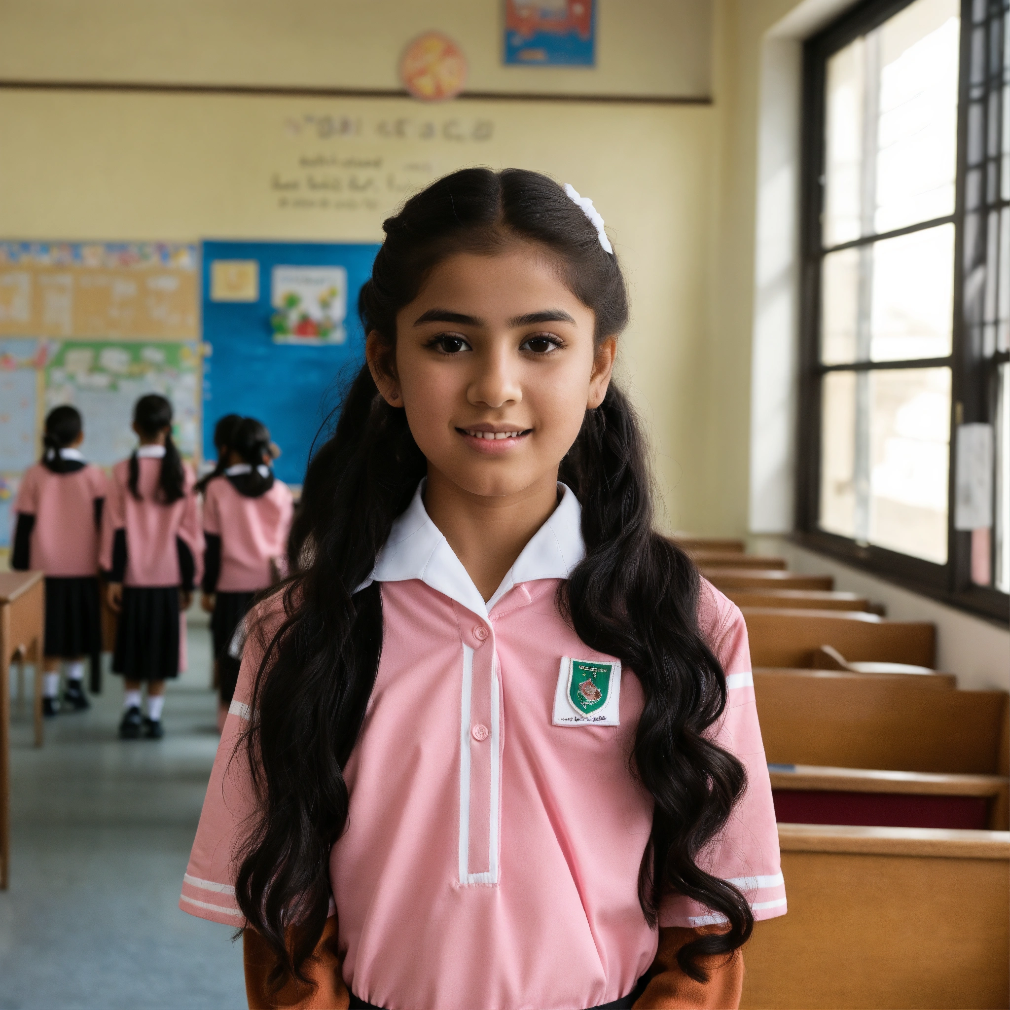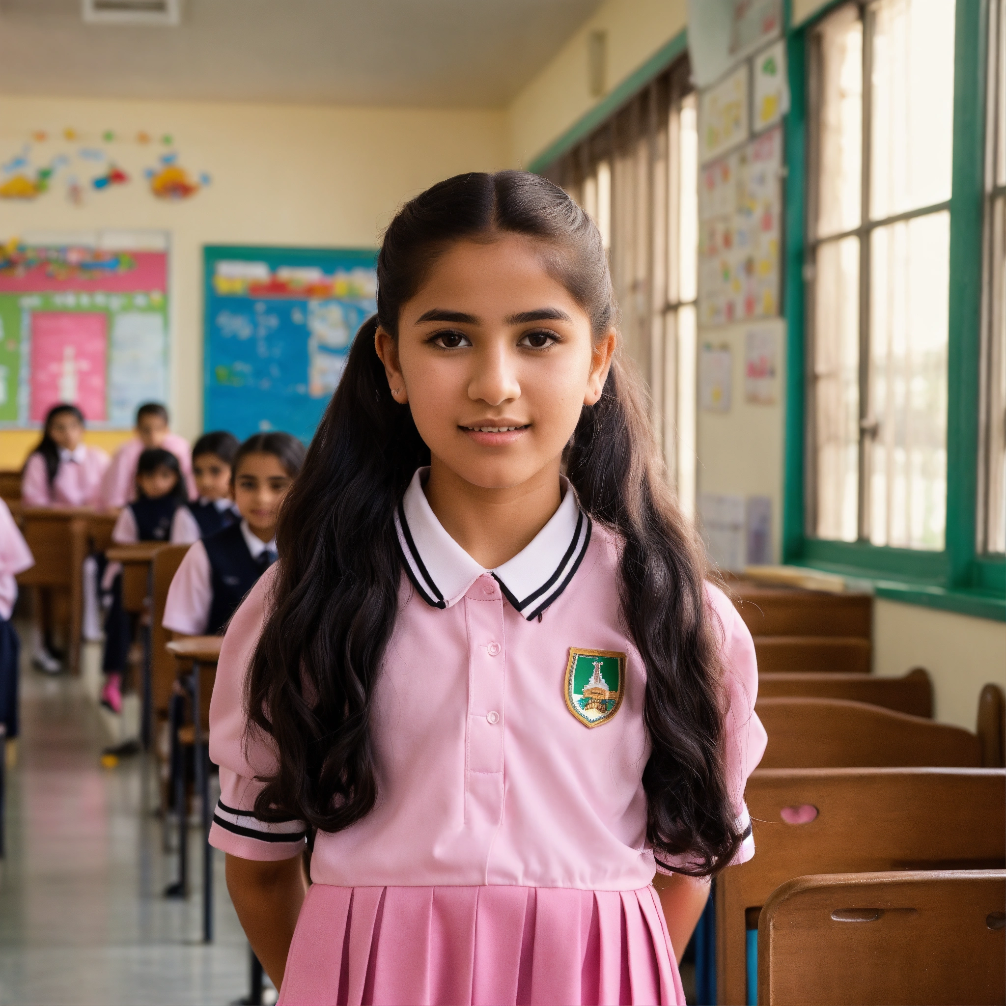 A student from the state of kuwait in the primary stage appears in a school photo in which she wears a school uniform consisting of a long-sleeved, light pink shirt with white stripes and a light pink dress. she has beautiful features, light skin, black eyes, and black hair with a ponytail. she wears black school shoes and white socks.