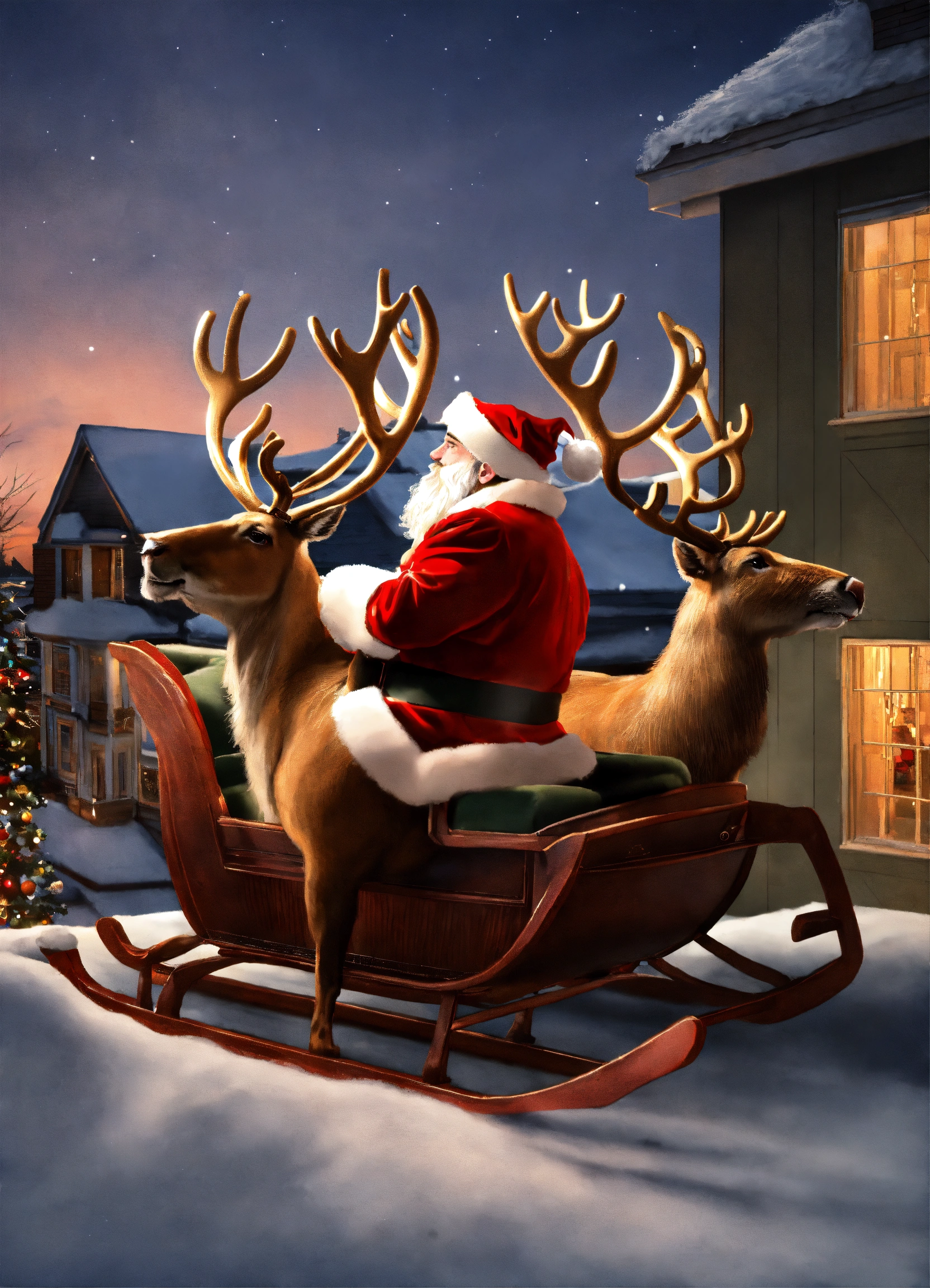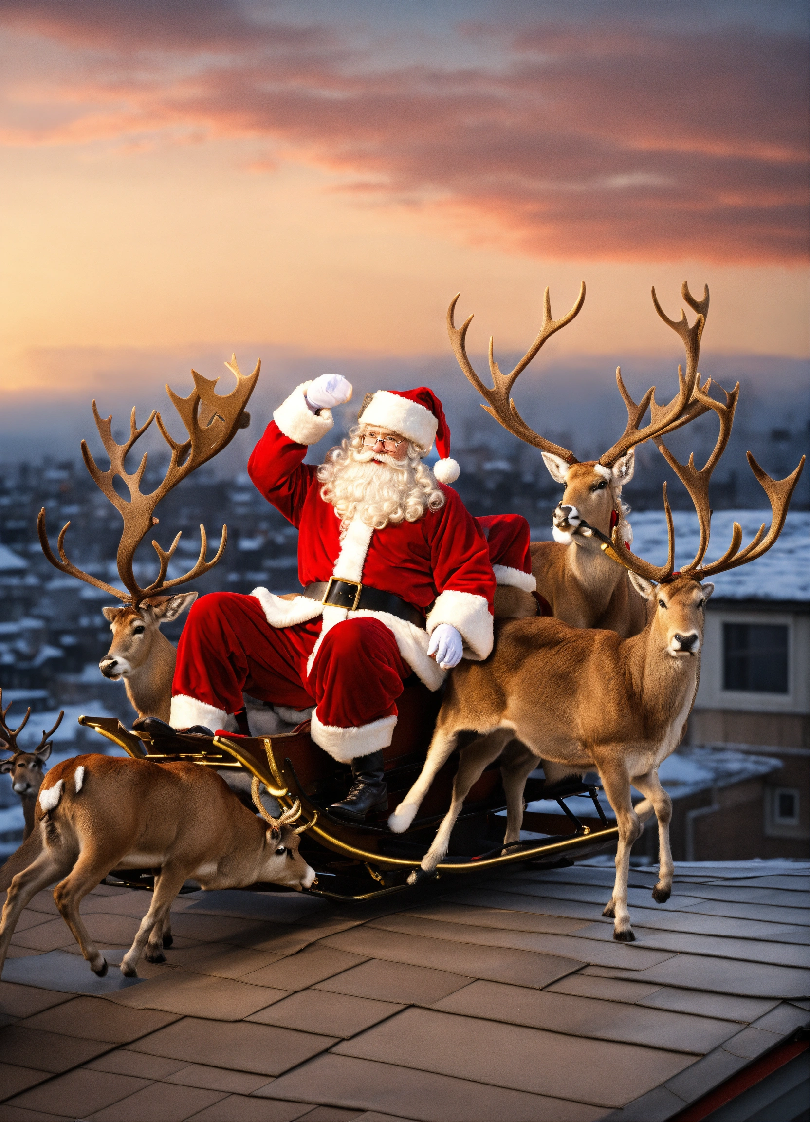 A realistic santa in his sleigh eight reindeer pulling it landing on a rooftop perfect clarity photorealistic high definition