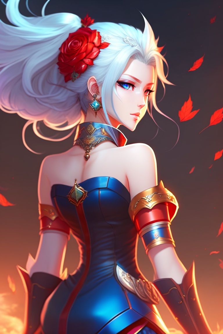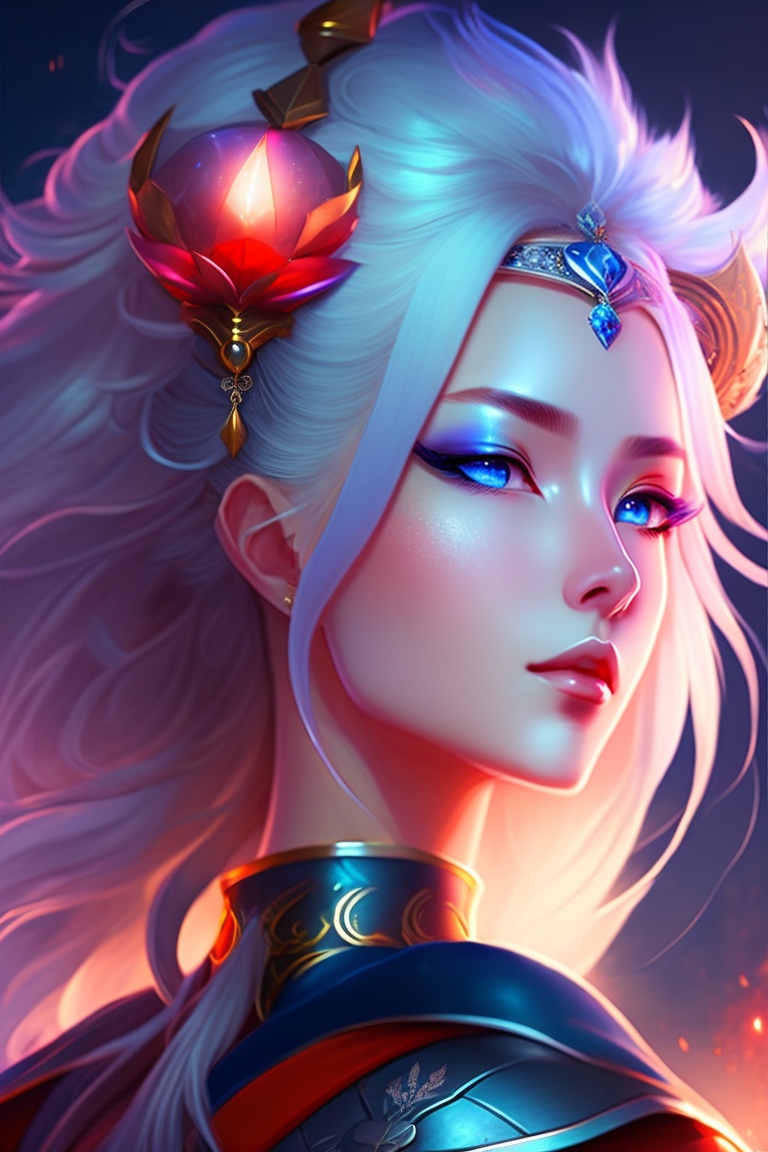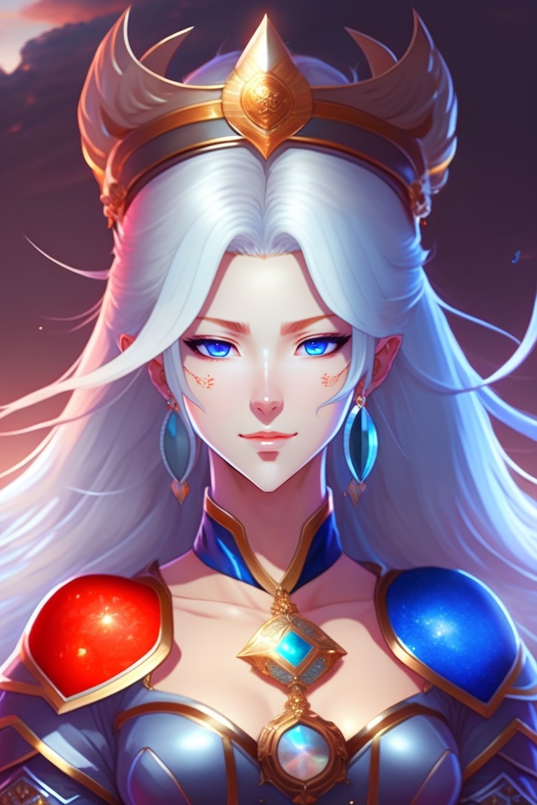 One anime donghua btth character queen medusa, with white hair, time of sunset, red moon on here head, blue eyes, looking around at viewer