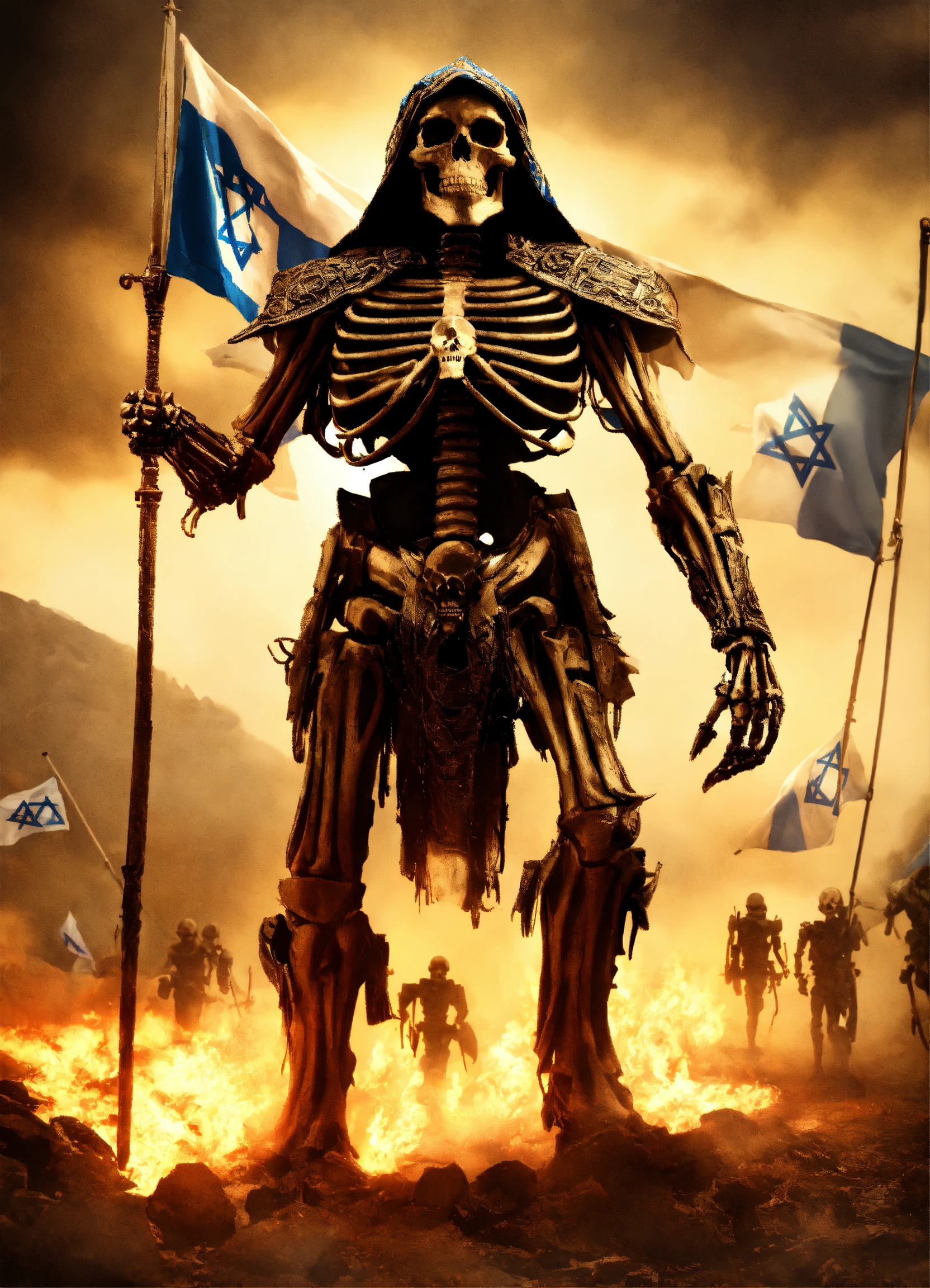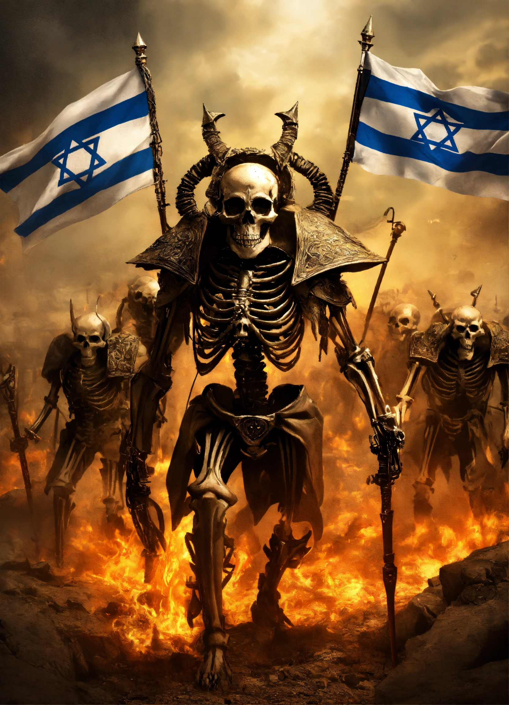 Evil demonic israelian monster demon skeleton army carrying israeli flags, revelations and armageddon, evil israel extremely ominous and frightening, insidious evil jews, star of david, synagogue of satan, highly detailed and realistic, inspired by apollyon