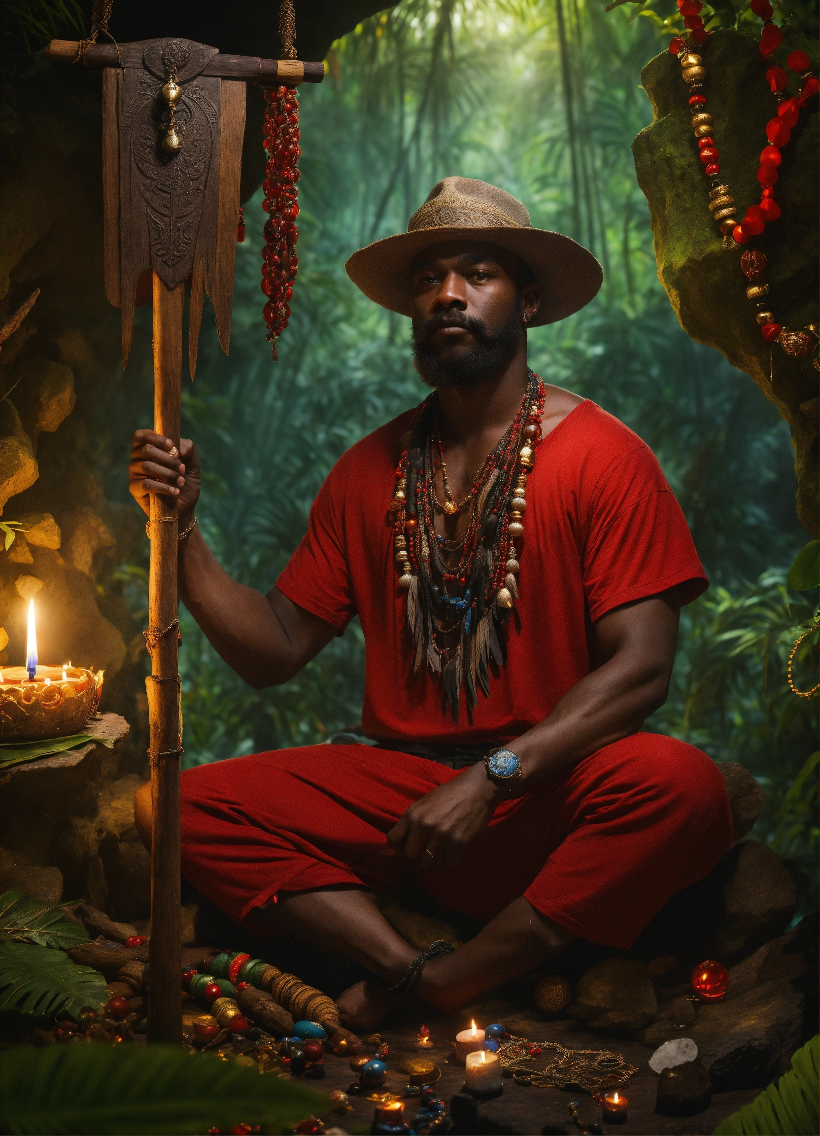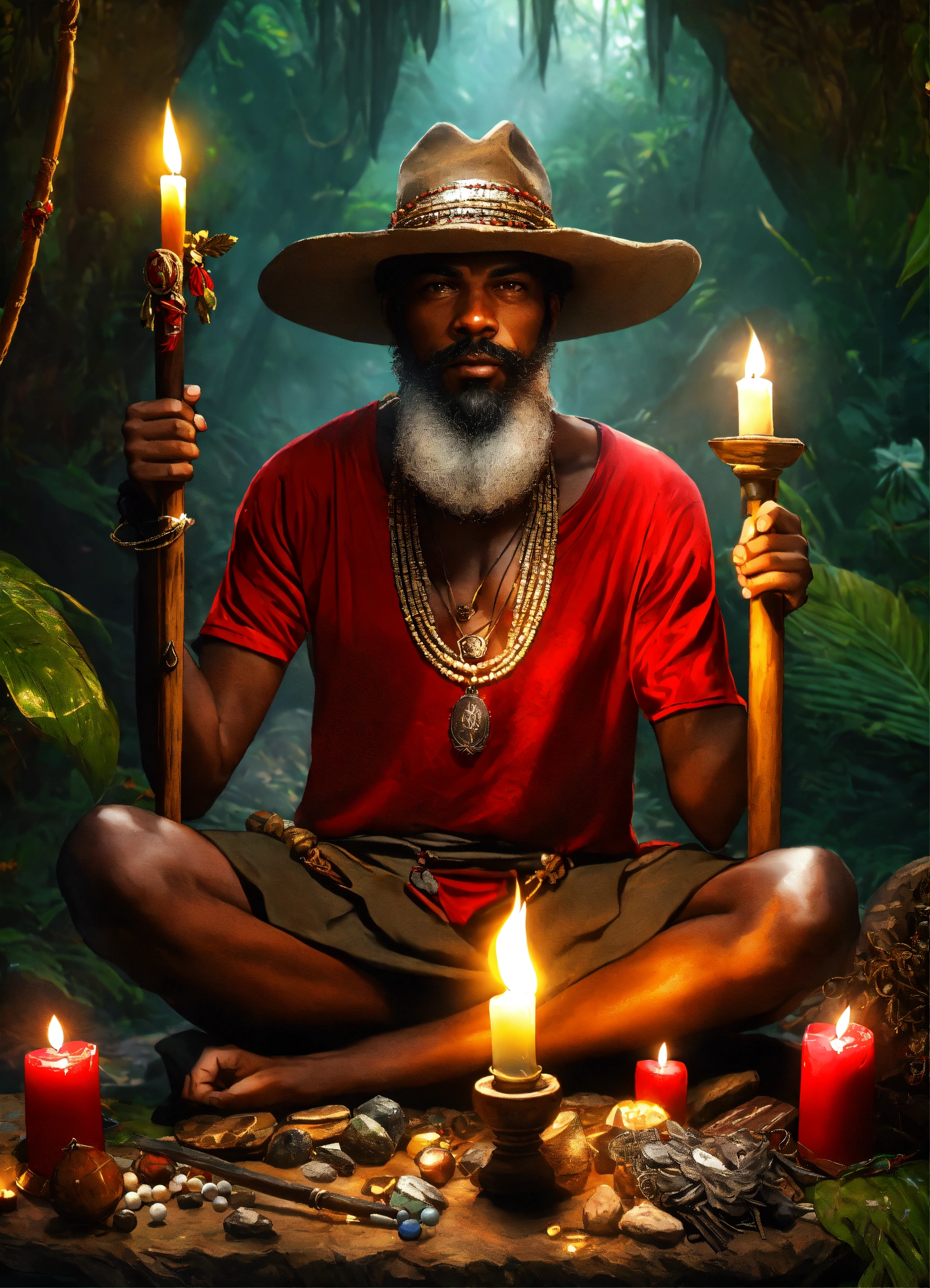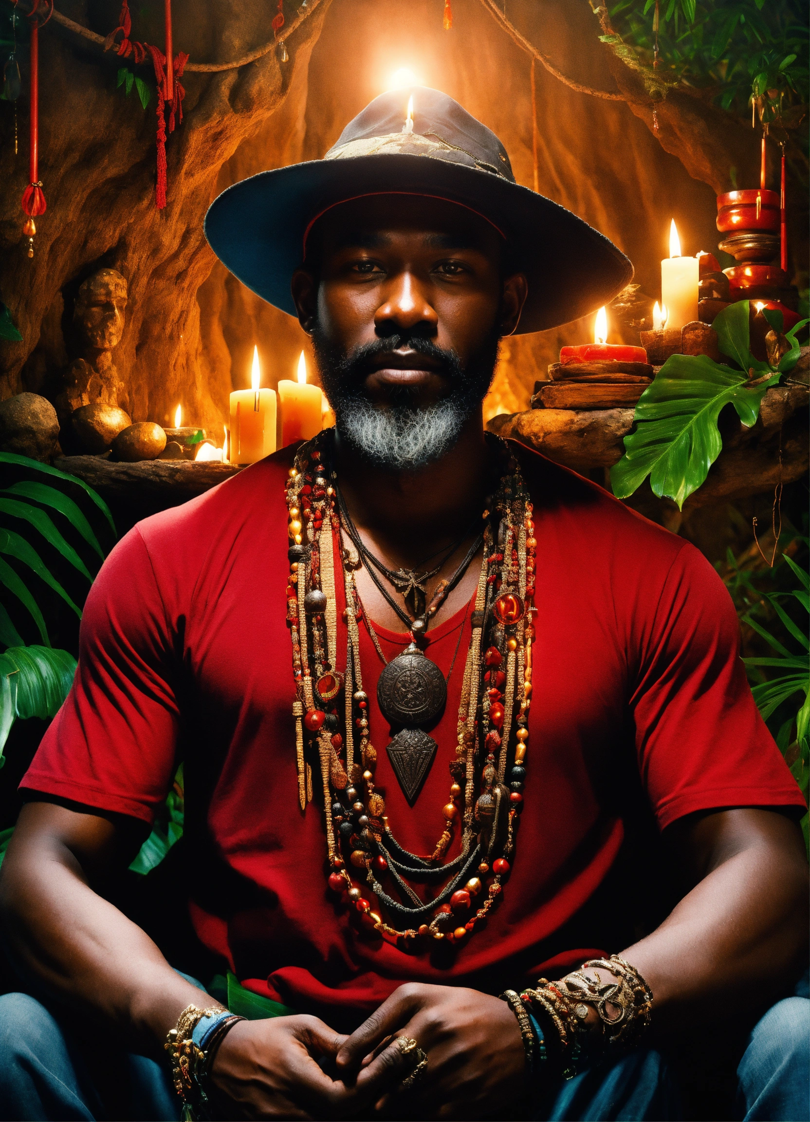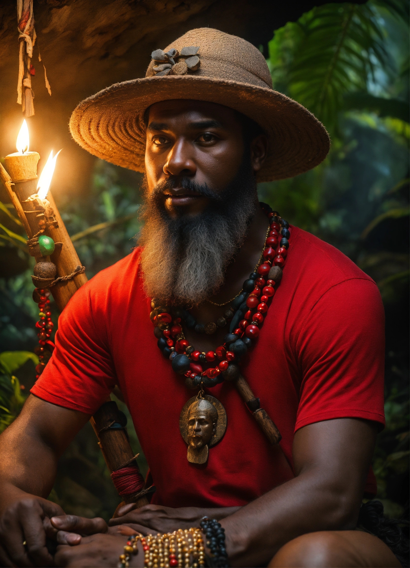 Dark-skinned black man with a half-gray beard, yarey hat, red t-shirt, bead necklaces and amulets hanging from his neck, carrying a long machete in one hand and a wooden staff in the other, sitting at his black magic altar with several candles in the background in a cave in a tropical forest. photo realistic, intricate details