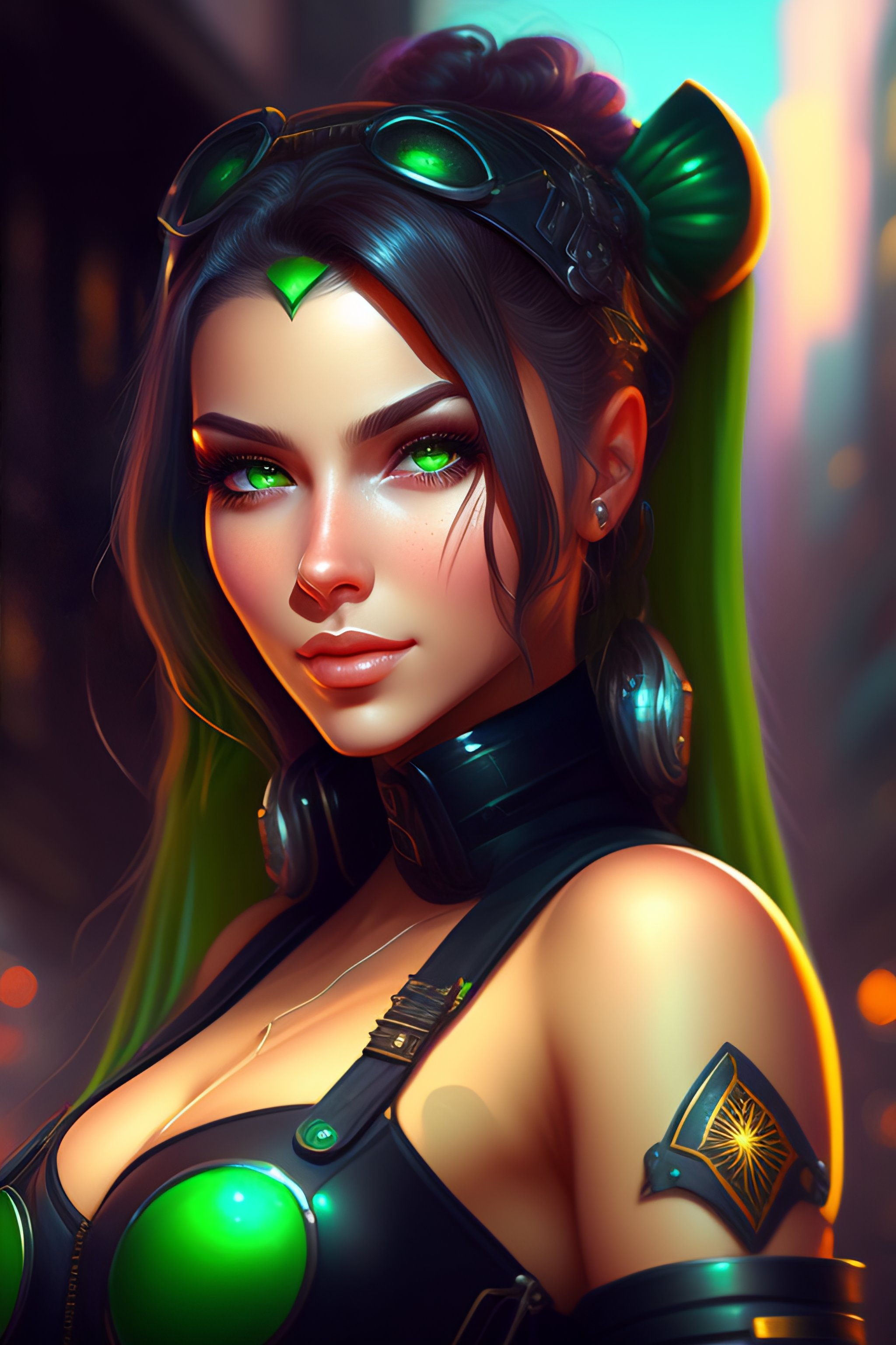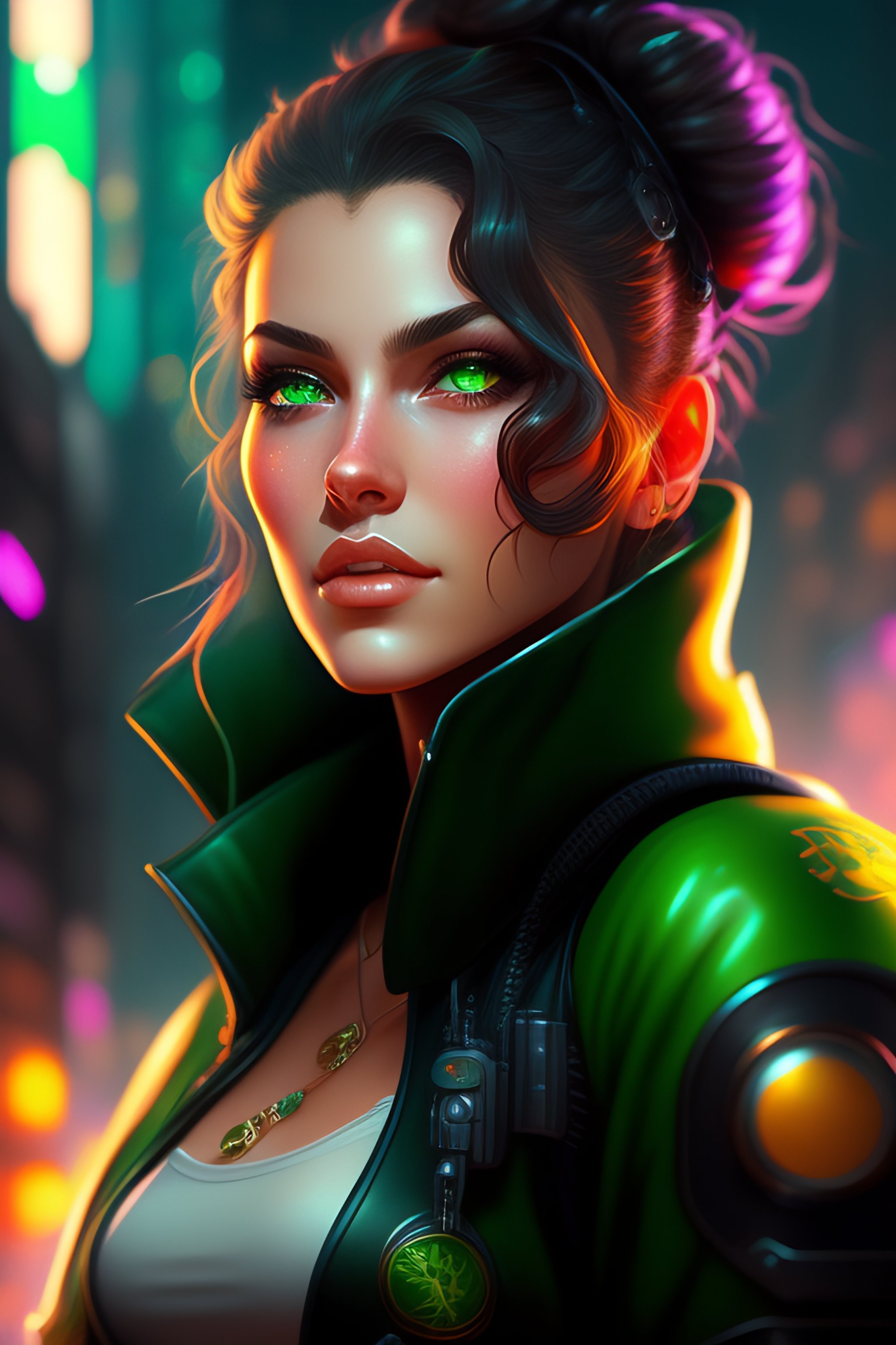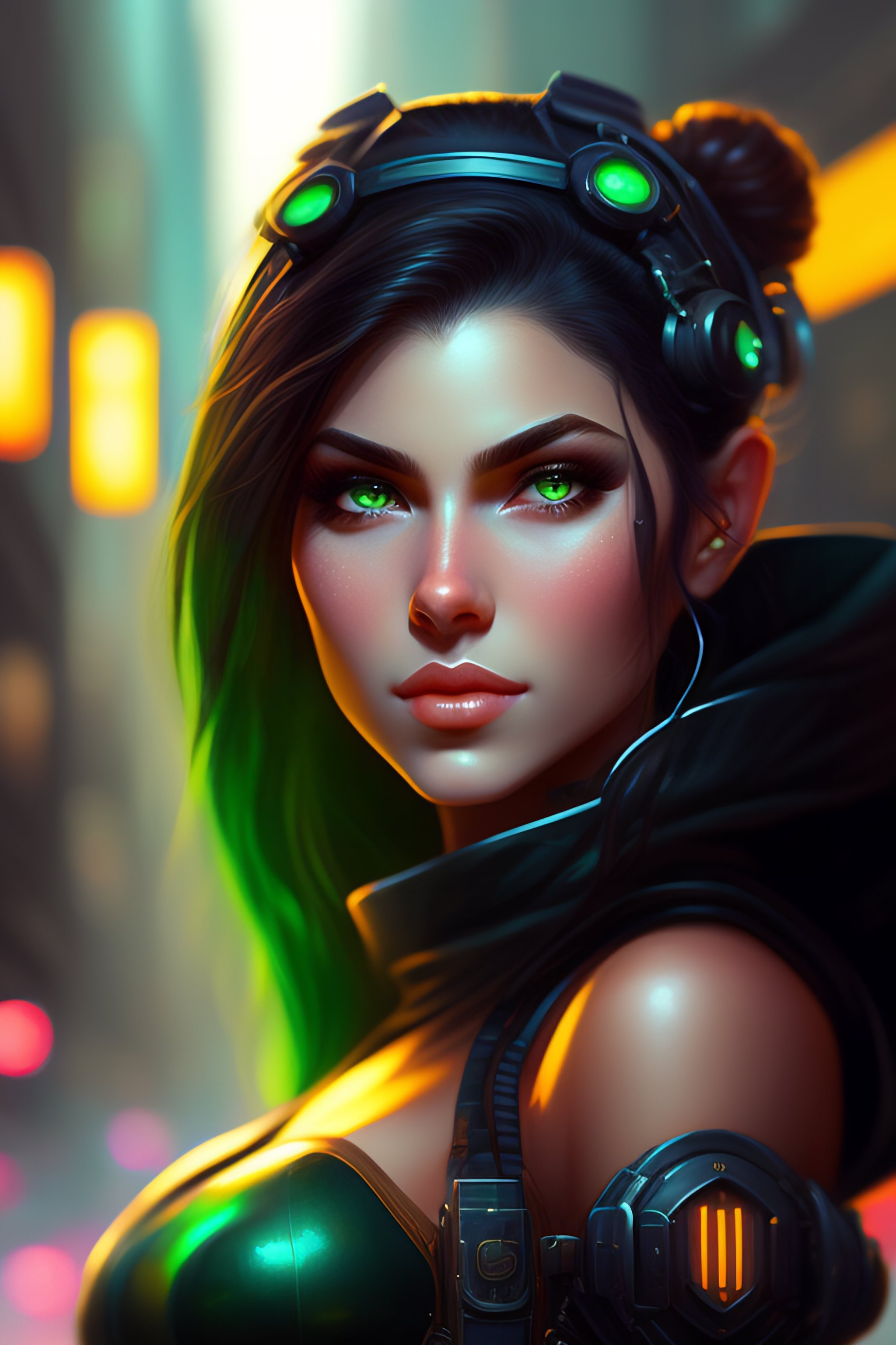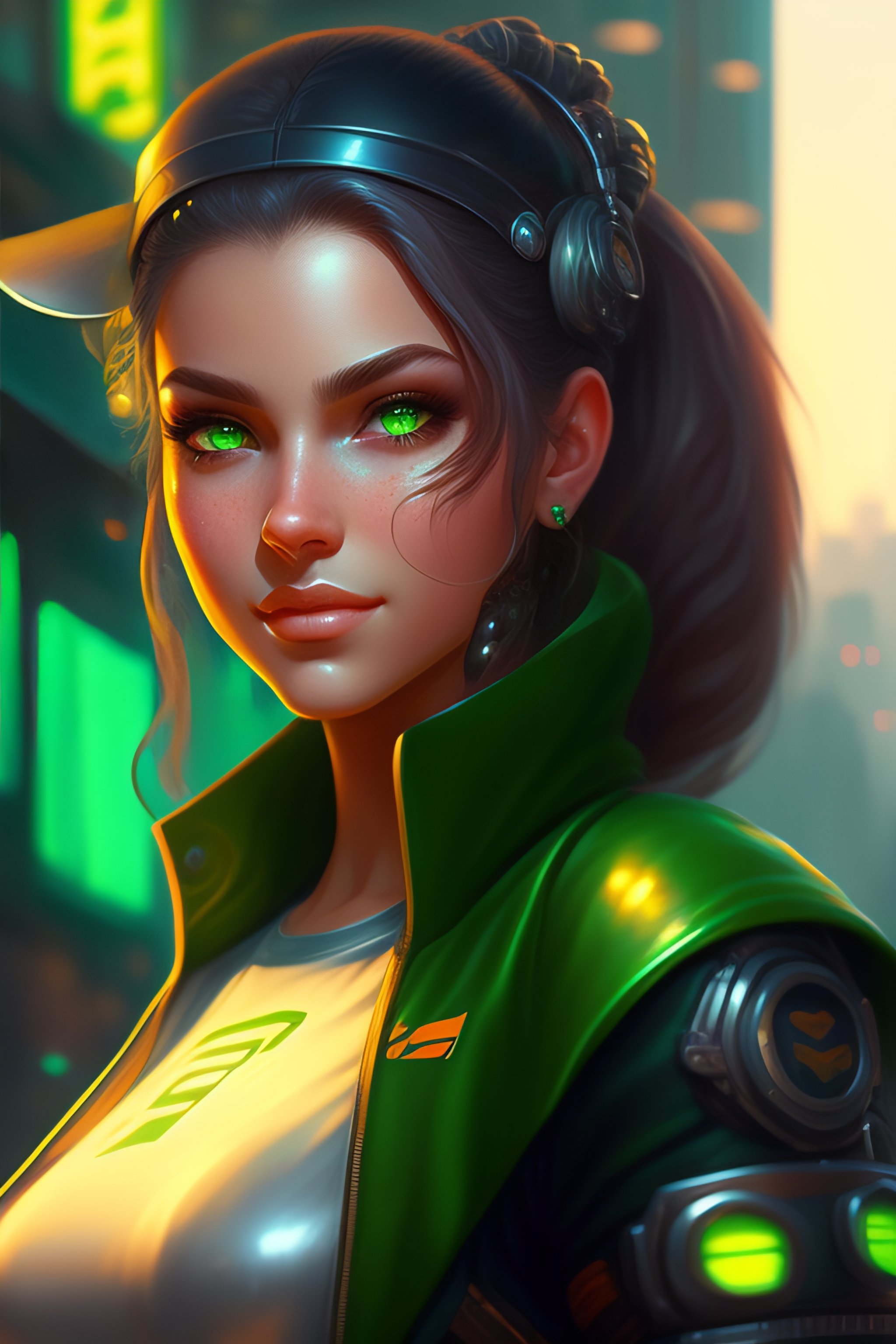 A detailed painting of a cute cyberpunk girl with green eyes, dark city background, by justin gerard and (besinski), digital art, realistic painting, trending on artstation