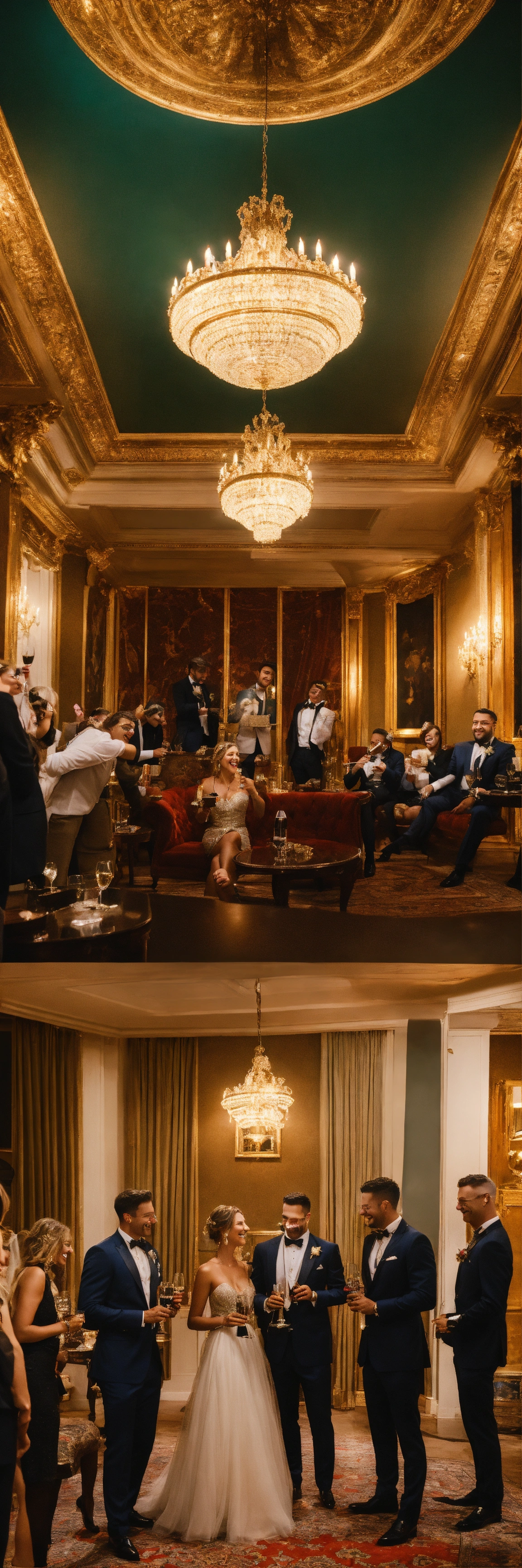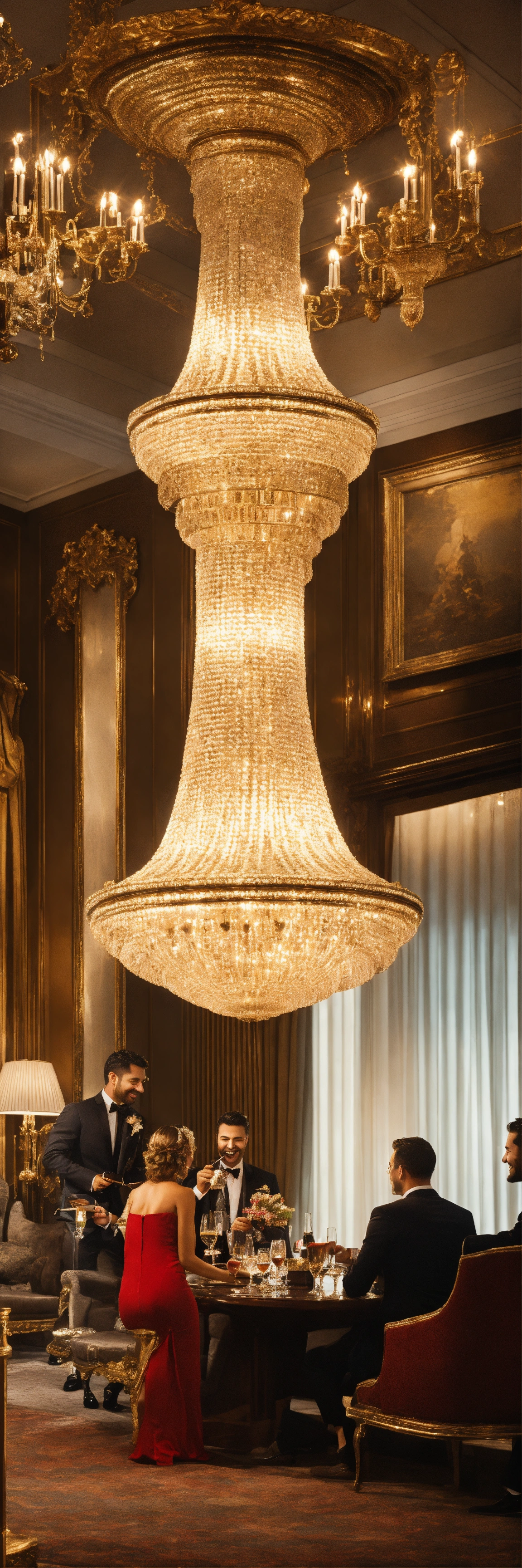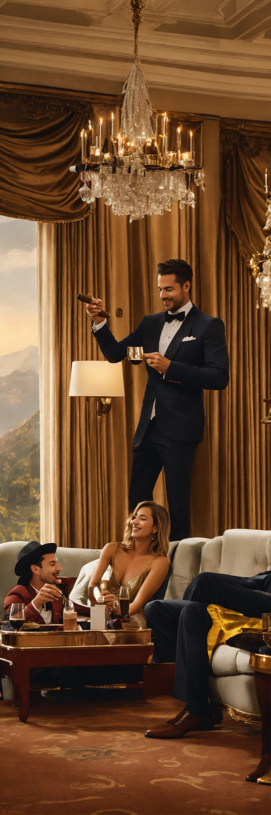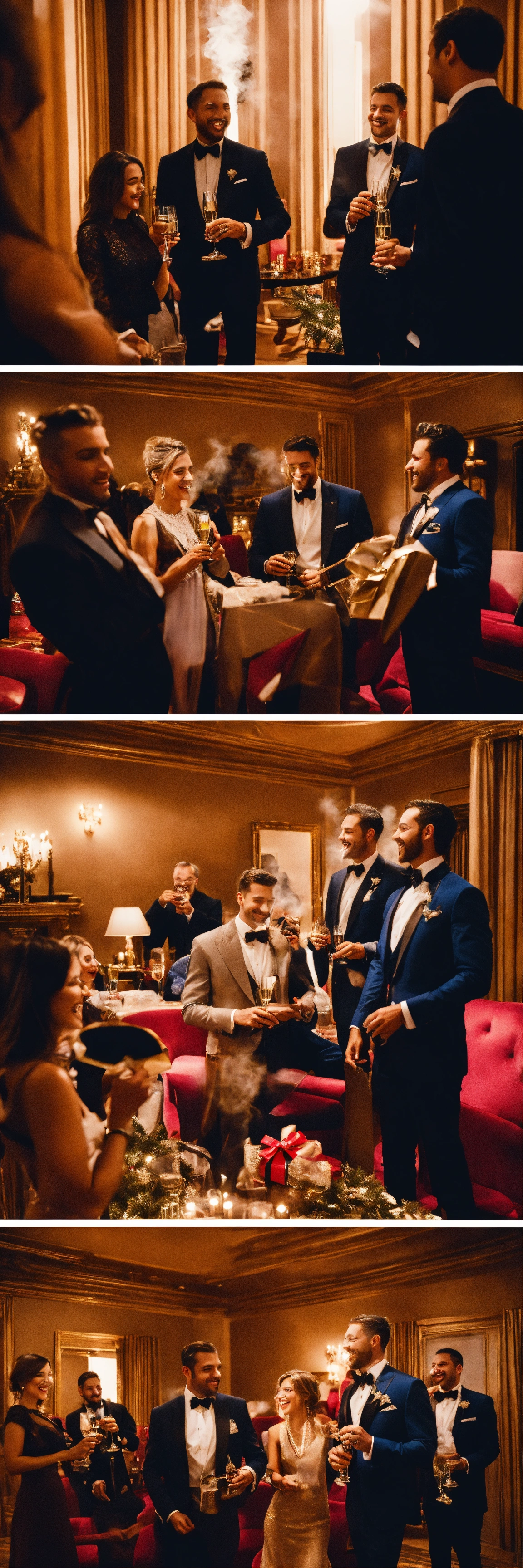 A group of friends giving each other gifts in a superb reception room they smoke cigars and drink champagne men and women are happy and well dressed