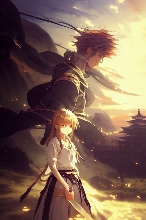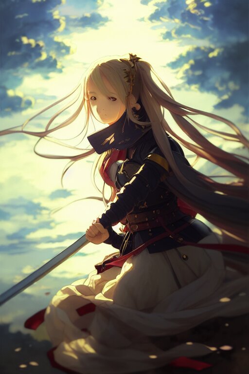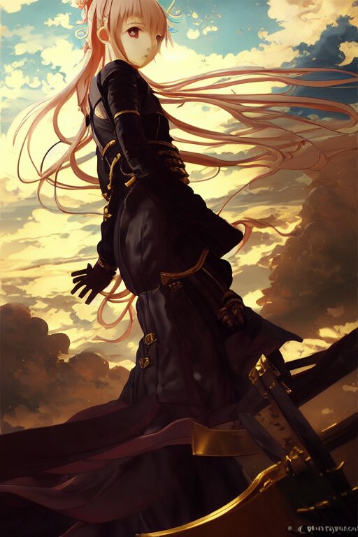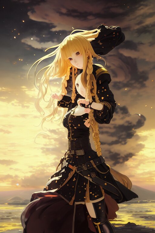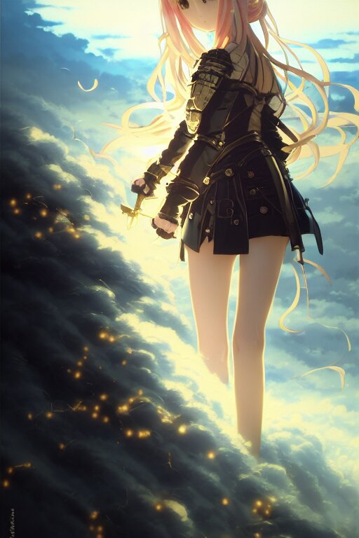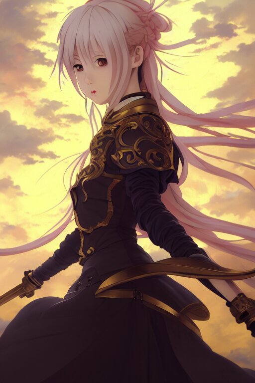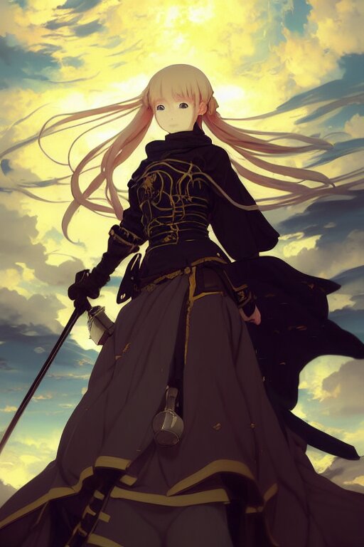 Baroque oil painting japanese light novel cover illustration anime key visual full body action shot | young girl dictator wearing black military crusader armour with long flowing blonde hair | rule of thirds golden ratio beautiful composition | lotr gapmoe kuudere moody lighting bokeh stunning highlights sharp contrast | trending pixiv fanbox | by greg rutkowski makoto shinkai takashi takeuchi studio ghibli