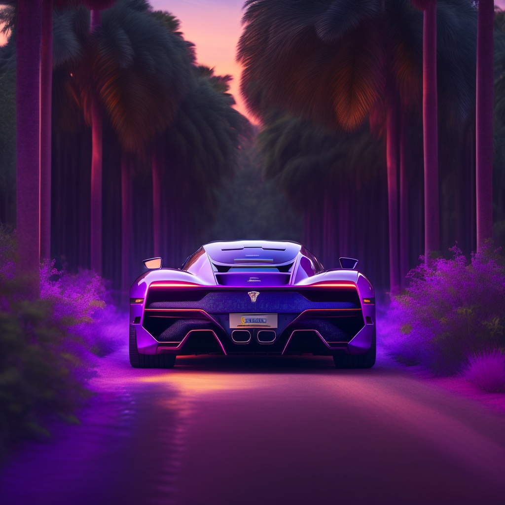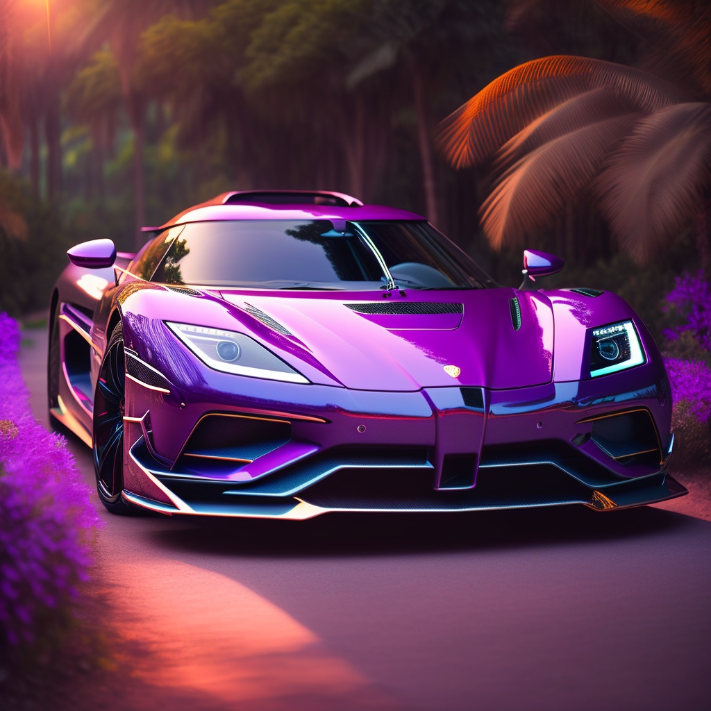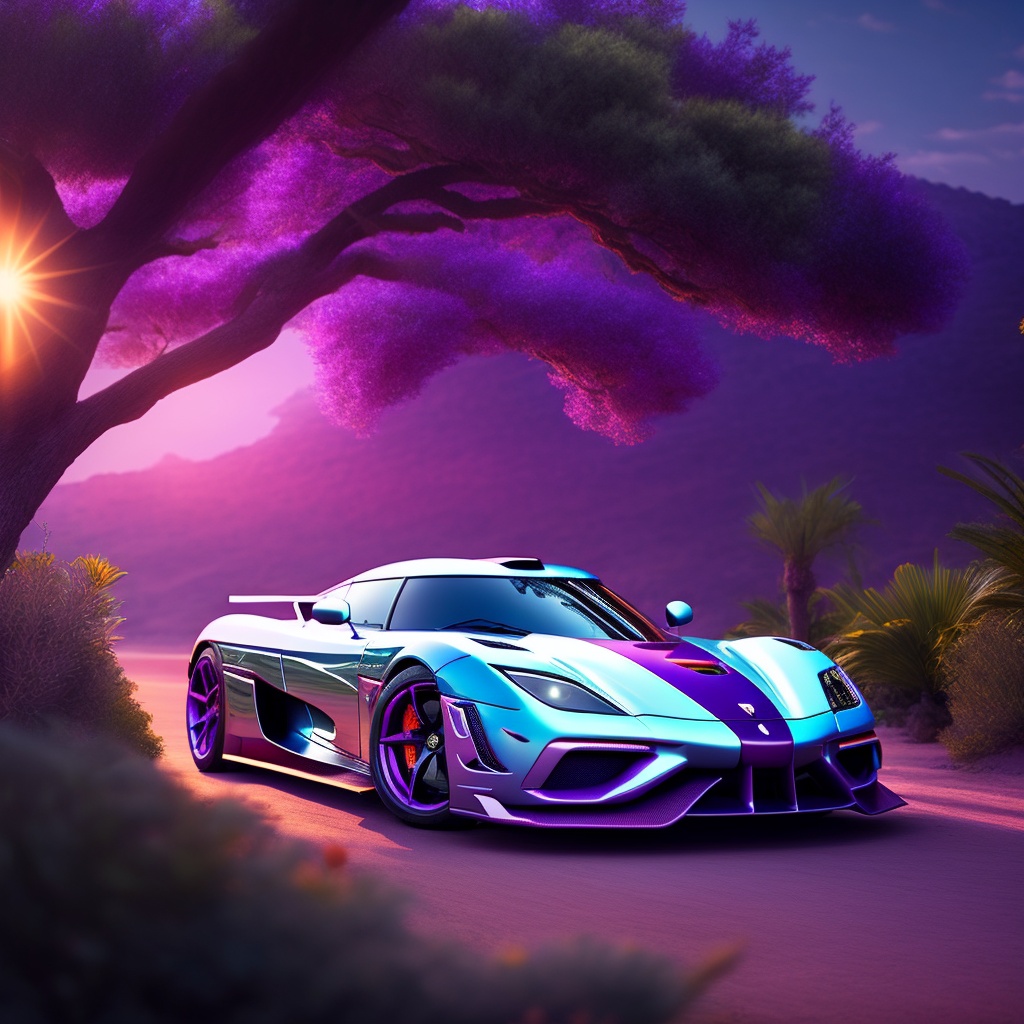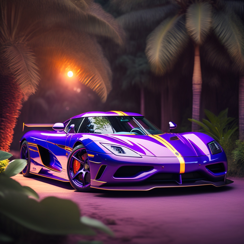 Tropical trees, tropical climate, sunshine, midnight, koenigsegg, car color violet, moonshine, ultra hd, ultra realistic, 8k, off-road, car off-road