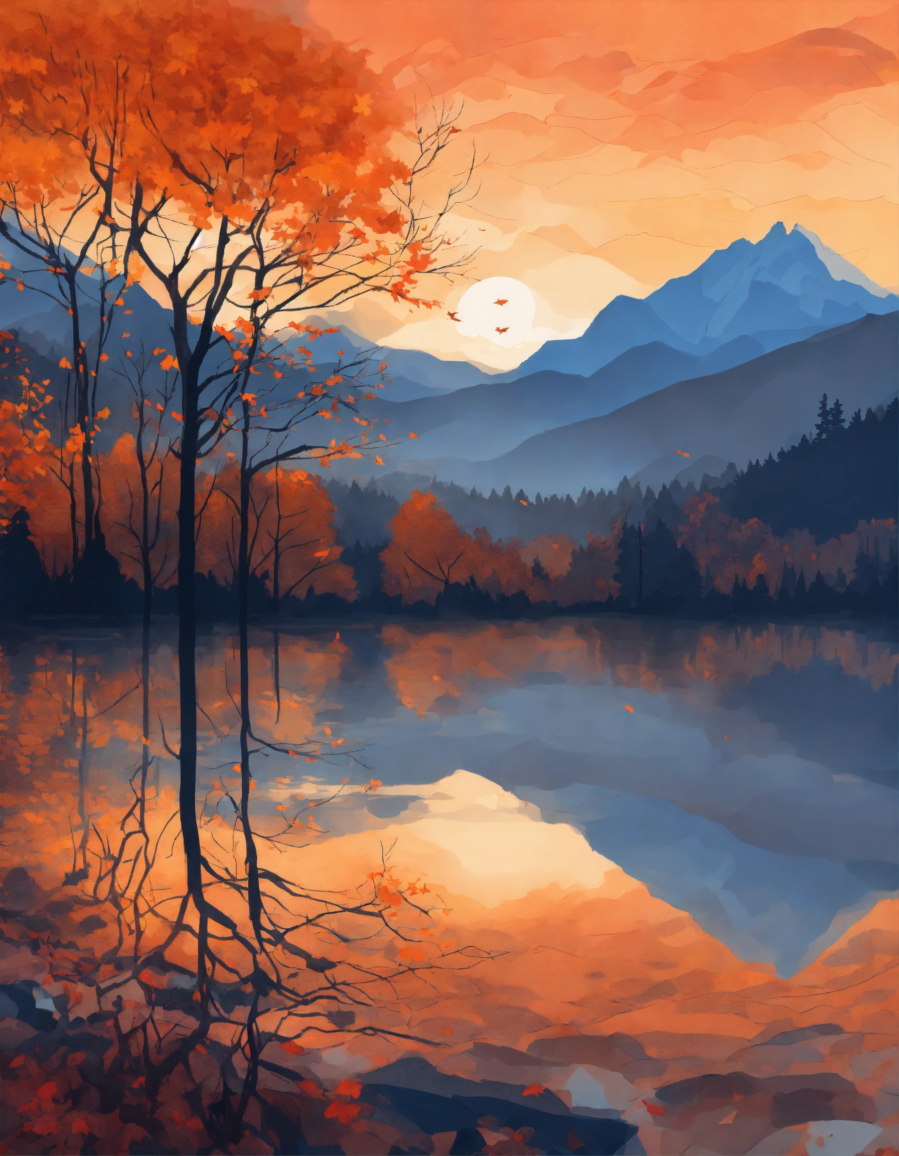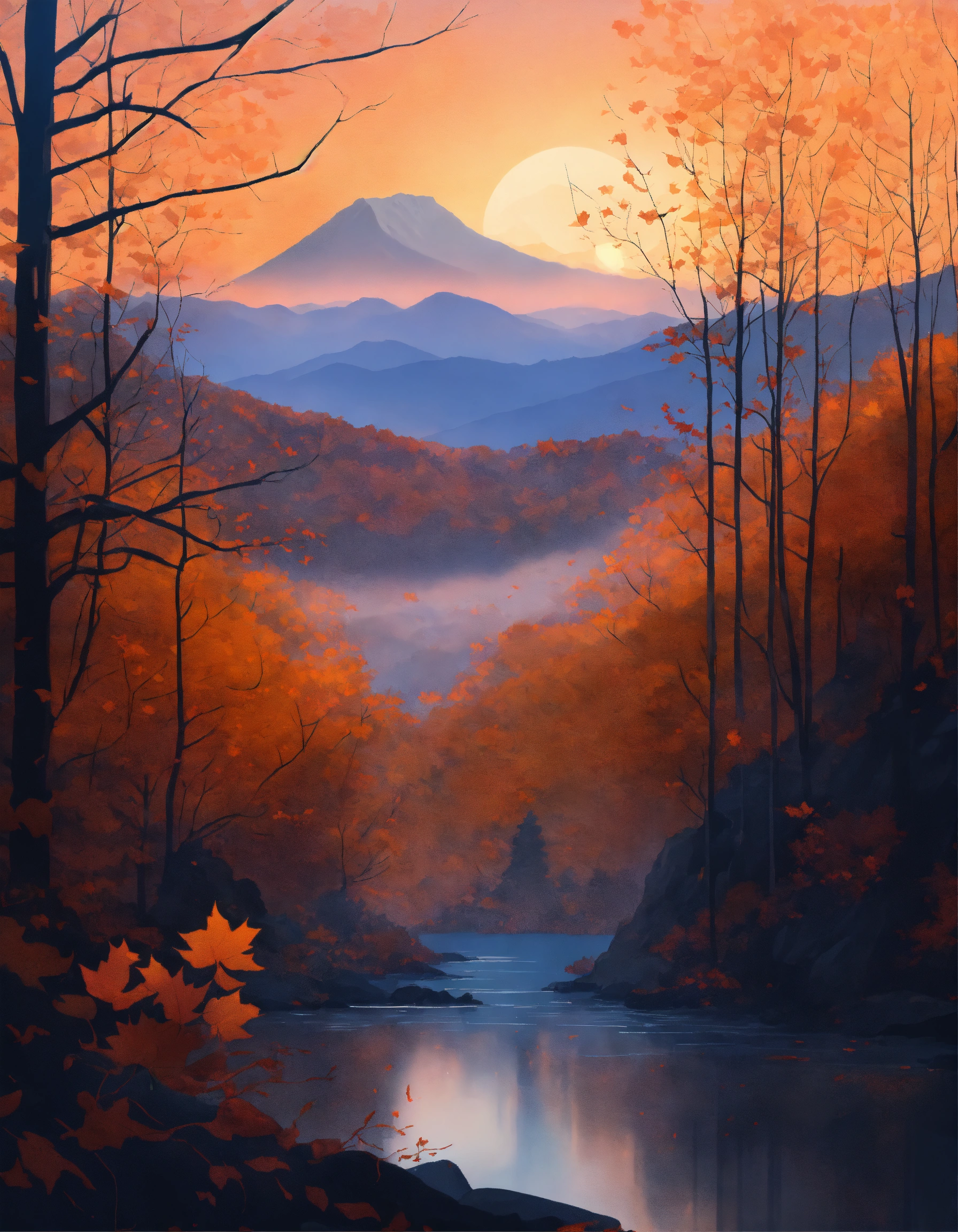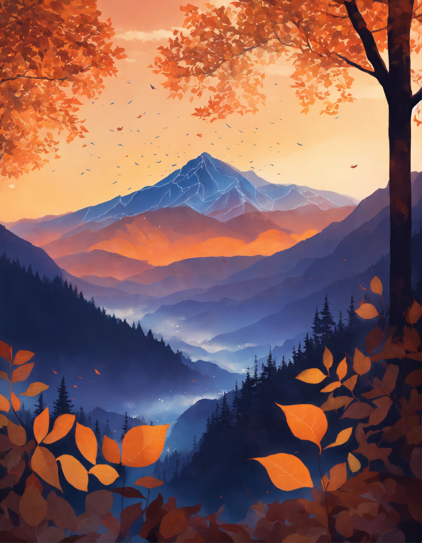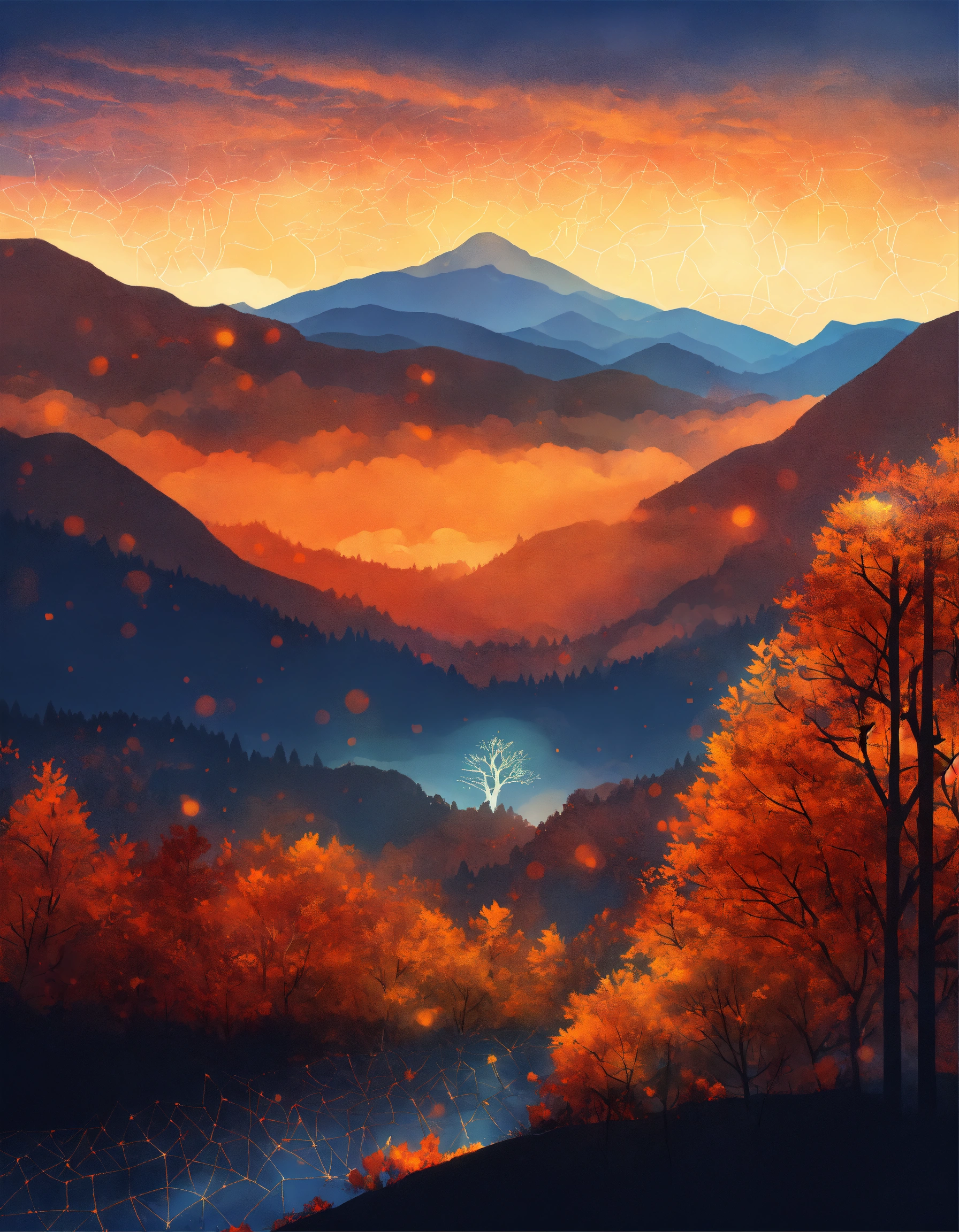 A serene smoky mountain silhouette in the background, with subtle mist layers. in the foreground, a stylized neural network (representing ai) intertwines with autumn leaves. above the mountain peaks, a rising sun symbolizes the dawning power of ai. the color palette focuses on deep blues, autumnal oranges, and neural silver.