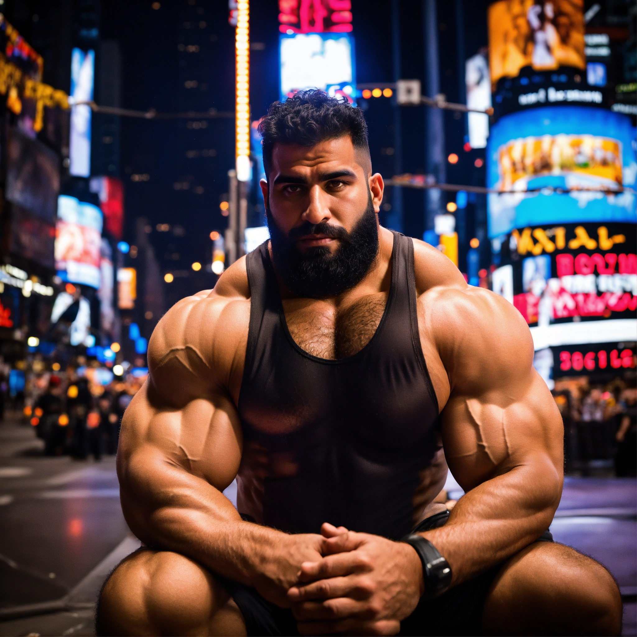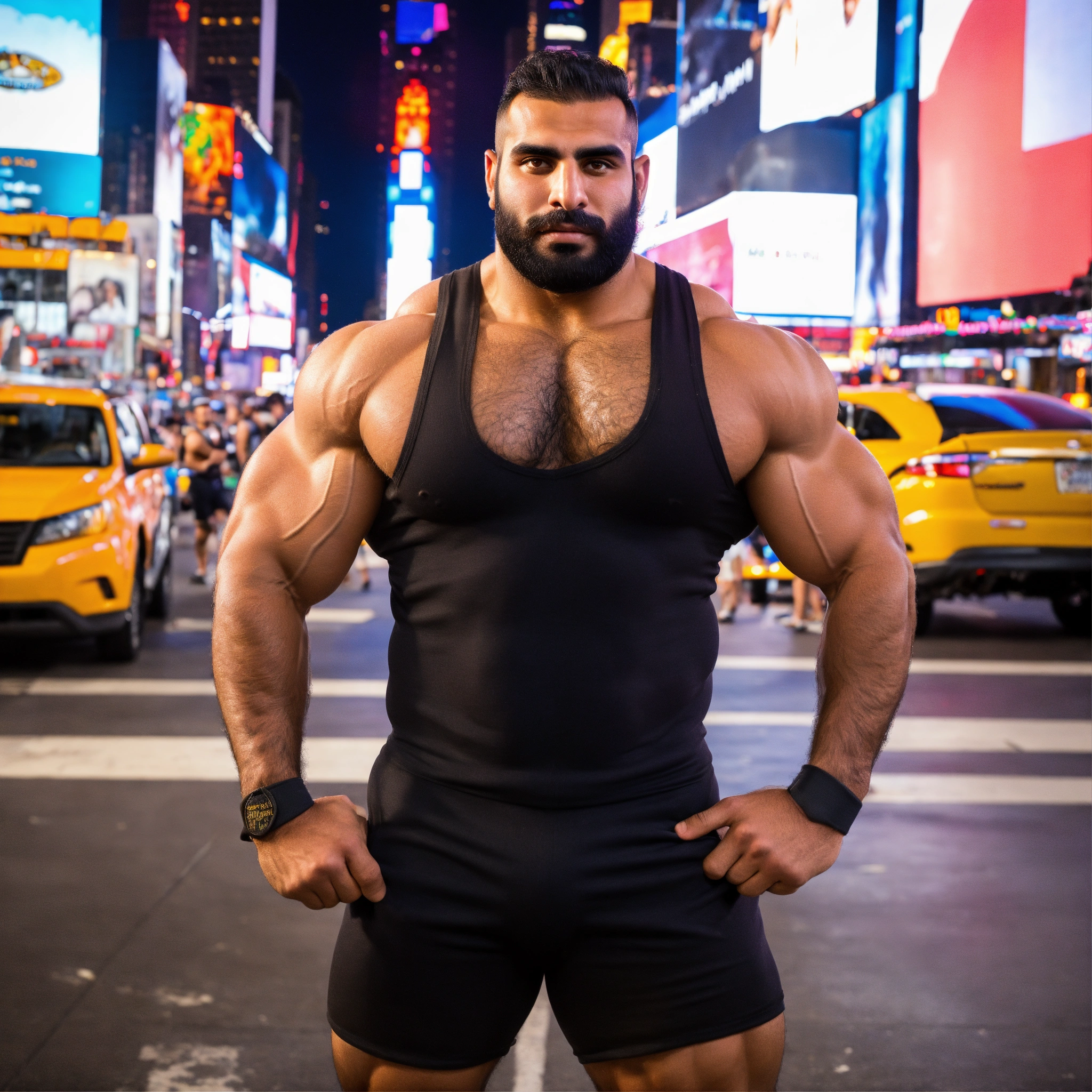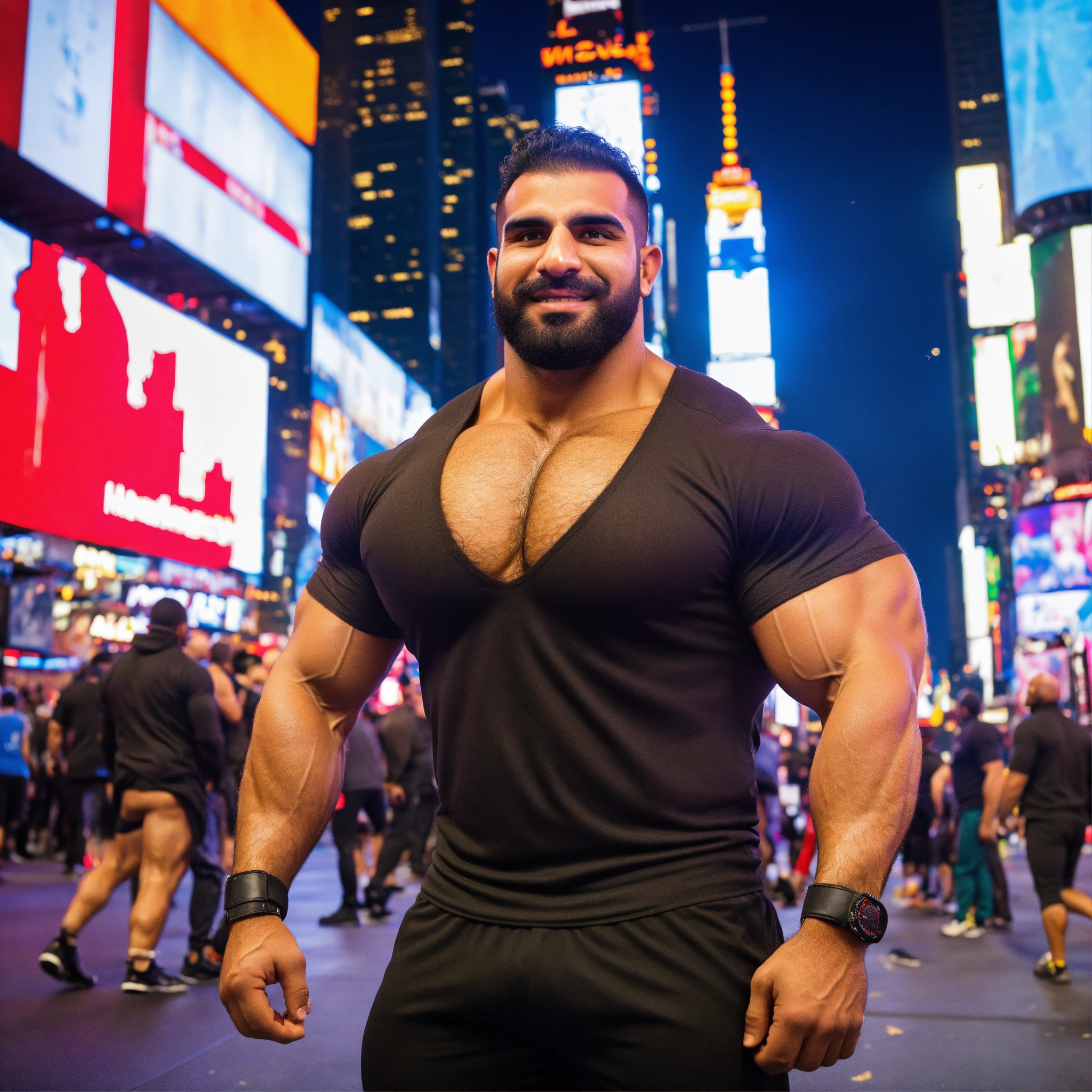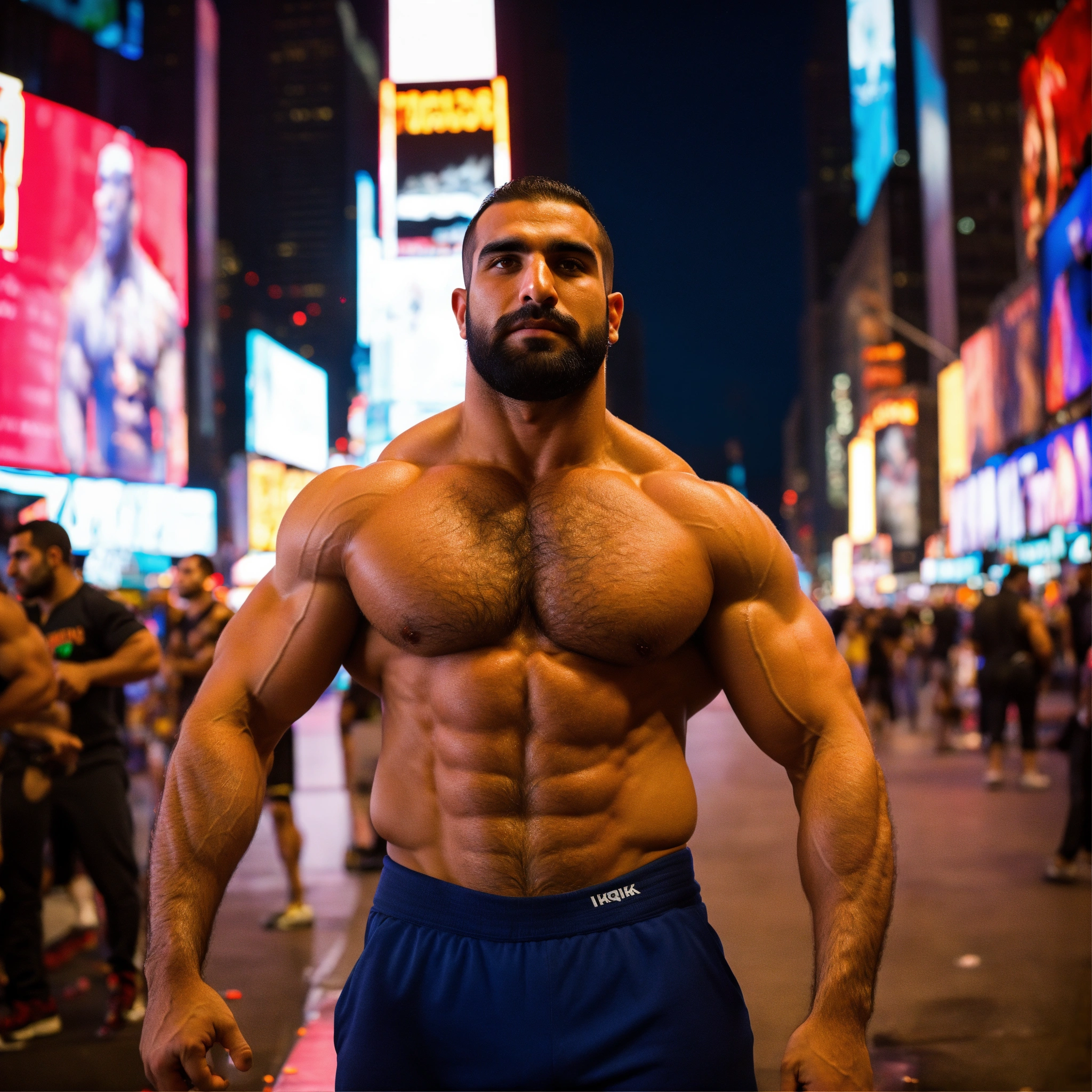 30-year-old hairy iraqi man with big muscles, big bodybuilder, body like a wrestler, in times square at night