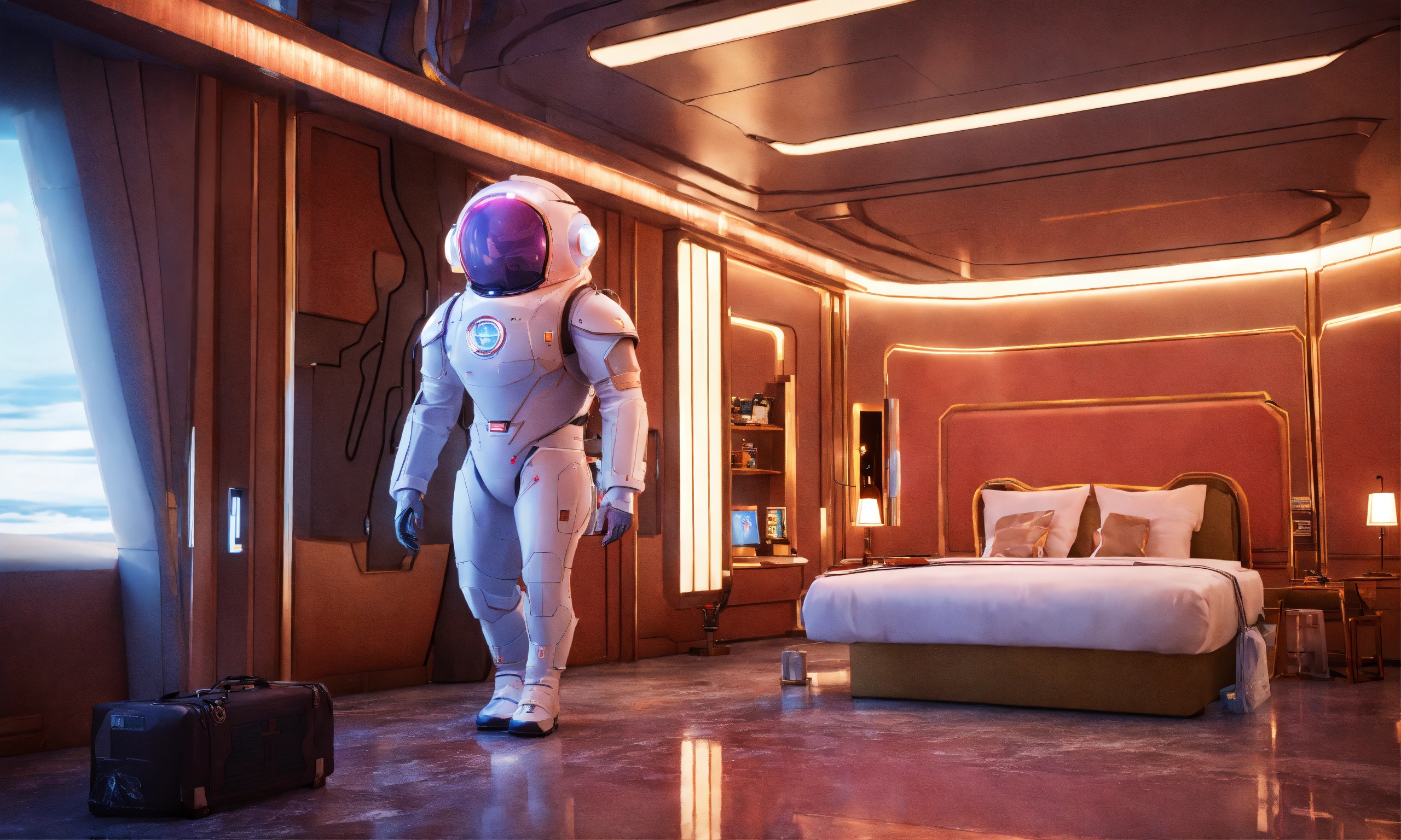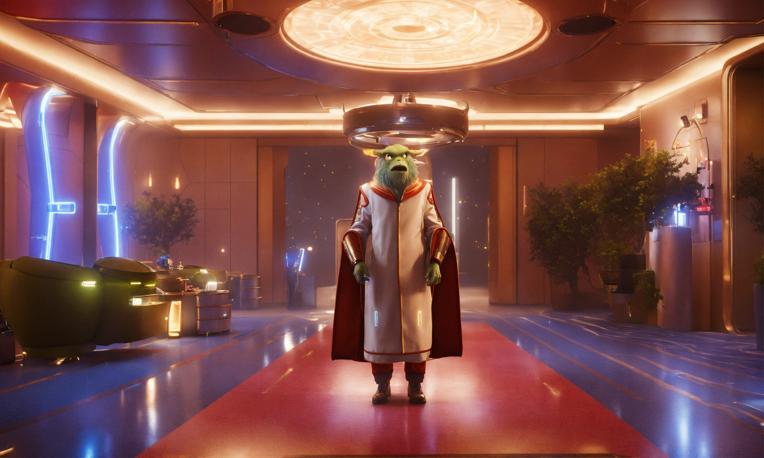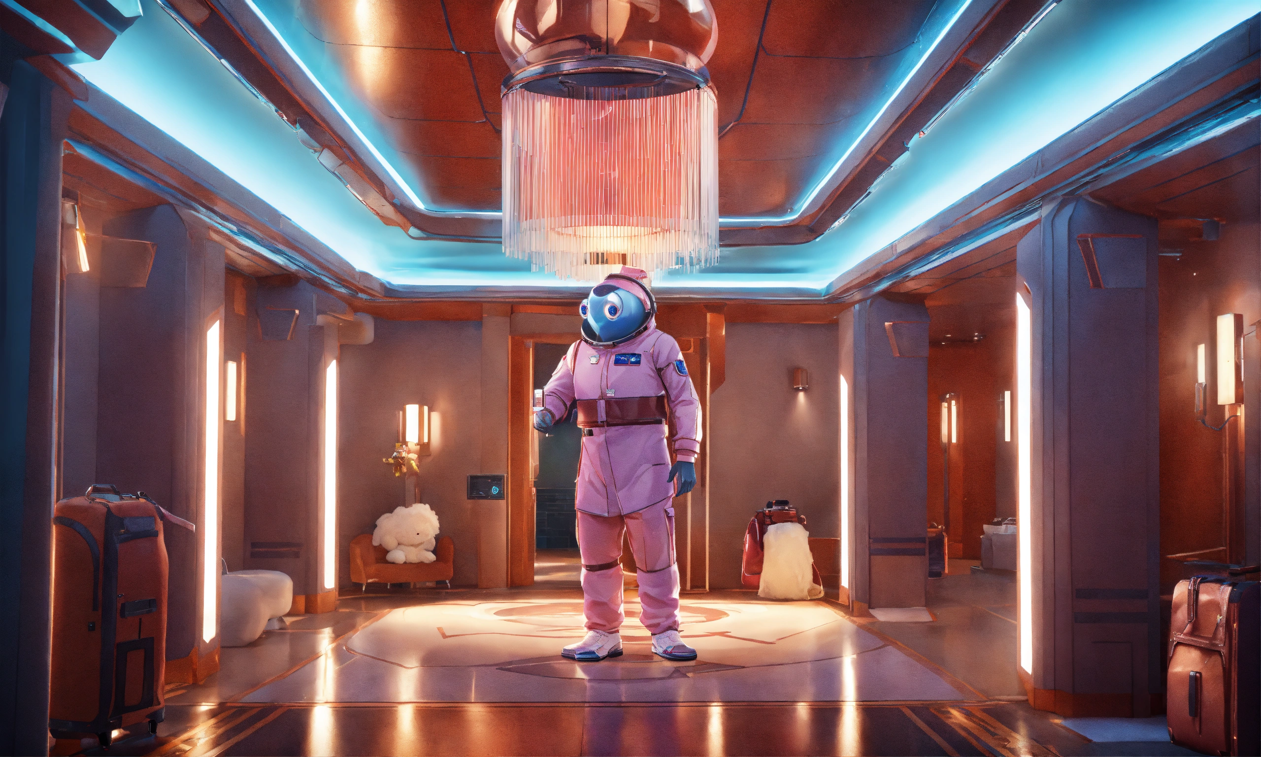 A hotel strange pale igor like space hotel bellhop creature greets offers to take your bags, realistic, futuristic, sci-fi, 8k, unreal engine, 8k realistic, pixar, disney, cartoon, unreal engine, 3d, sci-fi