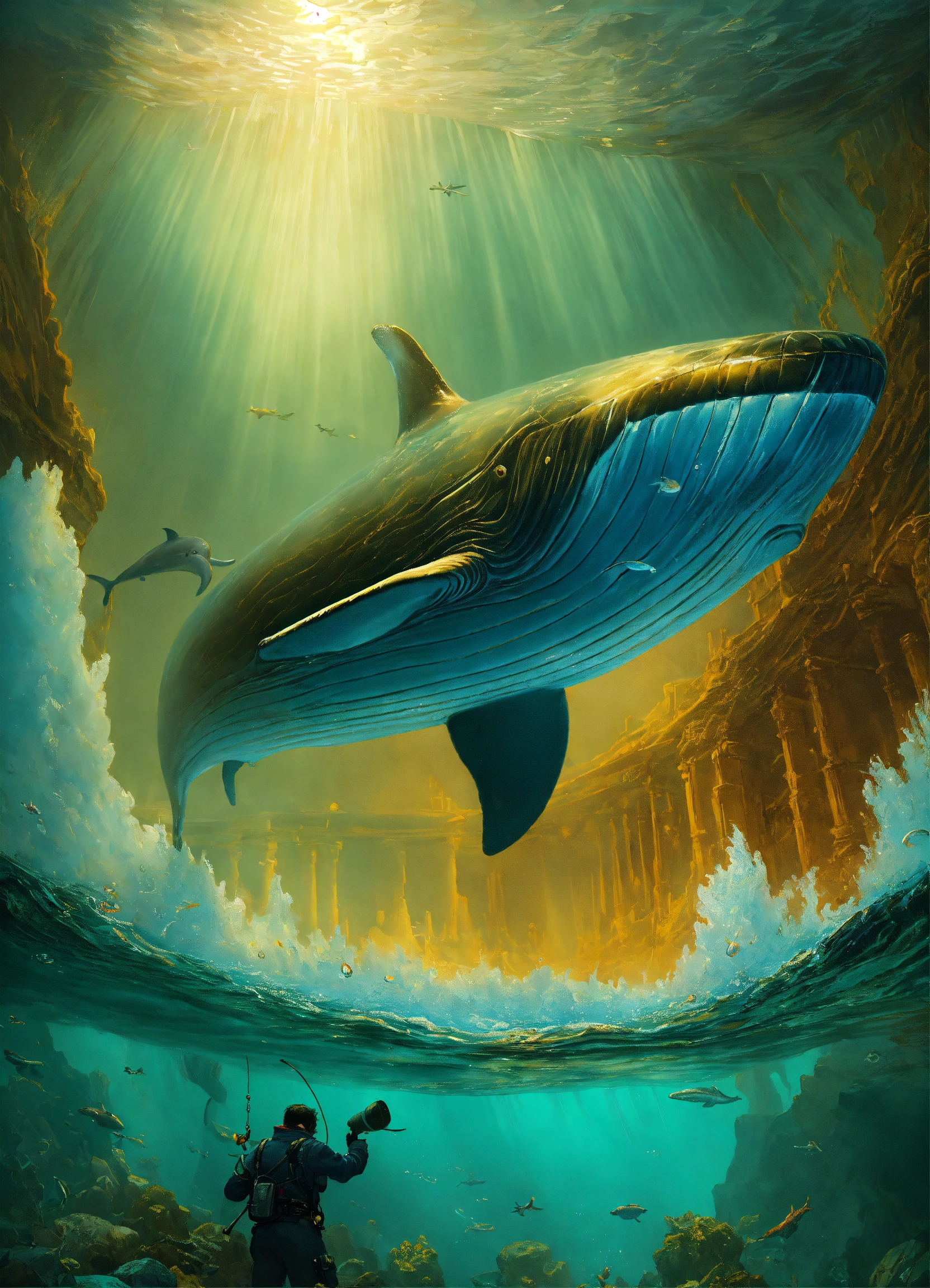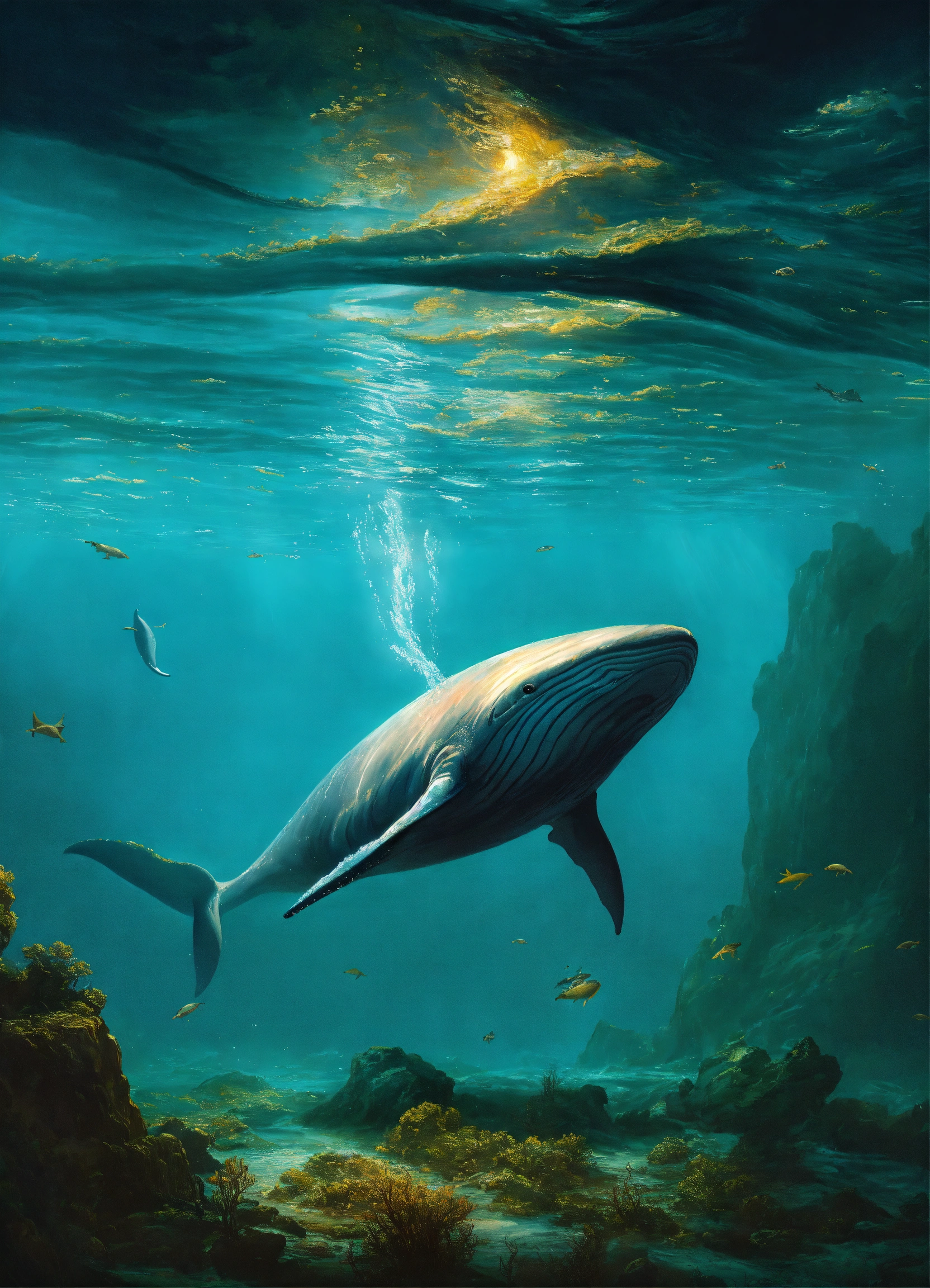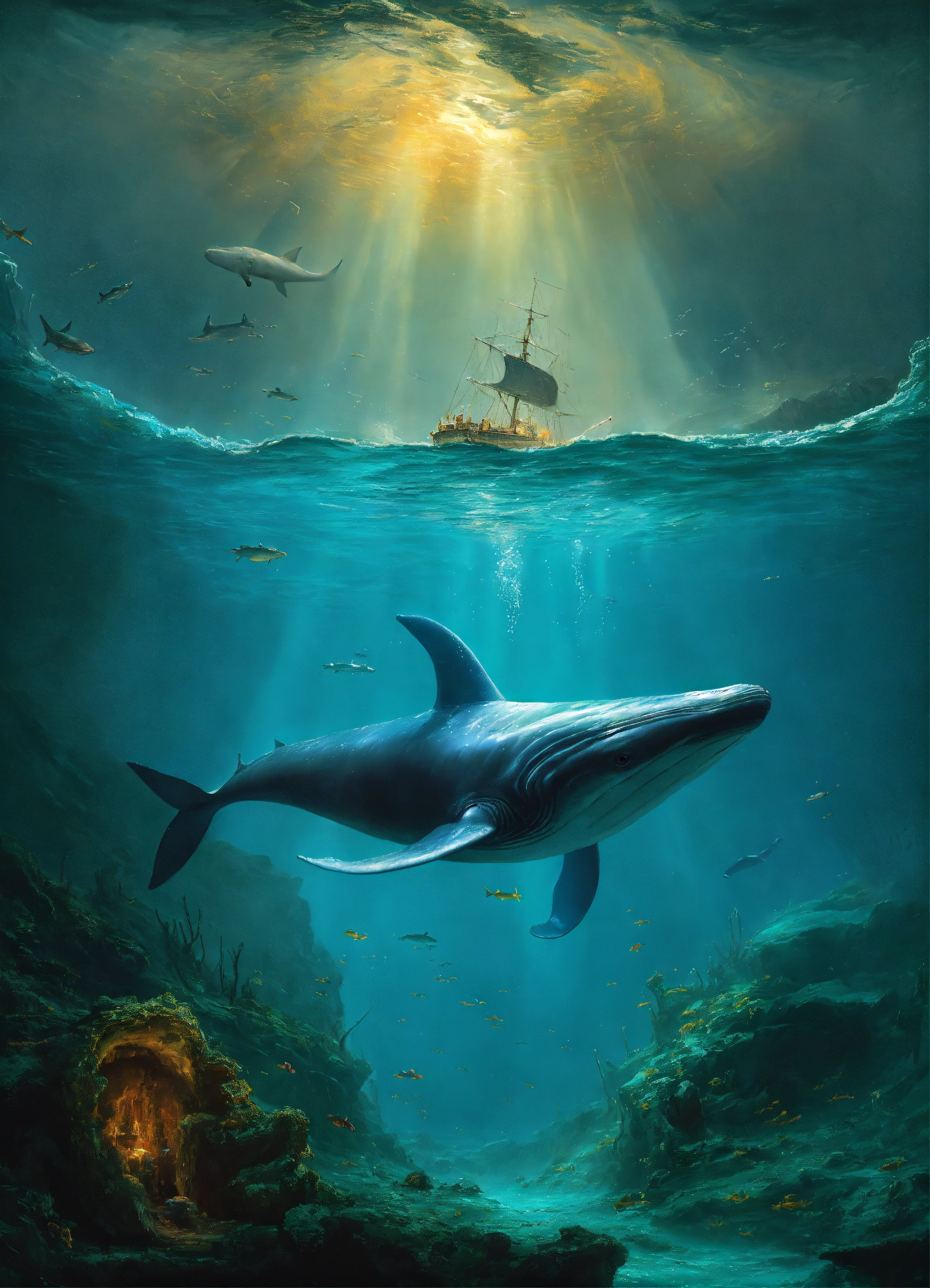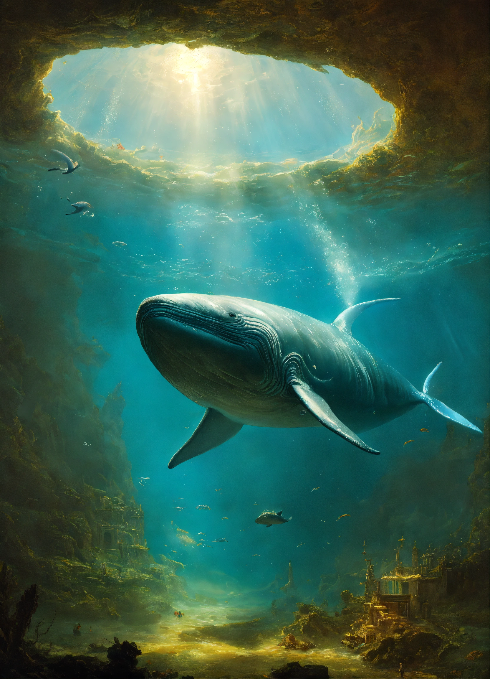 An alien whale swimming away under the ice, low angle, underwater, submarine, cold, oil painting, magic realism, romanticism, rococo, by thomas cole, by thomas doughty, by william turner, by gustave doré, epic, cinematic, atmospheric, fantasy, matte, ray-tracing, color graded