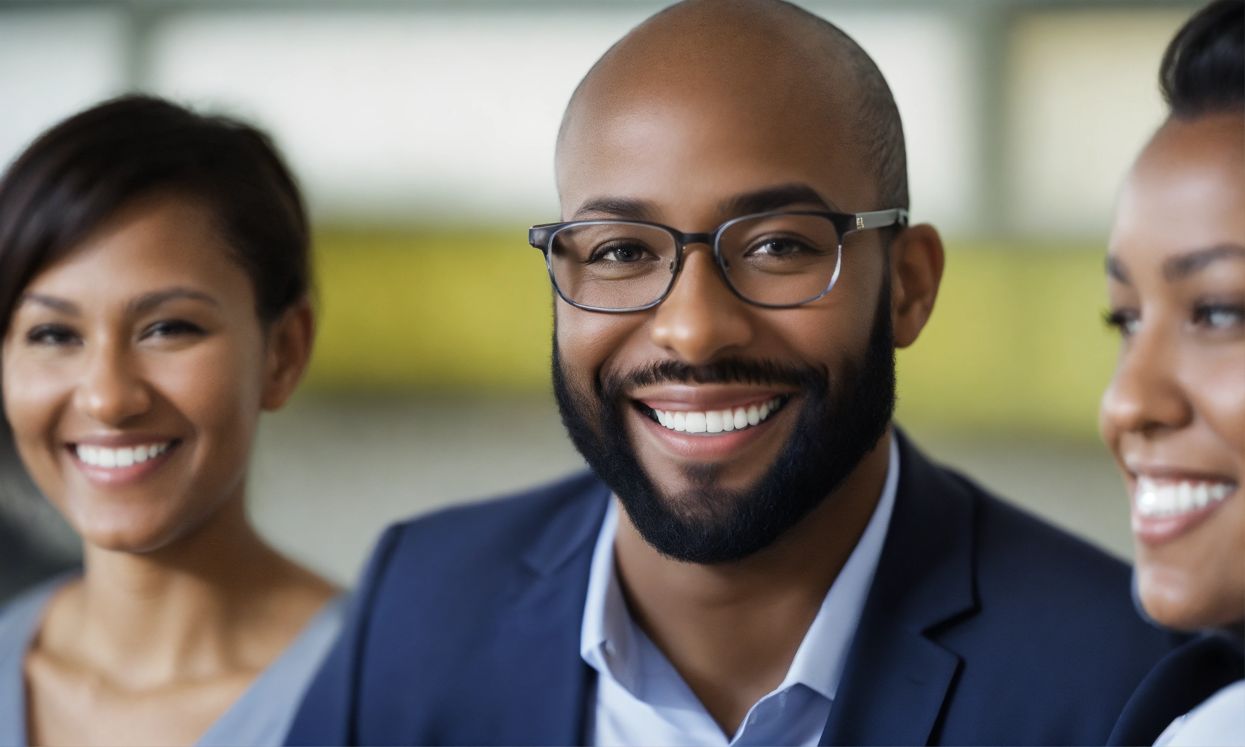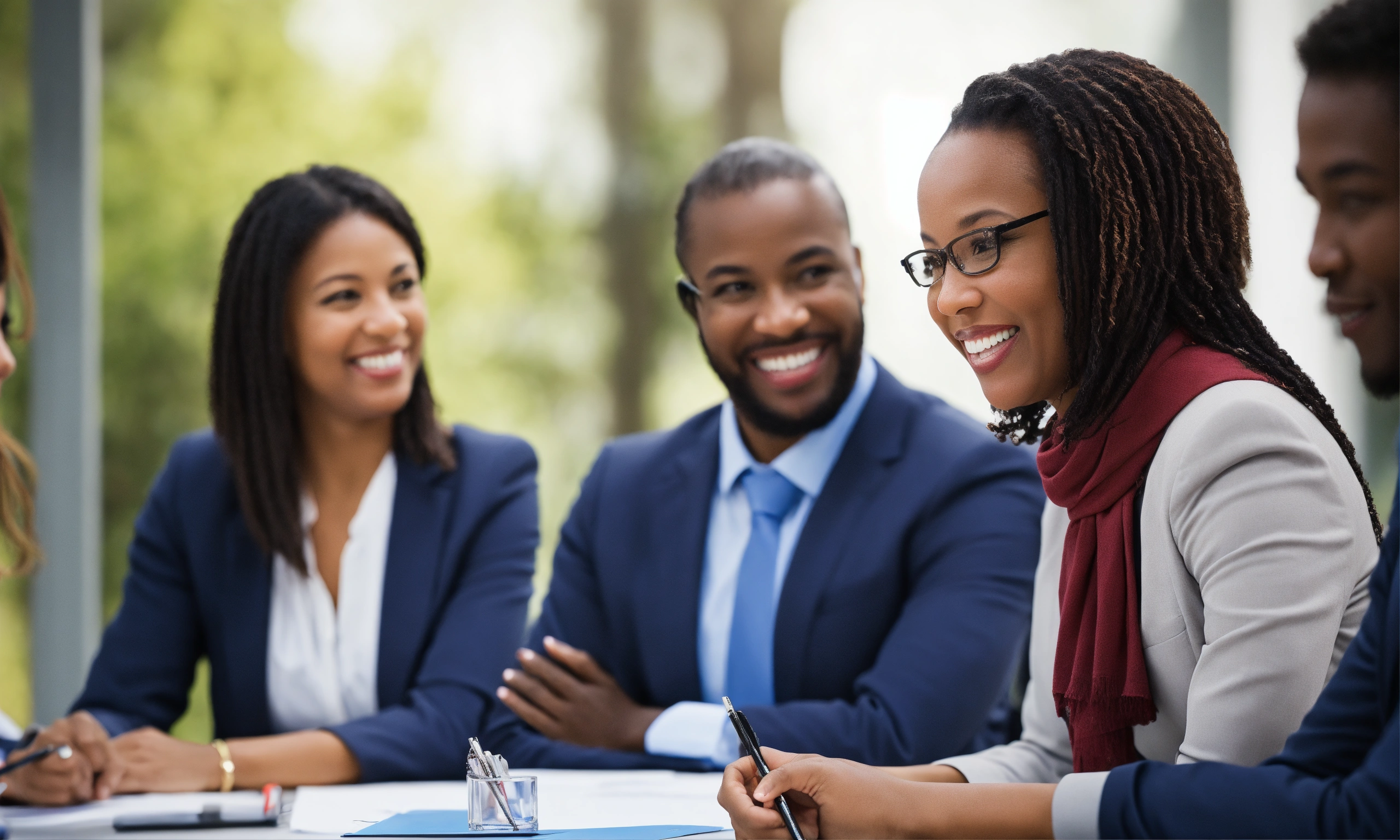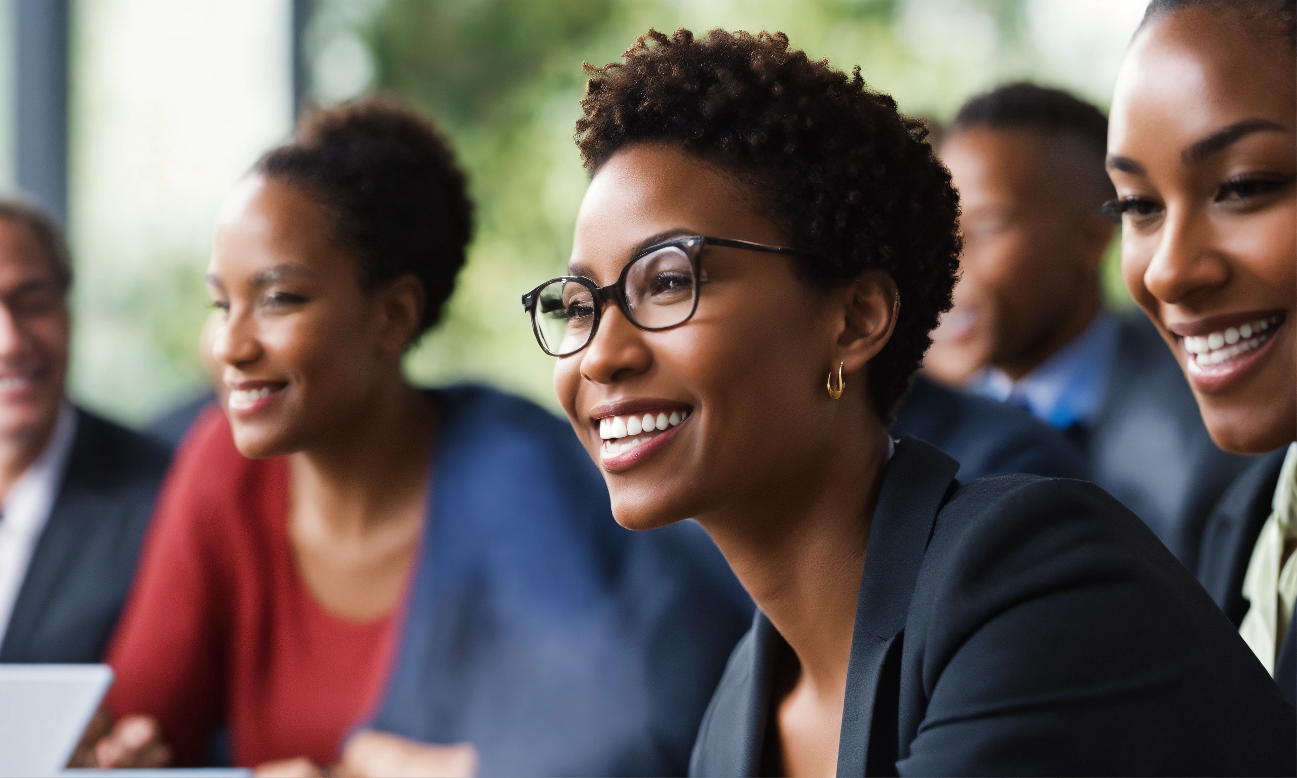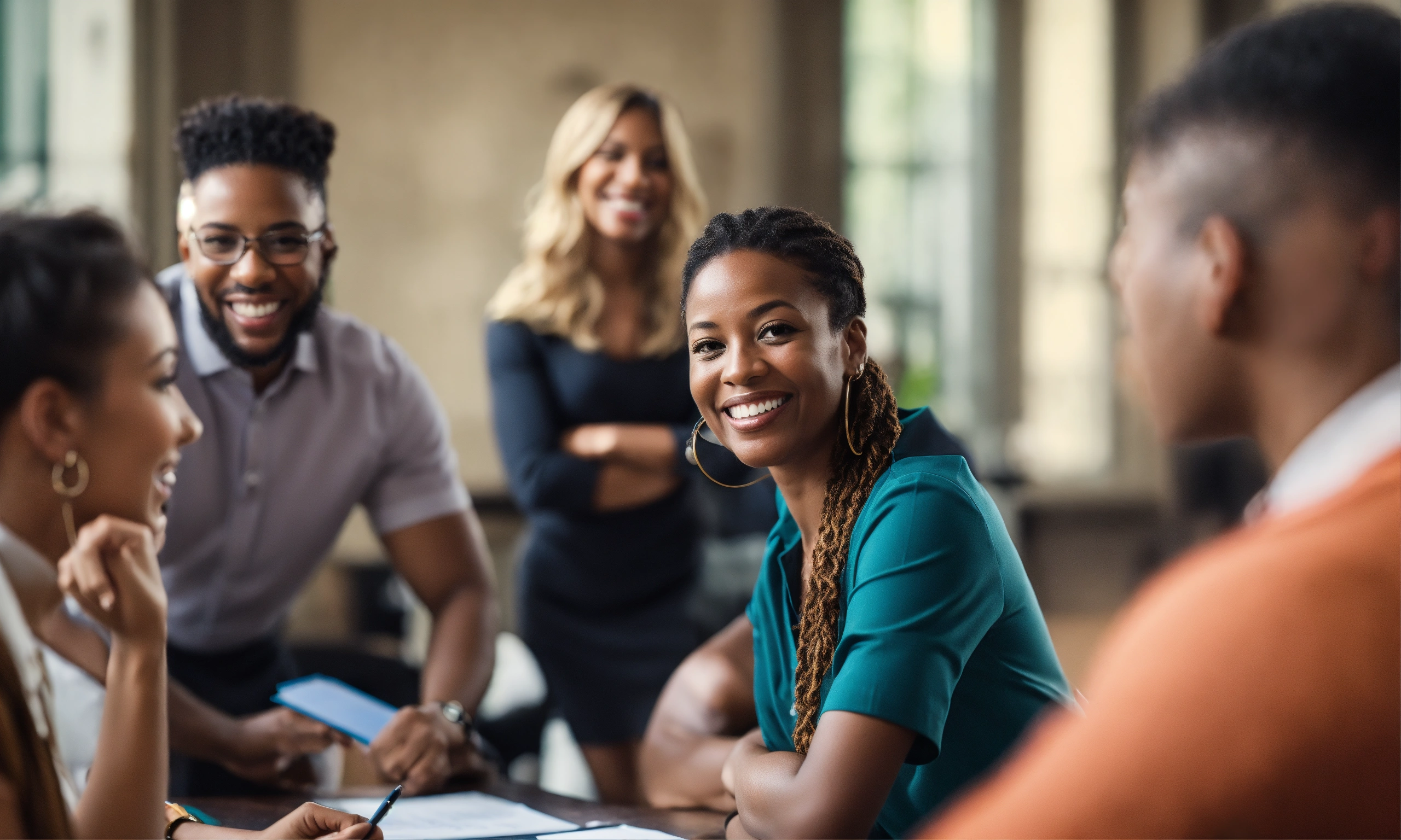 A group of joyful professional looking principals of all races in a professional coaching session. very clean lines, slightly blurred background.